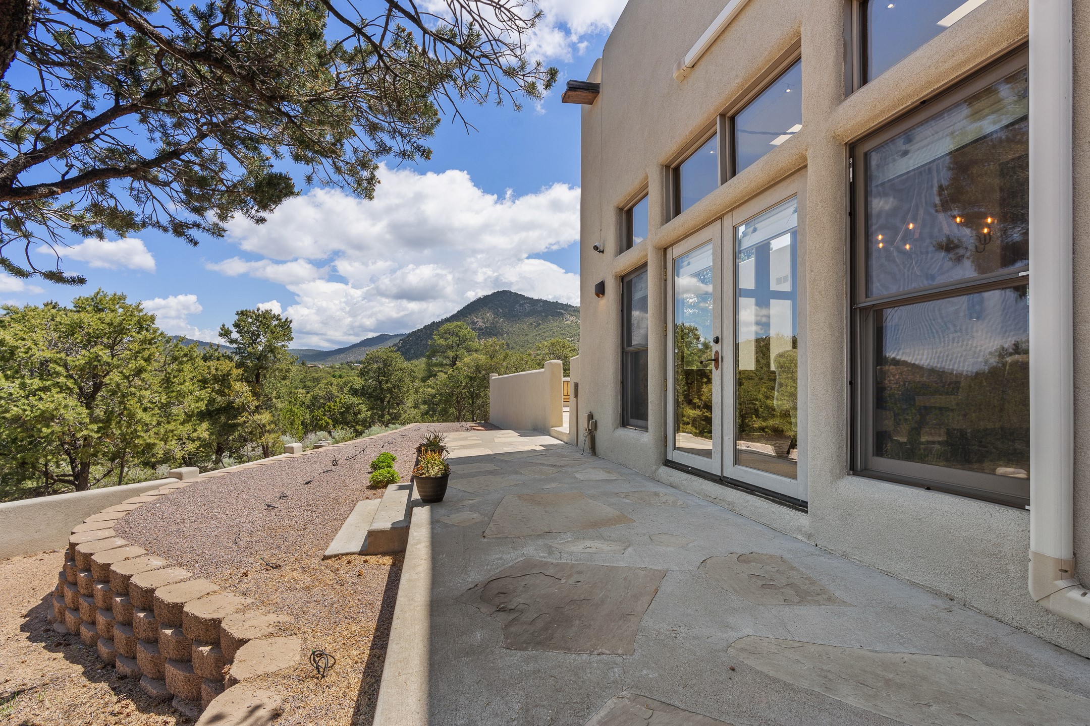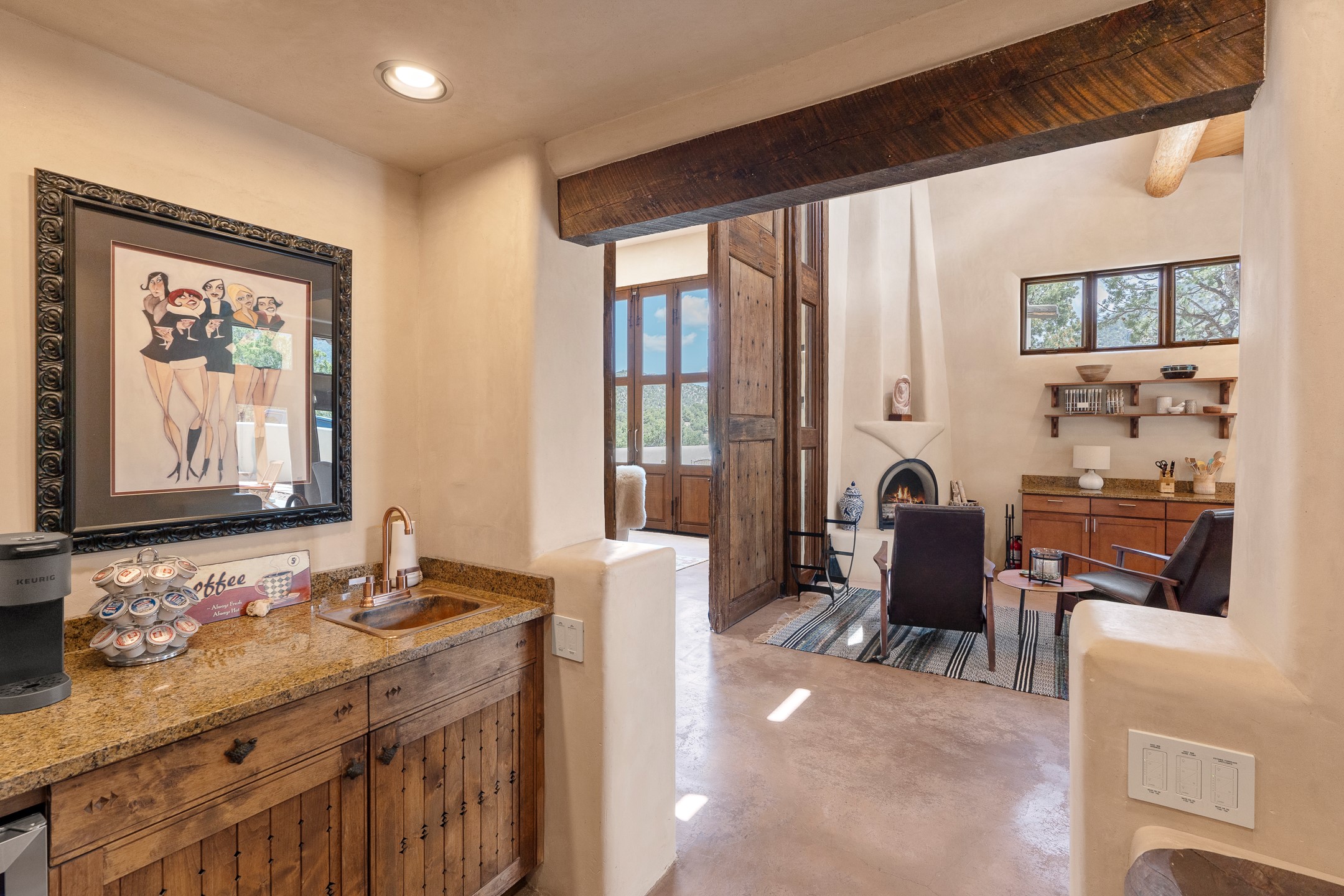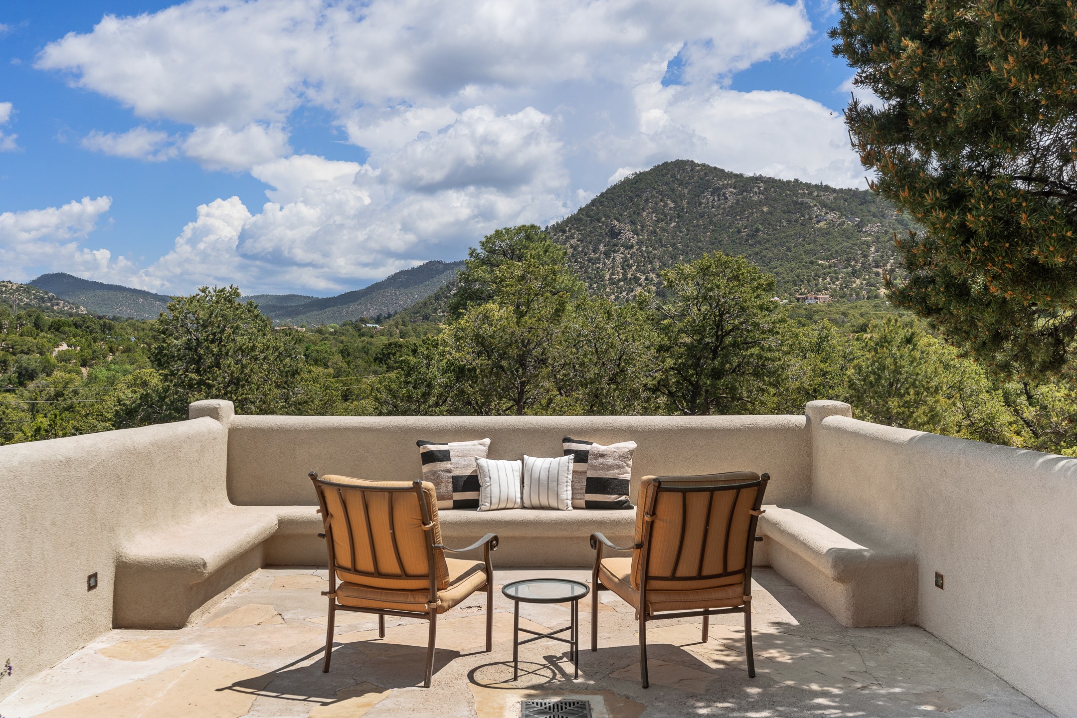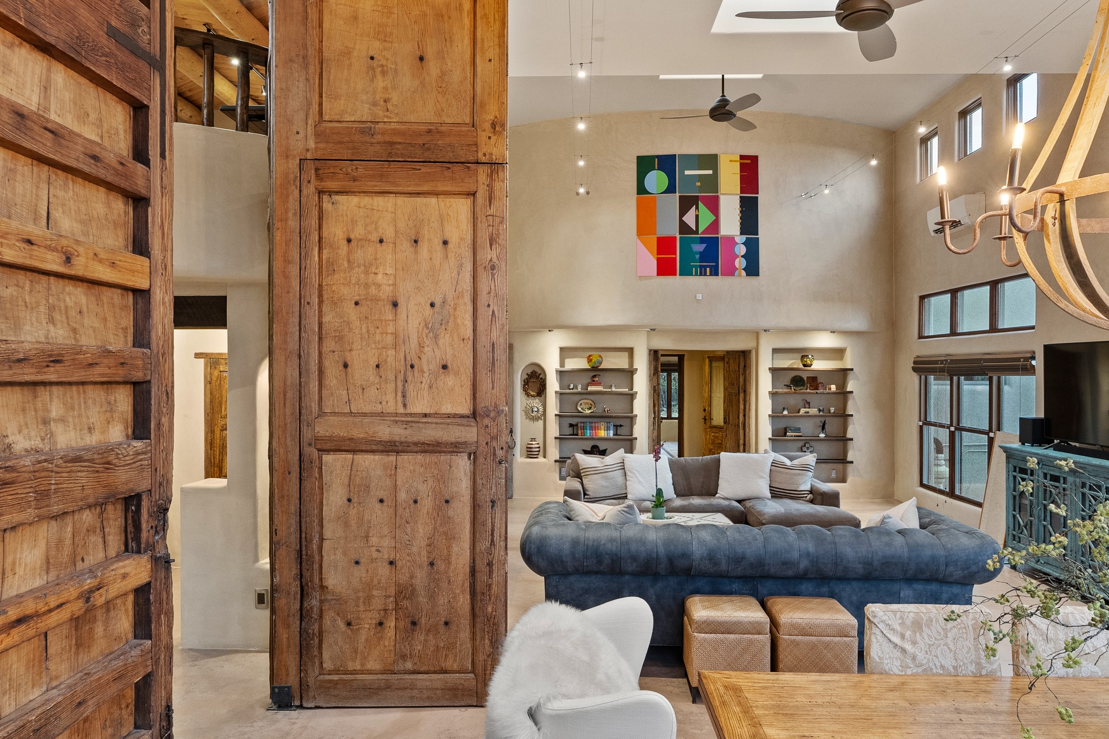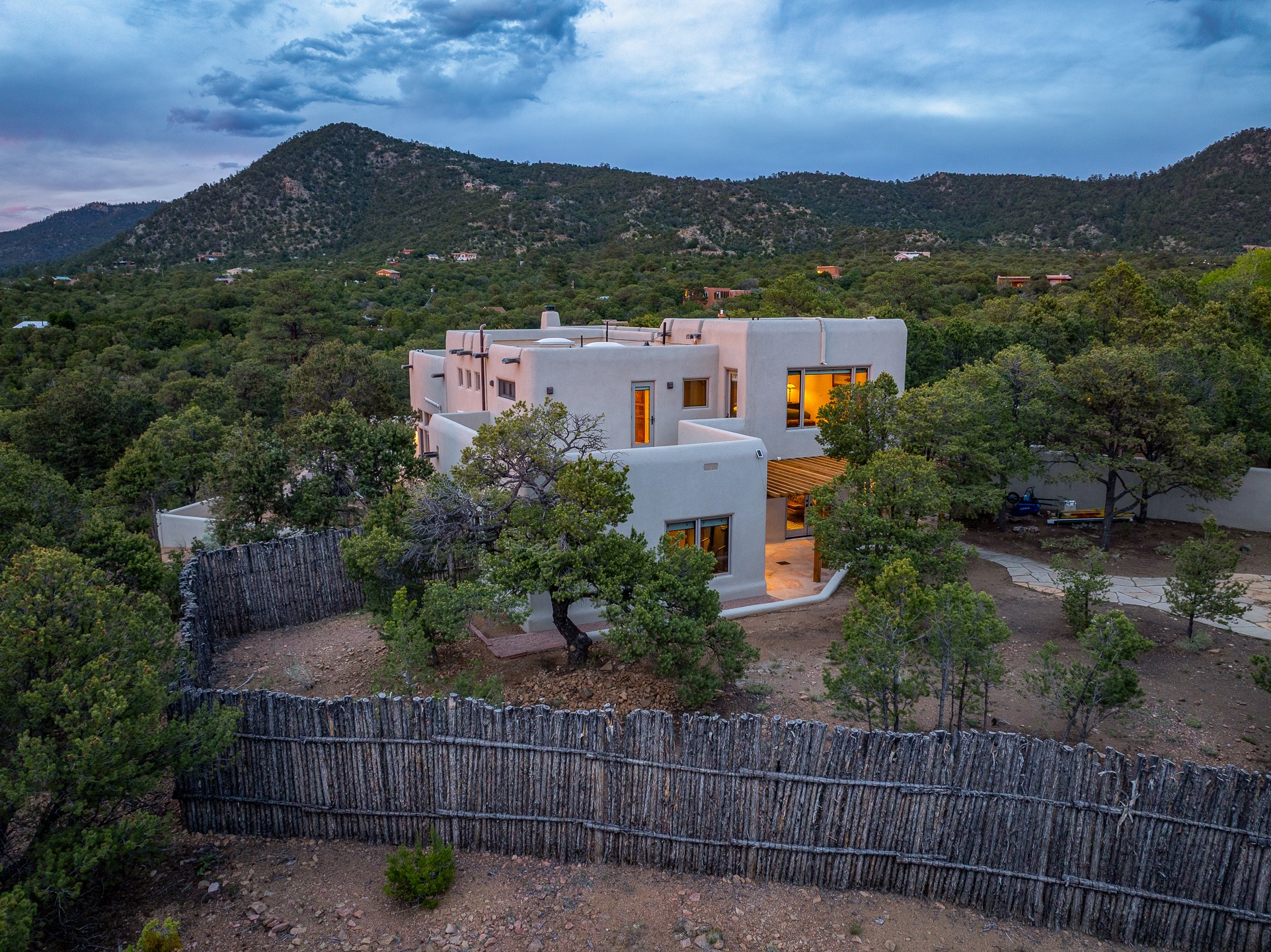 Beautifully sited on 2.5 acres in the foothills of the Sangre de Cristo Mountains, this stunning 3,836 sq. ft. home is a rare blend of traditional Santa Fe style, modern updates, and artistic provenance. Just 12 minutes from the historic Santa Fe Plaza, the property offers beautiful views of the Sangres, Jemez and Sandia Mountains, city lights, and Santa Fe's glorious sunsets. Originally built as a studio for the renowned Native American artist Bruce LaFountain and reimagined in 2001, the home has a distinct soul and history--including its appearance in a feature film. Every detail has been curated with intention, from the antique solid wood doors sourced from La Puerta Originals to the custom American Clay plaster walls, soaring ceilings, exposed vigas and rich natural light throughout. At the heart of the home is a chef's kitchen outfitted with center island, a built-in coffee wet bar with wine refrigerator, and an inviting intimate sitting area centered around a traditional kiva fireplace. This space flows seamlessly to a pergola-covered entertaining patio--ideal for grilling and relaxation. Towering ceilings grace the living room and dining room which also showcases stunning 14-foot antique doors from a Spanish Church and is connected to a spacious view patio ideal for entertaining and taking in the peace and drama of the skies and mountains. The primary suite is located upstairs and features a den/study as well as a spa like bath and a private roof top area with direct access from both the bedroom and bath. The downstairs guest area is separated for ultimate privacy area with each room having direct access to an outdoor space perfect for getting away from it all. Additional highlights include radiant in-floor heating, mini-splits for instant heating and cooling and over $200,000 in thoughtful improvements ensuring ease of living--highlighted by a new boiler and hot water heater, newer roof, newer stucco, newer washer and dryer. An optional designer furniture package is available for purchase, making this extraordinary home move-in ready for those seeking authenticity, elegance, and a true sense of place.