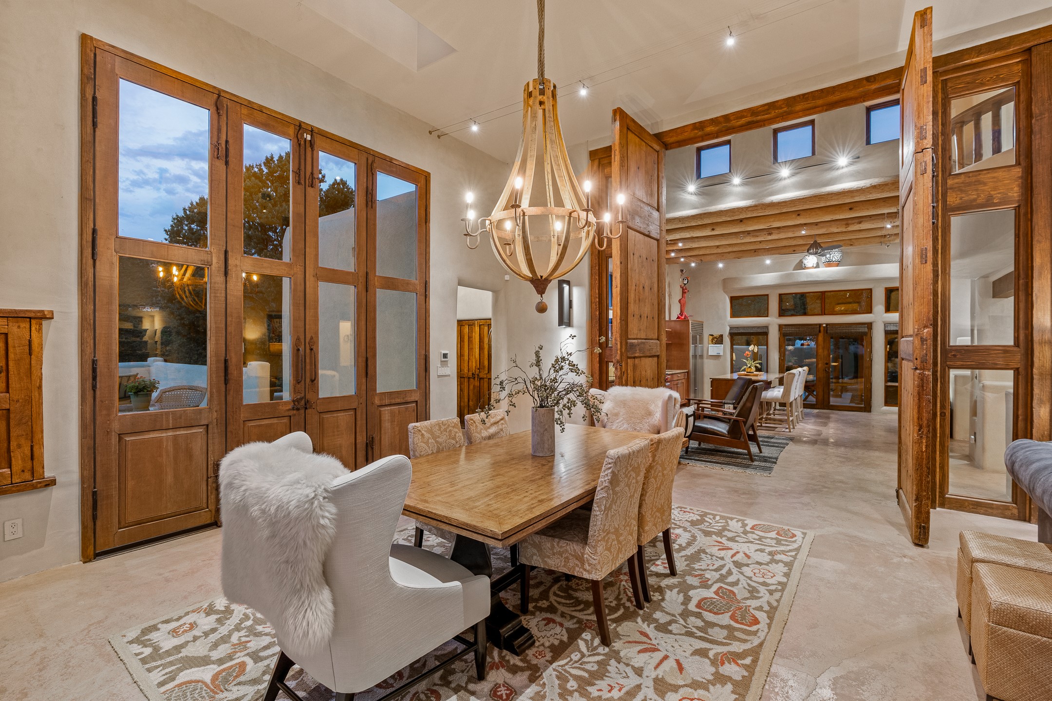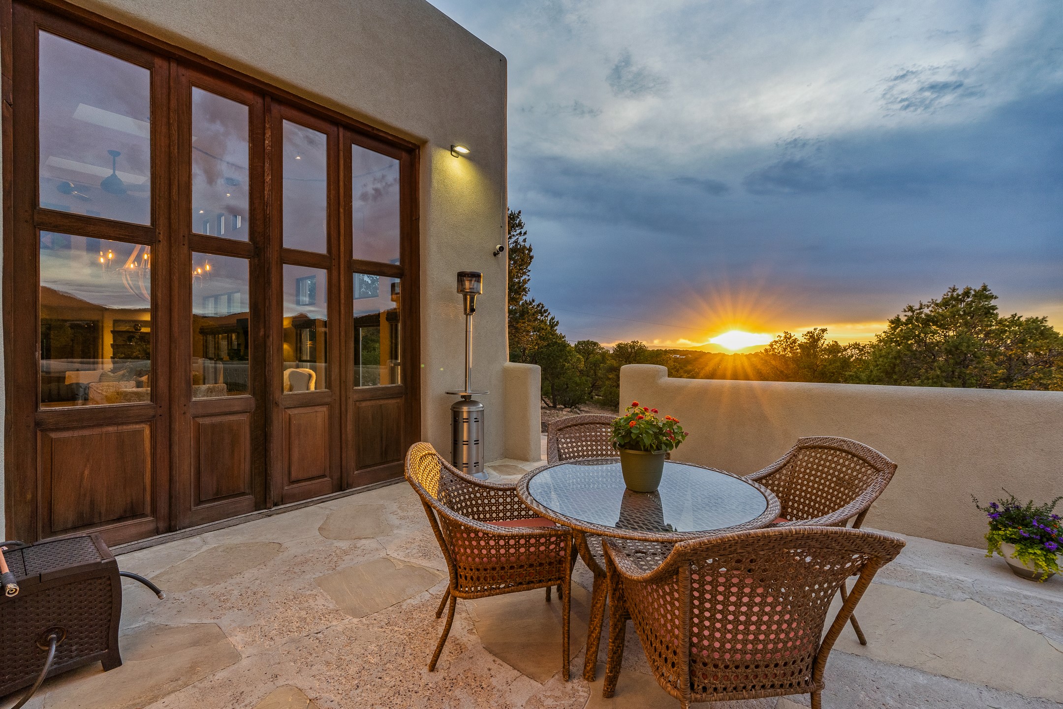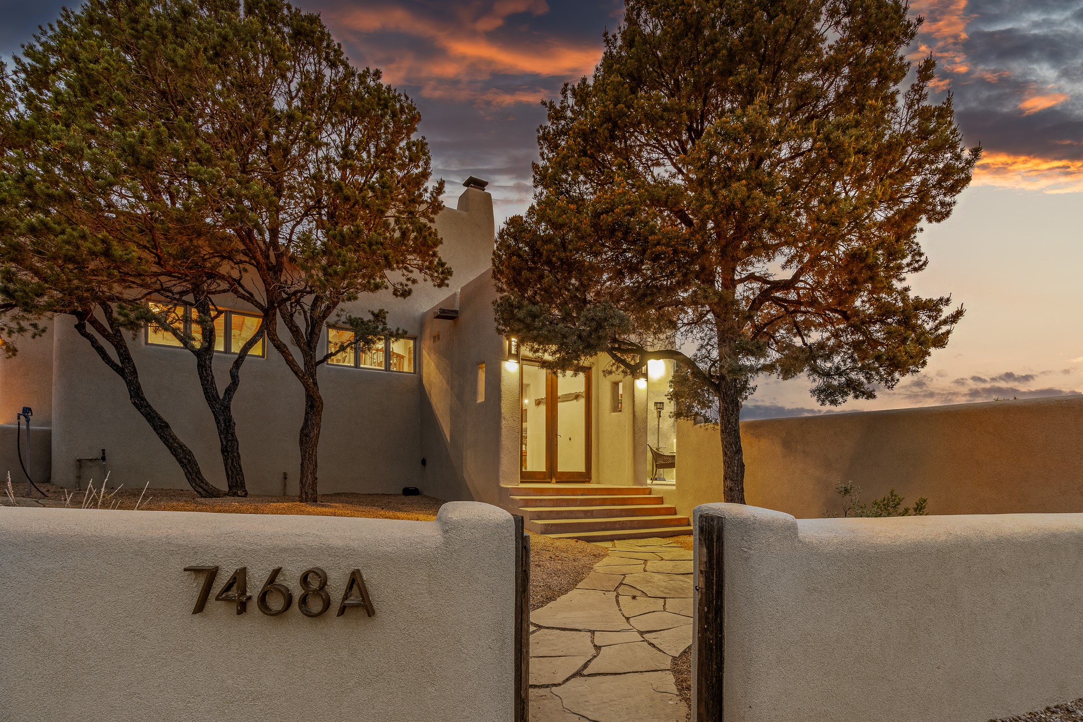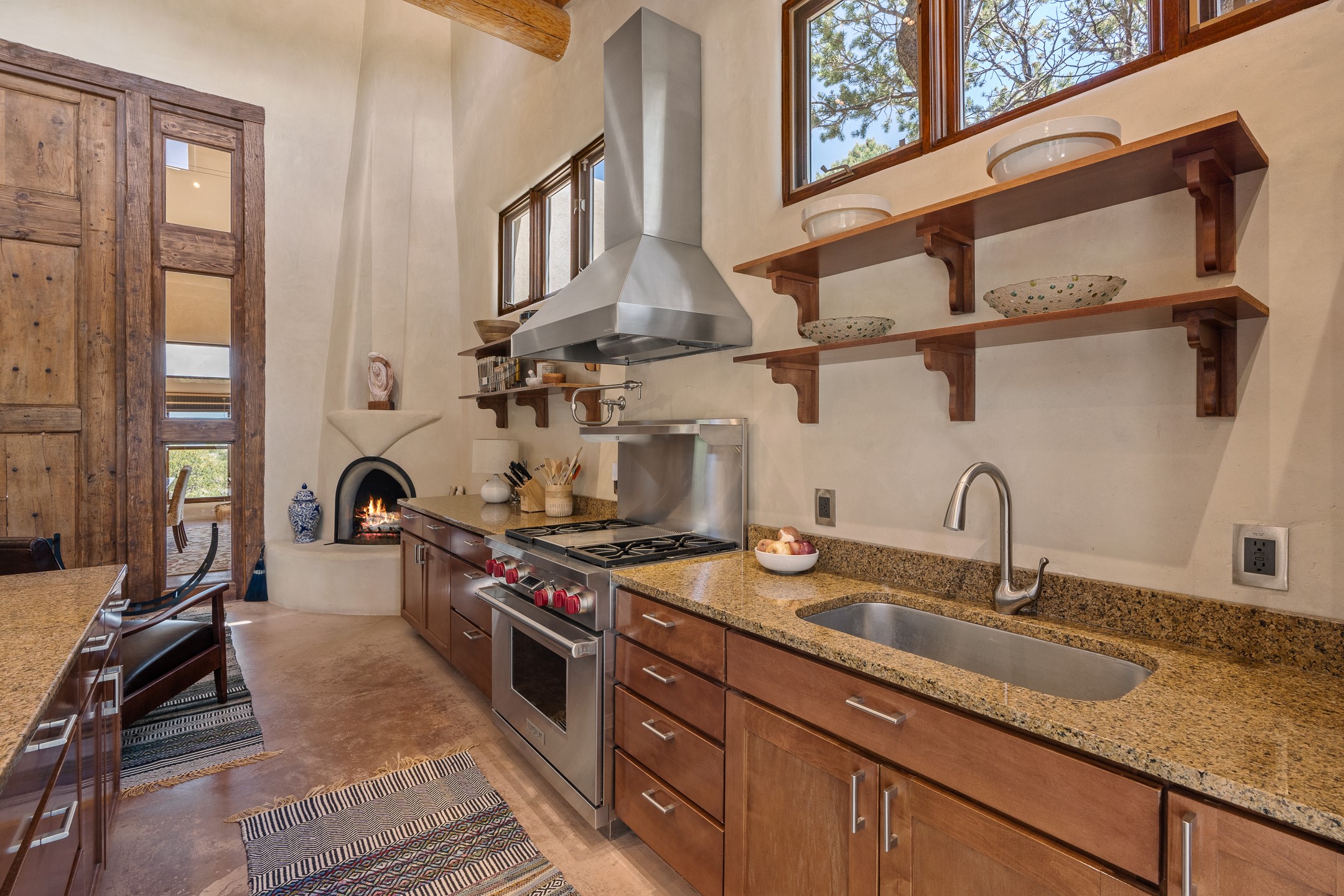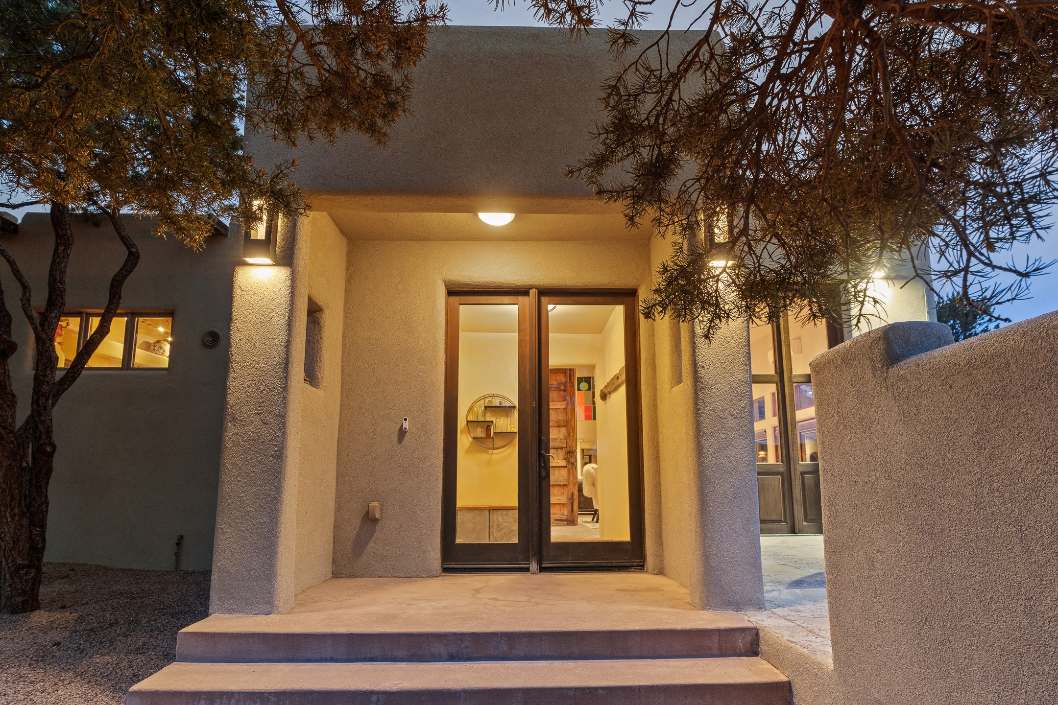 Beautifully sited on 2.5 acres in the foothills of the Sangre de Cristo Mountains, this stunning 3,836 sq. ft. home is a rare blend of traditional Santa Fe style, modern updates, and artistic provenance. Just 12 minutes from the historic Santa Fe Plaza, the property offers beautiful views of the Sangres, Jemez and Sandia Mountains, city lights, and Santa Fe's glorious sunsets. Originally built as a studio for the renowned Native American artist Bruce LaFountain and reimagined in 2001, the home has a distinct soul and history--including its appearance in a feature film. Every detail has been curated with intention, from the antique solid wood doors sourced from La Puerta Originals to the custom American Clay plaster walls, soaring ceilings, exposed vigas and rich natural light throughout. At the heart of the home is a chef's kitchen outfitted with center island, a built-in coffee wet bar with wine refrigerator, and an inviting intimate sitting area centered around a traditional kiva fireplace. This space flows seamlessly to a pergola-covered entertaining patio--ideal for grilling and relaxation. Towering ceilings grace the living room and dining room which also showcases stunning 14-foot antique doors from a Spanish Church and is connected to a spacious view patio ideal for entertaining and taking in the peace and drama of the skies and mountains. The primary suite is located upstairs and features a den/study as well as a spa like bath and a private roof top area with direct access from both the bedroom and bath. The downstairs guest area is separated for ultimate privacy area with each room having direct access to an outdoor space perfect for getting away from it all. Additional highlights include radiant in-floor heating, mini-splits for instant heating and cooling and over $200,000 in thoughtful improvements ensuring ease of living--highlighted by a new boiler and hot water heater, newer roof, newer stucco, newer washer and dryer. An optional designer furniture package is available for purchase, making this extraordinary home move-in ready for those seeking authenticity, elegance, and a true sense of place.