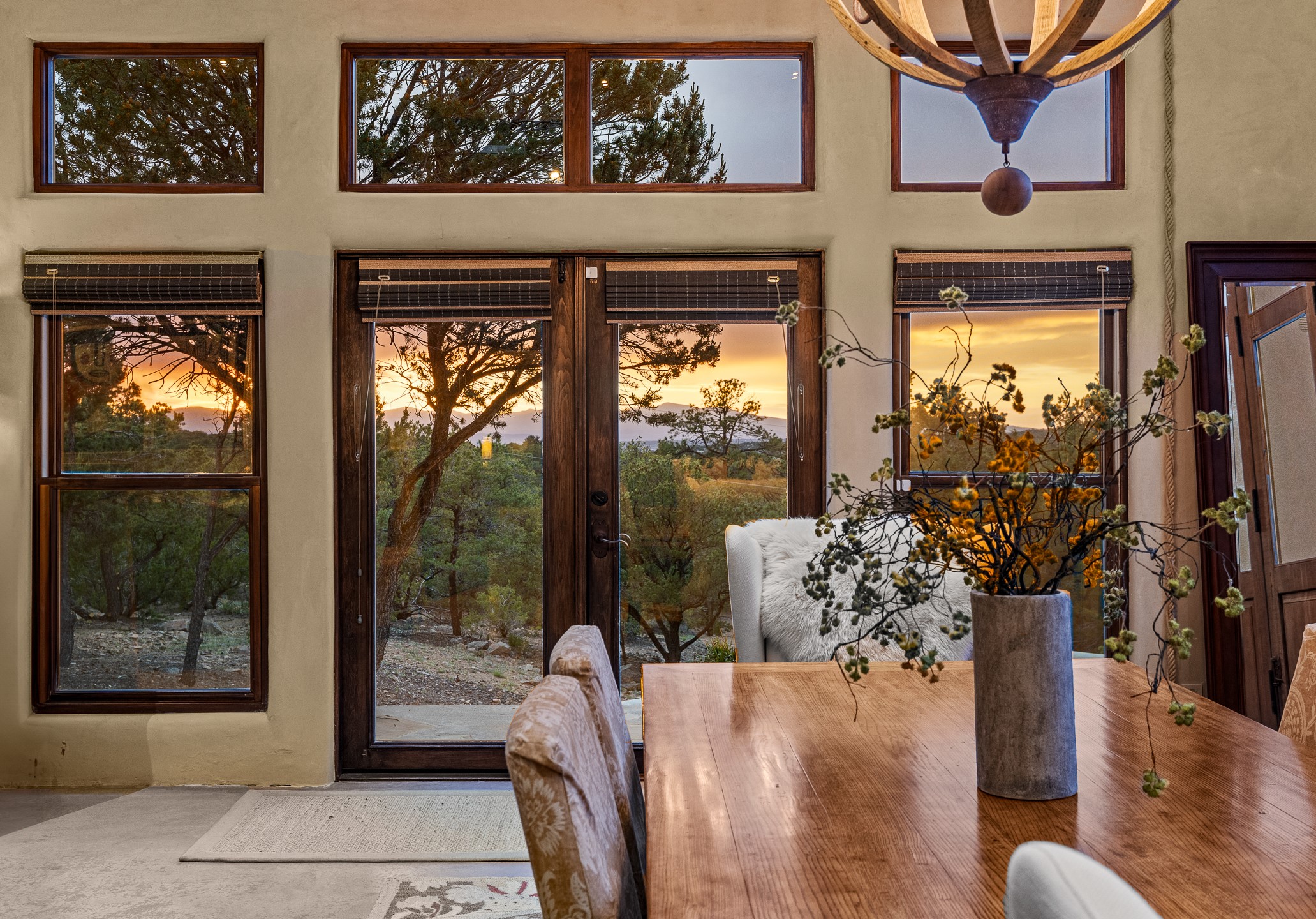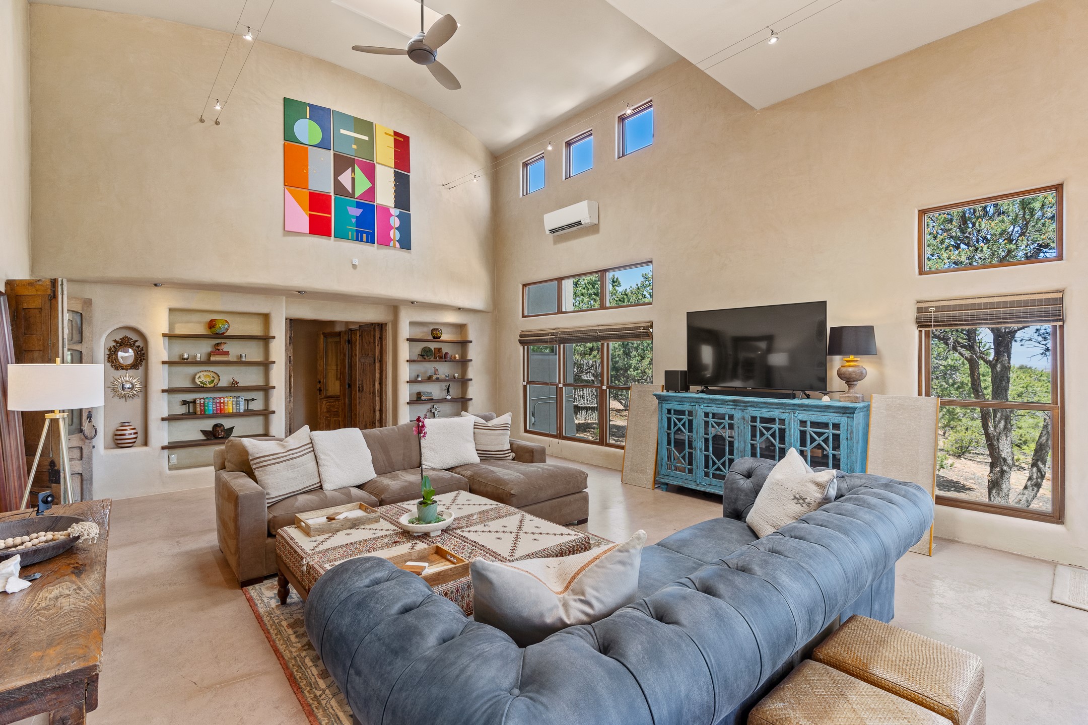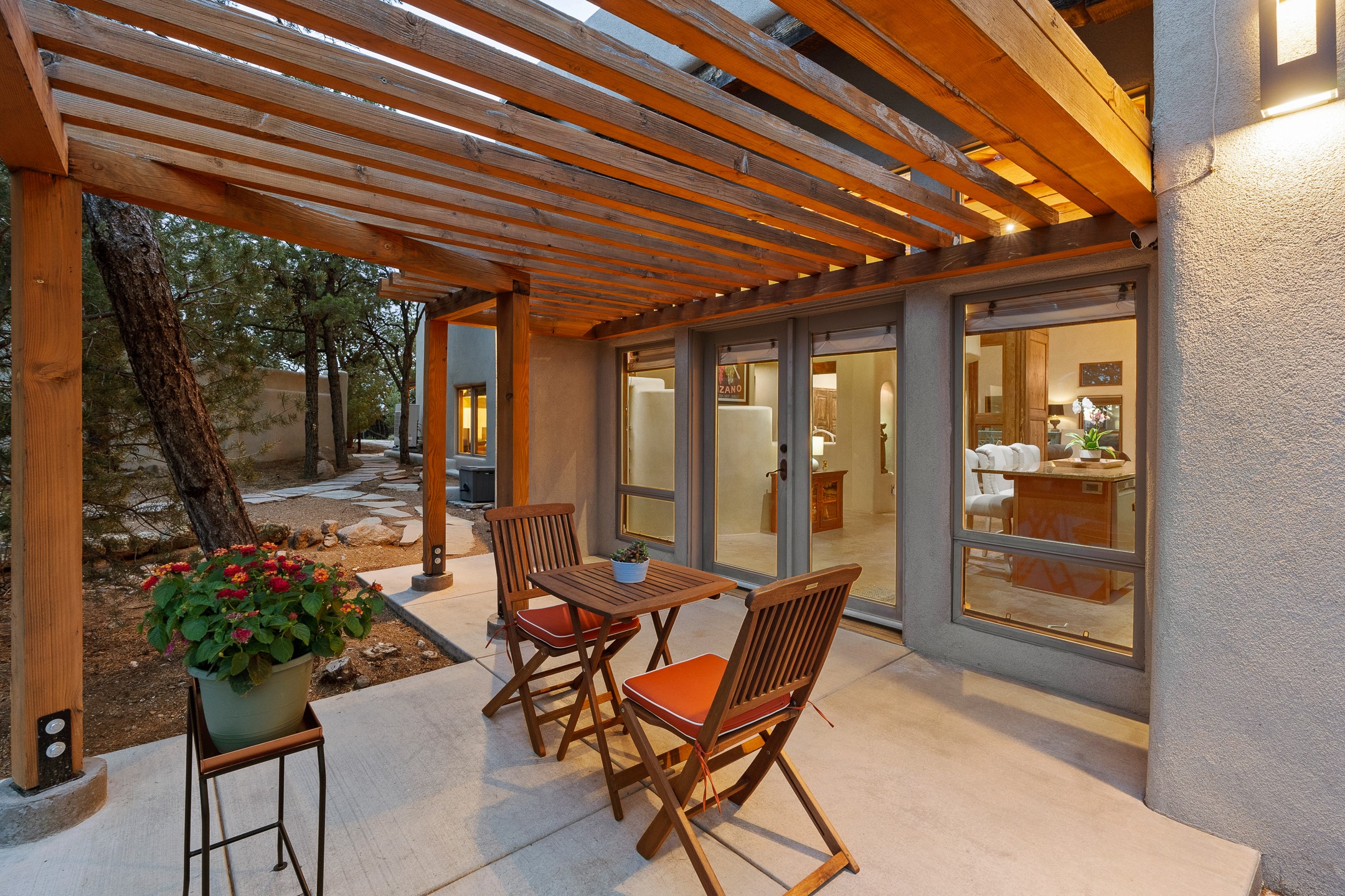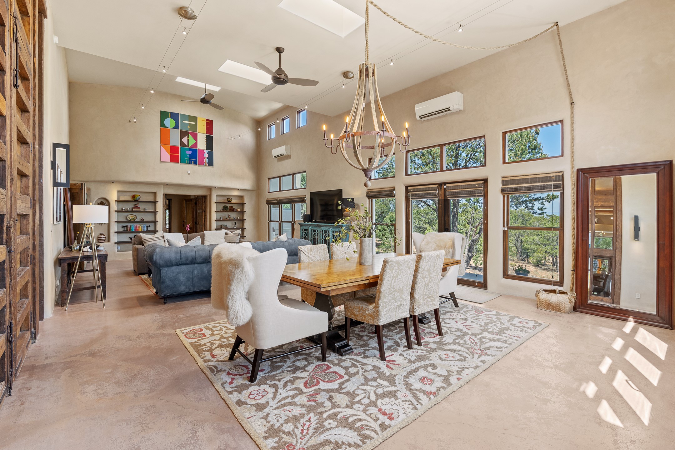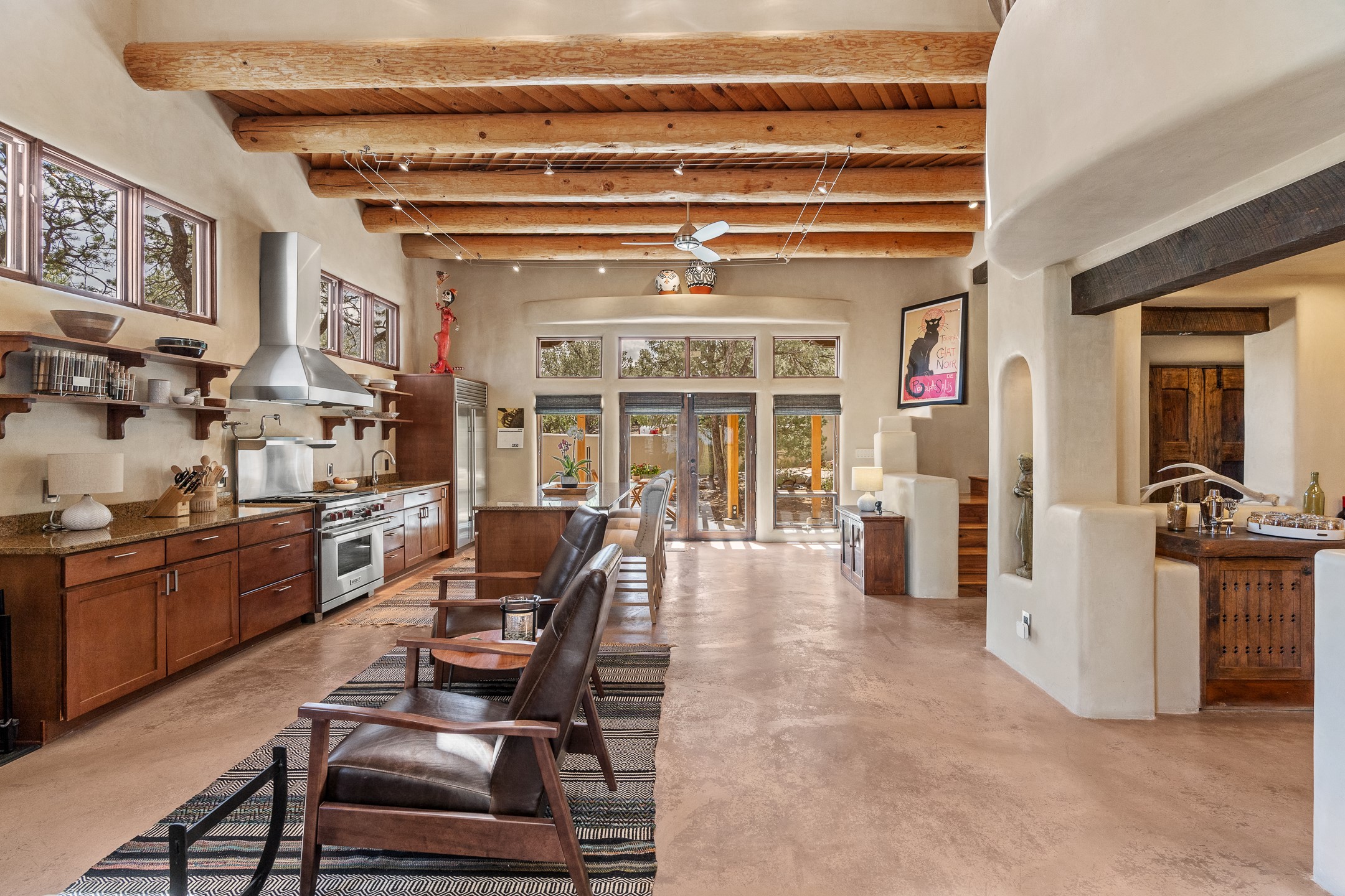 Beautifully sited on 2.5 acres in the foothills of the Sangre de Cristo Mountains, this stunning 3,836 sq. ft. home is a rare blend of traditional Santa Fe style, modern updates, and artistic provenance. Just 12 minutes from the historic Santa Fe Plaza, the property offers beautiful views of the Sangres, Jemez and Sandia Mountains, city lights, and Santa Fe's glorious sunsets. Originally built as a studio for the renowned Native American artist Bruce LaFountain and reimagined in 2001, the home has a distinct soul and history--including its appearance in a feature film. Every detail has been curated with intention, from the antique solid wood doors sourced from La Puerta Originals to the custom American Clay plaster walls, soaring ceilings, exposed vigas and rich natural light throughout. At the heart of the home is a chef's kitchen outfitted with center island, a built-in coffee wet bar with wine refrigerator, and an inviting intimate sitting area centered around a traditional kiva fireplace. This space flows seamlessly to a pergola-covered entertaining patio--ideal for grilling and relaxation. Towering ceilings grace the living room and dining room which also showcases stunning 14-foot antique doors from a Spanish Church and is connected to a spacious view patio ideal for entertaining and taking in the peace and drama of the skies and mountains. The primary suite is located upstairs and features a den/study as well as a spa like bath and a private roof top area with direct access from both the bedroom and bath. The downstairs guest area is separated for ultimate privacy area with each room having direct access to an outdoor space perfect for getting away from it all. Additional highlights include radiant in-floor heating, mini-splits for instant heating and cooling and over $200,000 in thoughtful improvements ensuring ease of living--highlighted by a new boiler and hot water heater, newer roof, newer stucco, newer washer and dryer. An optional designer furniture package is available for purchase, making this extraordinary home move-in ready for those seeking authenticity, elegance, and a true sense of place.