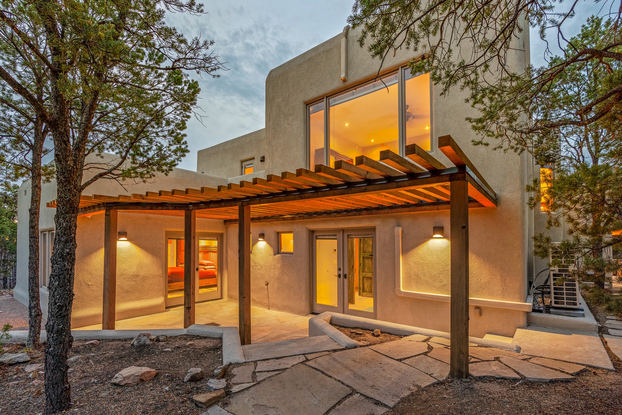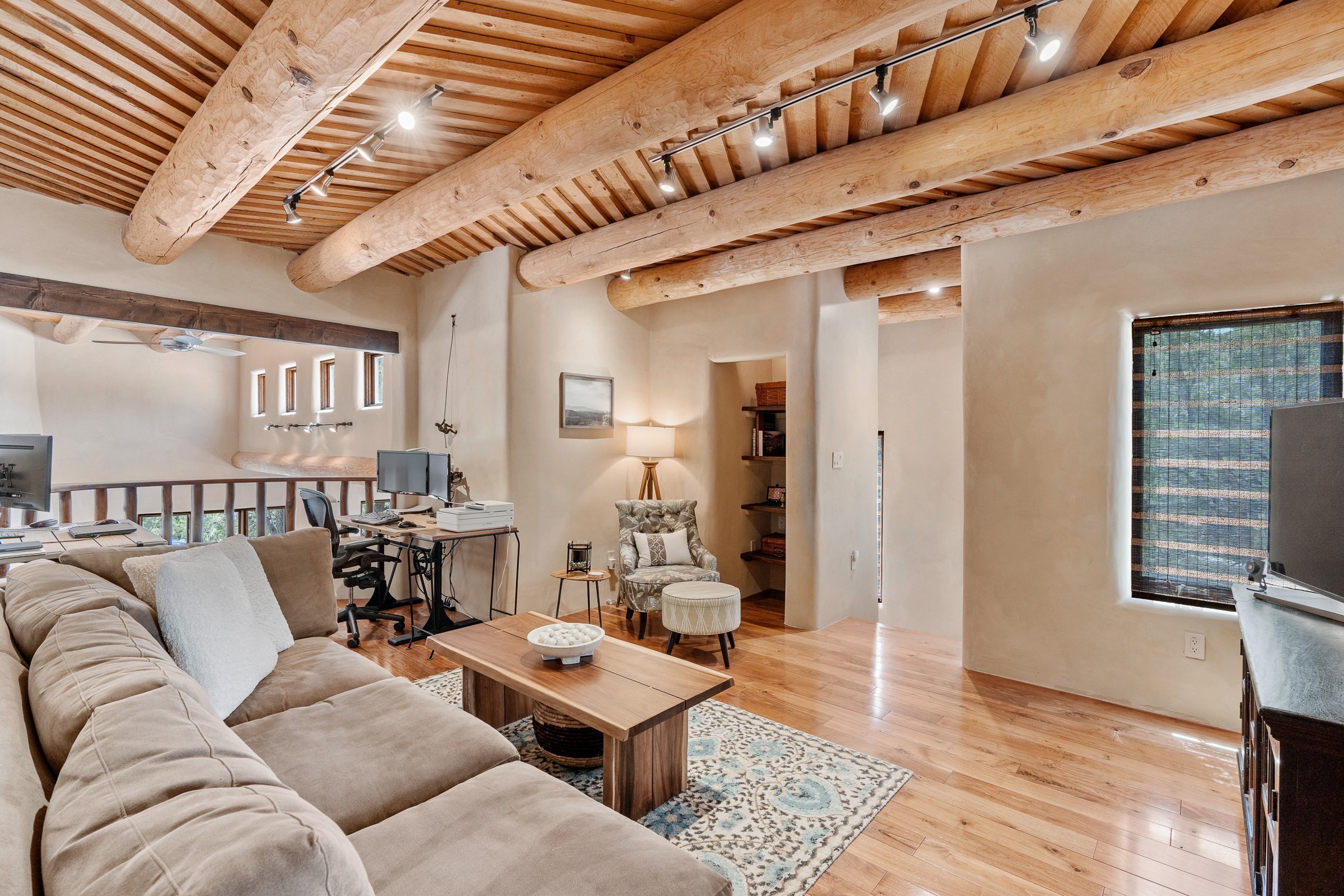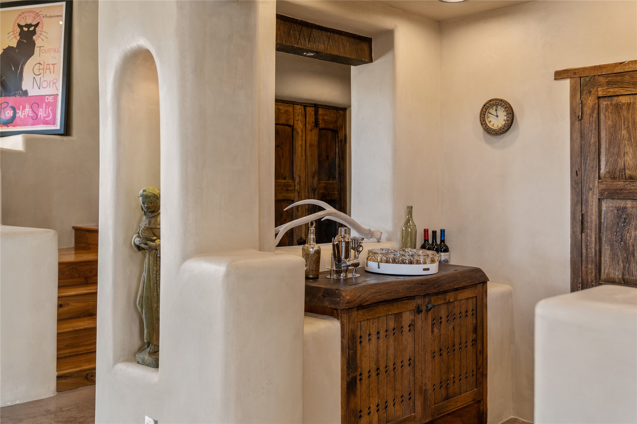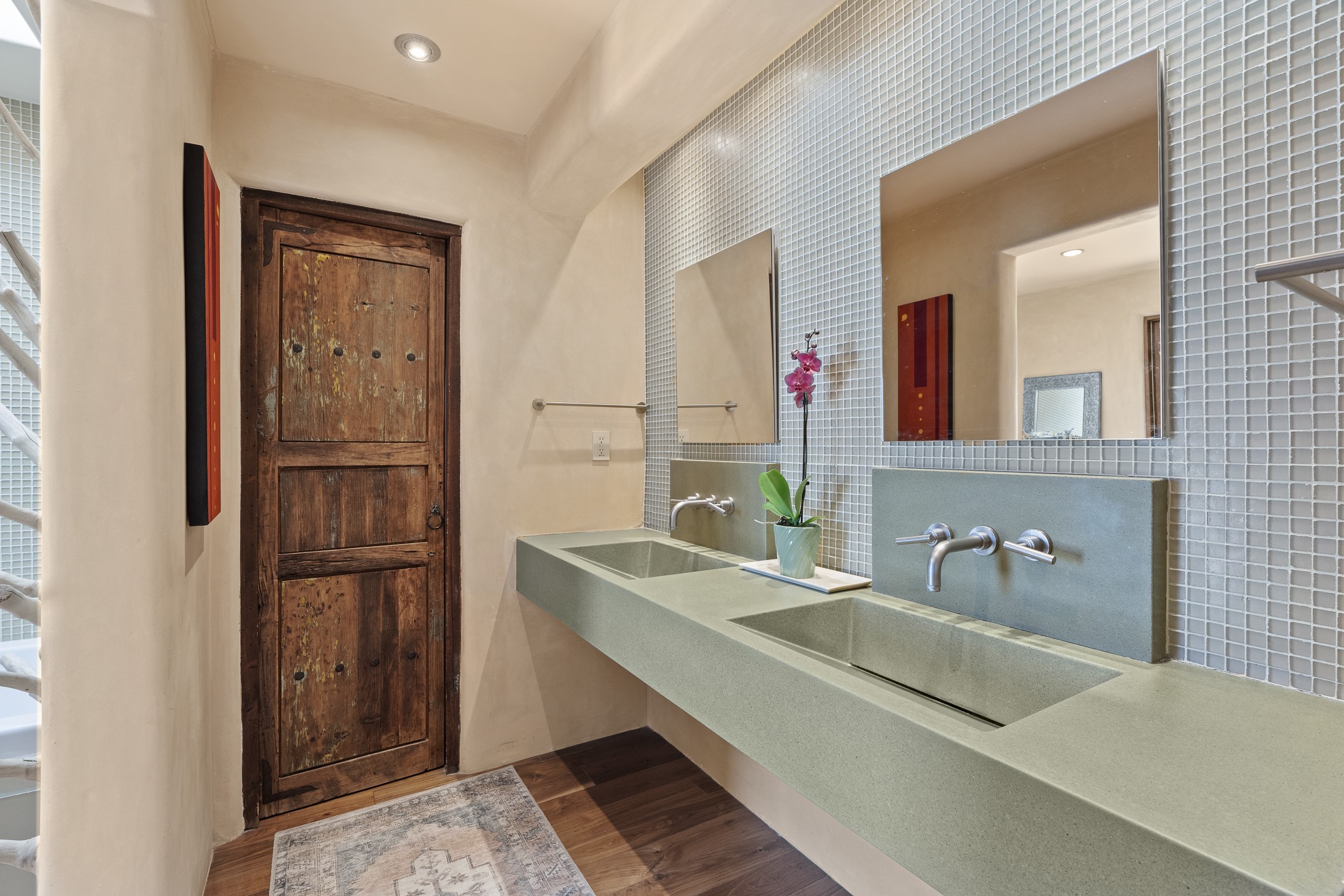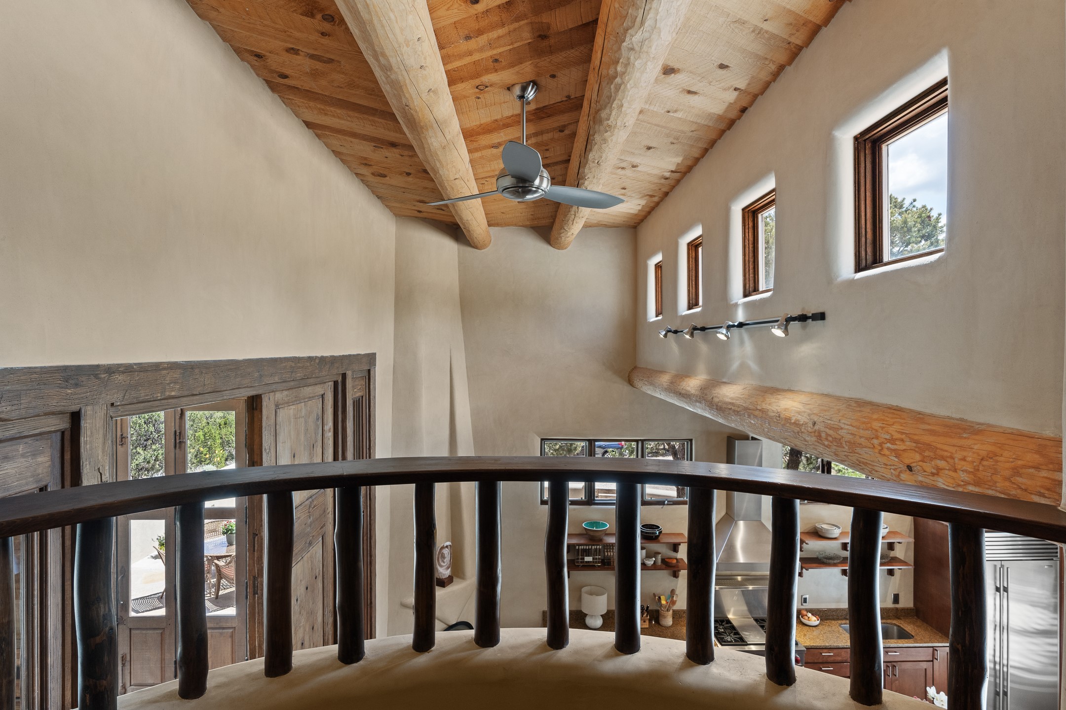 Beautifully sited on 2.5 acres in the foothills of the Sangre de Cristo Mountains, this stunning 3,836 sq. ft. home is a rare blend of traditional Santa Fe style, modern updates, and artistic provenance. Just 12 minutes from the historic Santa Fe Plaza, the property offers beautiful views of the Sangres, Jemez and Sandia Mountains, city lights, and Santa Fe's glorious sunsets. Originally built as a studio for the renowned Native American artist Bruce LaFountain and reimagined in 2001, the home has a distinct soul and history--including its appearance in a feature film. Every detail has been curated with intention, from the antique solid wood doors sourced from La Puerta Originals to the custom American Clay plaster walls, soaring ceilings, exposed vigas and rich natural light throughout. At the heart of the home is a chef's kitchen outfitted with center island, a built-in coffee wet bar with wine refrigerator, and an inviting intimate sitting area centered around a traditional kiva fireplace. This space flows seamlessly to a pergola-covered entertaining patio--ideal for grilling and relaxation. Towering ceilings grace the living room and dining room which also showcases stunning 14-foot antique doors from a Spanish Church and is connected to a spacious view patio ideal for entertaining and taking in the peace and drama of the skies and mountains. The primary suite is located upstairs and features a den/study as well as a spa like bath and a private roof top area with direct access from both the bedroom and bath. The downstairs guest area is separated for ultimate privacy area with each room having direct access to an outdoor space perfect for getting away from it all. Additional highlights include radiant in-floor heating, mini-splits for instant heating and cooling and over $200,000 in thoughtful improvements ensuring ease of living--highlighted by a new boiler and hot water heater, newer roof, newer stucco, newer washer and dryer. An optional designer furniture package is available for purchase, making this extraordinary home move-in ready for those seeking authenticity, elegance, and a true sense of place.