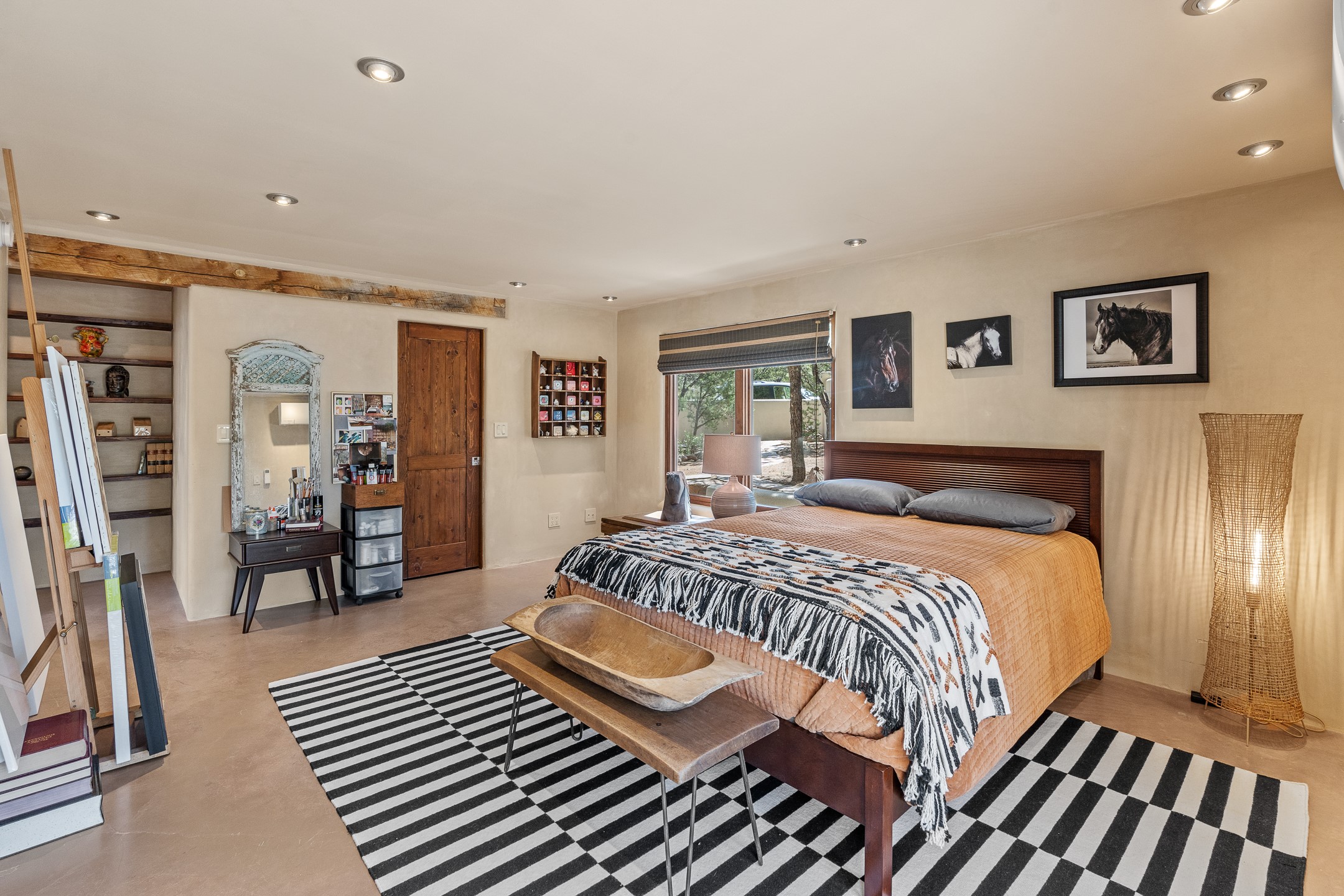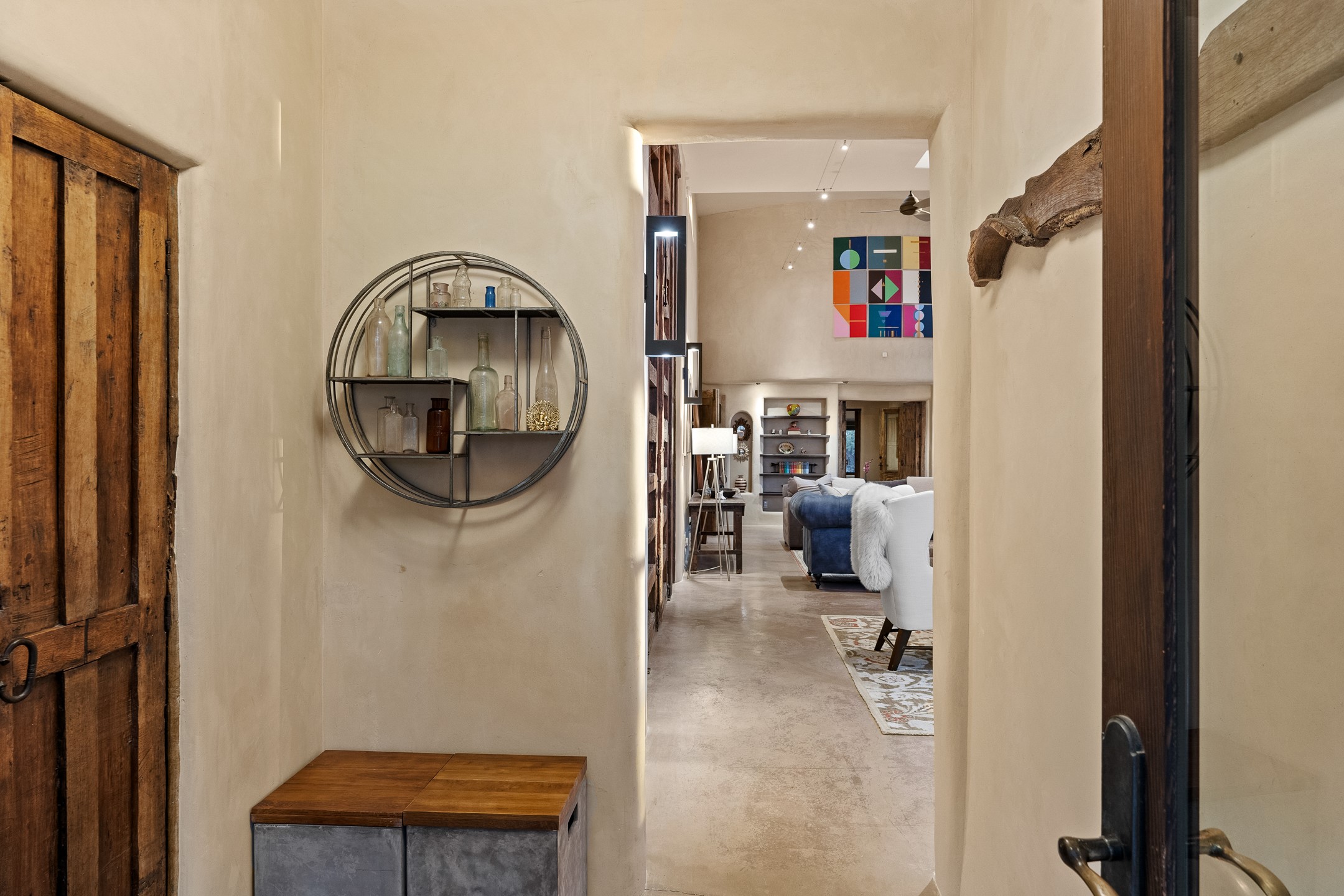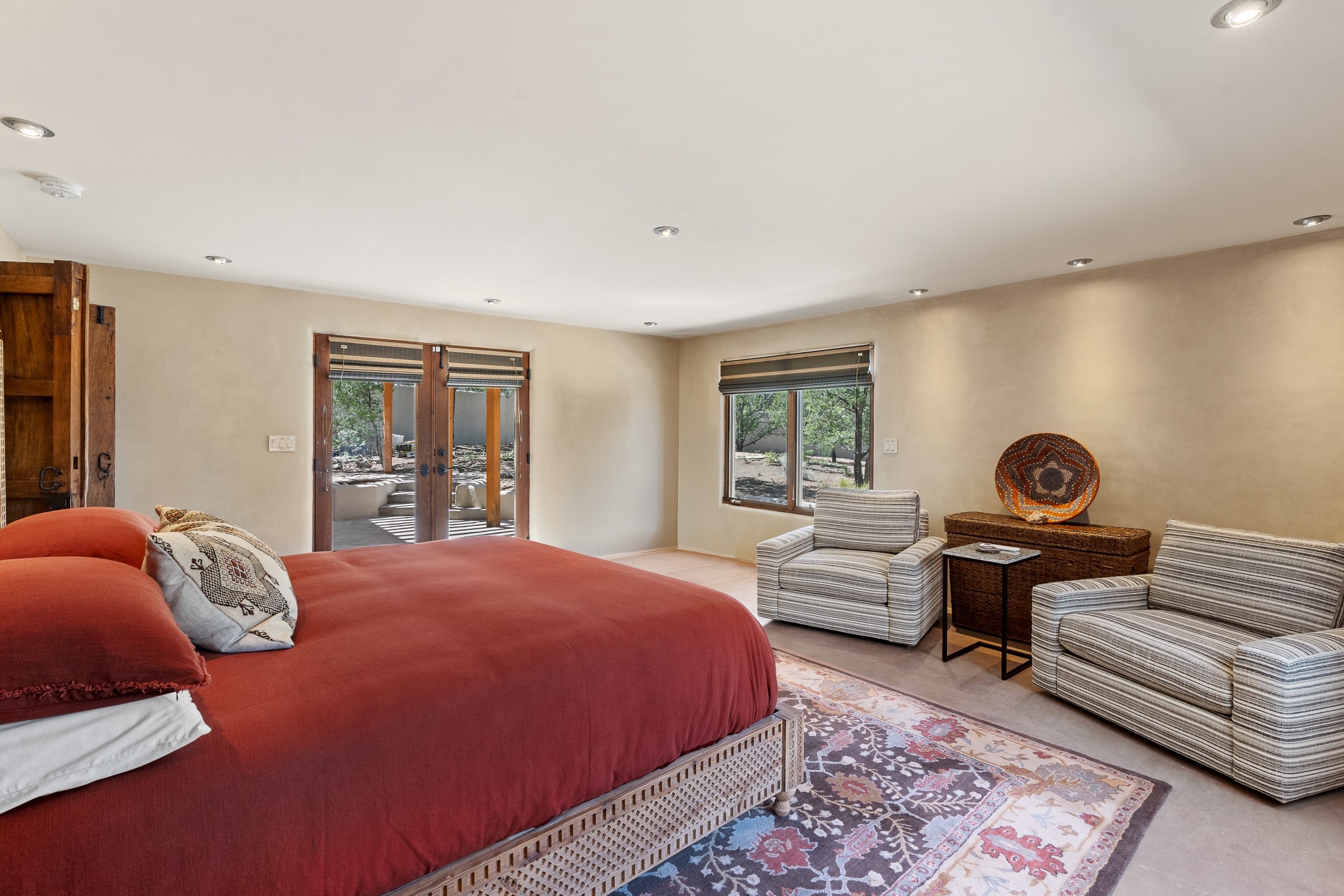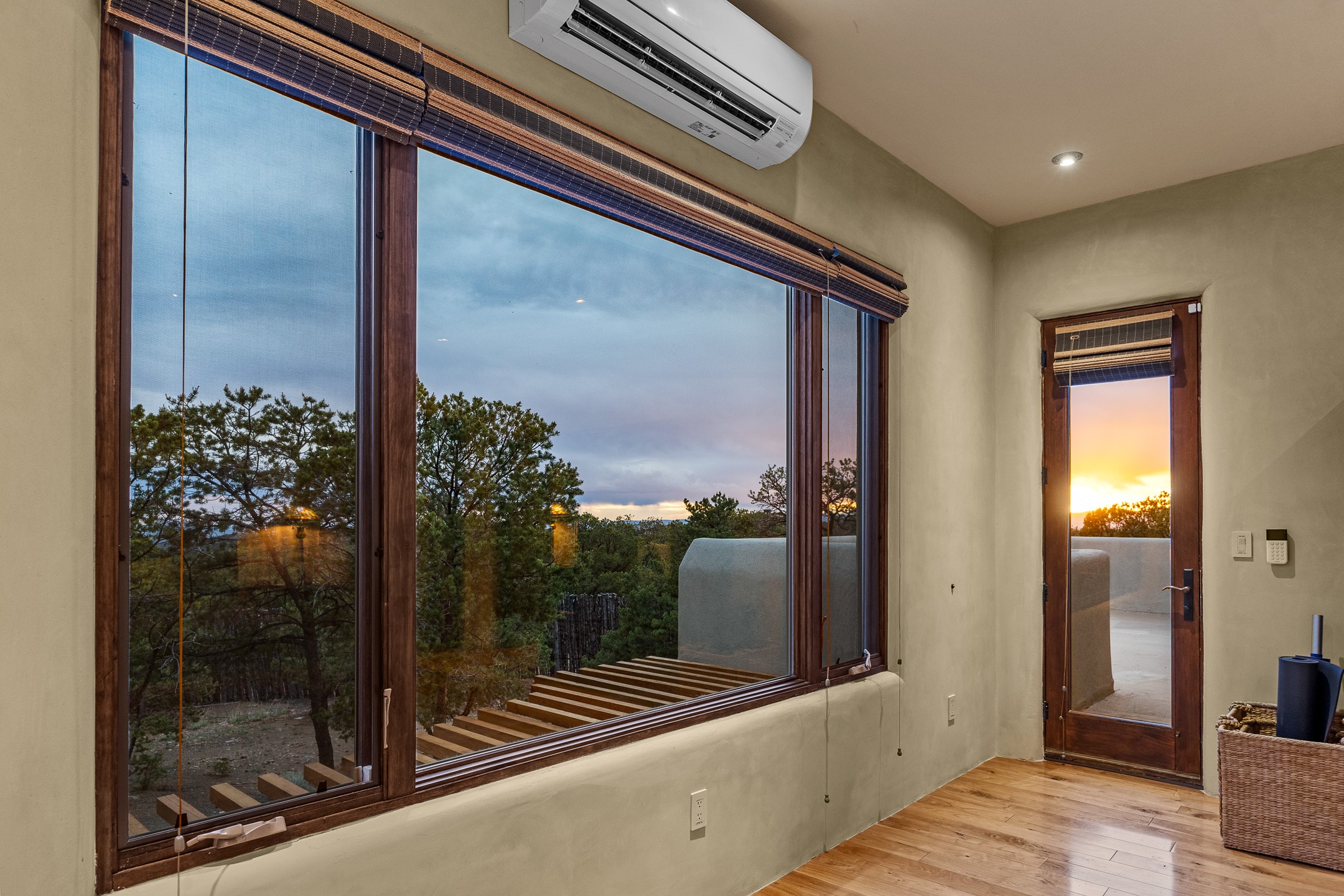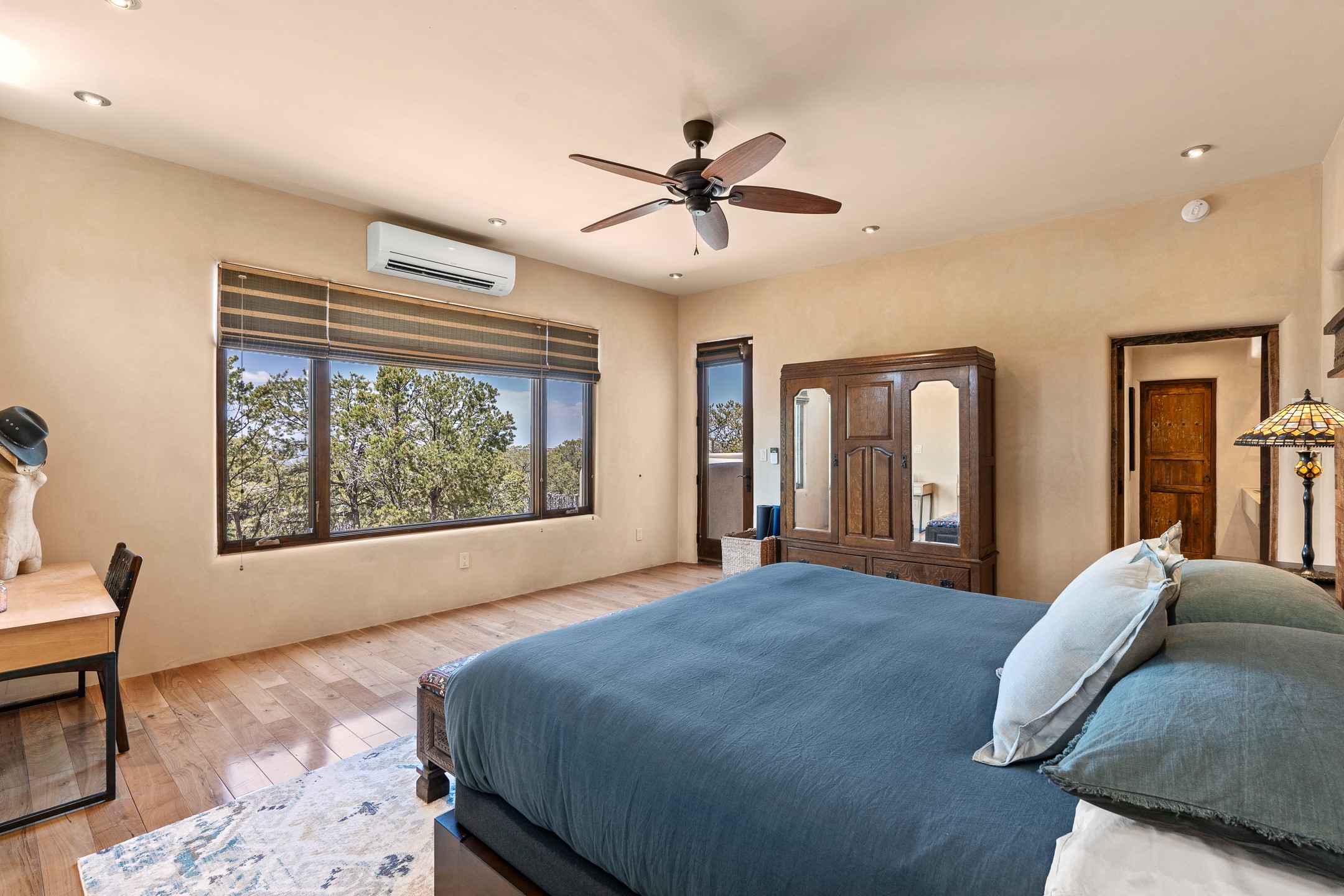 Beautifully sited on 2.5 acres in the foothills of the Sangre de Cristo Mountains, this stunning 3,836 sq. ft. home is a rare blend of traditional Santa Fe style, modern updates, and artistic provenance. Just 12 minutes from the historic Santa Fe Plaza, the property offers beautiful views of the Sangres, Jemez and Sandia Mountains, city lights, and Santa Fe's glorious sunsets. Originally built as a studio for the renowned Native American artist Bruce LaFountain and reimagined in 2001, the home has a distinct soul and history--including its appearance in a feature film. Every detail has been curated with intention, from the antique solid wood doors sourced from La Puerta Originals to the custom American Clay plaster walls, soaring ceilings, exposed vigas and rich natural light throughout. At the heart of the home is a chef's kitchen outfitted with center island, a built-in coffee wet bar with wine refrigerator, and an inviting intimate sitting area centered around a traditional kiva fireplace. This space flows seamlessly to a pergola-covered entertaining patio--ideal for grilling and relaxation. Towering ceilings grace the living room and dining room which also showcases stunning 14-foot antique doors from a Spanish Church and is connected to a spacious view patio ideal for entertaining and taking in the peace and drama of the skies and mountains. The primary suite is located upstairs and features a den/study as well as a spa like bath and a private roof top area with direct access from both the bedroom and bath. The downstairs guest area is separated for ultimate privacy area with each room having direct access to an outdoor space perfect for getting away from it all. Additional highlights include radiant in-floor heating, mini-splits for instant heating and cooling and over $200,000 in thoughtful improvements ensuring ease of living--highlighted by a new boiler and hot water heater, newer roof, newer stucco, newer washer and dryer. An optional designer furniture package is available for purchase, making this extraordinary home move-in ready for those seeking authenticity, elegance, and a true sense of place.