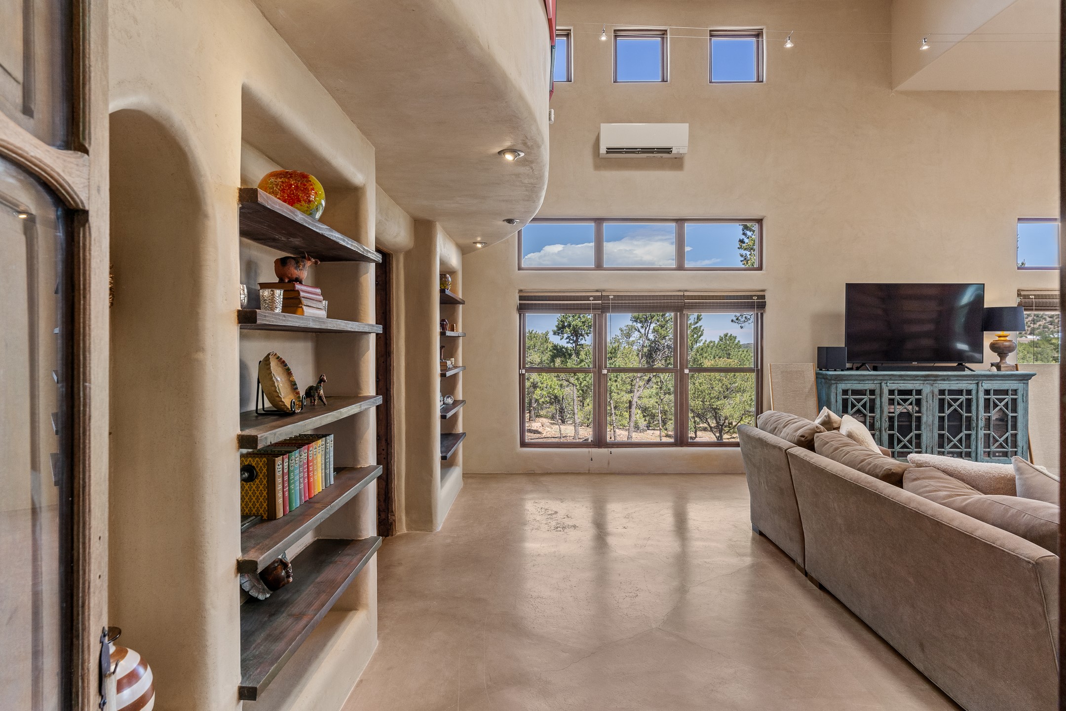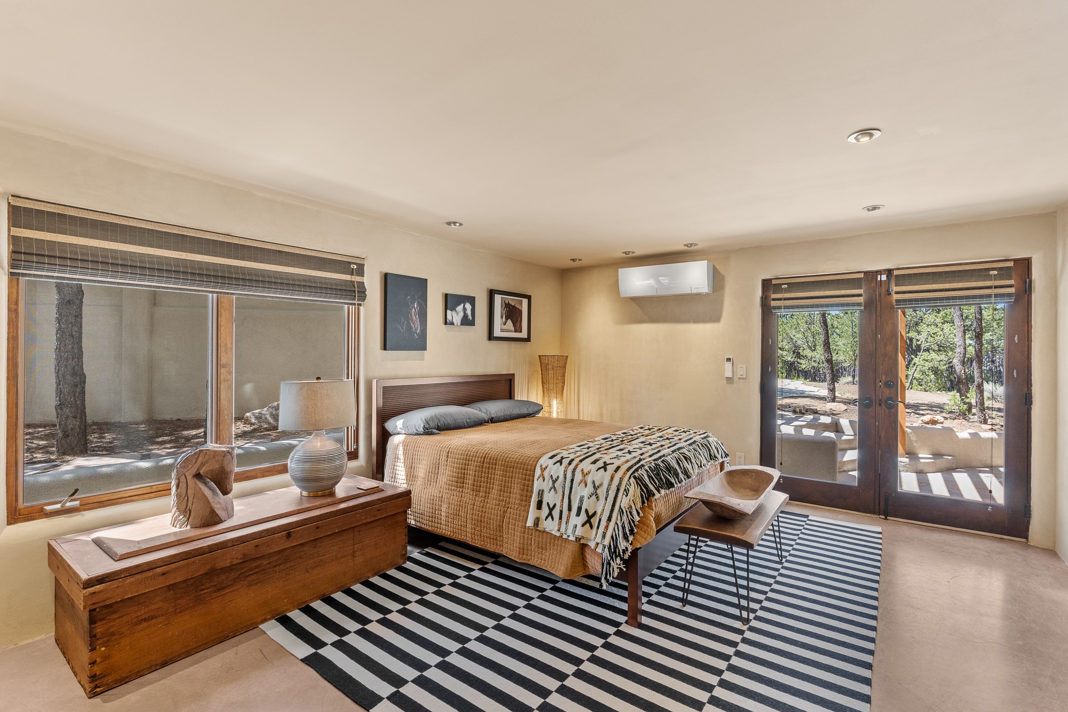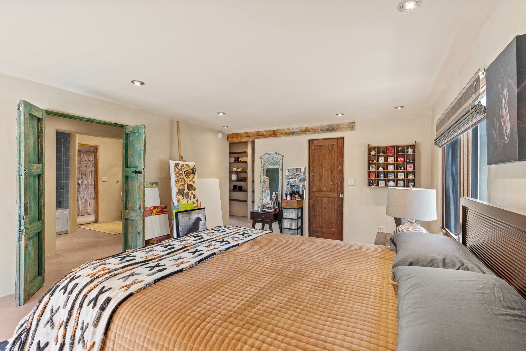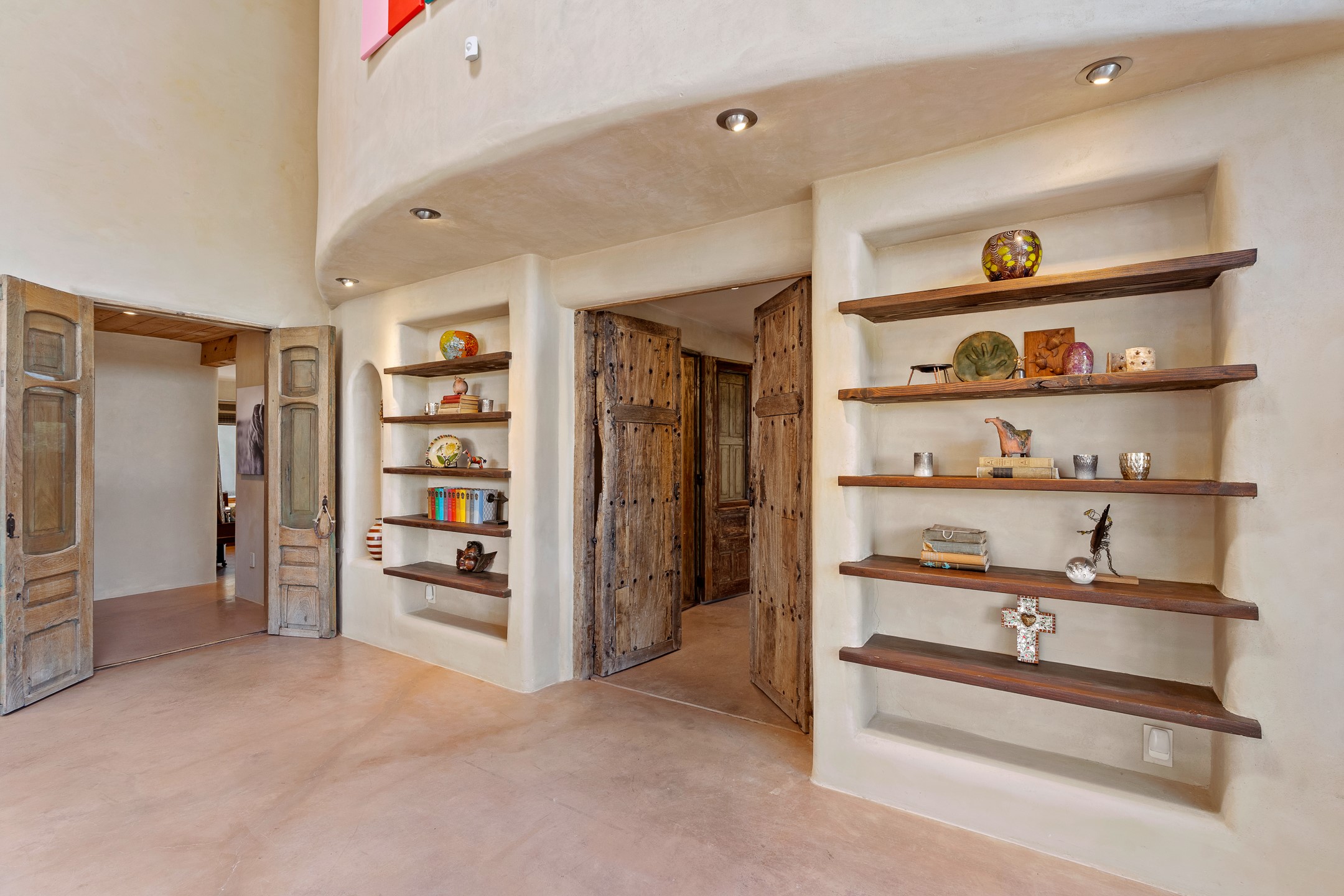 Beautifully sited on 2.5 acres in the foothills of the Sangre de Cristo Mountains, this stunning 3,836 sq. ft. home is a rare blend of traditional Santa Fe style, modern updates, and artistic provenance. Just 12 minutes from the historic Santa Fe Plaza, the property offers beautiful views of the Sangres, Jemez and Sandia Mountains, city lights, and Santa Fe's glorious sunsets. Originally built as a studio for the renowned Native American artist Bruce LaFountain and reimagined in 2001, the home has a distinct soul and history--including its appearance in a feature film. Every detail has been curated with intention, from the antique solid wood doors sourced from La Puerta Originals to the custom American Clay plaster walls, soaring ceilings, exposed vigas and rich natural light throughout. At the heart of the home is a chef's kitchen outfitted with center island, a built-in coffee wet bar with wine refrigerator, and an inviting intimate sitting area centered around a traditional kiva fireplace. This space flows seamlessly to a pergola-covered entertaining patio--ideal for grilling and relaxation. Towering ceilings grace the living room and dining room which also showcases stunning 14-foot antique doors from a Spanish Church and is connected to a spacious view patio ideal for entertaining and taking in the peace and drama of the skies and mountains. The primary suite is located upstairs and features a den/study as well as a spa like bath and a private roof top area with direct access from both the bedroom and bath. The downstairs guest area is separated for ultimate privacy area with each room having direct access to an outdoor space perfect for getting away from it all. Additional highlights include radiant in-floor heating, mini-splits for instant heating and cooling and over $200,000 in thoughtful improvements ensuring ease of living--highlighted by a new boiler and hot water heater, newer roof, newer stucco, newer washer and dryer. An optional designer furniture package is available for purchase, making this extraordinary home move-in ready for those seeking authenticity, elegance, and a true sense of place.