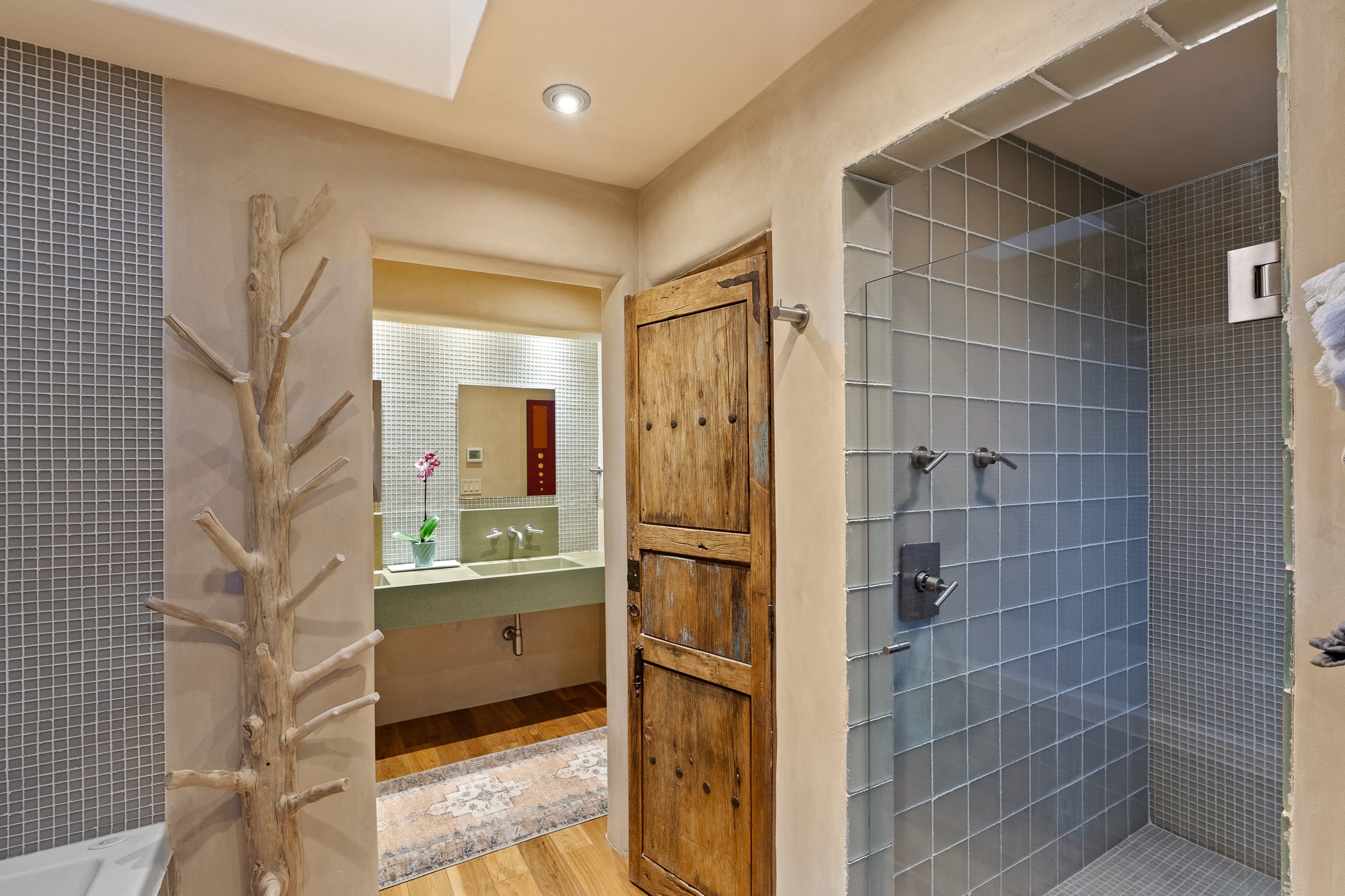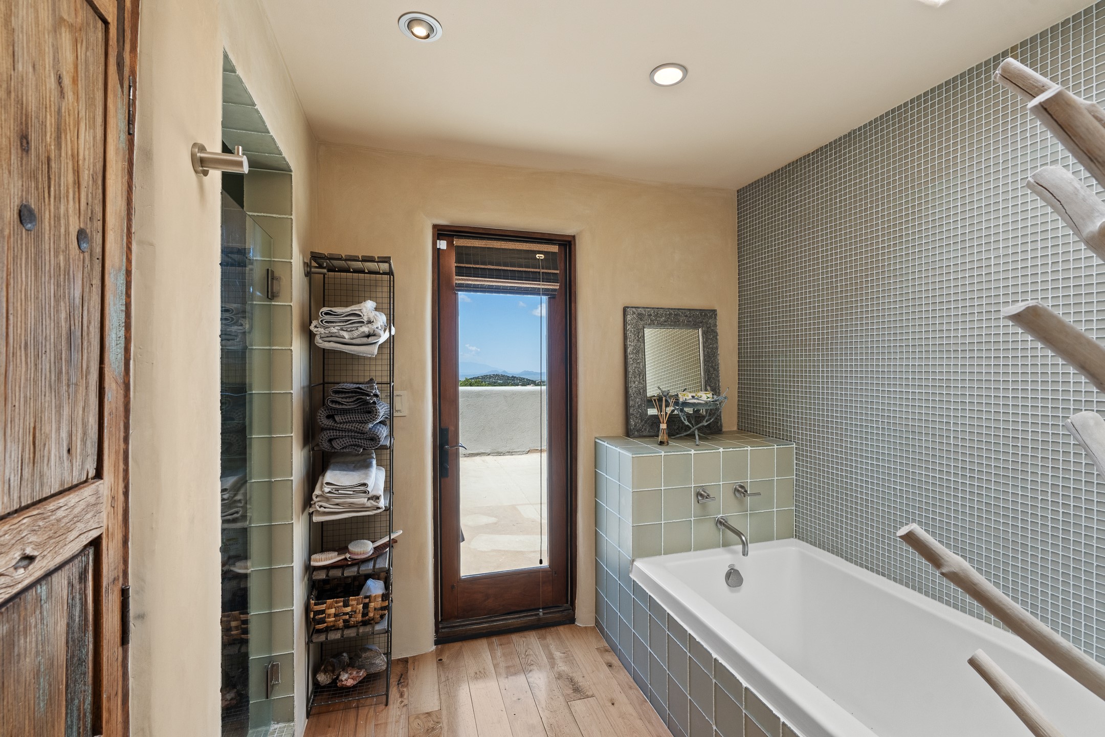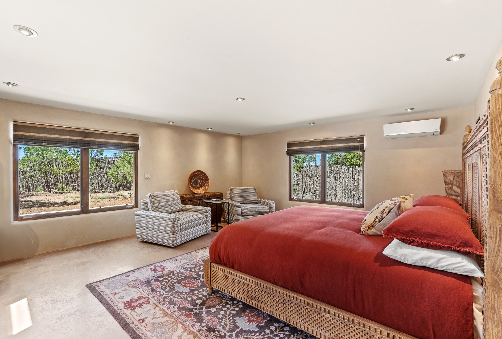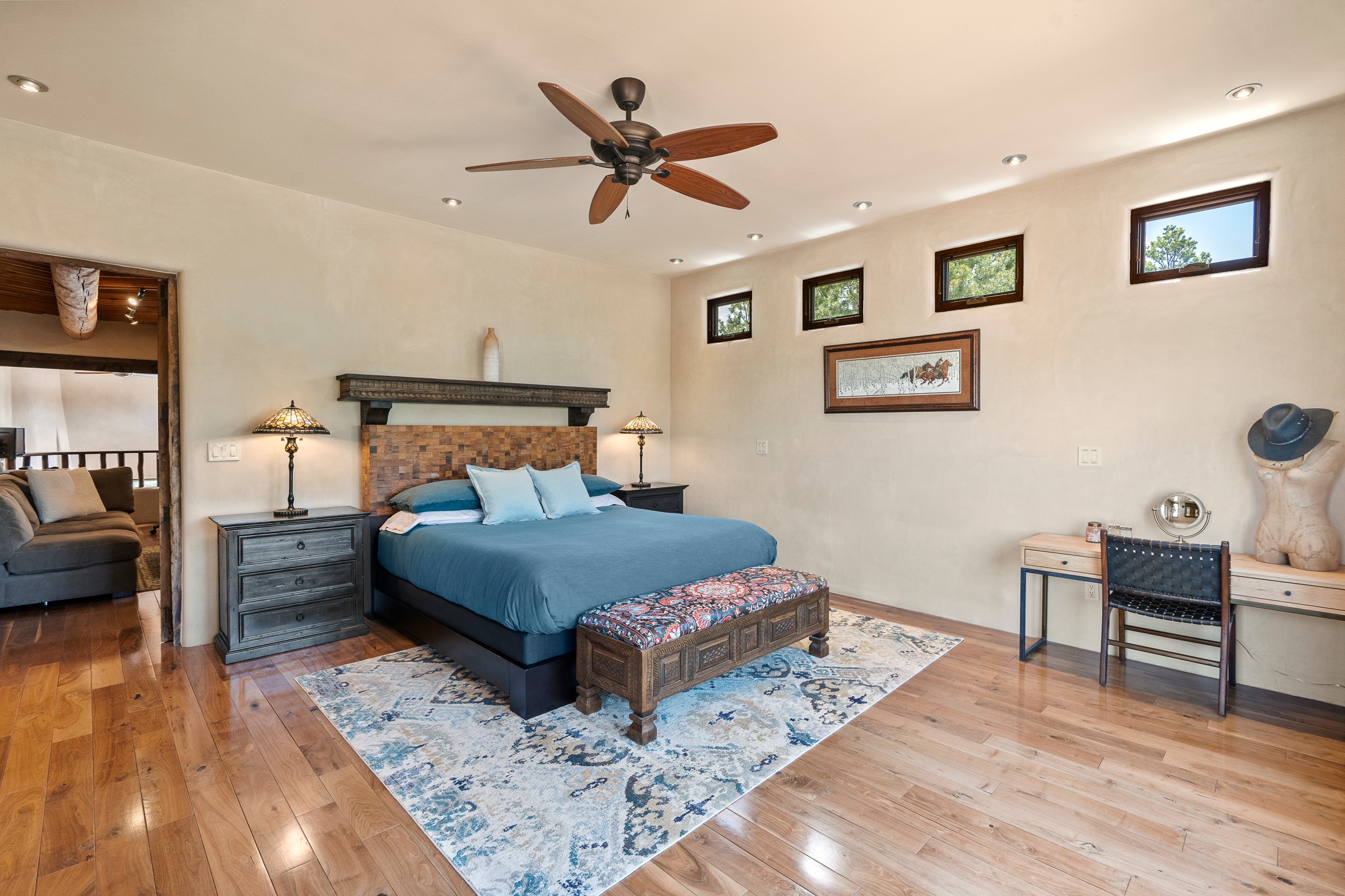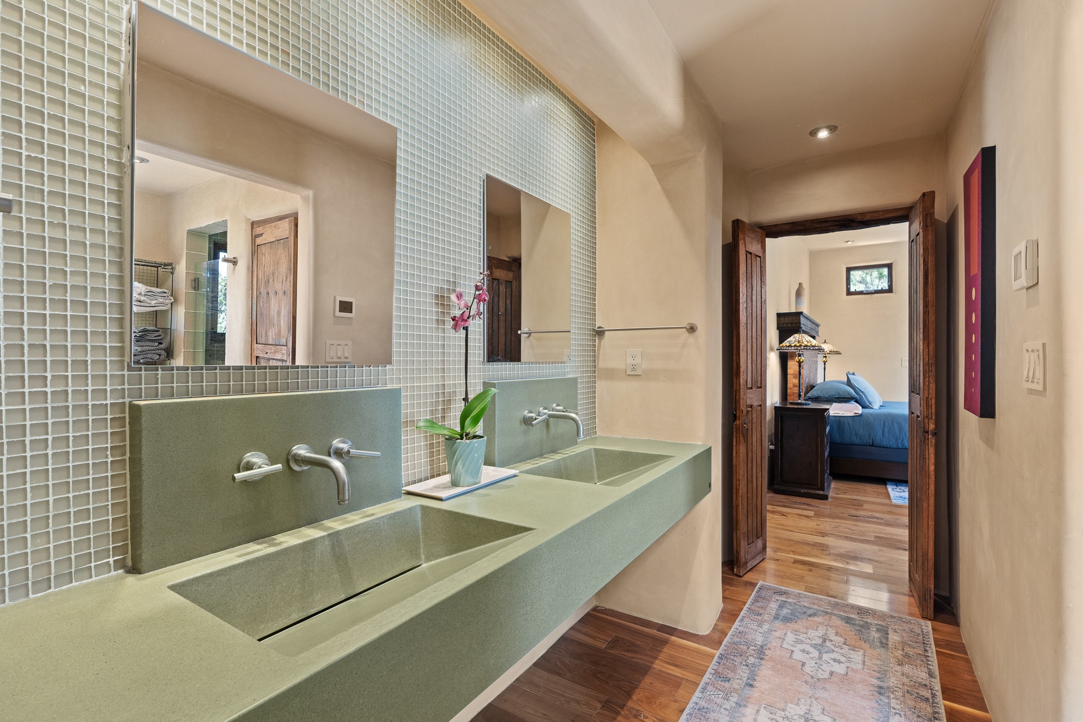 Beautifully sited on 2.5 acres in the foothills of the Sangre de Cristo Mountains, this stunning 3,836 sq. ft. home is a rare blend of traditional Santa Fe style, modern updates, and artistic provenance. Just 12 minutes from the historic Santa Fe Plaza, the property offers beautiful views of the Sangres, Jemez and Sandia Mountains, city lights, and Santa Fe's glorious sunsets. Originally built as a studio for the renowned Native American artist Bruce LaFountain and reimagined in 2001, the home has a distinct soul and history--including its appearance in a feature film. Every detail has been curated with intention, from the antique solid wood doors sourced from La Puerta Originals to the custom American Clay plaster walls, soaring ceilings, exposed vigas and rich natural light throughout. At the heart of the home is a chef's kitchen outfitted with center island, a built-in coffee wet bar with wine refrigerator, and an inviting intimate sitting area centered around a traditional kiva fireplace. This space flows seamlessly to a pergola-covered entertaining patio--ideal for grilling and relaxation. Towering ceilings grace the living room and dining room which also showcases stunning 14-foot antique doors from a Spanish Church and is connected to a spacious view patio ideal for entertaining and taking in the peace and drama of the skies and mountains. The primary suite is located upstairs and features a den/study as well as a spa like bath and a private roof top area with direct access from both the bedroom and bath. The downstairs guest area is separated for ultimate privacy area with each room having direct access to an outdoor space perfect for getting away from it all. Additional highlights include radiant in-floor heating, mini-splits for instant heating and cooling and over $200,000 in thoughtful improvements ensuring ease of living--highlighted by a new boiler and hot water heater, newer roof, newer stucco, newer washer and dryer. An optional designer furniture package is available for purchase, making this extraordinary home move-in ready for those seeking authenticity, elegance, and a true sense of place.