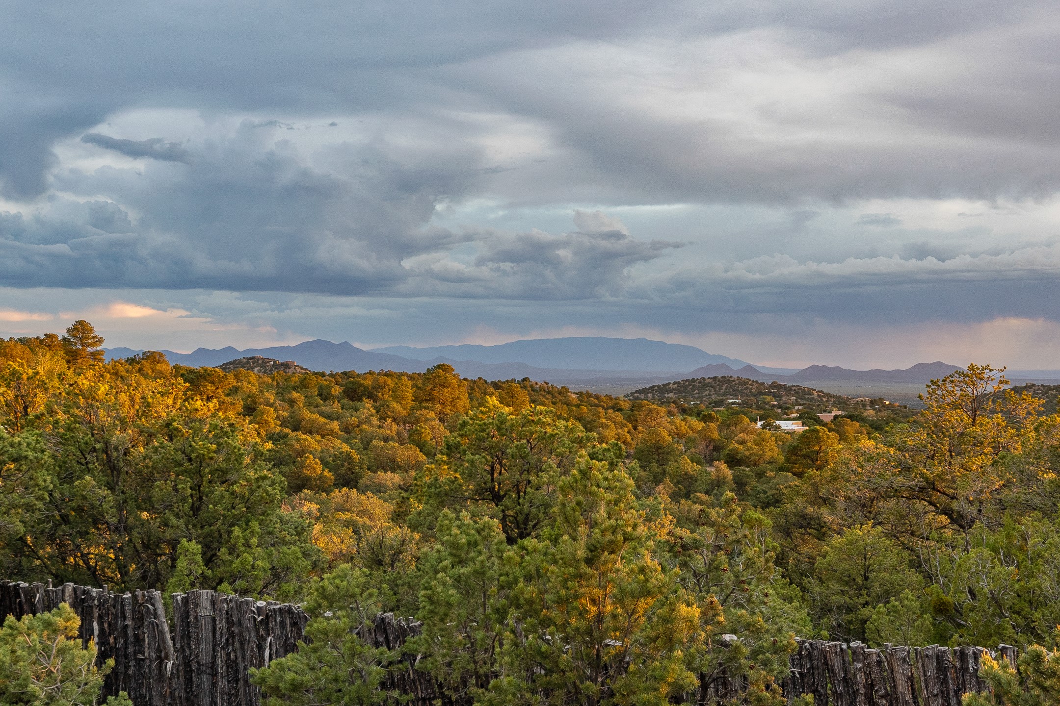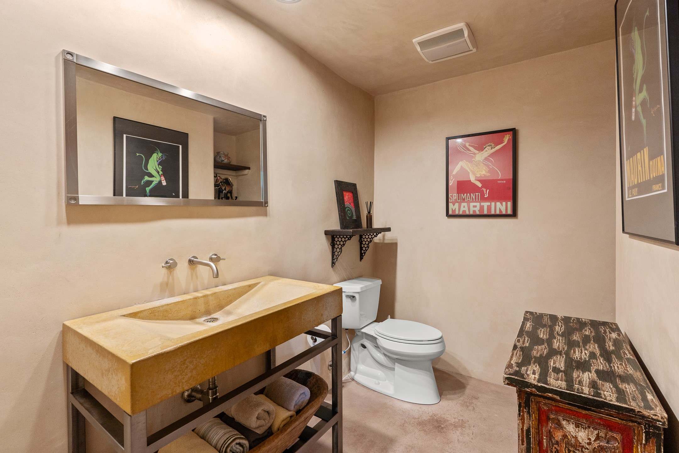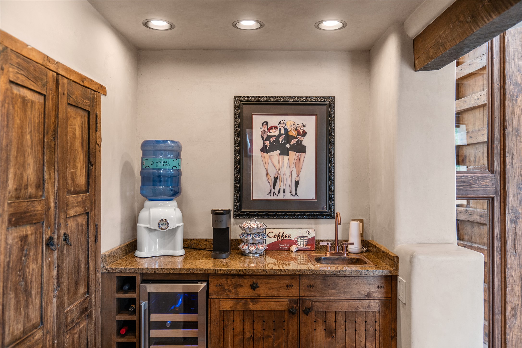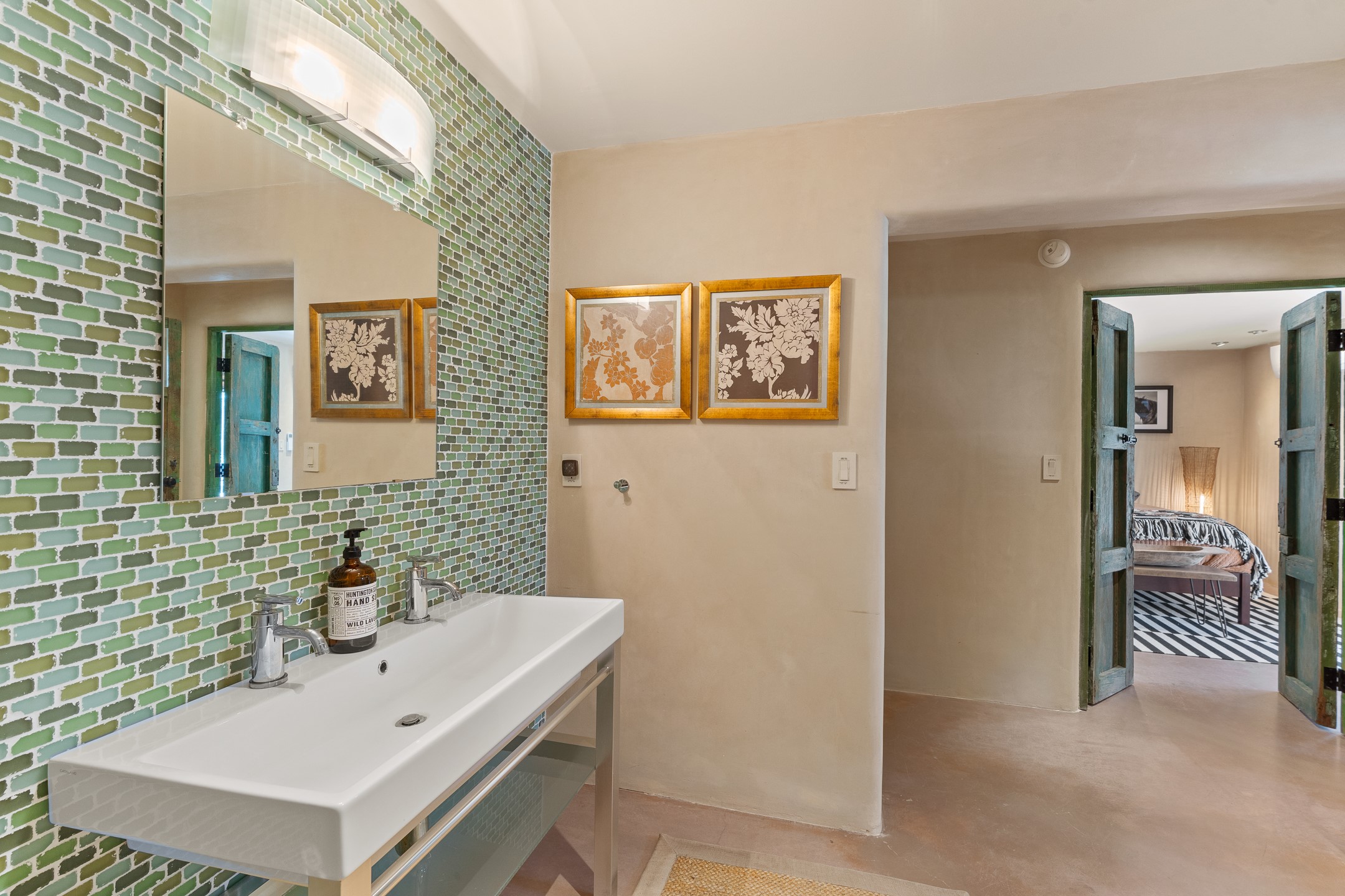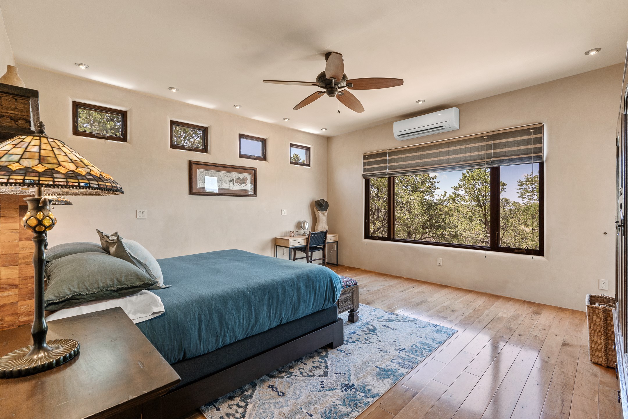 Beautifully sited on 2.5 acres in the foothills of the Sangre de Cristo Mountains, this stunning 3,836 sq. ft. home is a rare blend of traditional Santa Fe style, modern updates, and artistic provenance. Just 12 minutes from the historic Santa Fe Plaza, the property offers beautiful views of the Sangres, Jemez and Sandia Mountains, city lights, and Santa Fe's glorious sunsets. Originally built as a studio for the renowned Native American artist Bruce LaFountain and reimagined in 2001, the home has a distinct soul and history--including its appearance in a feature film. Every detail has been curated with intention, from the antique solid wood doors sourced from La Puerta Originals to the custom American Clay plaster walls, soaring ceilings, exposed vigas and rich natural light throughout. At the heart of the home is a chef's kitchen outfitted with center island, a built-in coffee wet bar with wine refrigerator, and an inviting intimate sitting area centered around a traditional kiva fireplace. This space flows seamlessly to a pergola-covered entertaining patio--ideal for grilling and relaxation. Towering ceilings grace the living room and dining room which also showcases stunning 14-foot antique doors from a Spanish Church and is connected to a spacious view patio ideal for entertaining and taking in the peace and drama of the skies and mountains. The primary suite is located upstairs and features a den/study as well as a spa like bath and a private roof top area with direct access from both the bedroom and bath. The downstairs guest area is separated for ultimate privacy area with each room having direct access to an outdoor space perfect for getting away from it all. Additional highlights include radiant in-floor heating, mini-splits for instant heating and cooling and over $200,000 in thoughtful improvements ensuring ease of living--highlighted by a new boiler and hot water heater, newer roof, newer stucco, newer washer and dryer. An optional designer furniture package is available for purchase, making this extraordinary home move-in ready for those seeking authenticity, elegance, and a true sense of place.
