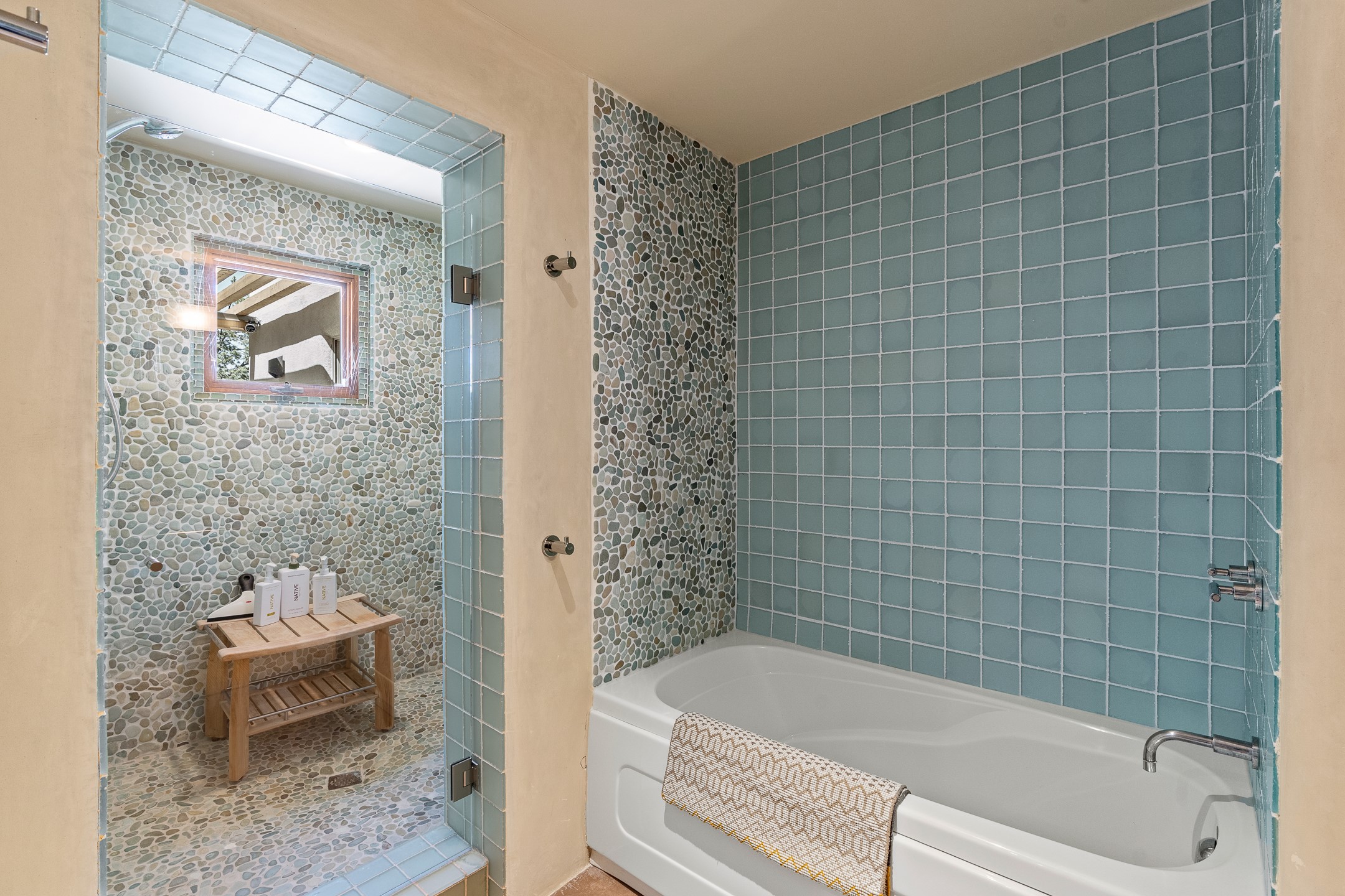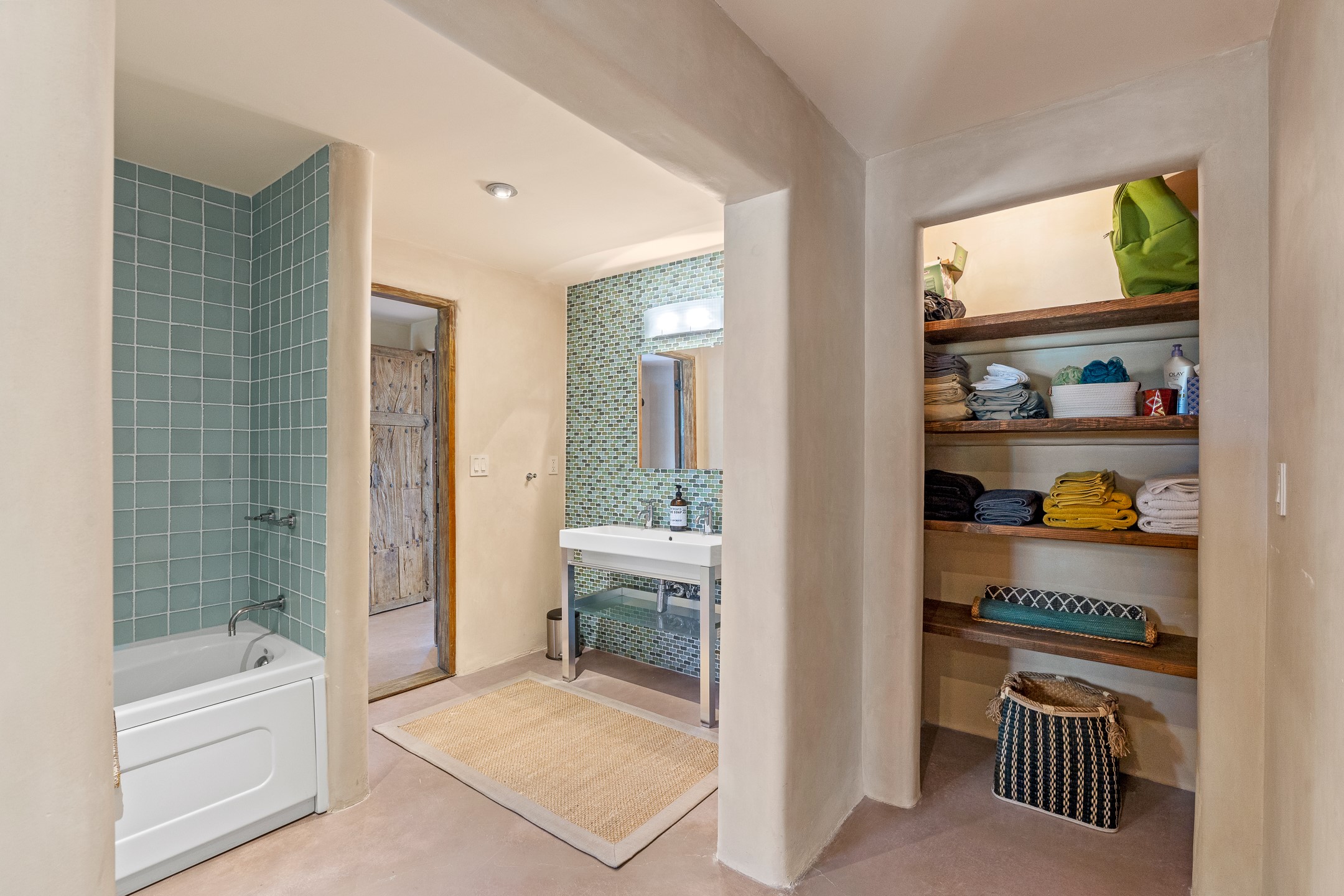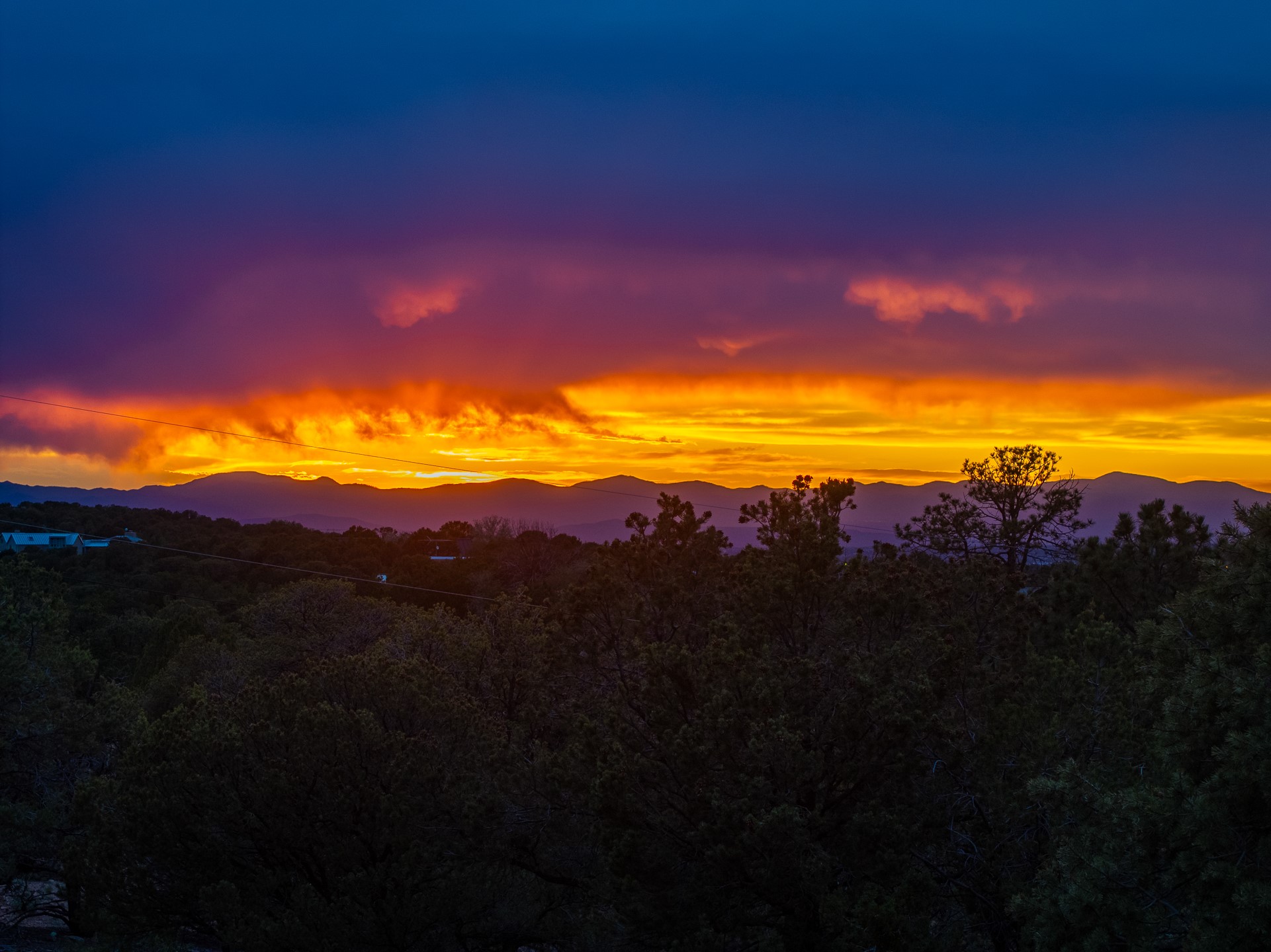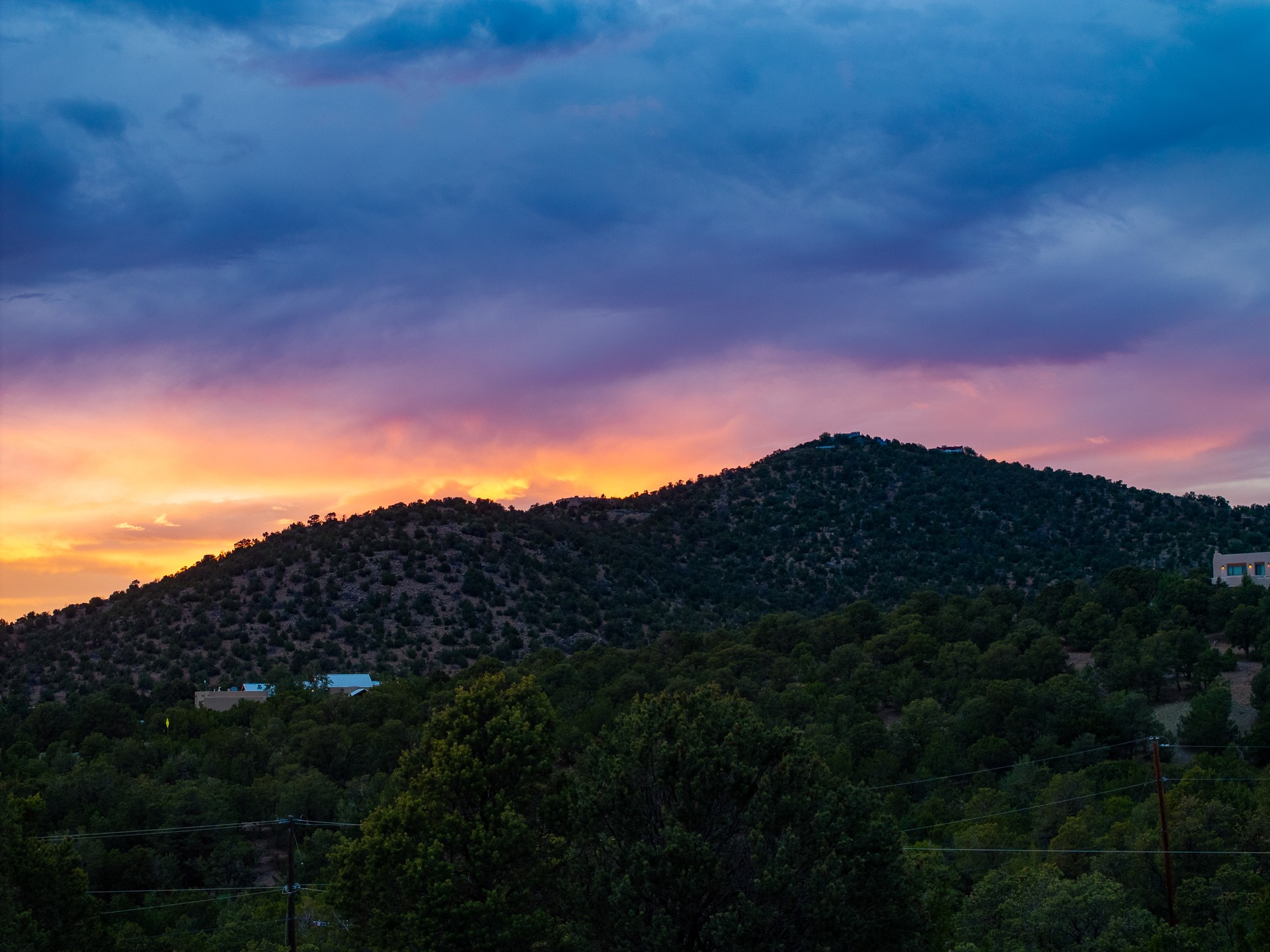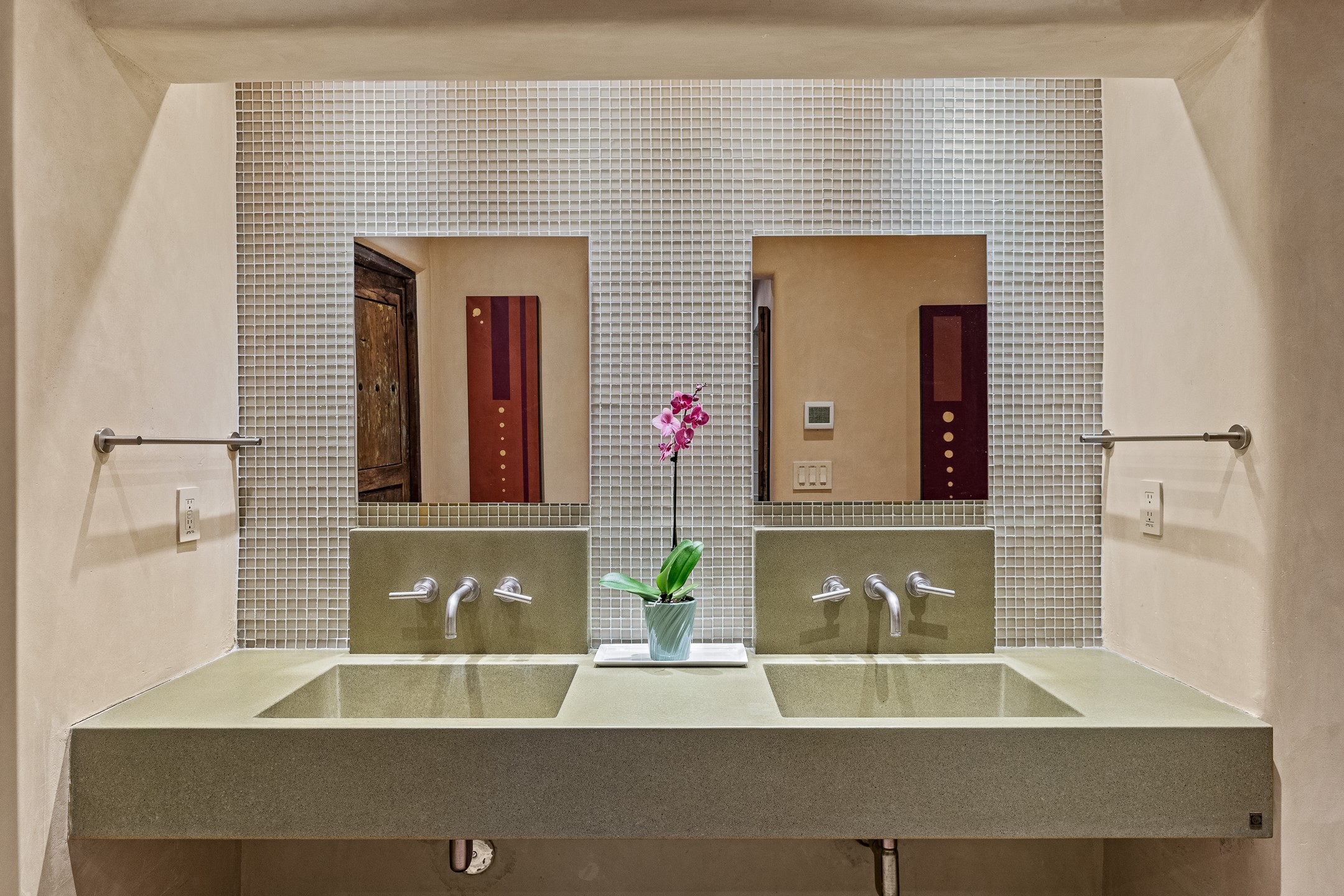 Beautifully sited on 2.5 acres in the foothills of the Sangre de Cristo Mountains, this stunning 3,836 sq. ft. home is a rare blend of traditional Santa Fe style, modern updates, and artistic provenance. Just 12 minutes from the historic Santa Fe Plaza, the property offers beautiful views of the Sangres, Jemez and Sandia Mountains, city lights, and Santa Fe's glorious sunsets. Originally built as a studio for the renowned Native American artist Bruce LaFountain and reimagined in 2001, the home has a distinct soul and history--including its appearance in a feature film. Every detail has been curated with intention, from the antique solid wood doors sourced from La Puerta Originals to the custom American Clay plaster walls, soaring ceilings, exposed vigas and rich natural light throughout. At the heart of the home is a chef's kitchen outfitted with center island, a built-in coffee wet bar with wine refrigerator, and an inviting intimate sitting area centered around a traditional kiva fireplace. This space flows seamlessly to a pergola-covered entertaining patio--ideal for grilling and relaxation. Towering ceilings grace the living room and dining room which also showcases stunning 14-foot antique doors from a Spanish Church and is connected to a spacious view patio ideal for entertaining and taking in the peace and drama of the skies and mountains. The primary suite is located upstairs and features a den/study as well as a spa like bath and a private roof top area with direct access from both the bedroom and bath. The downstairs guest area is separated for ultimate privacy area with each room having direct access to an outdoor space perfect for getting away from it all. Additional highlights include radiant in-floor heating, mini-splits for instant heating and cooling and over $200,000 in thoughtful improvements ensuring ease of living--highlighted by a new boiler and hot water heater, newer roof, newer stucco, newer washer and dryer. An optional designer furniture package is available for purchase, making this extraordinary home move-in ready for those seeking authenticity, elegance, and a true sense of place.