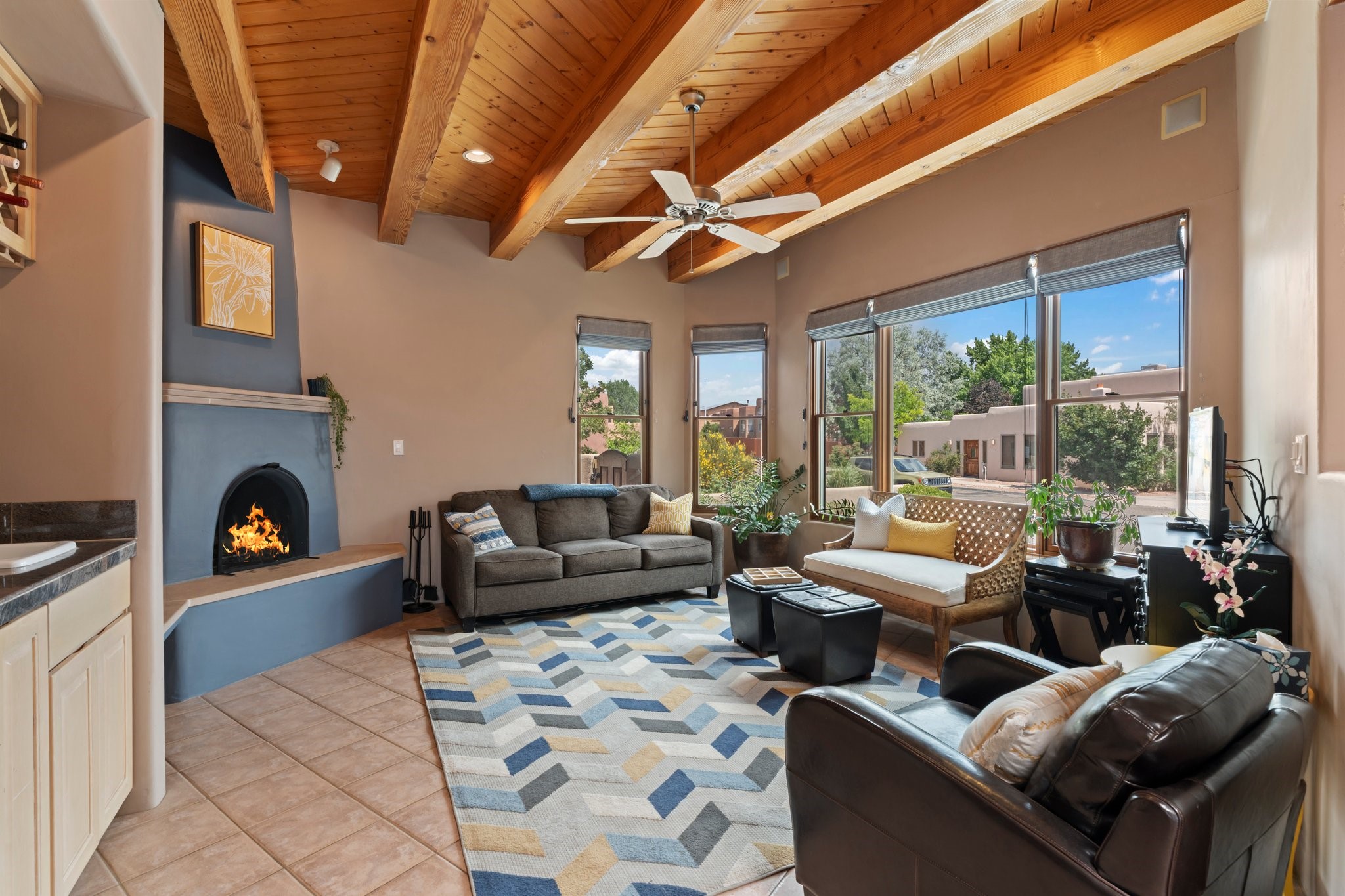 Welcome to your private sanctuary nestled on nearly a fifth of an acre of beautifully landscaped grounds, where comfort meets thoughtful design and timeless charm. This expansive 2,859 sq ft home, complemented by a detached 293 sq ft studio and a 308 sq ft storage space, offers exceptional versatility for modern living.Step inside to discover a spacious two-level layout designed with privacy and flow in mind. The main level is an entertainer's dream, featuring a light-filled chef's kitchen with granite countertops, a large center island, and newer appliances. The open dining area flows effortlessly into the family room with the living room just to the right of the front door, creating an inviting space for gatherings or quiet evenings at home. A full bath and a private bedroom on this level add convenience and flexibility for guests or a home office.Downstairs, you'll find the luxurious primary suite, where a spectacularly remodeled bathroom and expansive walk-in closet provide a serene retreat. Two additional well-appointed bedrooms, a stylish updated bathroom, and a conveniently located laundry room complete the lower level.Outside, the magic continues. The backyard is a peaceful haven with lush shade trees, a romantic sitting area, and a charming outdoor corner fireplace--perfect for alfresco evenings under the stars. Whether you're hosting guests or enjoying a quiet morning coffee, this outdoor space is designed to inspire.Additional highlights include a newer 4-year-old TPO roof, recently updated stucco, upgraded Pella picture windows, and a two-car garage with easy access to the kitchen.Don't miss this amazing home convenient to all things Santa Fe!