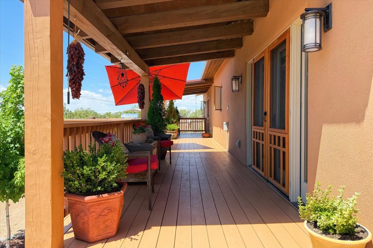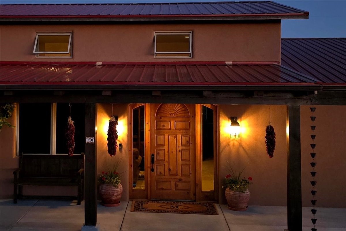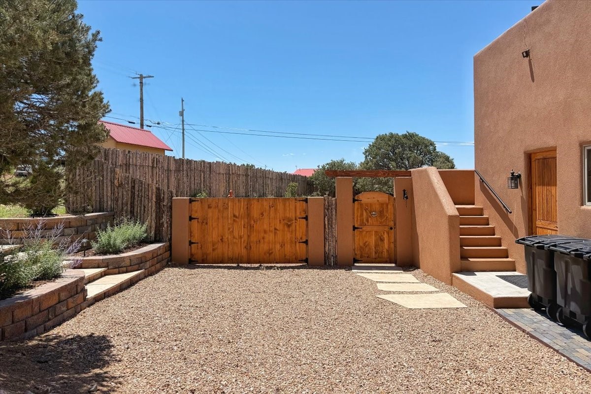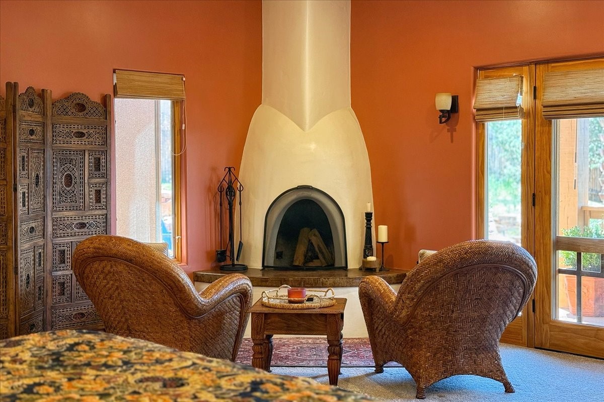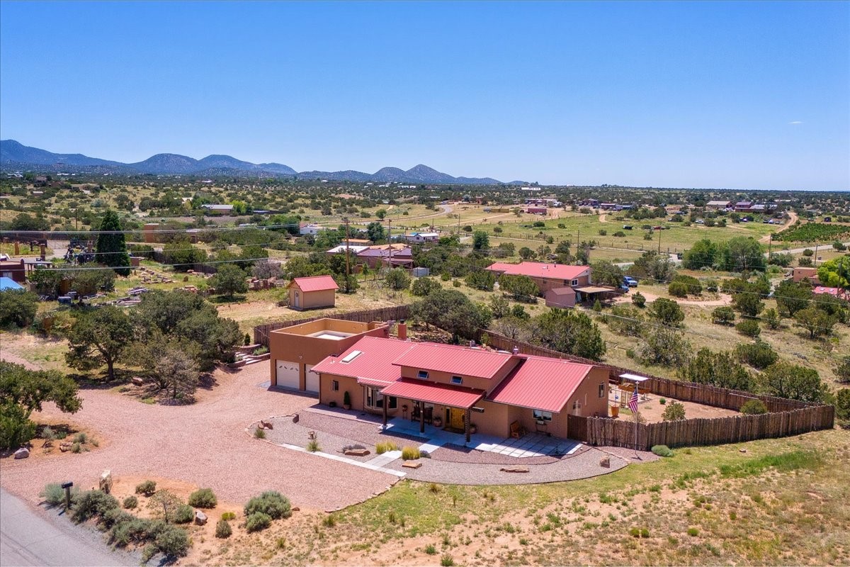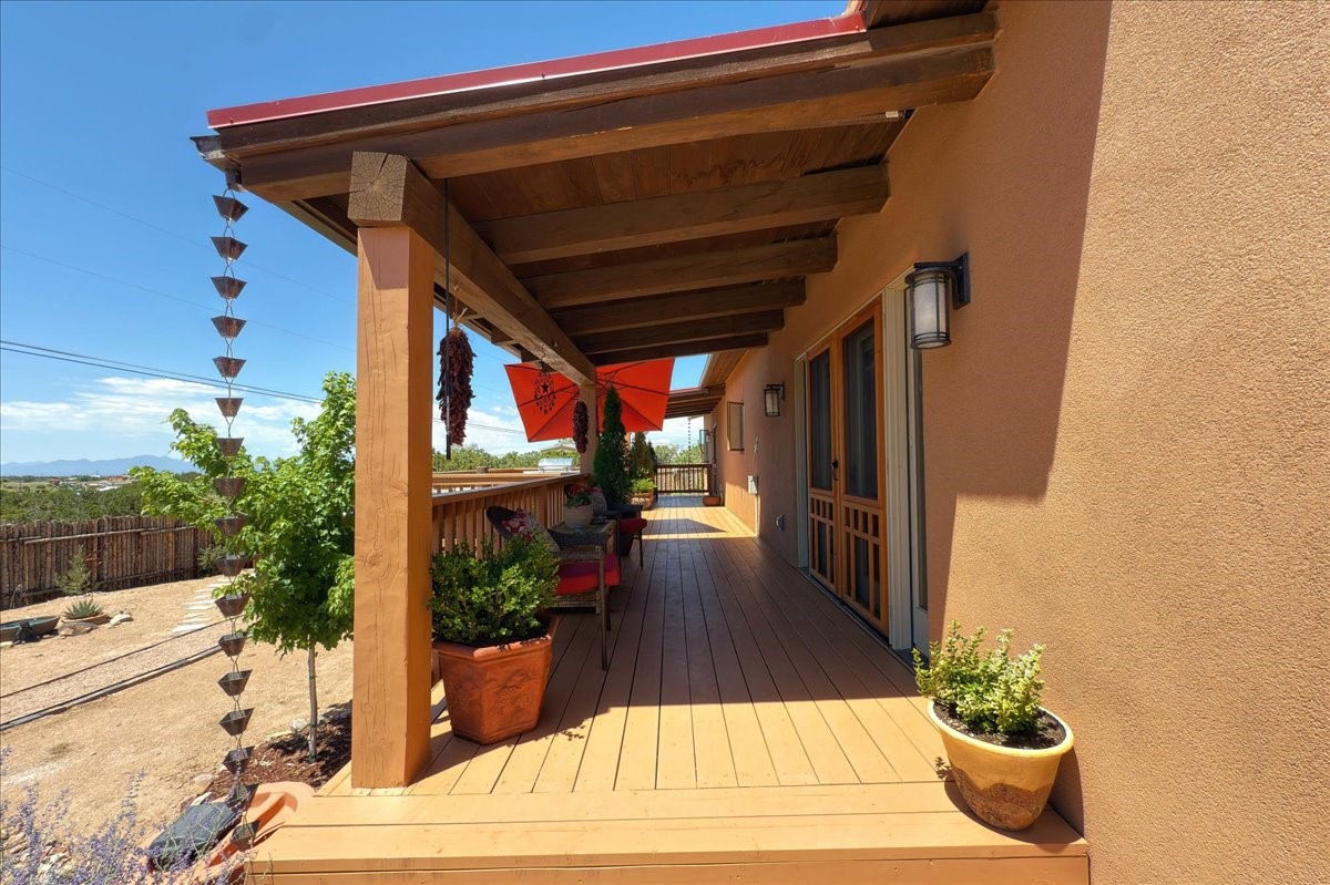 Discover this stunning updated home in the heart of Santa Fe on 1.4 acres of privacy, with Santa Fe touches and no HOA. This exquisite home boasts of natural light and plaster walls, 14' Ft. Ceilings, custom paint throughout, natural stone flooring in living room and kitchen, beautiful kitchen has granite counter tops, 6-burner Jenn Air range, brand newSmart-Double oven, Dual pane windows, updated flooring in every bedroom, all bedrooms have private suites, updated fixtures, two of three tubs are jetted, it's time to relax when you walk into your large primary suite, two separate walk-in closets, Kiva fireplace, each side of the bathroom has custom vessel sinks, separate shower, double doors that will lead you onto the brand new deck, radiant floor heating throughout including heating the garage for those cold nights, 6-zone heating zone, indoor laundry room, tankless water heater, New RO system, New water softener, New stucco 2024 with transferable warranty, propanol roof, stairs that lead you onto the TPO roof above the garage walk on up the stairs enjoy a 360 degree view of Sangre Cristo Mountains, walking and biking trails, new coyote fence and landscaping, new gas fire pit for those cozy nights, new concrete front patio, new screen doors, private well, new well pump, this home offers both luxury and convenience, 10 minutes from the plaza and major shopping. See attached list of upgrades. This home is turnkey and complete. Schedule your private tour today!