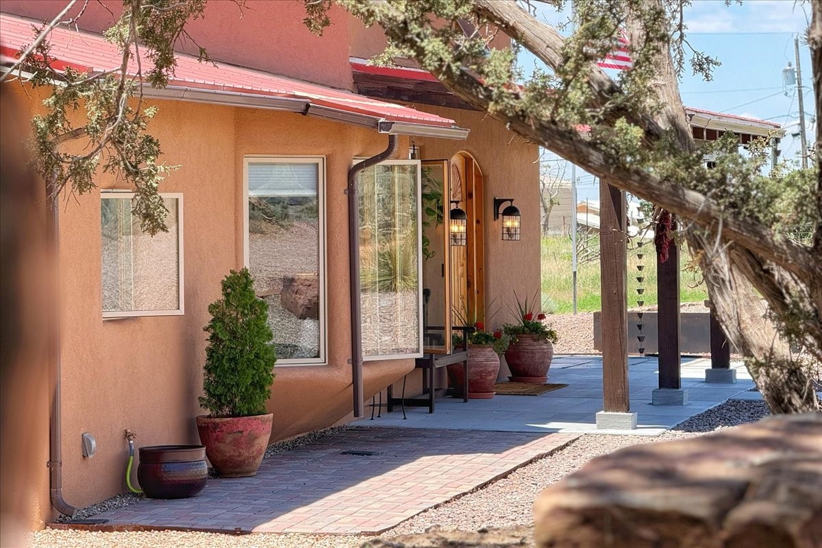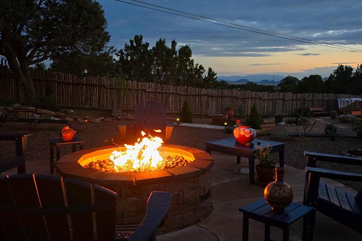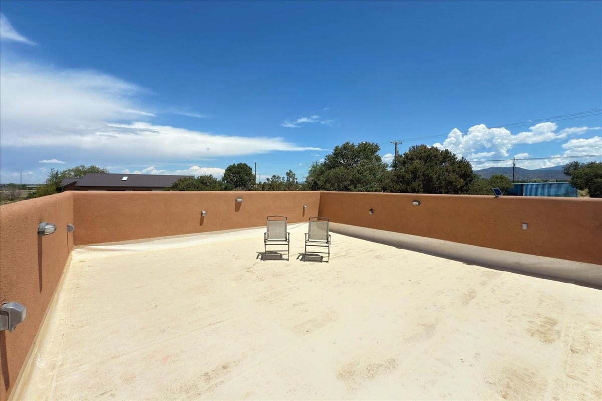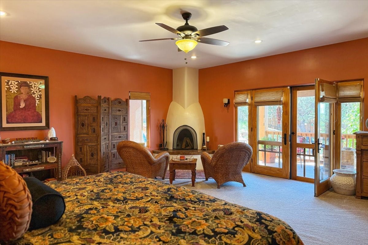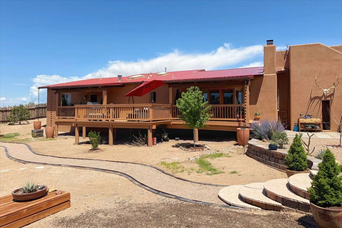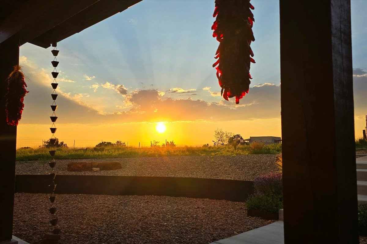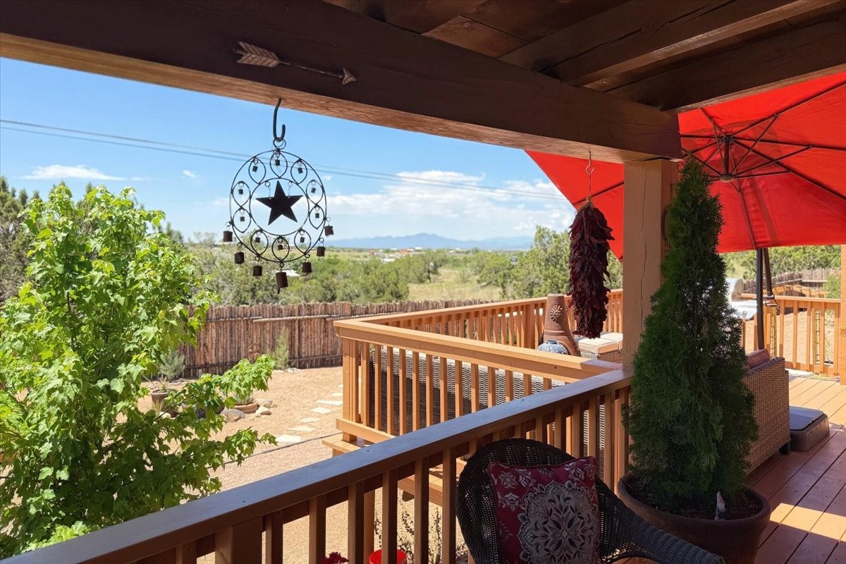 Discover this stunning updated home in the heart of Santa Fe on 1.4 acres of privacy, with Santa Fe touches and no HOA. This exquisite home boasts of natural light and plaster walls, 14' Ft. Ceilings, custom paint throughout, natural stone flooring in living room and kitchen, beautiful kitchen has granite counter tops, 6-burner Jenn Air range, brand newSmart-Double oven, Dual pane windows, updated flooring in every bedroom, all bedrooms have private suites, updated fixtures, two of three tubs are jetted, it's time to relax when you walk into your large primary suite, two separate walk-in closets, Kiva fireplace, each side of the bathroom has custom vessel sinks, separate shower, double doors that will lead you onto the brand new deck, radiant floor heating throughout including heating the garage for those cold nights, 6-zone heating zone, indoor laundry room, tankless water heater, New RO system, New water softener, New stucco 2024 with transferable warranty, propanol roof, stairs that lead you onto the TPO roof above the garage walk on up the stairs enjoy a 360 degree view of Sangre Cristo Mountains, walking and biking trails, new coyote fence and landscaping, new gas fire pit for those cozy nights, new concrete front patio, new screen doors, private well, new well pump, this home offers both luxury and convenience, 10 minutes from the plaza and major shopping. See attached list of upgrades. This home is turnkey and complete. Schedule your private tour today!