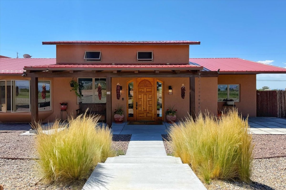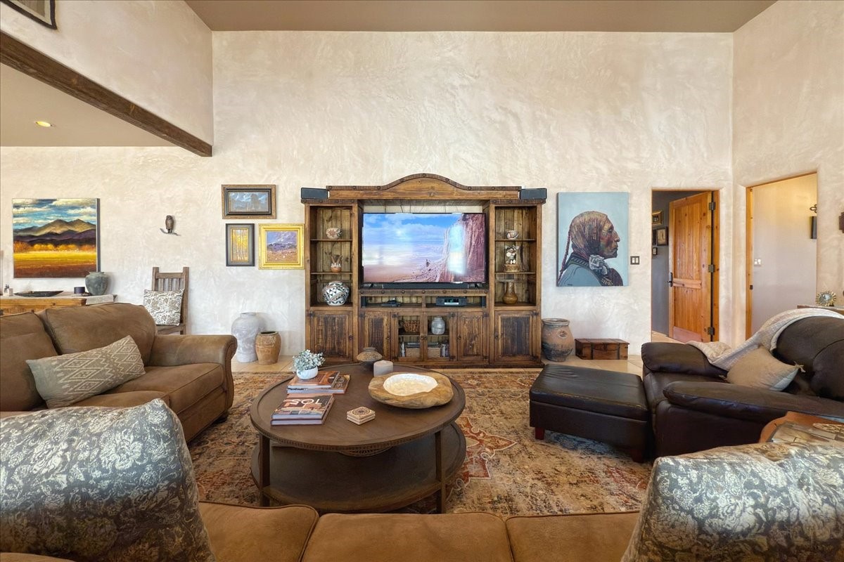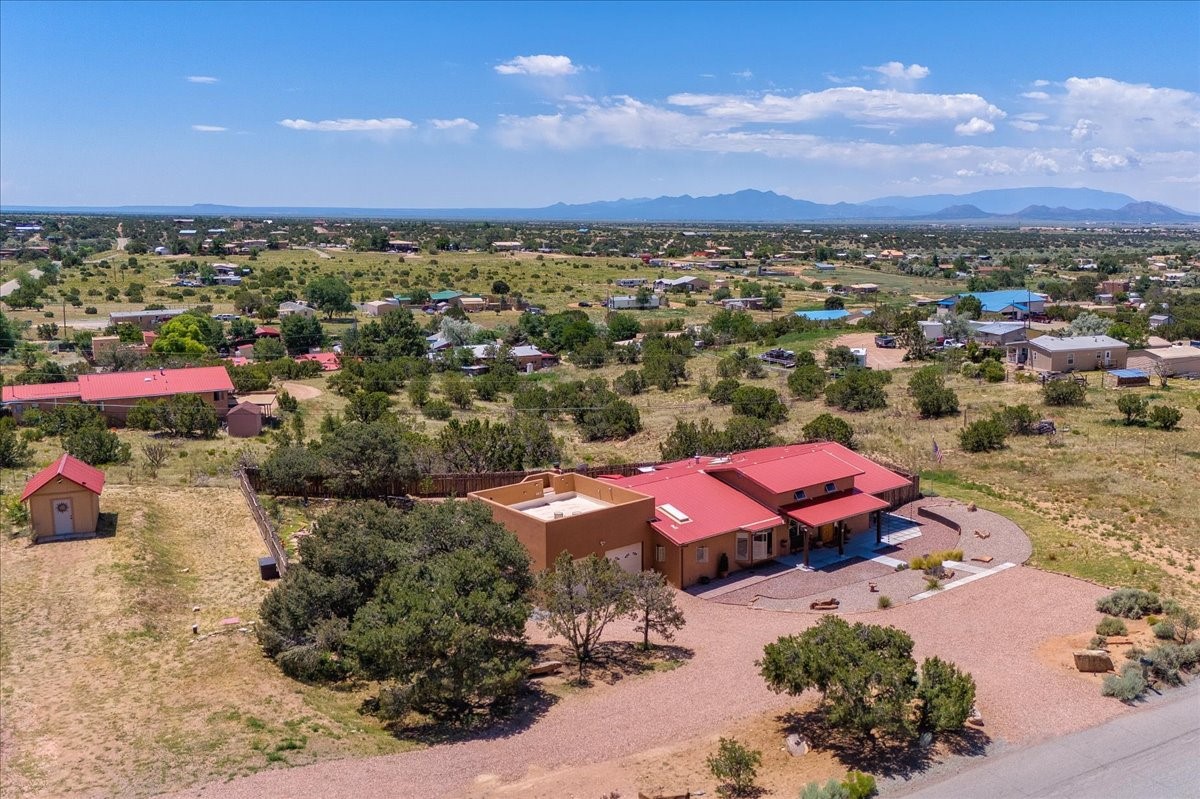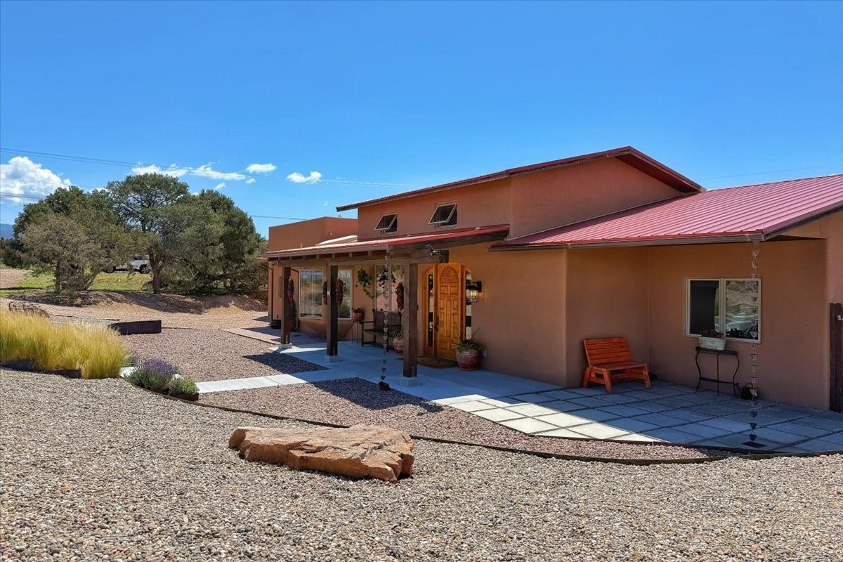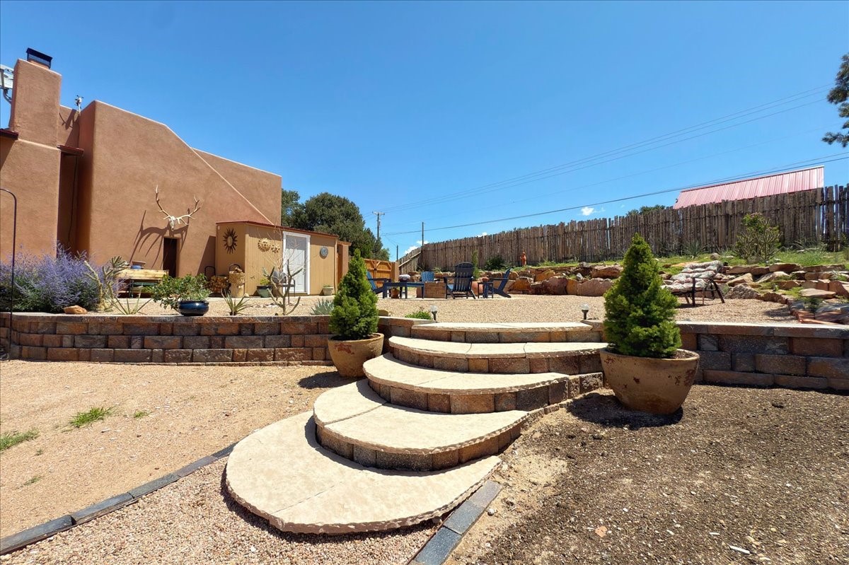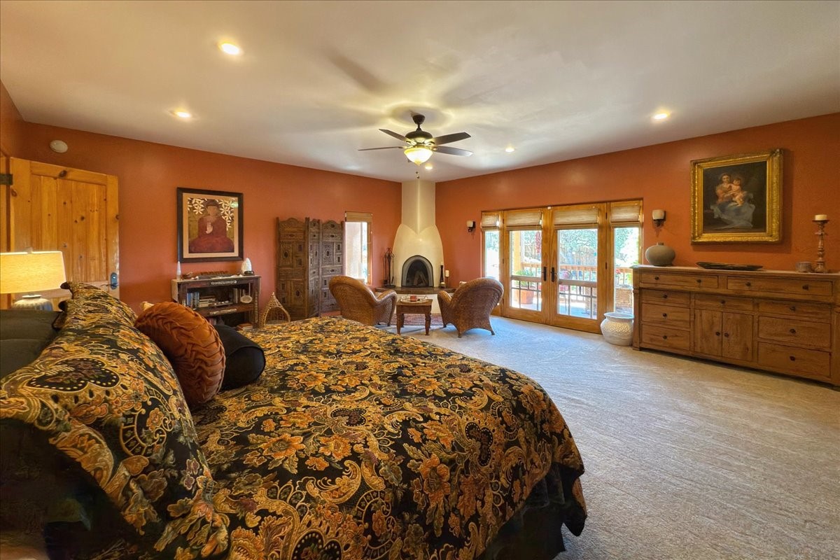 Discover this stunning updated home in the heart of Santa Fe on 1.4 acres of privacy, with Santa Fe touches and no HOA. This exquisite home boasts of natural light and plaster walls, 14' Ft. Ceilings, custom paint throughout, natural stone flooring in living room and kitchen, beautiful kitchen has granite counter tops, 6-burner Jenn Air range, brand newSmart-Double oven, Dual pane windows, updated flooring in every bedroom, all bedrooms have private suites, updated fixtures, two of three tubs are jetted, it's time to relax when you walk into your large primary suite, two separate walk-in closets, Kiva fireplace, each side of the bathroom has custom vessel sinks, separate shower, double doors that will lead you onto the brand new deck, radiant floor heating throughout including heating the garage for those cold nights, 6-zone heating zone, indoor laundry room, tankless water heater, New RO system, New water softener, New stucco 2024 with transferable warranty, propanol roof, stairs that lead you onto the TPO roof above the garage walk on up the stairs enjoy a 360 degree view of Sangre Cristo Mountains, walking and biking trails, new coyote fence and landscaping, new gas fire pit for those cozy nights, new concrete front patio, new screen doors, private well, new well pump, this home offers both luxury and convenience, 10 minutes from the plaza and major shopping. See attached list of upgrades. This home is turnkey and complete. Schedule your private tour today!