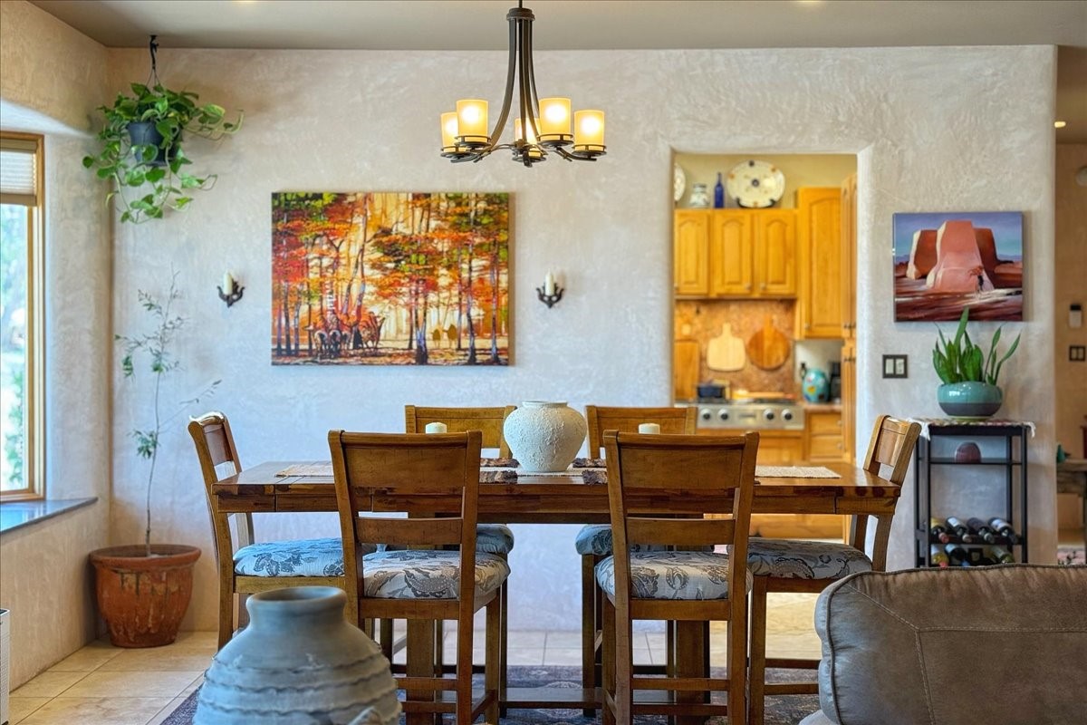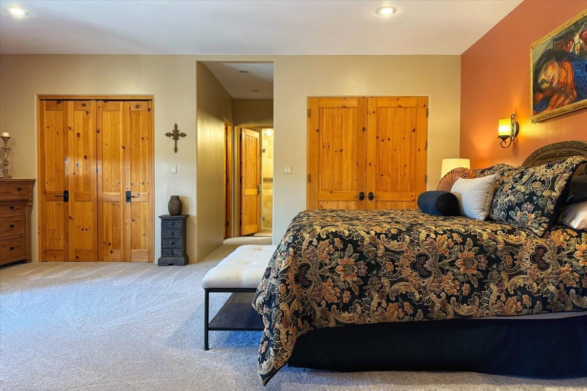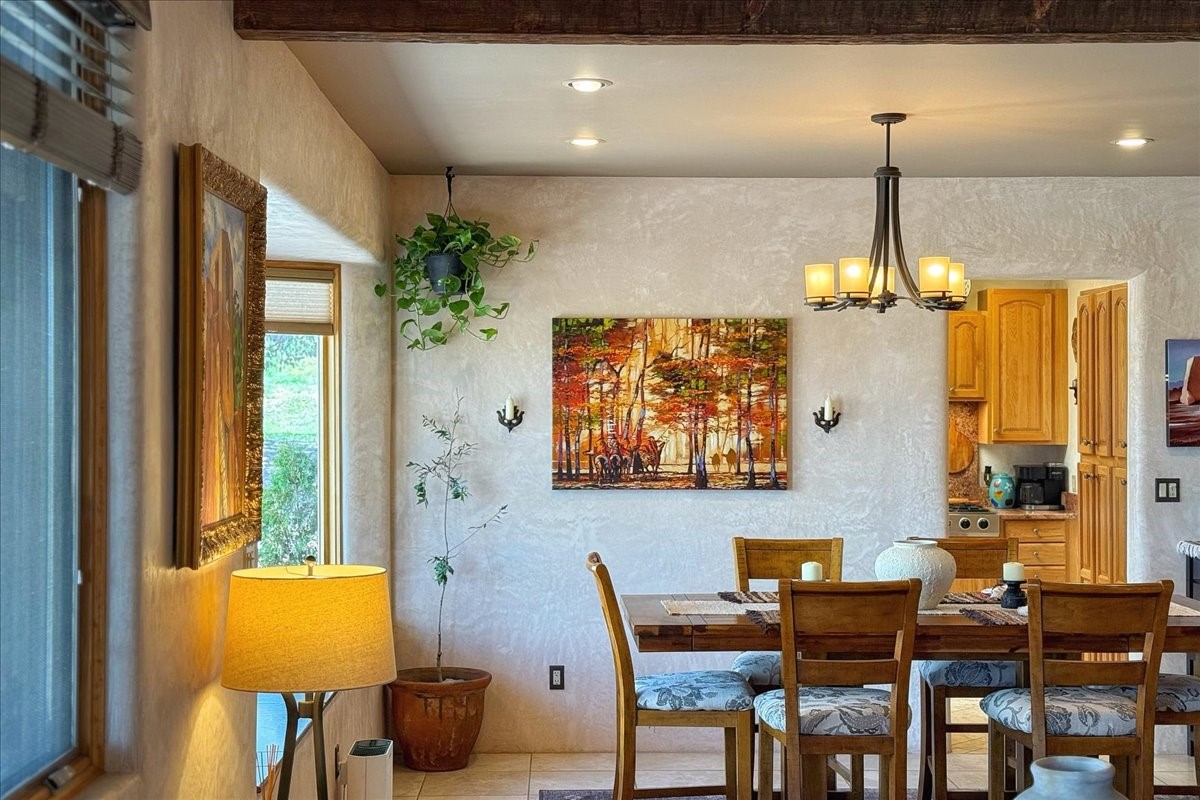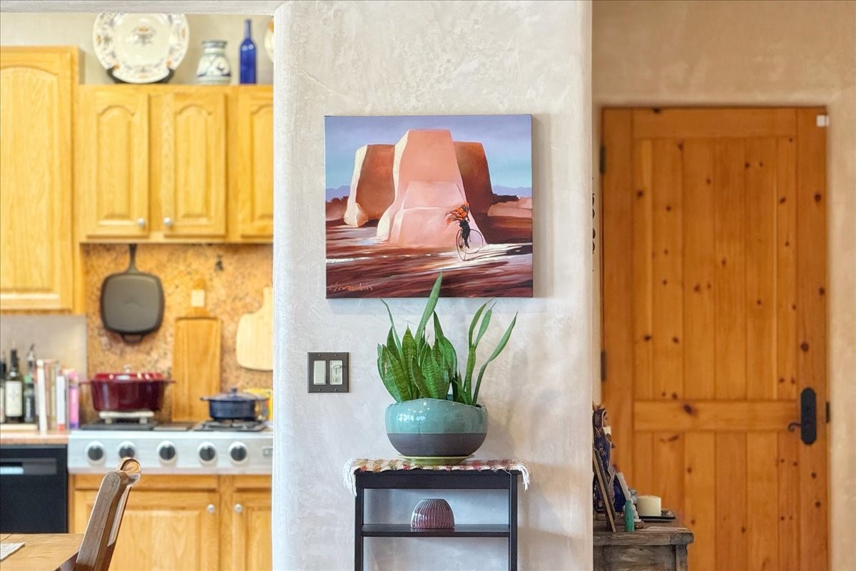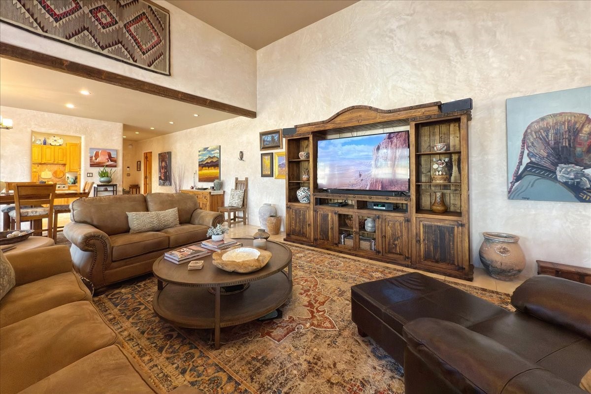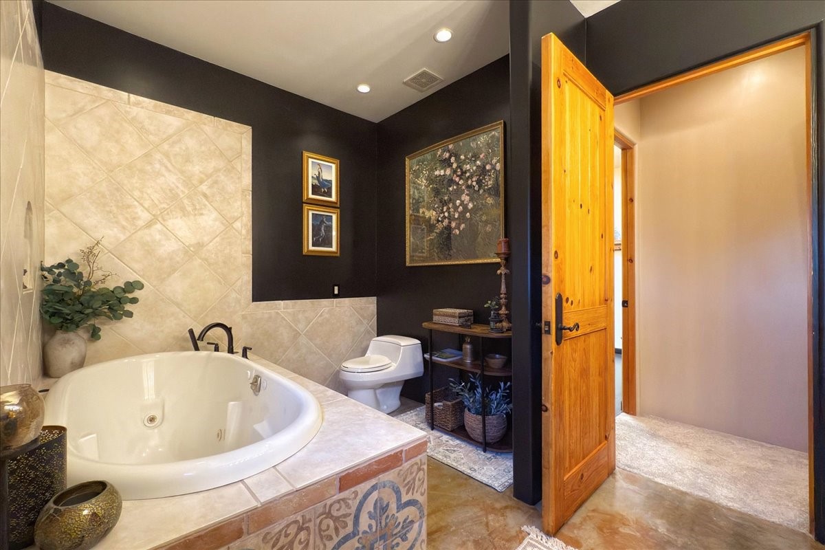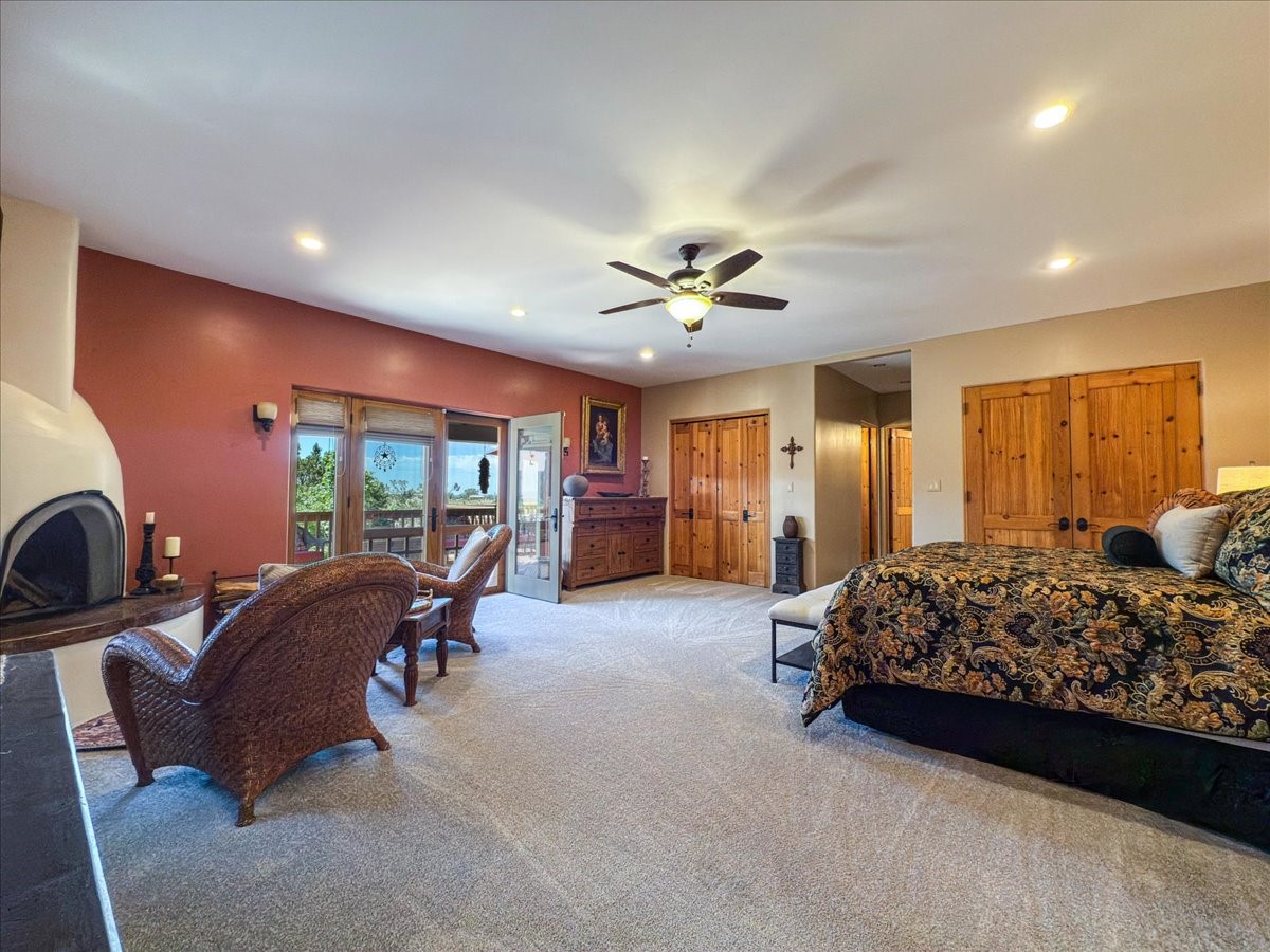 Discover this stunning updated home in the heart of Santa Fe on 1.4 acres of privacy, with Santa Fe touches and no HOA. This exquisite home boasts of natural light and plaster walls, 14' Ft. Ceilings, custom paint throughout, natural stone flooring in living room and kitchen, beautiful kitchen has granite counter tops, 6-burner Jenn Air range, brand newSmart-Double oven, Dual pane windows, updated flooring in every bedroom, all bedrooms have private suites, updated fixtures, two of three tubs are jetted, it's time to relax when you walk into your large primary suite, two separate walk-in closets, Kiva fireplace, each side of the bathroom has custom vessel sinks, separate shower, double doors that will lead you onto the brand new deck, radiant floor heating throughout including heating the garage for those cold nights, 6-zone heating zone, indoor laundry room, tankless water heater, New RO system, New water softener, New stucco 2024 with transferable warranty, propanol roof, stairs that lead you onto the TPO roof above the garage walk on up the stairs enjoy a 360 degree view of Sangre Cristo Mountains, walking and biking trails, new coyote fence and landscaping, new gas fire pit for those cozy nights, new concrete front patio, new screen doors, private well, new well pump, this home offers both luxury and convenience, 10 minutes from the plaza and major shopping. See attached list of upgrades. This home is turnkey and complete. Schedule your private tour today!