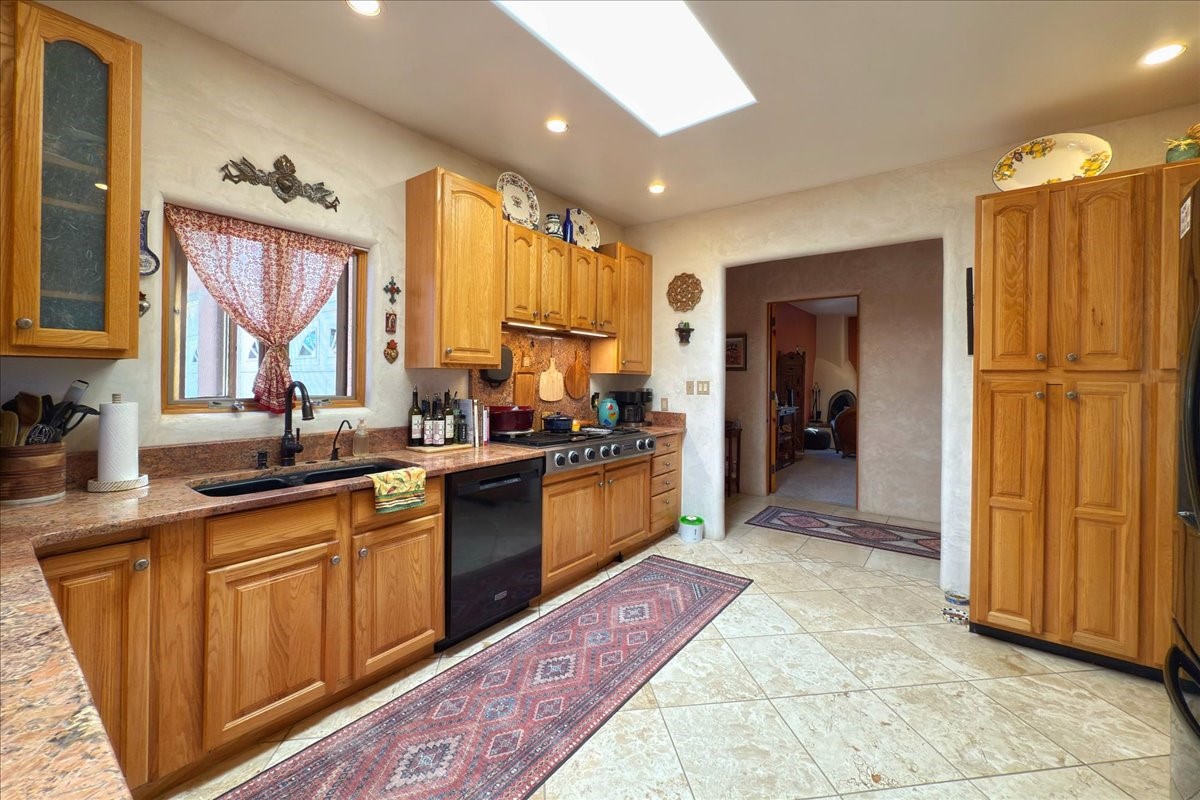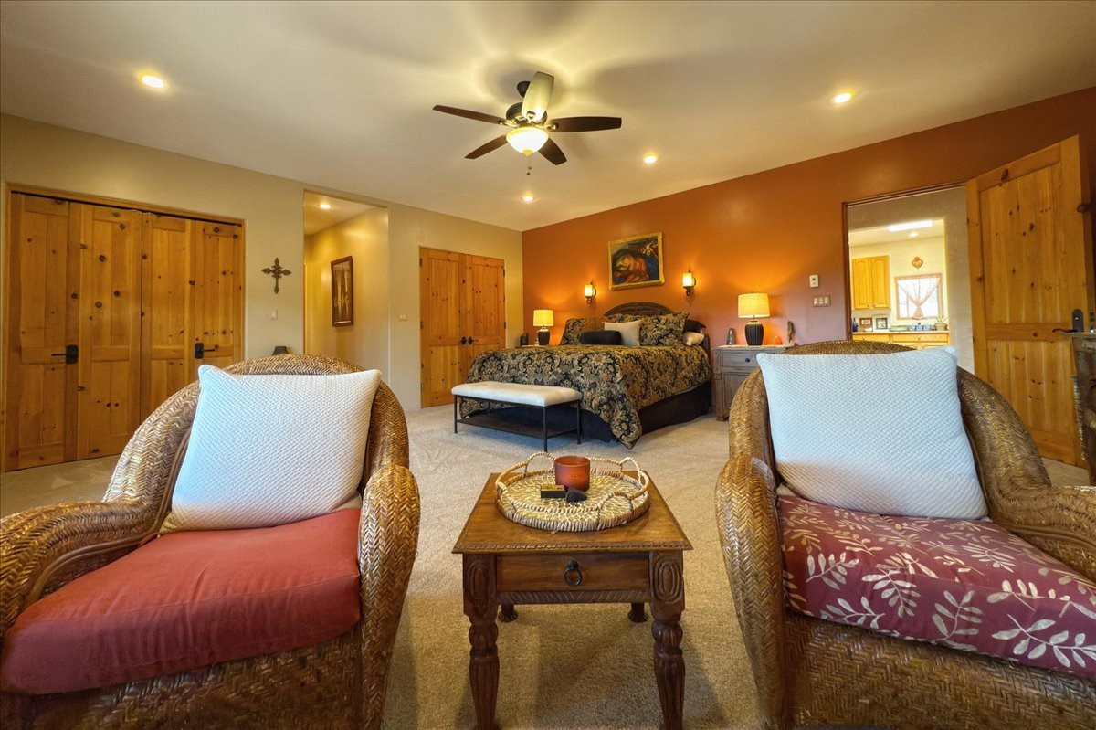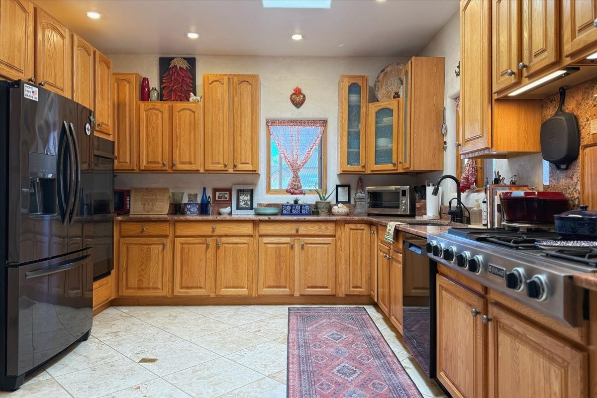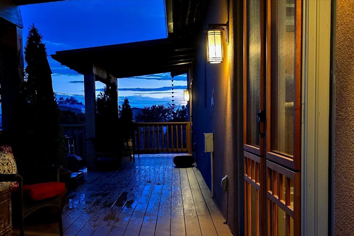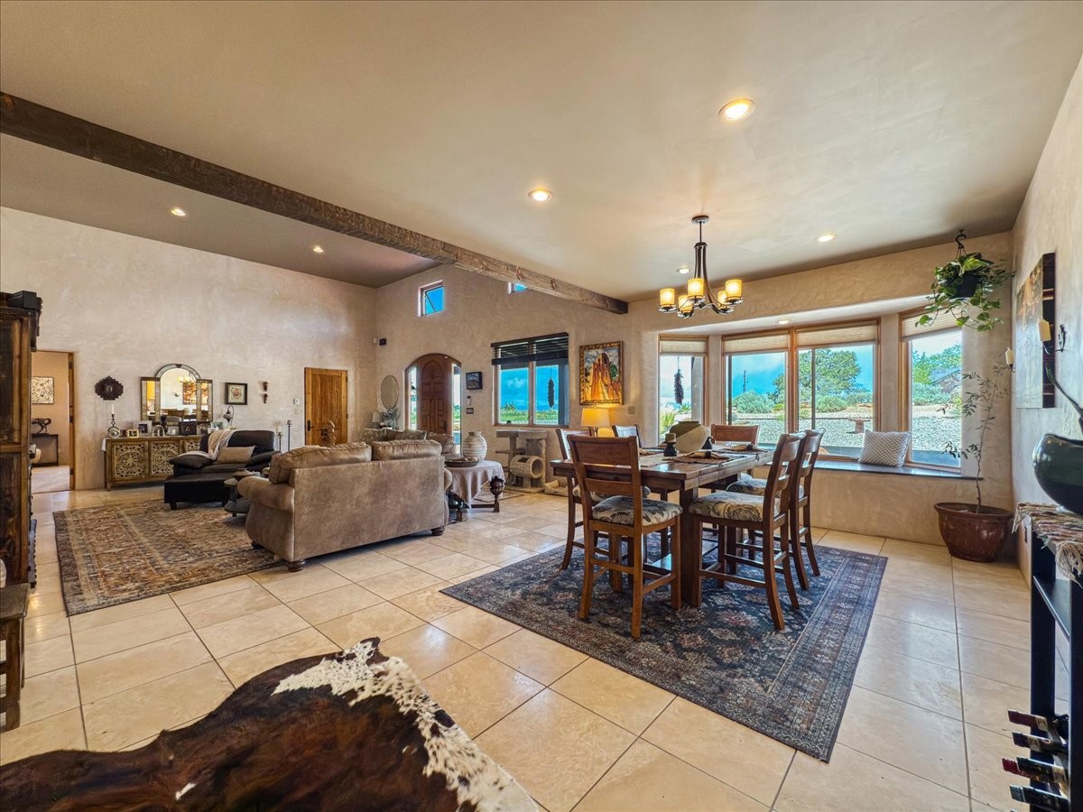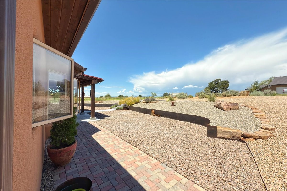 Discover this stunning updated home in the heart of Santa Fe on 1.4 acres of privacy, with Santa Fe touches and no HOA. This exquisite home boasts of natural light and plaster walls, 14' Ft. Ceilings, custom paint throughout, natural stone flooring in living room and kitchen, beautiful kitchen has granite counter tops, 6-burner Jenn Air range, brand newSmart-Double oven, Dual pane windows, updated flooring in every bedroom, all bedrooms have private suites, updated fixtures, two of three tubs are jetted, it's time to relax when you walk into your large primary suite, two separate walk-in closets, Kiva fireplace, each side of the bathroom has custom vessel sinks, separate shower, double doors that will lead you onto the brand new deck, radiant floor heating throughout including heating the garage for those cold nights, 6-zone heating zone, indoor laundry room, tankless water heater, New RO system, New water softener, New stucco 2024 with transferable warranty, propanol roof, stairs that lead you onto the TPO roof above the garage walk on up the stairs enjoy a 360 degree view of Sangre Cristo Mountains, walking and biking trails, new coyote fence and landscaping, new gas fire pit for those cozy nights, new concrete front patio, new screen doors, private well, new well pump, this home offers both luxury and convenience, 10 minutes from the plaza and major shopping. See attached list of upgrades. This home is turnkey and complete. Schedule your private tour today!