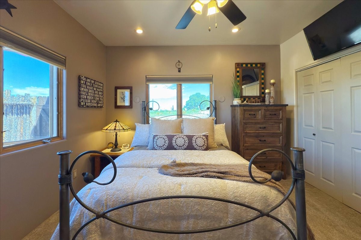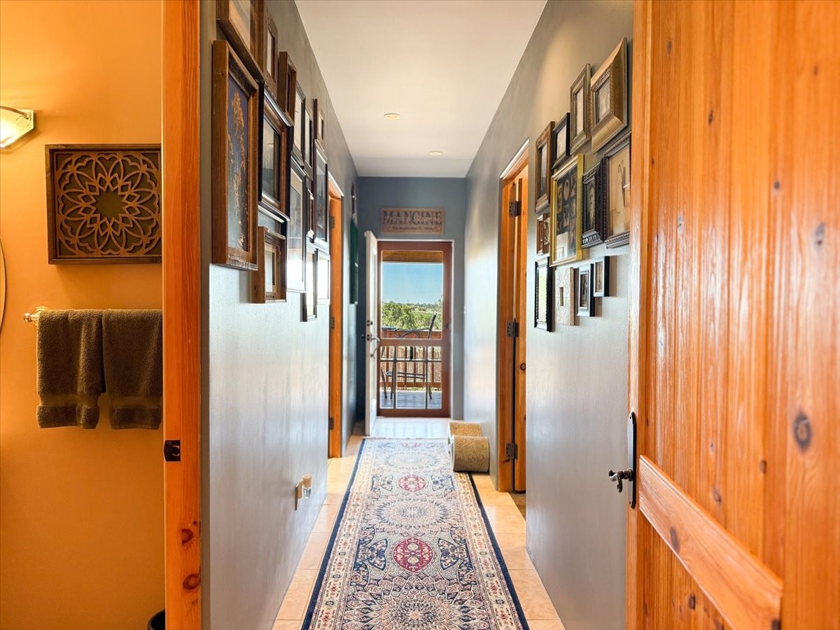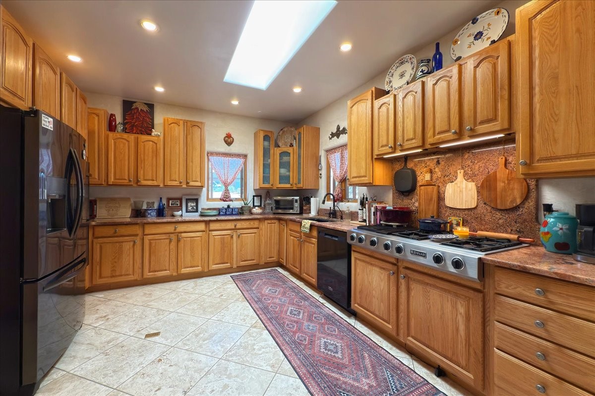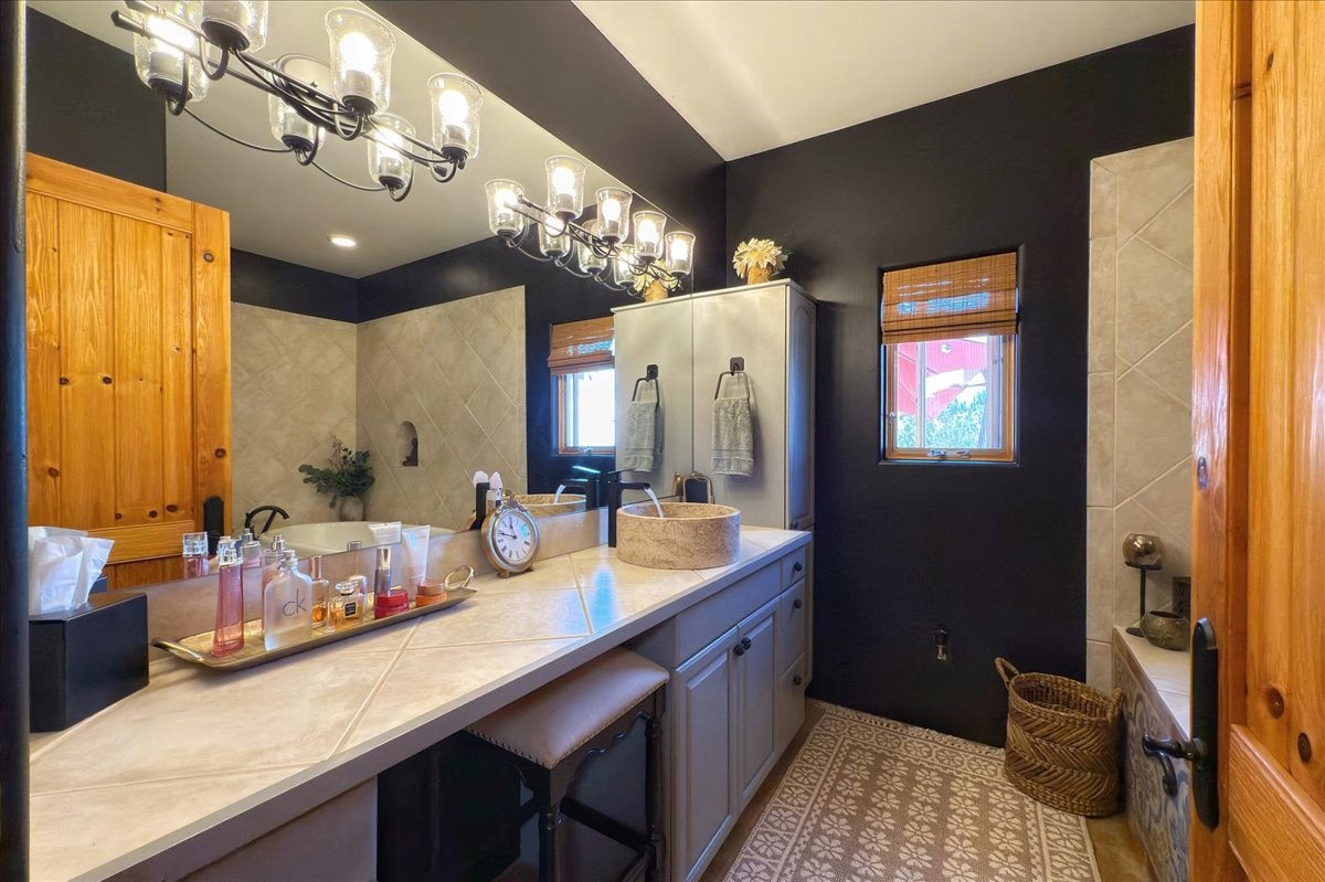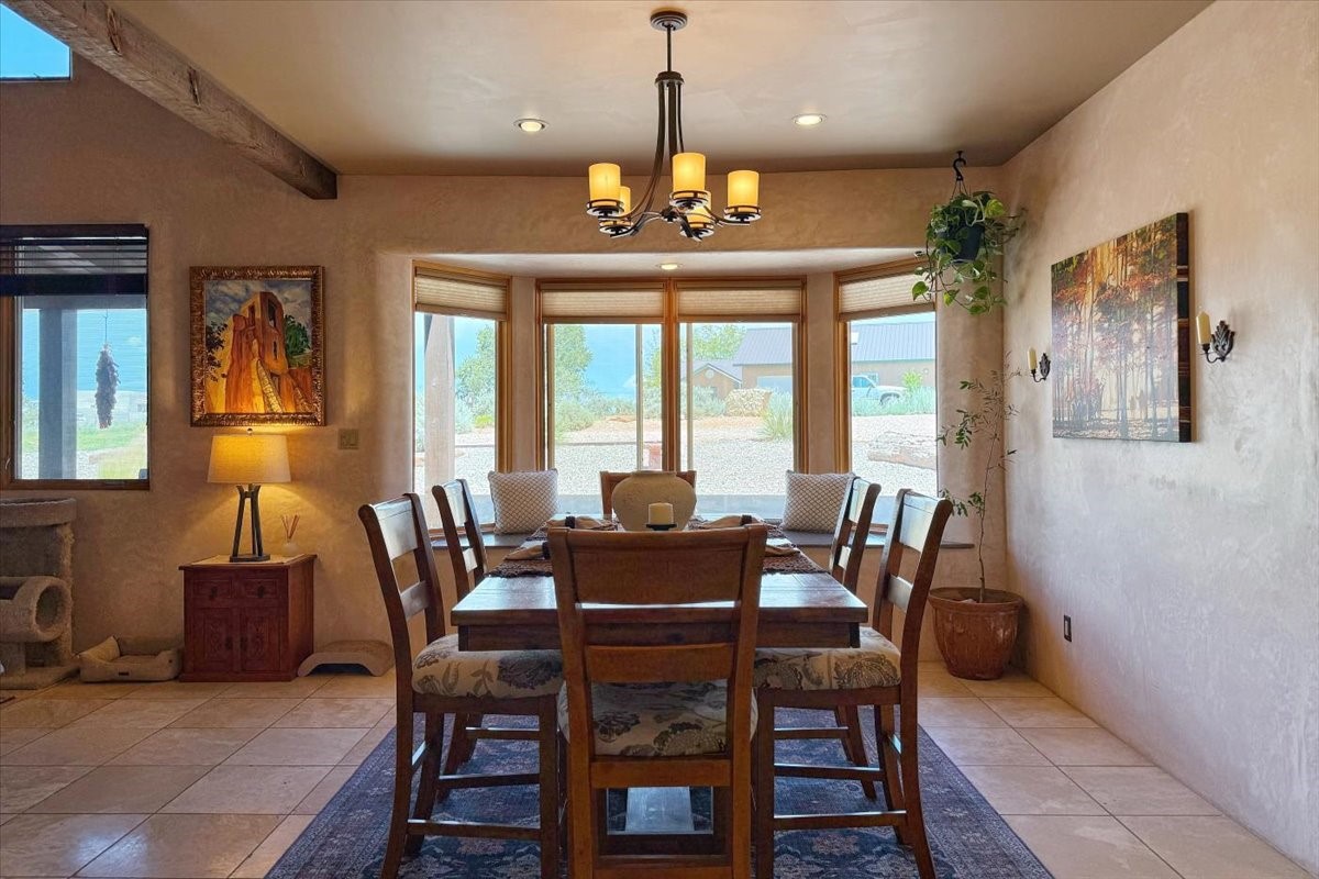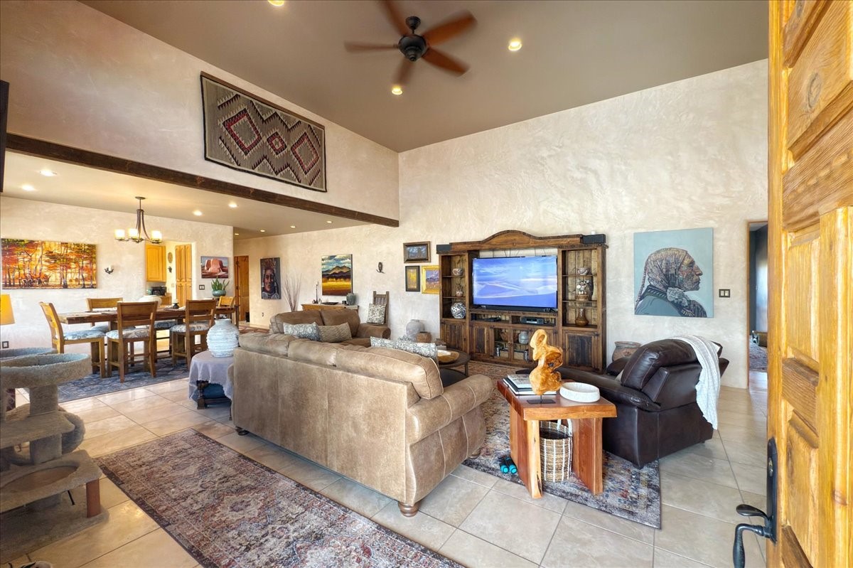 Discover this stunning updated home in the heart of Santa Fe on 1.4 acres of privacy, with Santa Fe touches and no HOA. This exquisite home boasts of natural light and plaster walls, 14' Ft. Ceilings, custom paint throughout, natural stone flooring in living room and kitchen, beautiful kitchen has granite counter tops, 6-burner Jenn Air range, brand newSmart-Double oven, Dual pane windows, updated flooring in every bedroom, all bedrooms have private suites, updated fixtures, two of three tubs are jetted, it's time to relax when you walk into your large primary suite, two separate walk-in closets, Kiva fireplace, each side of the bathroom has custom vessel sinks, separate shower, double doors that will lead you onto the brand new deck, radiant floor heating throughout including heating the garage for those cold nights, 6-zone heating zone, indoor laundry room, tankless water heater, New RO system, New water softener, New stucco 2024 with transferable warranty, propanol roof, stairs that lead you onto the TPO roof above the garage walk on up the stairs enjoy a 360 degree view of Sangre Cristo Mountains, walking and biking trails, new coyote fence and landscaping, new gas fire pit for those cozy nights, new concrete front patio, new screen doors, private well, new well pump, this home offers both luxury and convenience, 10 minutes from the plaza and major shopping. See attached list of upgrades. This home is turnkey and complete. Schedule your private tour today!
