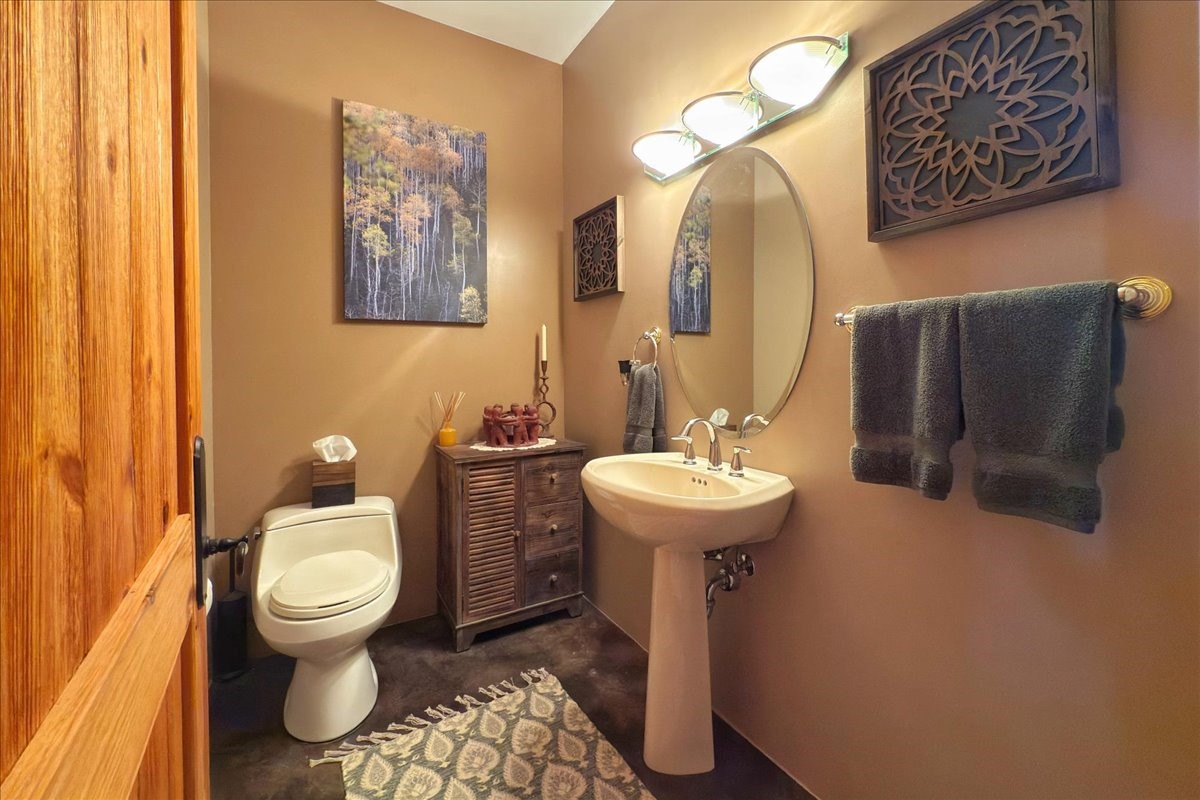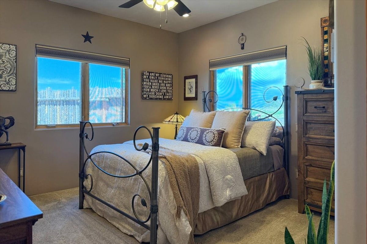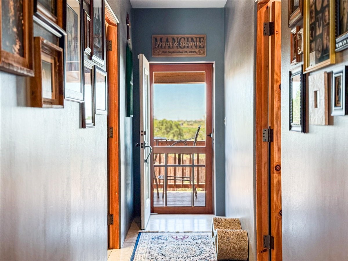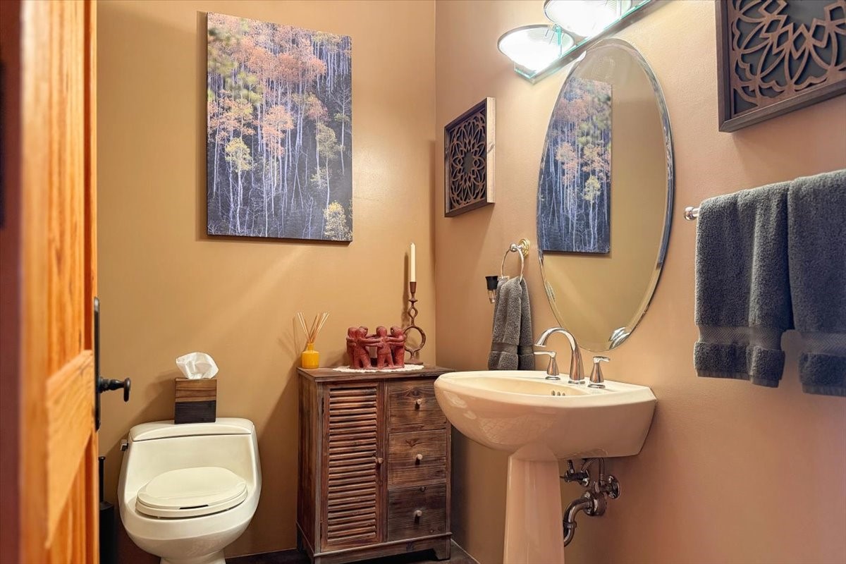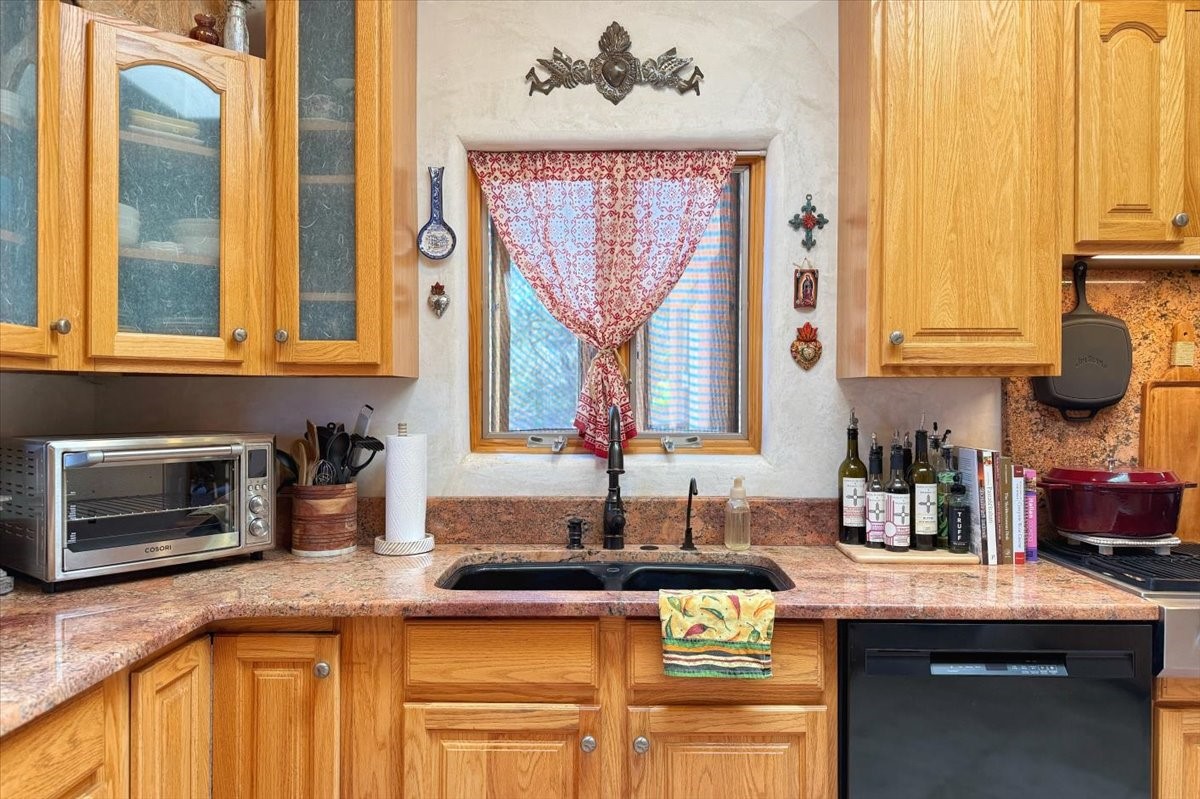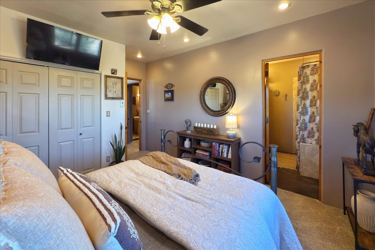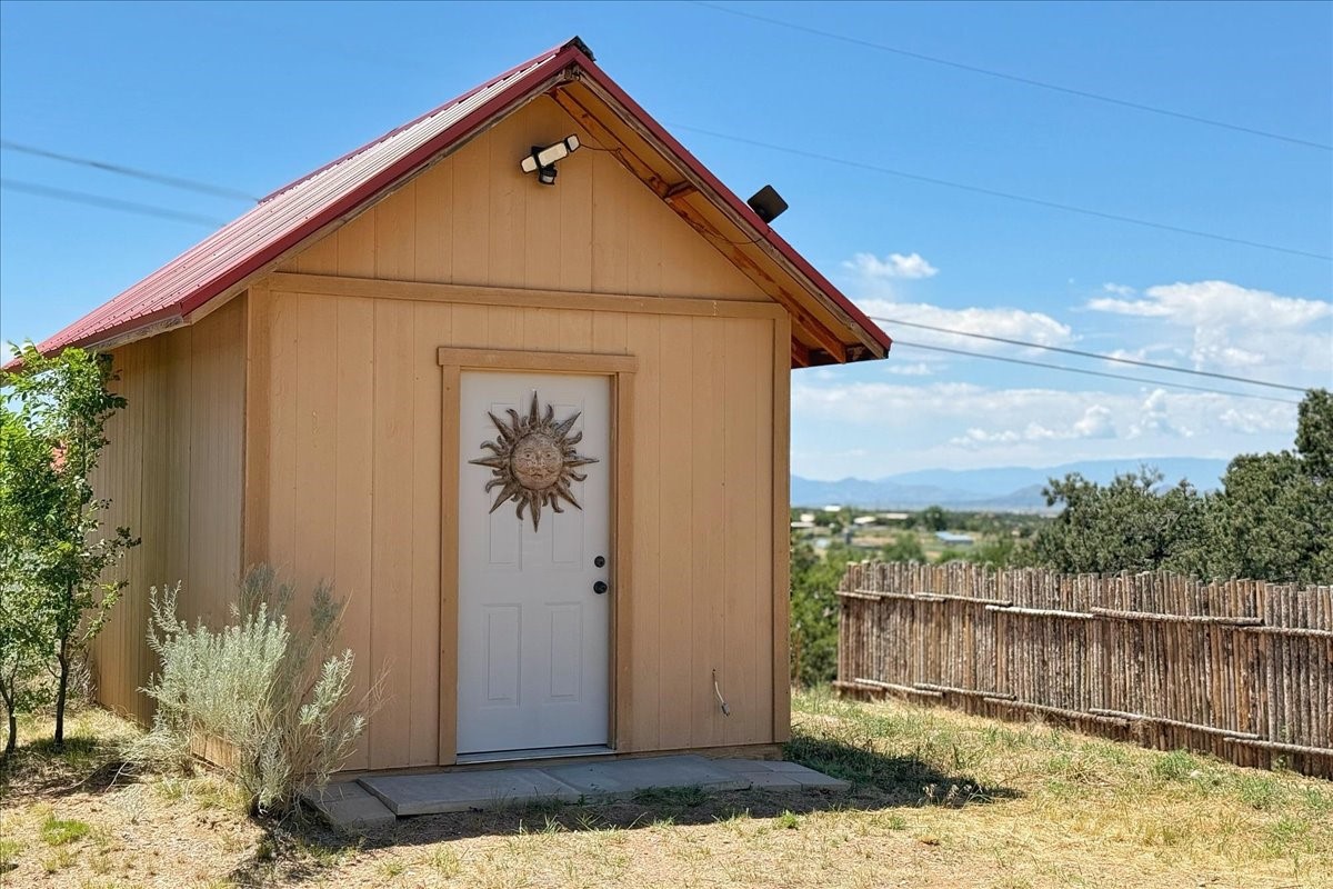 Discover this stunning updated home in the heart of Santa Fe on 1.4 acres of privacy, with Santa Fe touches and no HOA. This exquisite home boasts of natural light and plaster walls, 14' Ft. Ceilings, custom paint throughout, natural stone flooring in living room and kitchen, beautiful kitchen has granite counter tops, 6-burner Jenn Air range, brand newSmart-Double oven, Dual pane windows, updated flooring in every bedroom, all bedrooms have private suites, updated fixtures, two of three tubs are jetted, it's time to relax when you walk into your large primary suite, two separate walk-in closets, Kiva fireplace, each side of the bathroom has custom vessel sinks, separate shower, double doors that will lead you onto the brand new deck, radiant floor heating throughout including heating the garage for those cold nights, 6-zone heating zone, indoor laundry room, tankless water heater, New RO system, New water softener, New stucco 2024 with transferable warranty, propanol roof, stairs that lead you onto the TPO roof above the garage walk on up the stairs enjoy a 360 degree view of Sangre Cristo Mountains, walking and biking trails, new coyote fence and landscaping, new gas fire pit for those cozy nights, new concrete front patio, new screen doors, private well, new well pump, this home offers both luxury and convenience, 10 minutes from the plaza and major shopping. See attached list of upgrades. This home is turnkey and complete. Schedule your private tour today!
