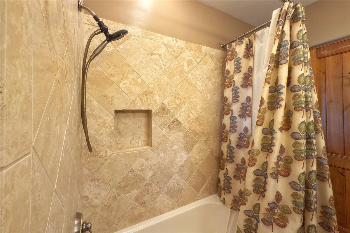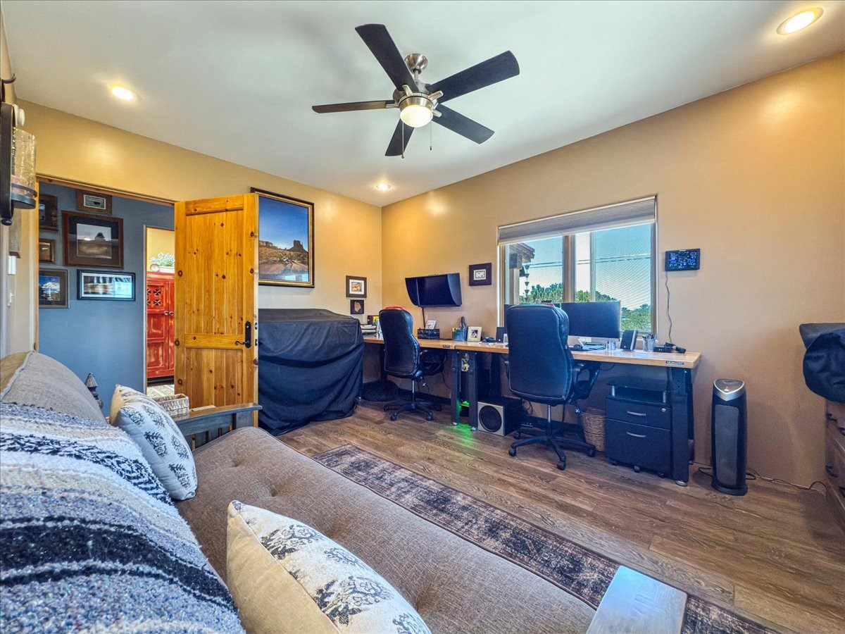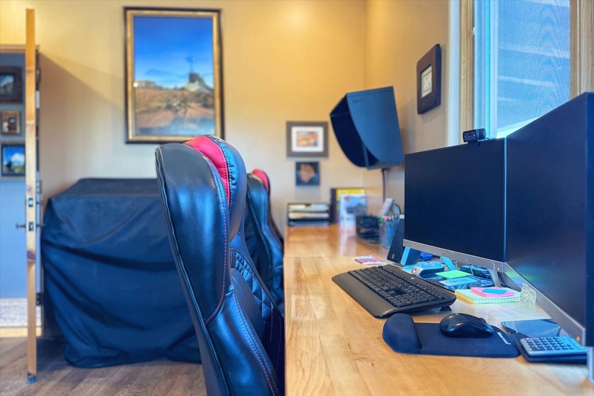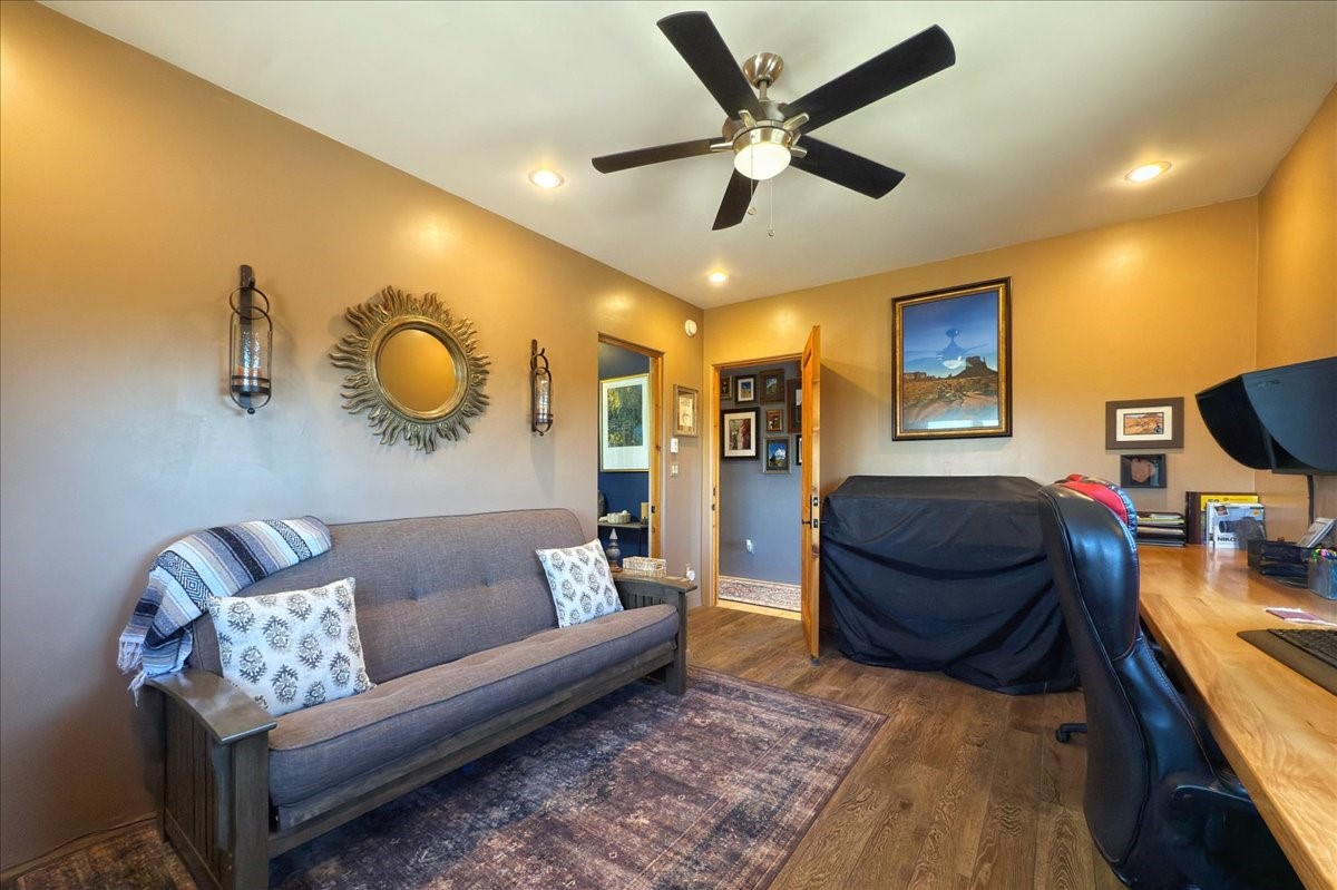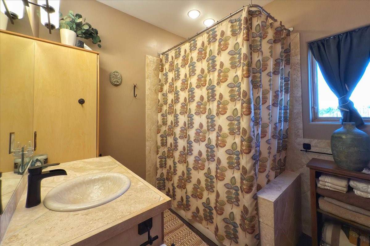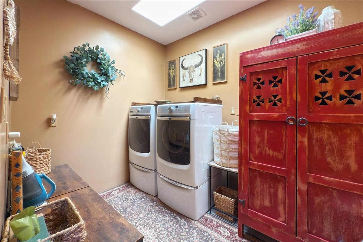 Discover this stunning updated home in the heart of Santa Fe on 1.4 acres of privacy, with Santa Fe touches and no HOA. This exquisite home boasts of natural light and plaster walls, 14' Ft. Ceilings, custom paint throughout, natural stone flooring in living room and kitchen, beautiful kitchen has granite counter tops, 6-burner Jenn Air range, brand newSmart-Double oven, Dual pane windows, updated flooring in every bedroom, all bedrooms have private suites, updated fixtures, two of three tubs are jetted, it's time to relax when you walk into your large primary suite, two separate walk-in closets, Kiva fireplace, each side of the bathroom has custom vessel sinks, separate shower, double doors that will lead you onto the brand new deck, radiant floor heating throughout including heating the garage for those cold nights, 6-zone heating zone, indoor laundry room, tankless water heater, New RO system, New water softener, New stucco 2024 with transferable warranty, propanol roof, stairs that lead you onto the TPO roof above the garage walk on up the stairs enjoy a 360 degree view of Sangre Cristo Mountains, walking and biking trails, new coyote fence and landscaping, new gas fire pit for those cozy nights, new concrete front patio, new screen doors, private well, new well pump, this home offers both luxury and convenience, 10 minutes from the plaza and major shopping. See attached list of upgrades. This home is turnkey and complete. Schedule your private tour today!