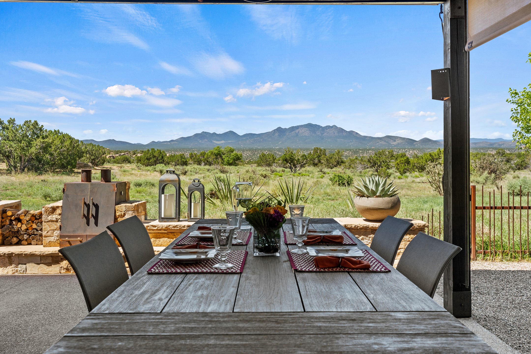 Architect-Designed Sanctuary on 44 Acres with Sweeping Ortiz Mountain ViewsSet on 44 pristine acres in the heart of Garden of the Gods rock formations, this architect-designed home is a striking fusion of form, function, and landscape. Completed in 2019 by its architect-owners, the residence reflects a deep sensitivity to place - modern in its lines, yet timeless in its connection to the land and its mesmerizing views of the Ortiz Mountains.The layout offers both simplicity and flexibility, with two bedrooms and a third space perfectly suited for a guest suite, office, or creative studio. Every detail is intentional--custom built-ins and integrated storage maintain clean lines without sacrificing utility. Expansive ceilings and precisely placed windows draw in natural light and frame breathtaking panoramas from nearly every room. The chef's kitchen is a showpiece of design and performance, anchored by a La Cornue range, Sub-Zero refrigerator and freezer, and Miele dishwasher. Raked German oak cabinetry and honed Taj Mahal marble countertops offer a warm, sculptural backdrop for both cooking and gathering. The primary suite is a peaceful retreat, complete with a spa-like bath featuring a Caldara salt-water hot tub, a custom walnut vanity with black Caesarstone counters, and a beautifully crafted walk-in shower. Seamless indoor-outdoor living defines the home. A welcoming entry courtyard, stone patios and covered areas extend the living space, perfectly oriented for sunrise coffee and sunset gatherings. A custom water feature adds a meditative element and is fed by a 12,000 gallon rain-catchment system that also supports the landscaping and garden irrigation. A 52-inch propane firepit, built-in pizza oven, and drought-tolerant yet lush landscaping complete the inviting feel of the exterior spaces. A 21 gal/min private well ensures abundant, high-quality water. A fenced and irrigated raised-bed vegetable garden/orchard and equipment/tractor workshop are adjacent to the 2 car carport (with EV car charger). The perimeter of the acreage is fenced and offers a perfect setting for equestrian facilities, including over two miles of scenic private riding/hiking trails that wind through rolling high desert terrain. An adjacent 20 acre parcel is also available for those seeking even more space and privacy. Rarely does a property of this architectural caliber and ecological sensitivity come to market. This is an extraordinary opportunity to own a soulful, design-forward retreat in one of Northern New Mexico's most scenic and serene settings. Only 10 minutes to Madrid and 20 minutes to Santa Fe.