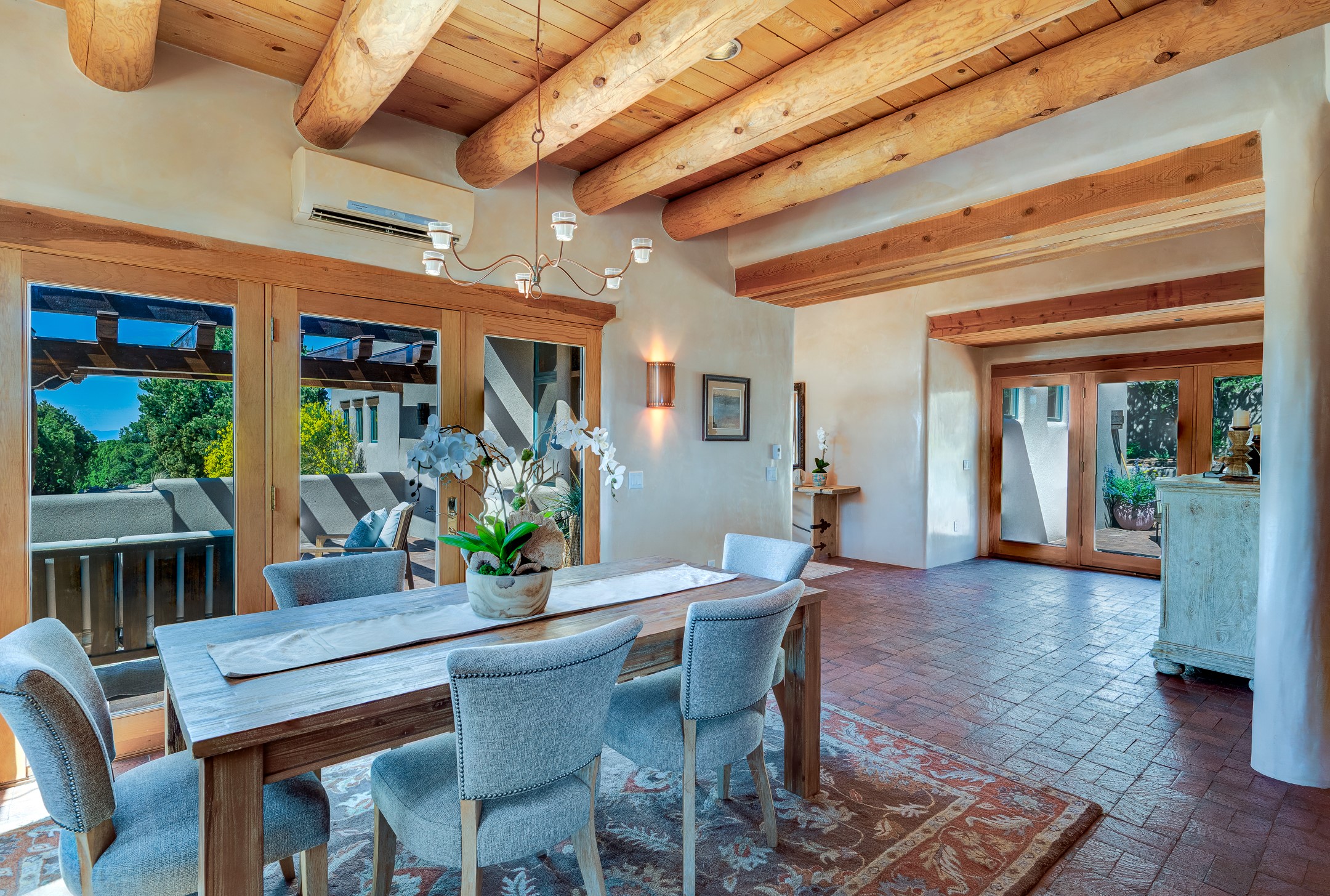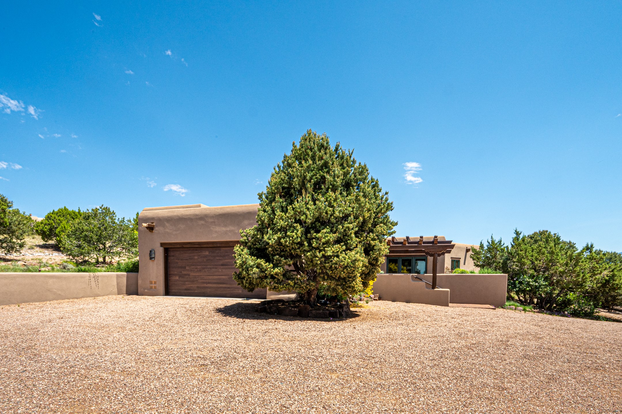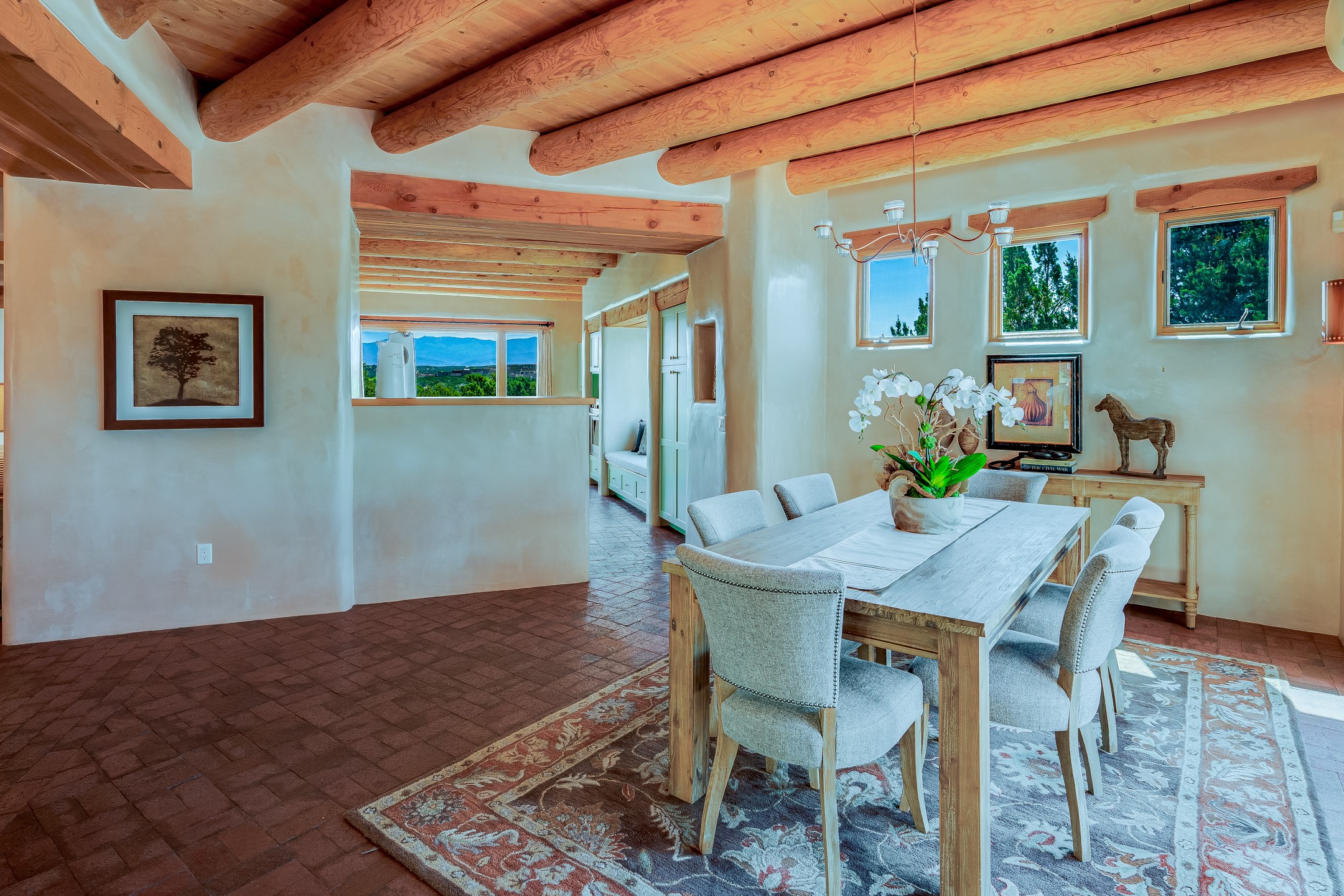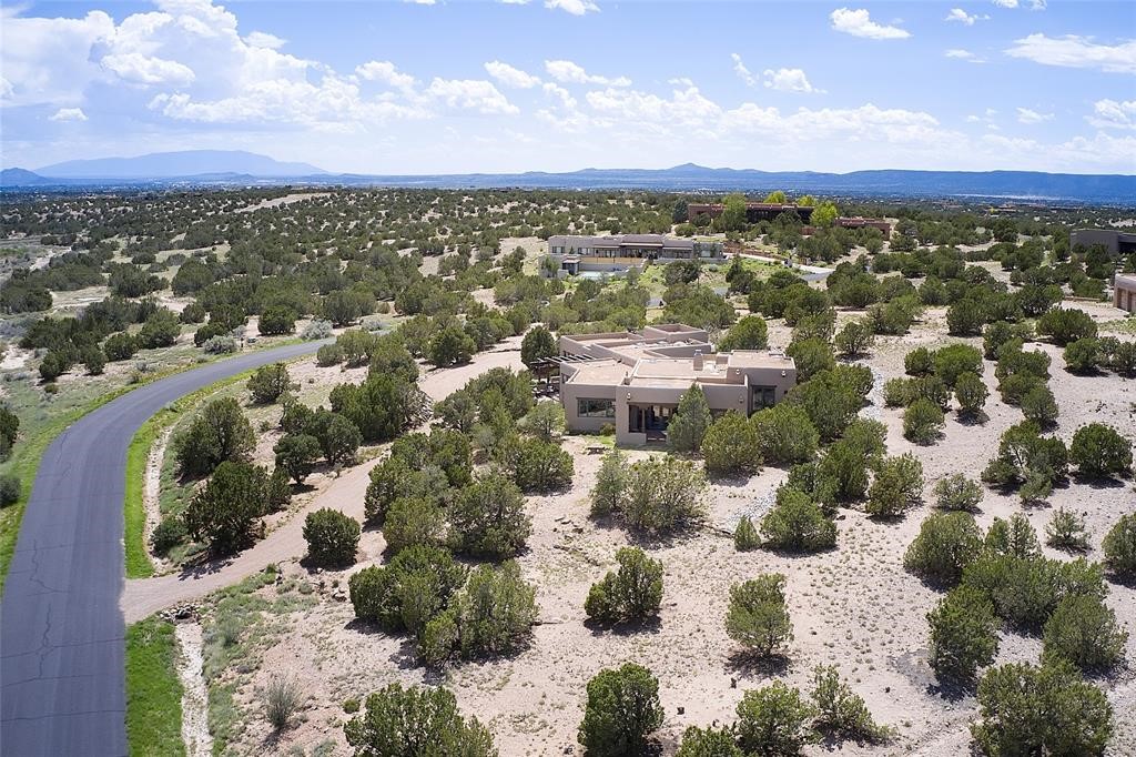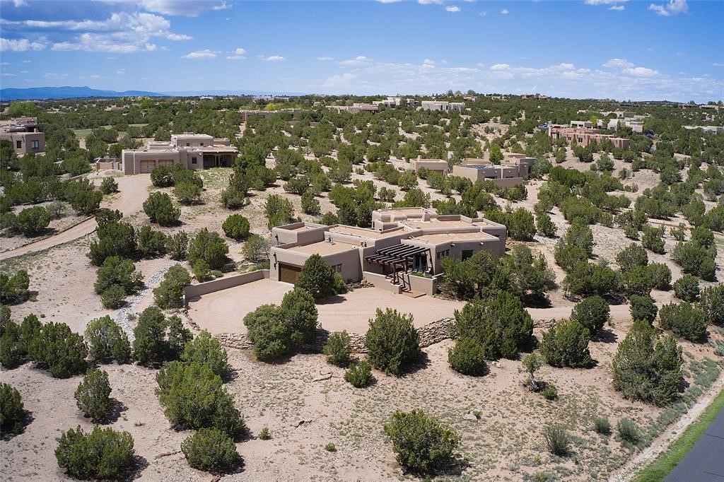 Located in Estates II at Las Campanas, this 3,267* sq. ft. home provides a split floor plan - master suite with a full bath, large walk-in closet, and private patio area separated from 2 guest rooms with 1 full bath. Living room, dining room, breakfast nook and kitchen in an open plan configuration. Office/den adjacent to living room. Four heating/cooling mini-splits, and radiant floor heating maintain a desirable level of comfort throughout. There's even a 220v outlet in the garage for your EV.With form and function seamlessly integrated, the sense of a relaxed elegance is promoted by the dwelling's creature comforts: tall ceilings, single-level open plan layout, large windows, natural materials, and strategically placed outdoor living areas. Contemporary touches, seen in the selections of materials, finishes, and fixtures, are balanced with the acknowledgement given toward "Santa Fe charm" through the use of plaster wall finishes, brick flooring material, and exposed kivas.Awesome views of Baldy and Sangre de Cristo mountains!