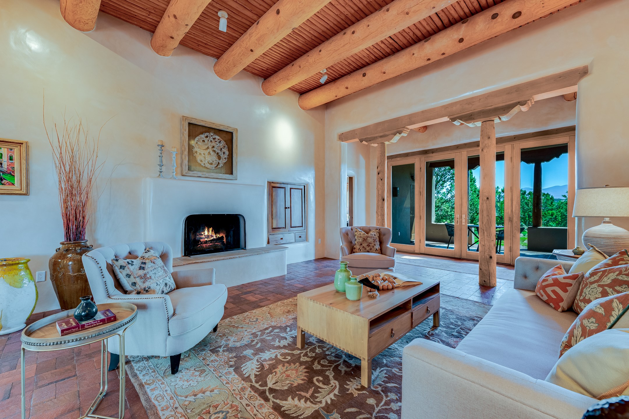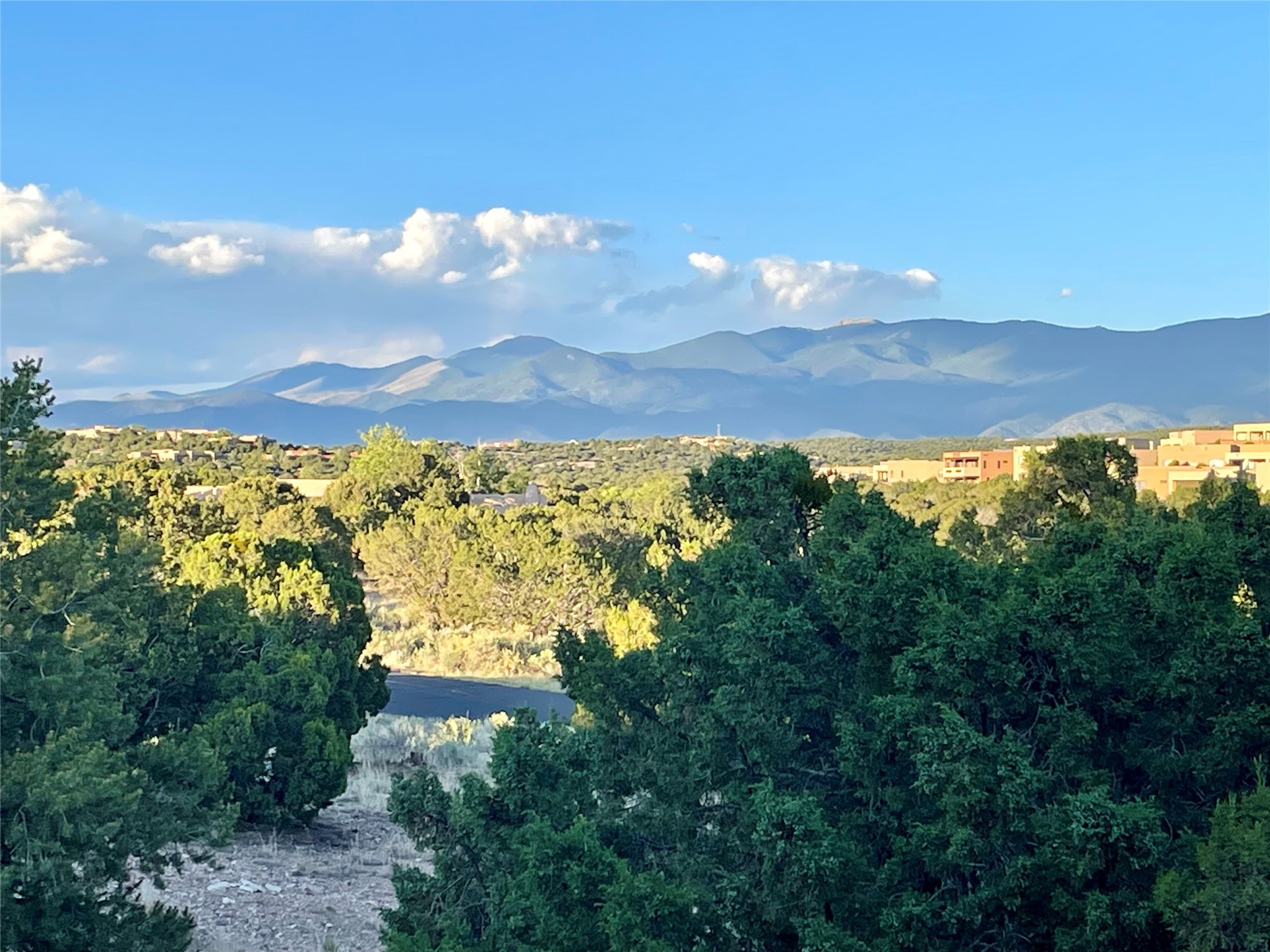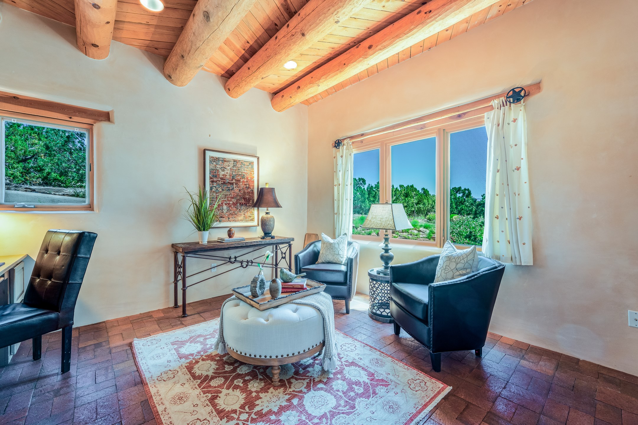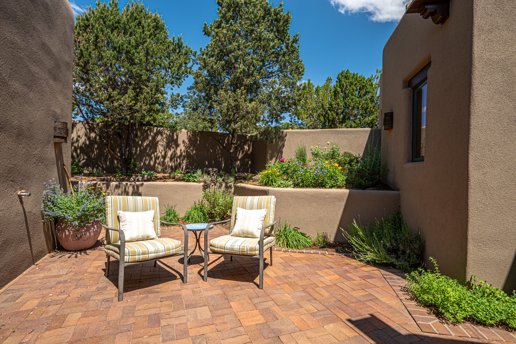 Located in Estates II at Las Campanas, this 3,267* sq. ft. home provides a split floor plan - master suite with a full bath, large walk-in closet, and private patio area separated from 2 guest rooms with 1 full bath. Living room, dining room, breakfast nook and kitchen in an open plan configuration. Office/den adjacent to living room. Four heating/cooling mini-splits, and radiant floor heating maintain a desirable level of comfort throughout. There's even a 220v outlet in the garage for your EV.With form and function seamlessly integrated, the sense of a relaxed elegance is promoted by the dwelling's creature comforts: tall ceilings, single-level open plan layout, large windows, natural materials, and strategically placed outdoor living areas. Contemporary touches, seen in the selections of materials, finishes, and fixtures, are balanced with the acknowledgement given toward "Santa Fe charm" through the use of plaster wall finishes, brick flooring material, and exposed kivas.Awesome views of Baldy and Sangre de Cristo mountains!