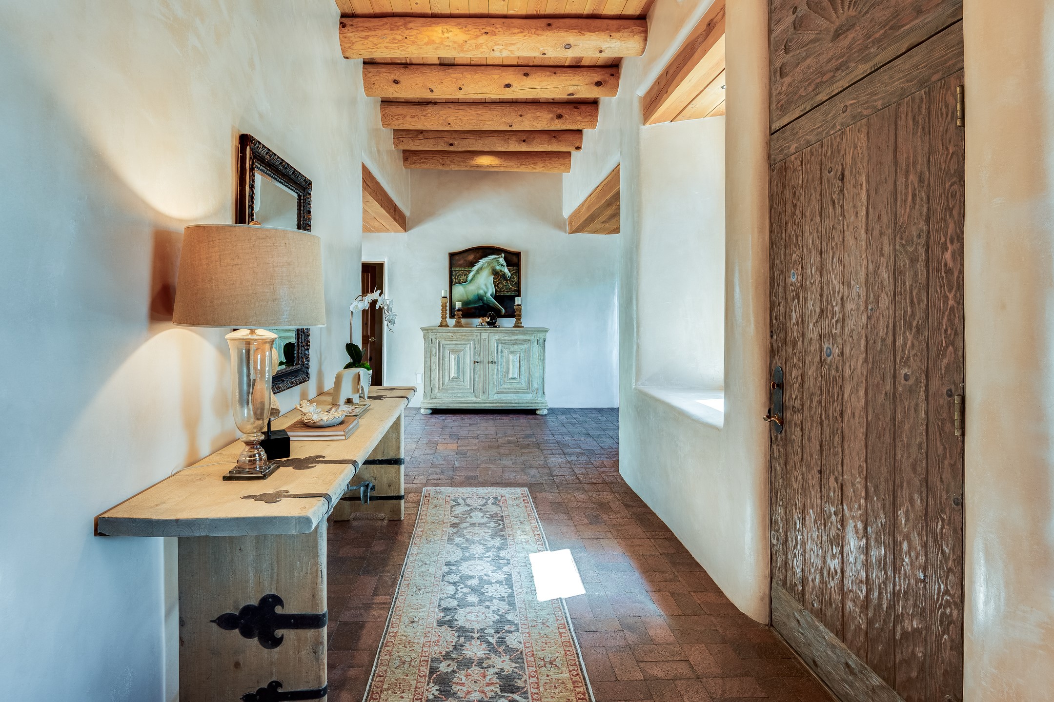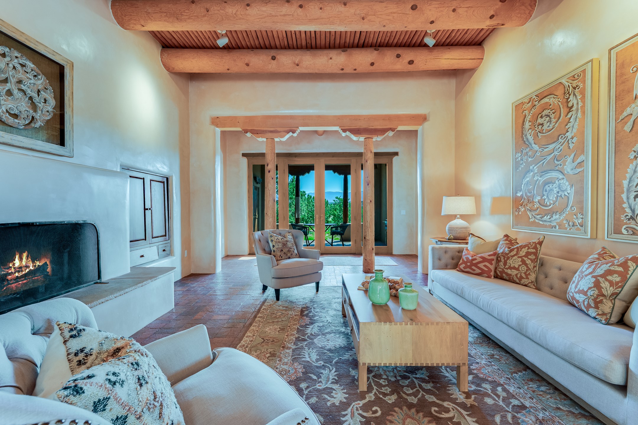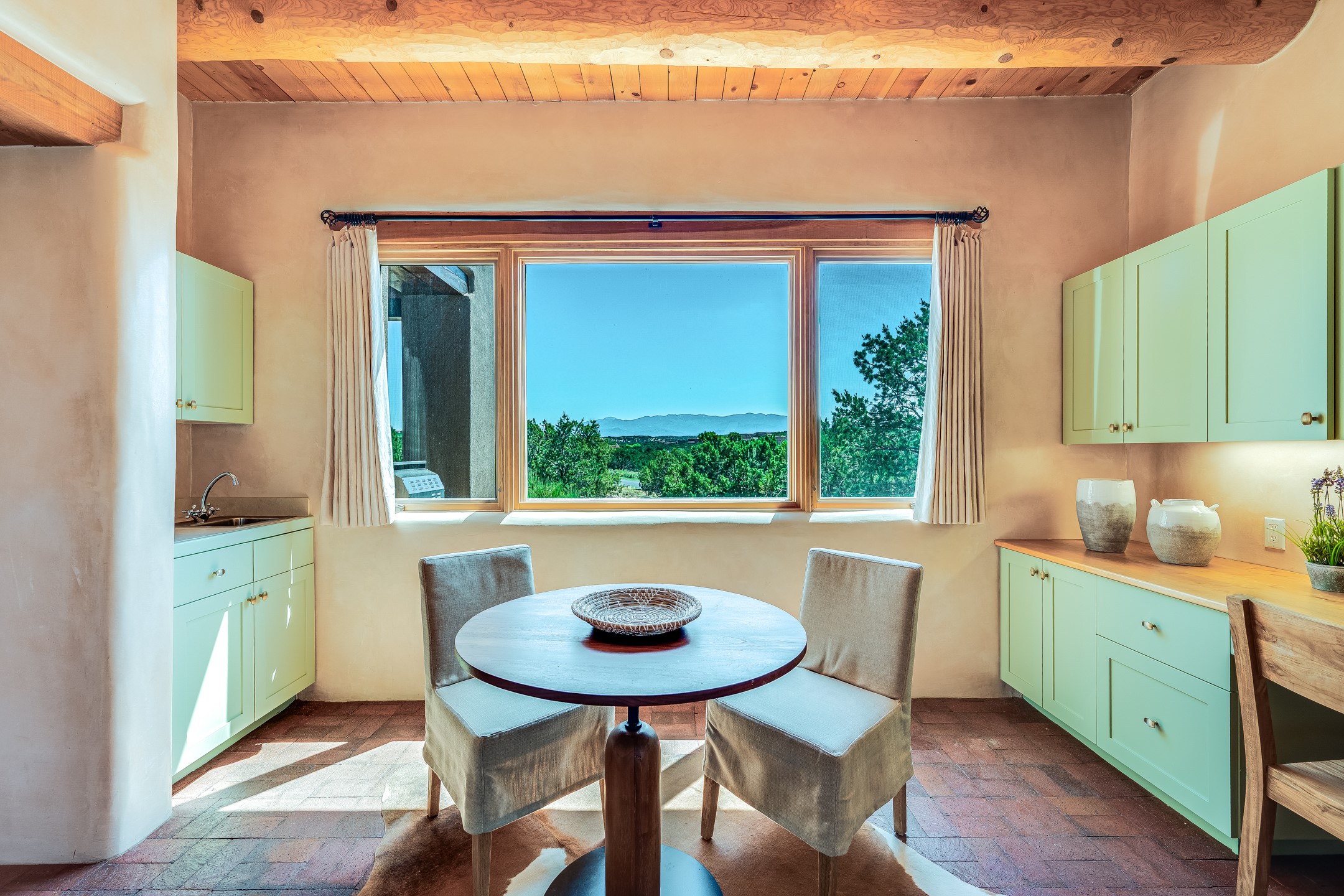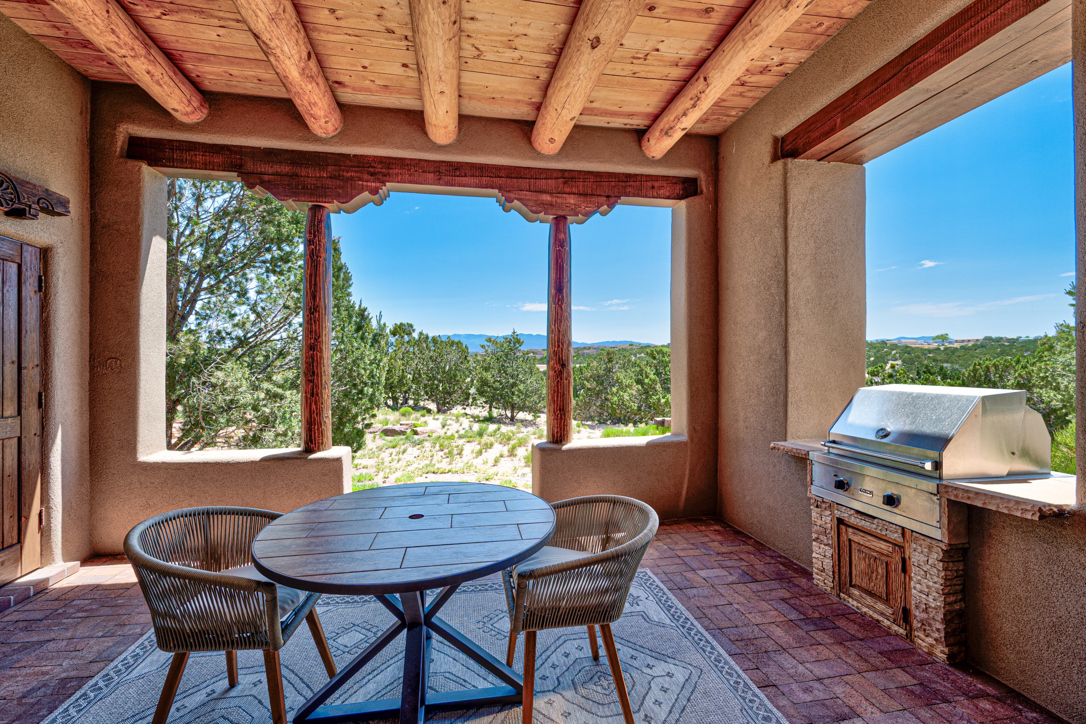 Located in Estates II at Las Campanas, this 3,267* sq. ft. home provides a split floor plan - master suite with a full bath, large walk-in closet, and private patio area separated from 2 guest rooms with 1 full bath. Living room, dining room, breakfast nook and kitchen in an open plan configuration. Office/den adjacent to living room. Four heating/cooling mini-splits, and radiant floor heating maintain a desirable level of comfort throughout. There's even a 220v outlet in the garage for your EV.With form and function seamlessly integrated, the sense of a relaxed elegance is promoted by the dwelling's creature comforts: tall ceilings, single-level open plan layout, large windows, natural materials, and strategically placed outdoor living areas. Contemporary touches, seen in the selections of materials, finishes, and fixtures, are balanced with the acknowledgement given toward "Santa Fe charm" through the use of plaster wall finishes, brick flooring material, and exposed kivas.Awesome views of Baldy and Sangre de Cristo mountains!
