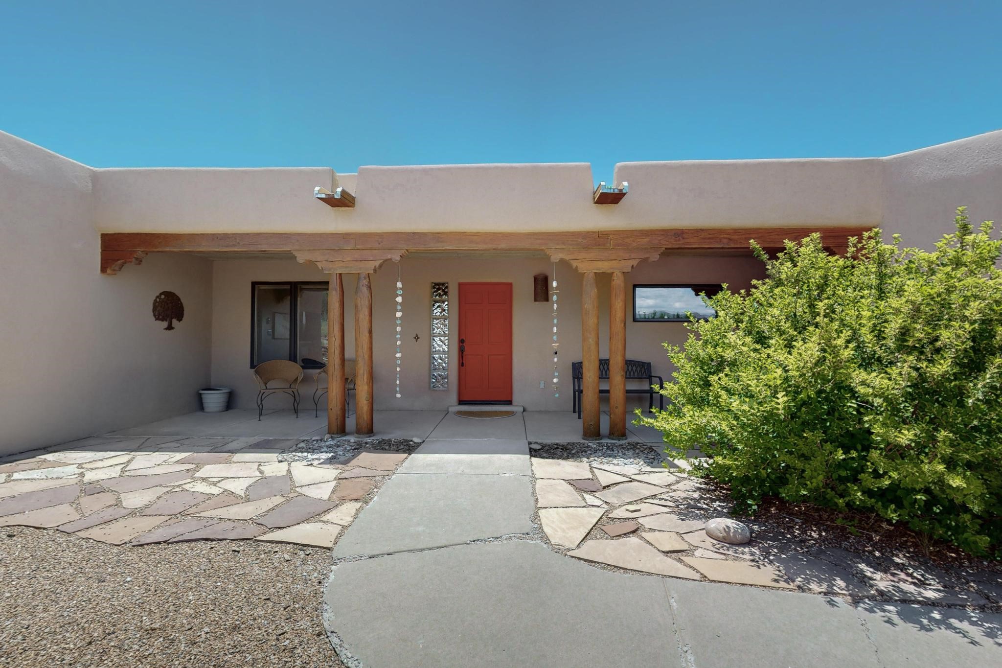 Superb sunset views from the dining area, living room and portal are one of the special treats offered at this lovely home built with a romantic flair by Homes by Marie. Curved corners, high viga ceilings, a central kiva fireplace, double glass in the baths and lots of Santa Fe trimmings create a light and ambient home. Excellent separation between the main and guest bedrooms, and an open plan design makes for easy living spaces. Natural gas radiant heat plus 4 mini splits creates summer and winter comfort plus a cheery Revillusion electric log fireplace insert adds heat and ambience. The refreshed kitchen includes an induction range and granite counter tops. There is a gas hook up behind the range if preferred. An extra heated area between the house and garage was finished as a workout room/office/storage. Added next to the 2 car garage is a spacious finished 12ftx20ft workshop/studio for all those extra hobbies. There is a terraced walled garden and large fenced in area for the fur family, the septic tank was replaced in 2024. Centrally located on a quiet cul de sac this home has easy access to Eldorado Amenities, local shopping, library and schools, only minutes into Santa Fe