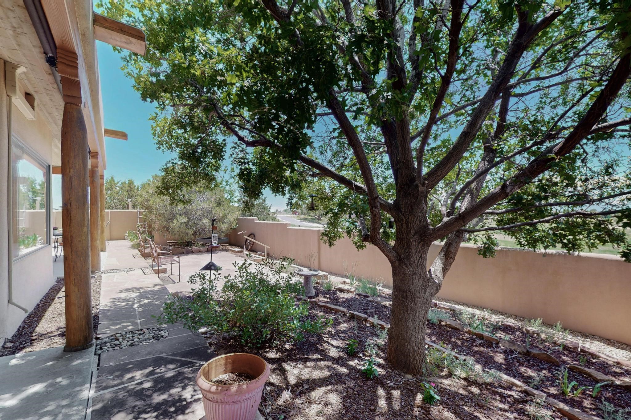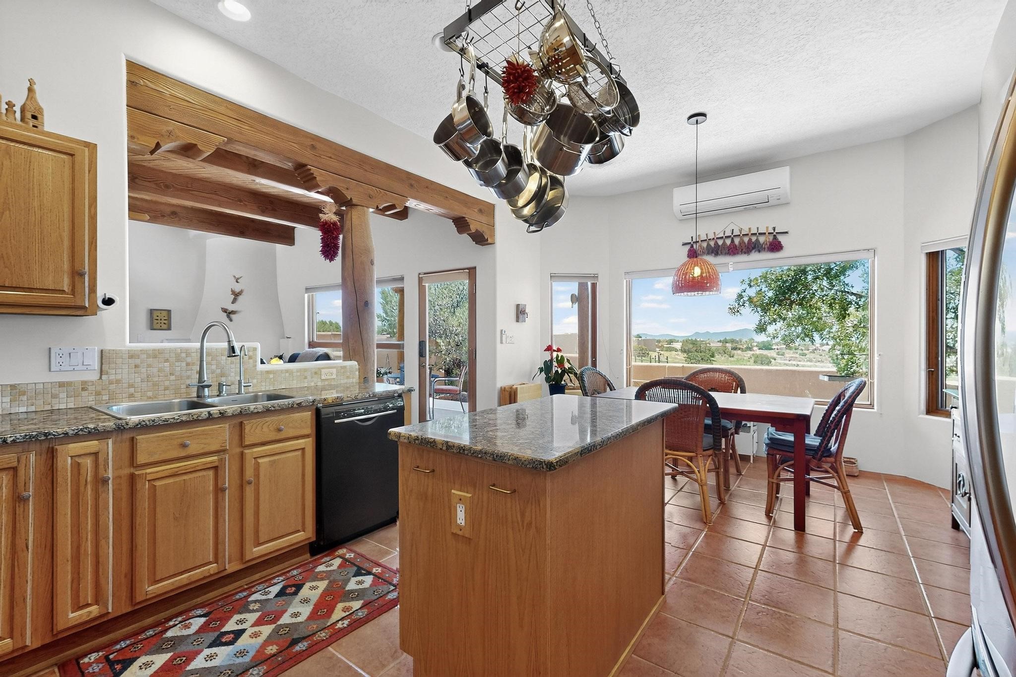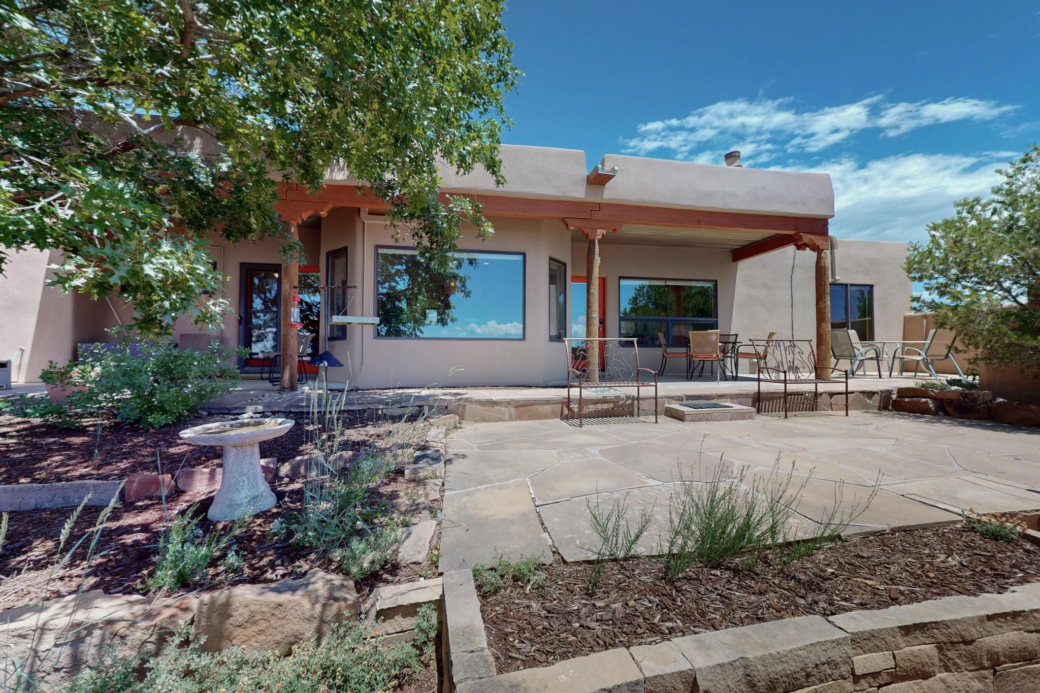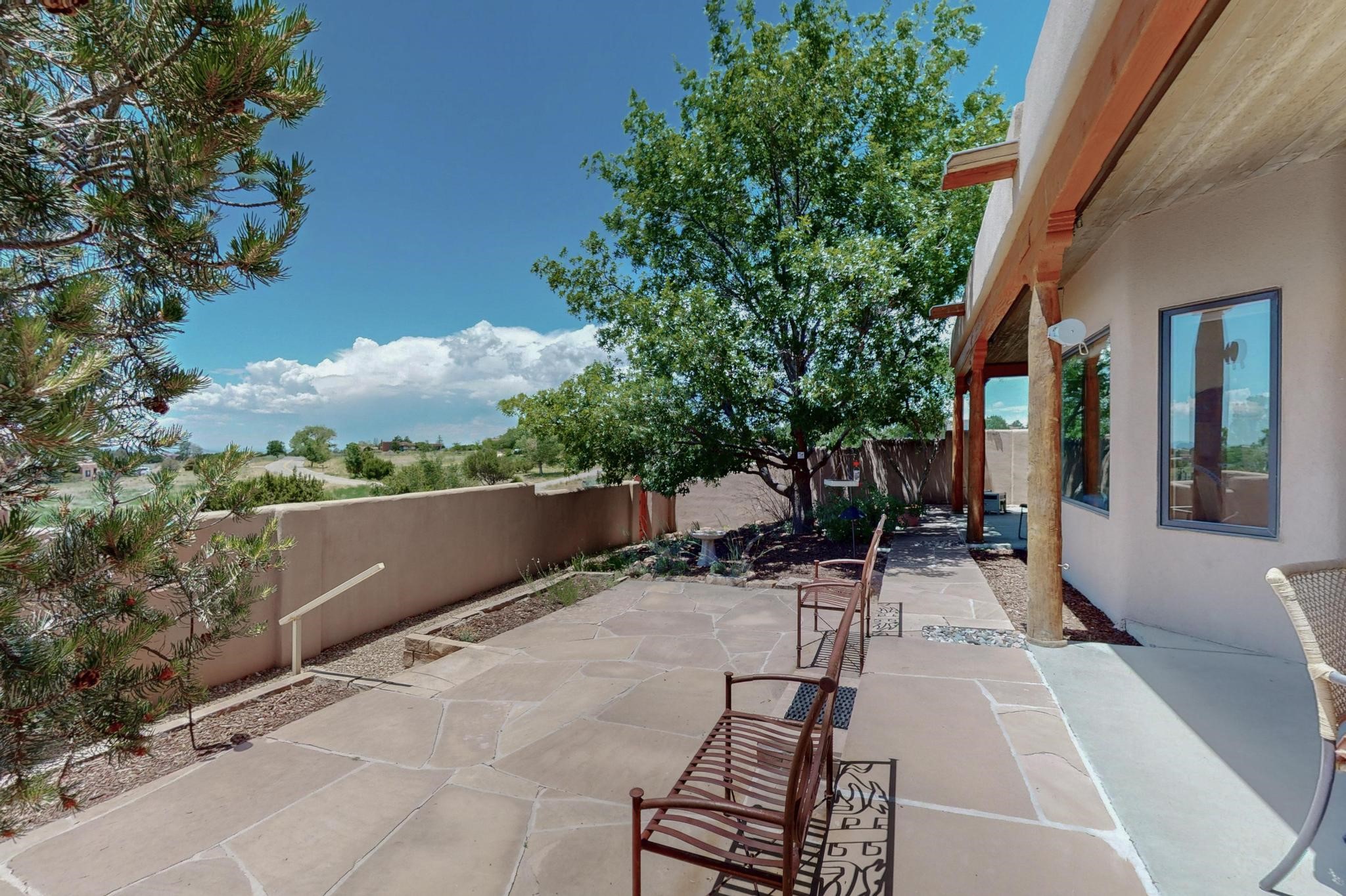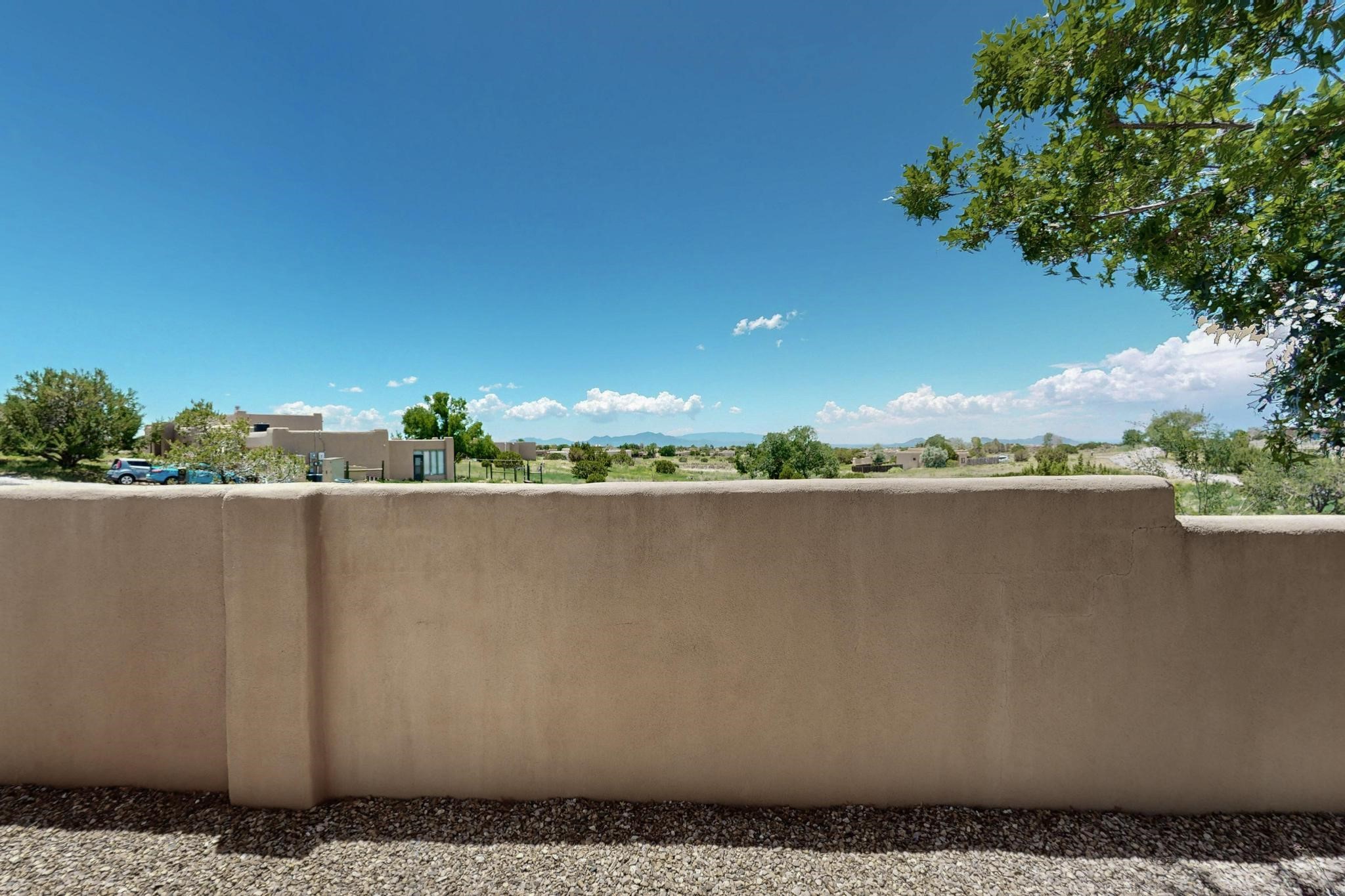 Superb sunset views from the dining area, living room and portal are one of the special treats offered at this lovely home built with a romantic flair by Homes by Marie. Curved corners, high viga ceilings, a central kiva fireplace, double glass in the baths and lots of Santa Fe trimmings create a light and ambient home. Excellent separation between the main and guest bedrooms, and an open plan design makes for easy living spaces. Natural gas radiant heat plus 4 mini splits creates summer and winter comfort plus a cheery Revillusion electric log fireplace insert adds heat and ambience. The refreshed kitchen includes an induction range and granite counter tops. There is a gas hook up behind the range if preferred. An extra heated area between the house and garage was finished as a workout room/office/storage. Added next to the 2 car garage is a spacious finished 12ftx20ft workshop/studio for all those extra hobbies. There is a terraced walled garden and large fenced in area for the fur family, the septic tank was replaced in 2024. Centrally located on a quiet cul de sac this home has easy access to Eldorado Amenities, local shopping, library and schools, only minutes into Santa Fe