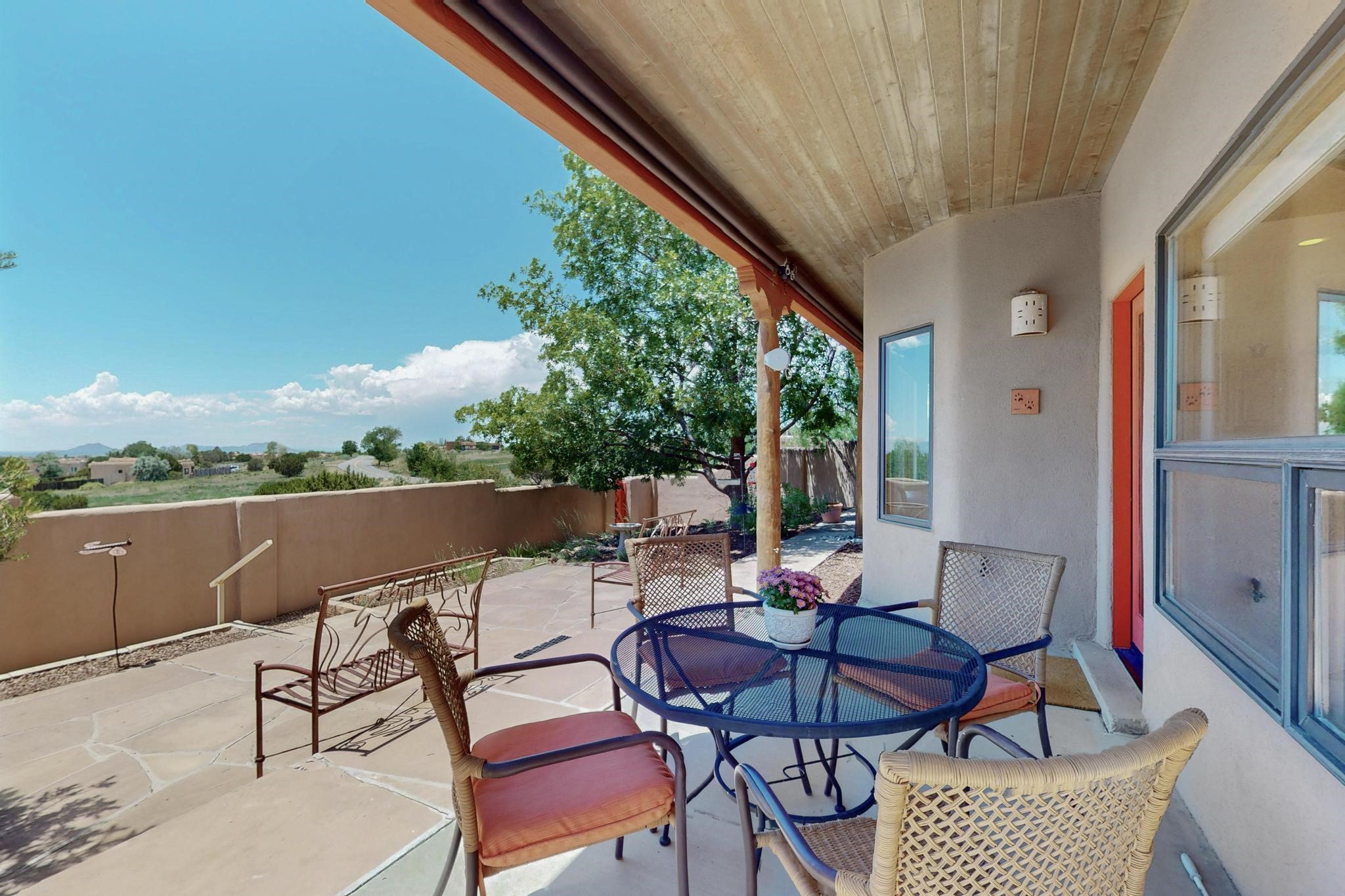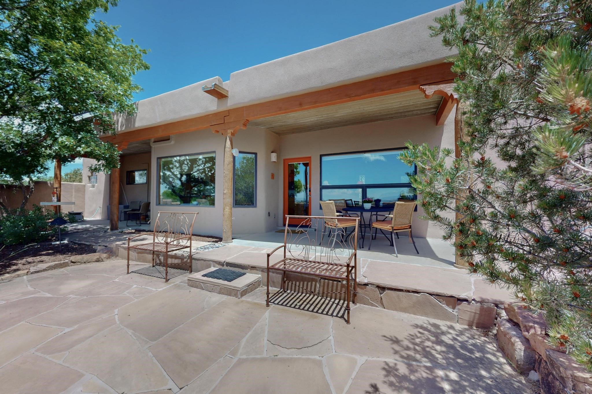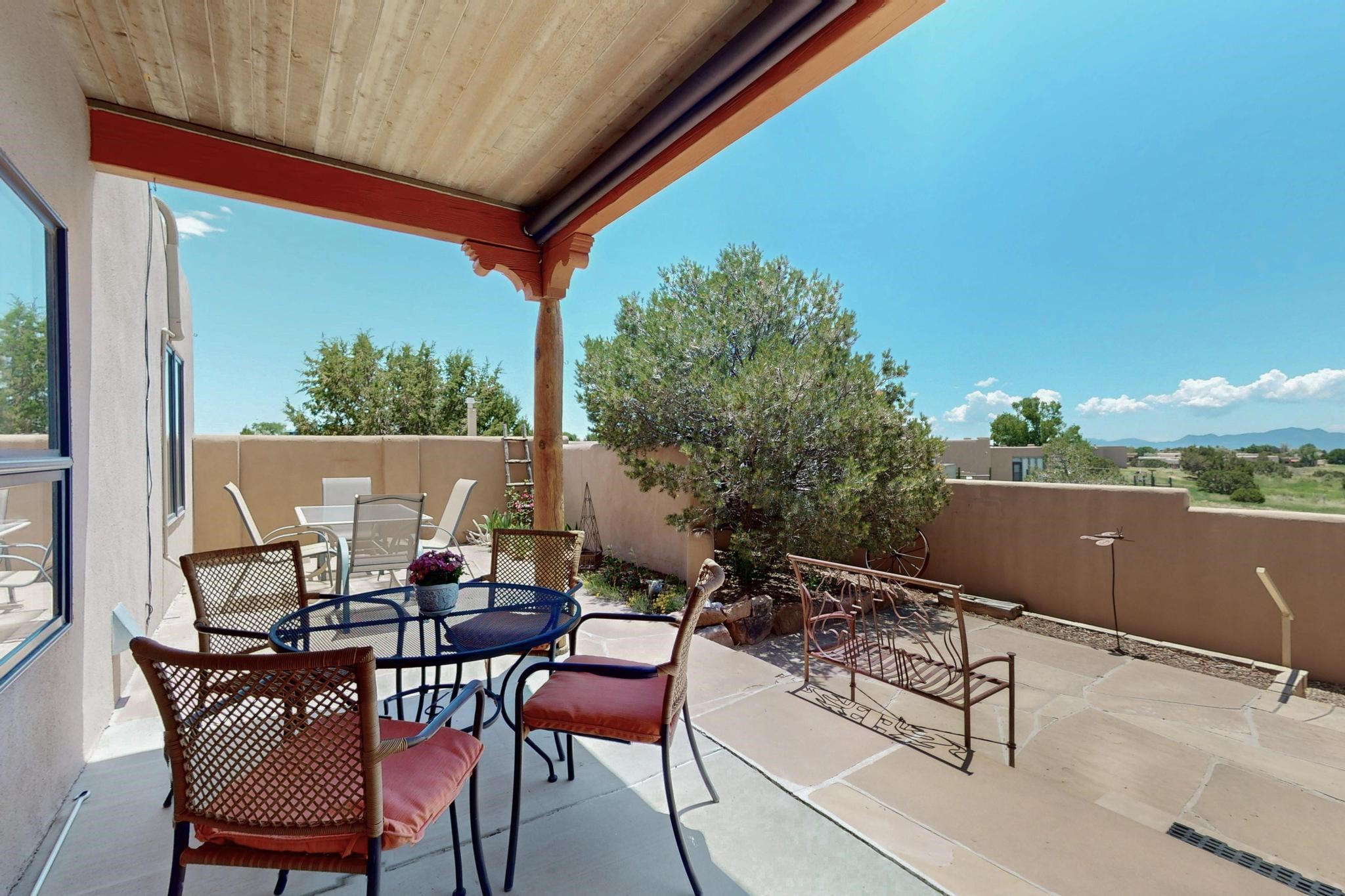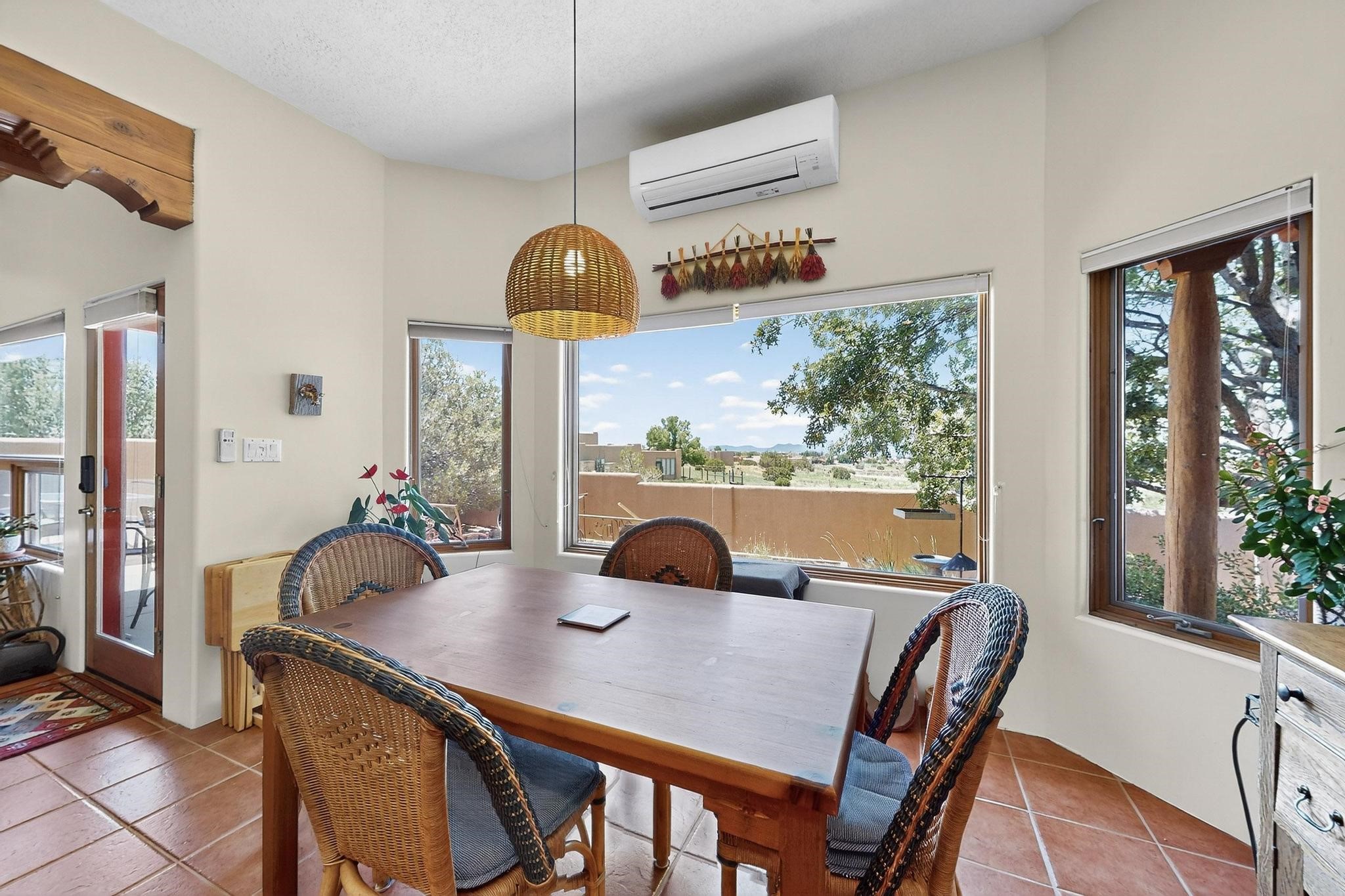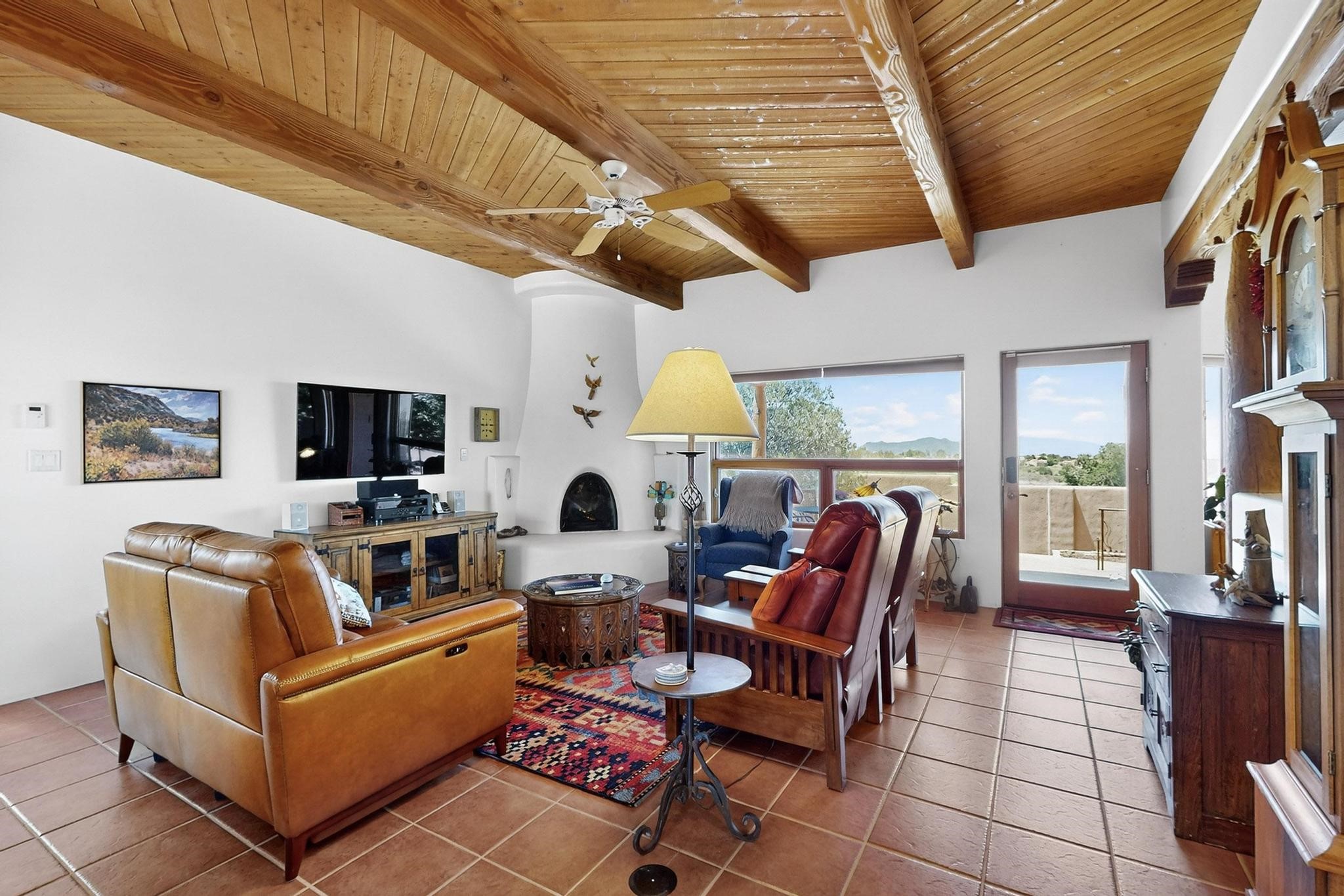 Superb sunset views from the dining area, living room and portal are one of the special treats offered at this lovely home built with a romantic flair by Homes by Marie. Curved corners, high viga ceilings, a central kiva fireplace, double glass in the baths and lots of Santa Fe trimmings create a light and ambient home. Excellent separation between the main and guest bedrooms, and an open plan design makes for easy living spaces. Natural gas radiant heat plus 4 mini splits creates summer and winter comfort plus a cheery Revillusion electric log fireplace insert adds heat and ambience. The refreshed kitchen includes an induction range and granite counter tops. There is a gas hook up behind the range if preferred. An extra heated area between the house and garage was finished as a workout room/office/storage. Added next to the 2 car garage is a spacious finished 12ftx20ft workshop/studio for all those extra hobbies. There is a terraced walled garden and large fenced in area for the fur family, the septic tank was replaced in 2024. Centrally located on a quiet cul de sac this home has easy access to Eldorado Amenities, local shopping, library and schools, only minutes into Santa Fe