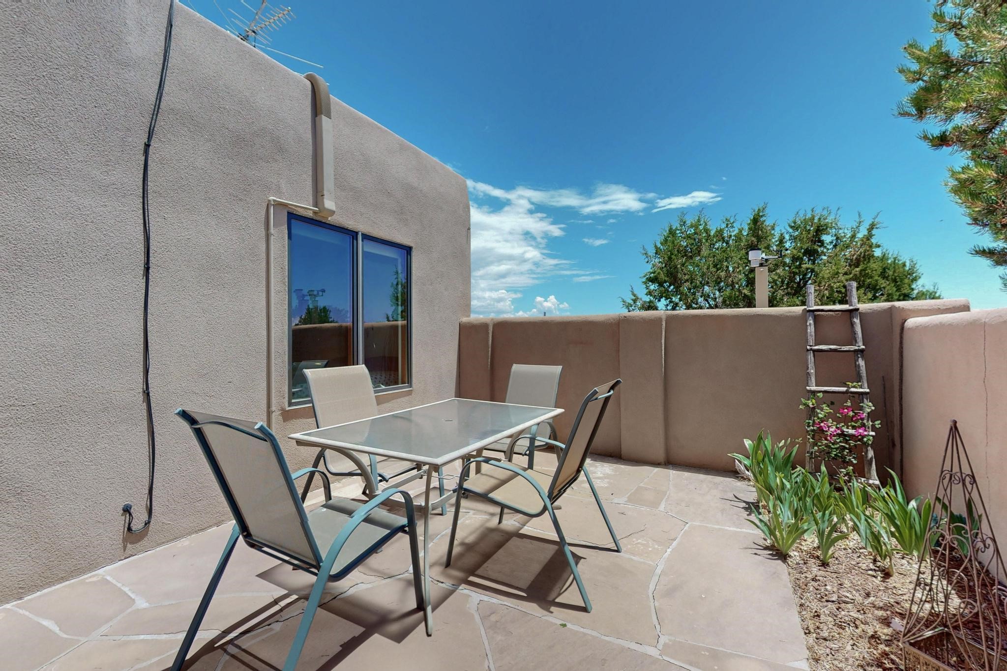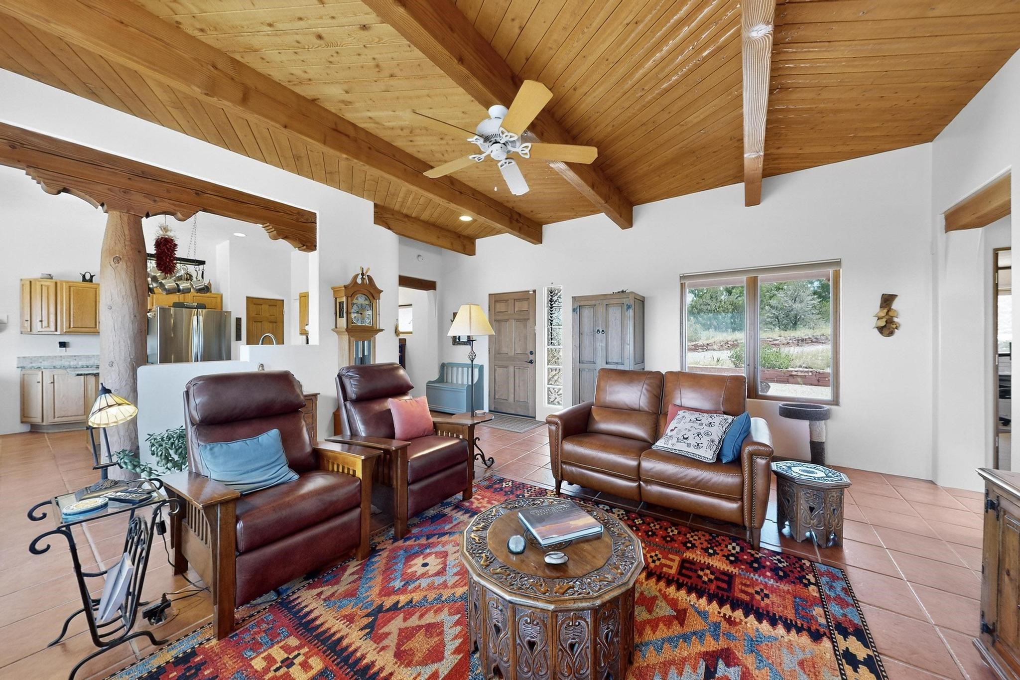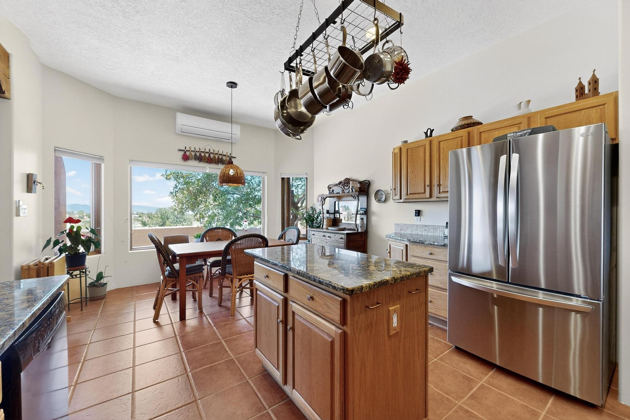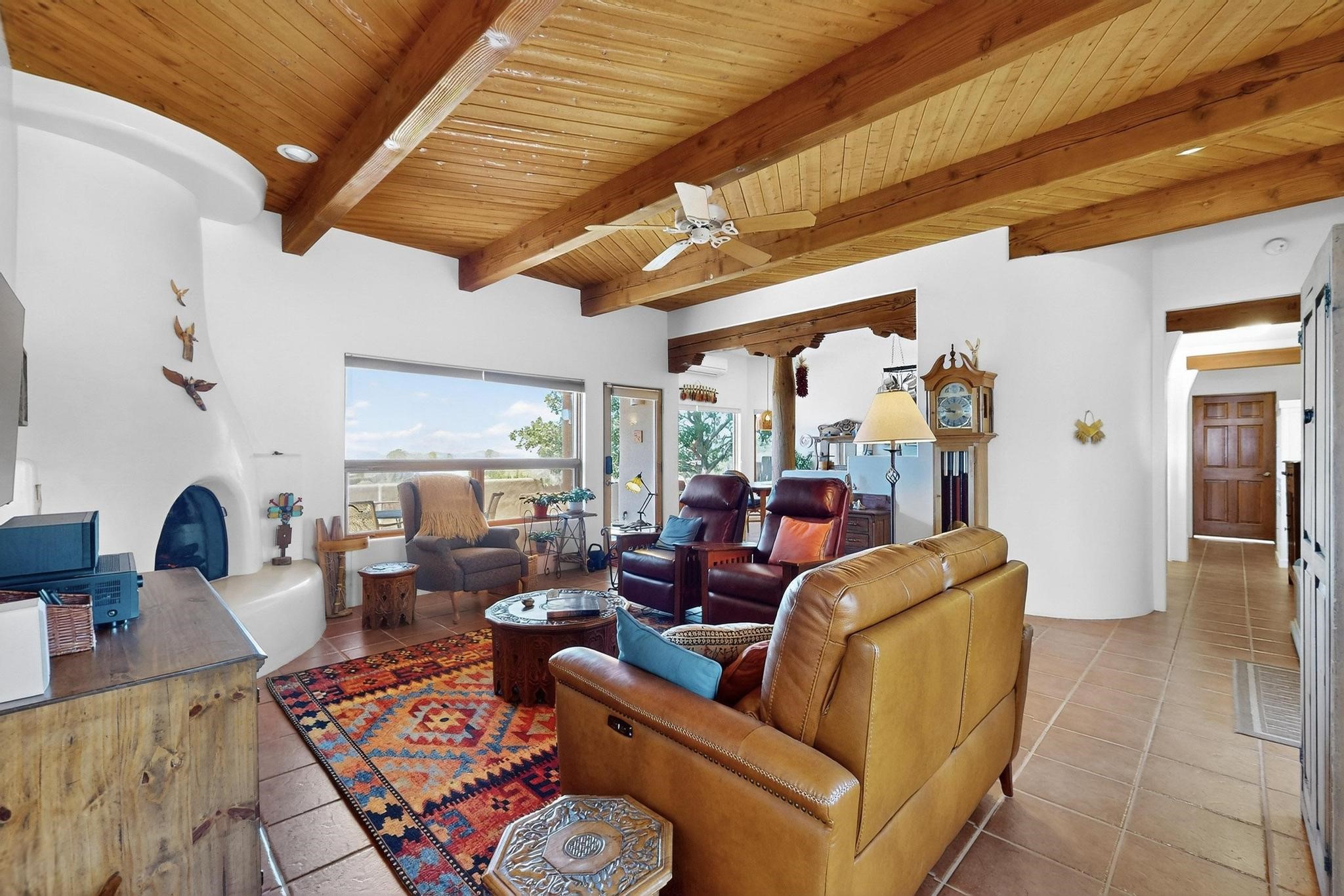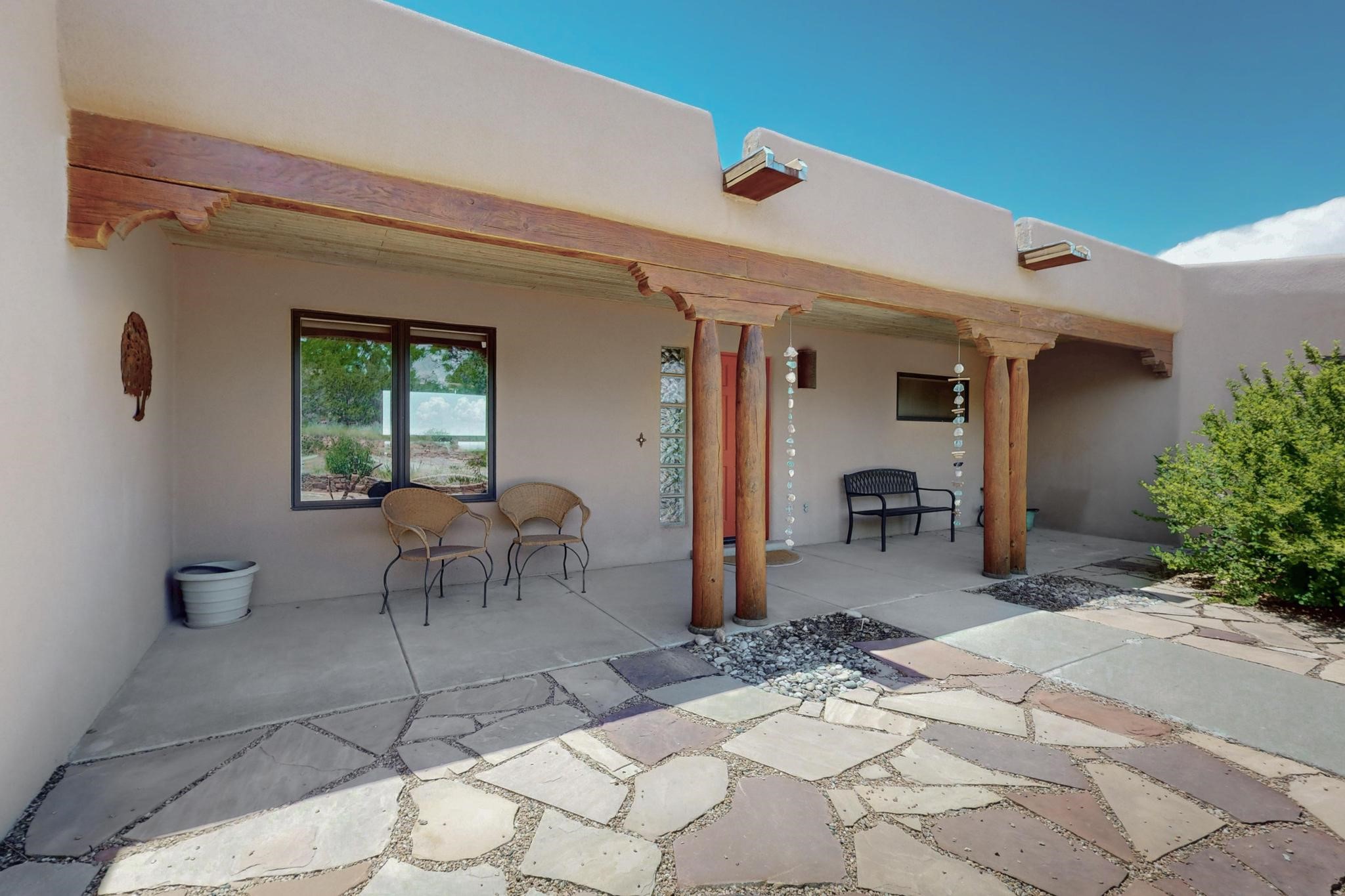 Superb sunset views from the dining area, living room and portal are one of the special treats offered at this lovely home built with a romantic flair by Homes by Marie. Curved corners, high viga ceilings, a central kiva fireplace, double glass in the baths and lots of Santa Fe trimmings create a light and ambient home. Excellent separation between the main and guest bedrooms, and an open plan design makes for easy living spaces. Natural gas radiant heat plus 4 mini splits creates summer and winter comfort plus a cheery Revillusion electric log fireplace insert adds heat and ambience. The refreshed kitchen includes an induction range and granite counter tops. There is a gas hook up behind the range if preferred. An extra heated area between the house and garage was finished as a workout room/office/storage. Added next to the 2 car garage is a spacious finished 12ftx20ft workshop/studio for all those extra hobbies. There is a terraced walled garden and large fenced in area for the fur family, the septic tank was replaced in 2024. Centrally located on a quiet cul de sac this home has easy access to Eldorado Amenities, local shopping, library and schools, only minutes into Santa Fe