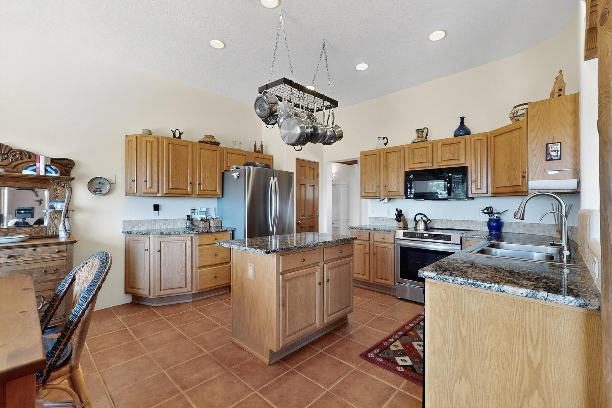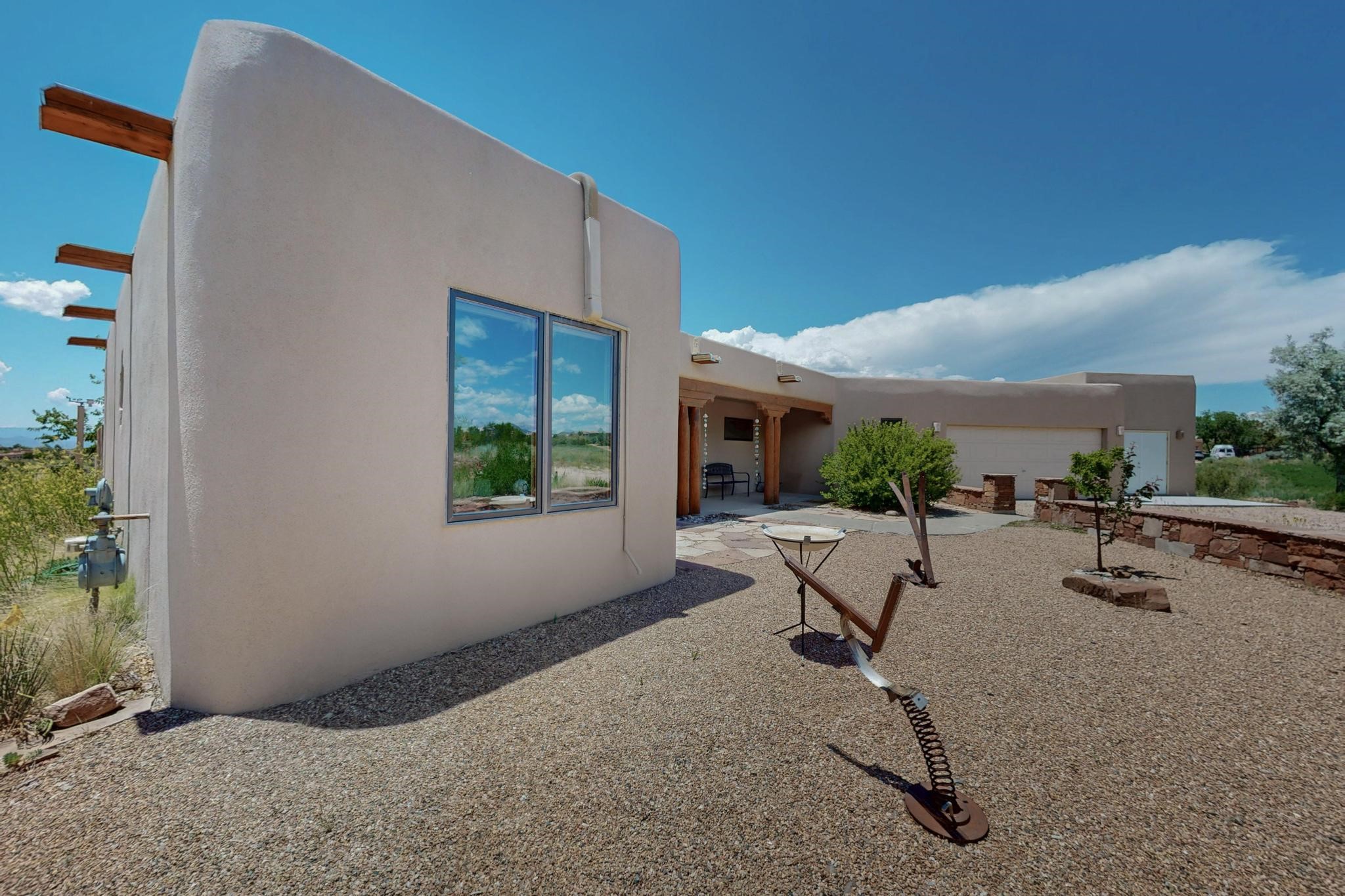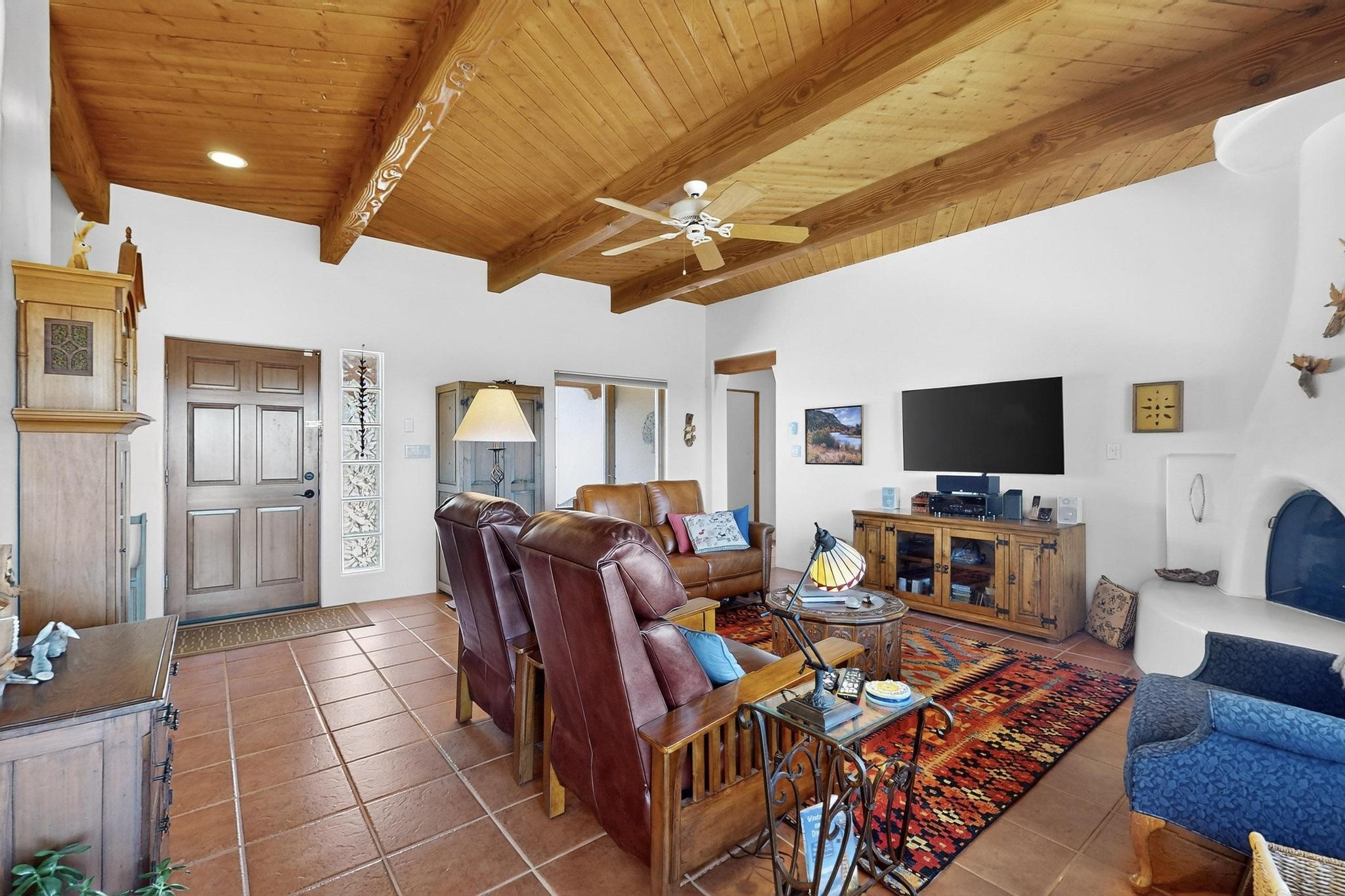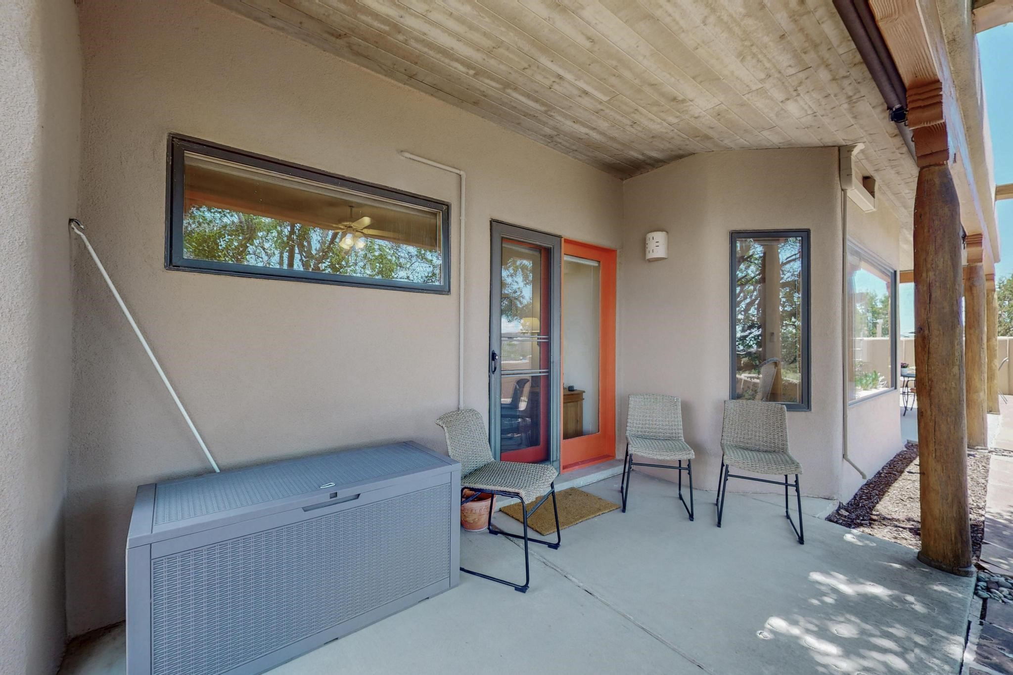 Superb sunset views from the dining area, living room and portal are one of the special treats offered at this lovely home built with a romantic flair by Homes by Marie. Curved corners, high viga ceilings, a central kiva fireplace, double glass in the baths and lots of Santa Fe trimmings create a light and ambient home. Excellent separation between the main and guest bedrooms, and an open plan design makes for easy living spaces. Natural gas radiant heat plus 4 mini splits creates summer and winter comfort plus a cheery Revillusion electric log fireplace insert adds heat and ambience. The refreshed kitchen includes an induction range and granite counter tops. There is a gas hook up behind the range if preferred. An extra heated area between the house and garage was finished as a workout room/office/storage. Added next to the 2 car garage is a spacious finished 12ftx20ft workshop/studio for all those extra hobbies. There is a terraced walled garden and large fenced in area for the fur family, the septic tank was replaced in 2024. Centrally located on a quiet cul de sac this home has easy access to Eldorado Amenities, local shopping, library and schools, only minutes into Santa Fe