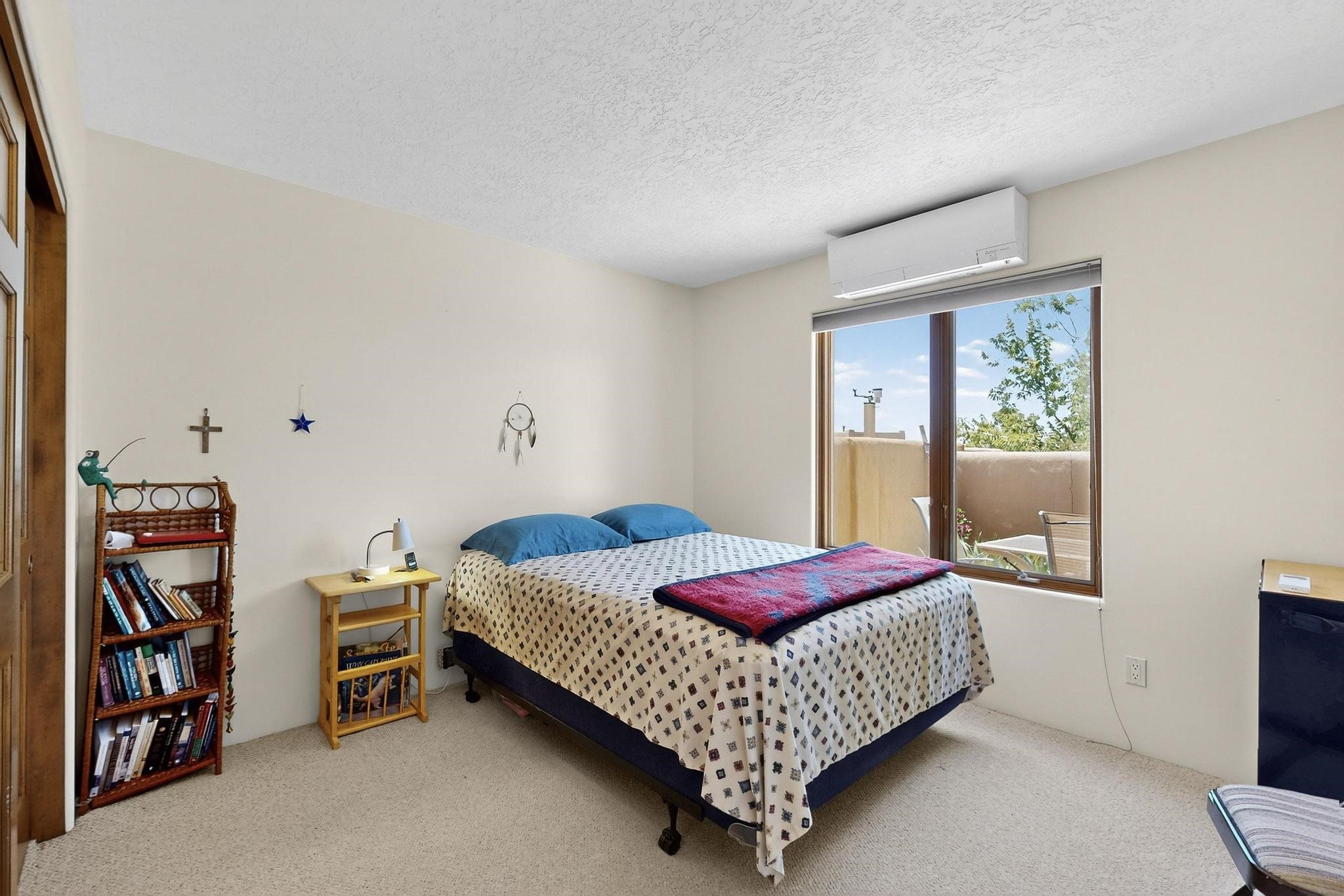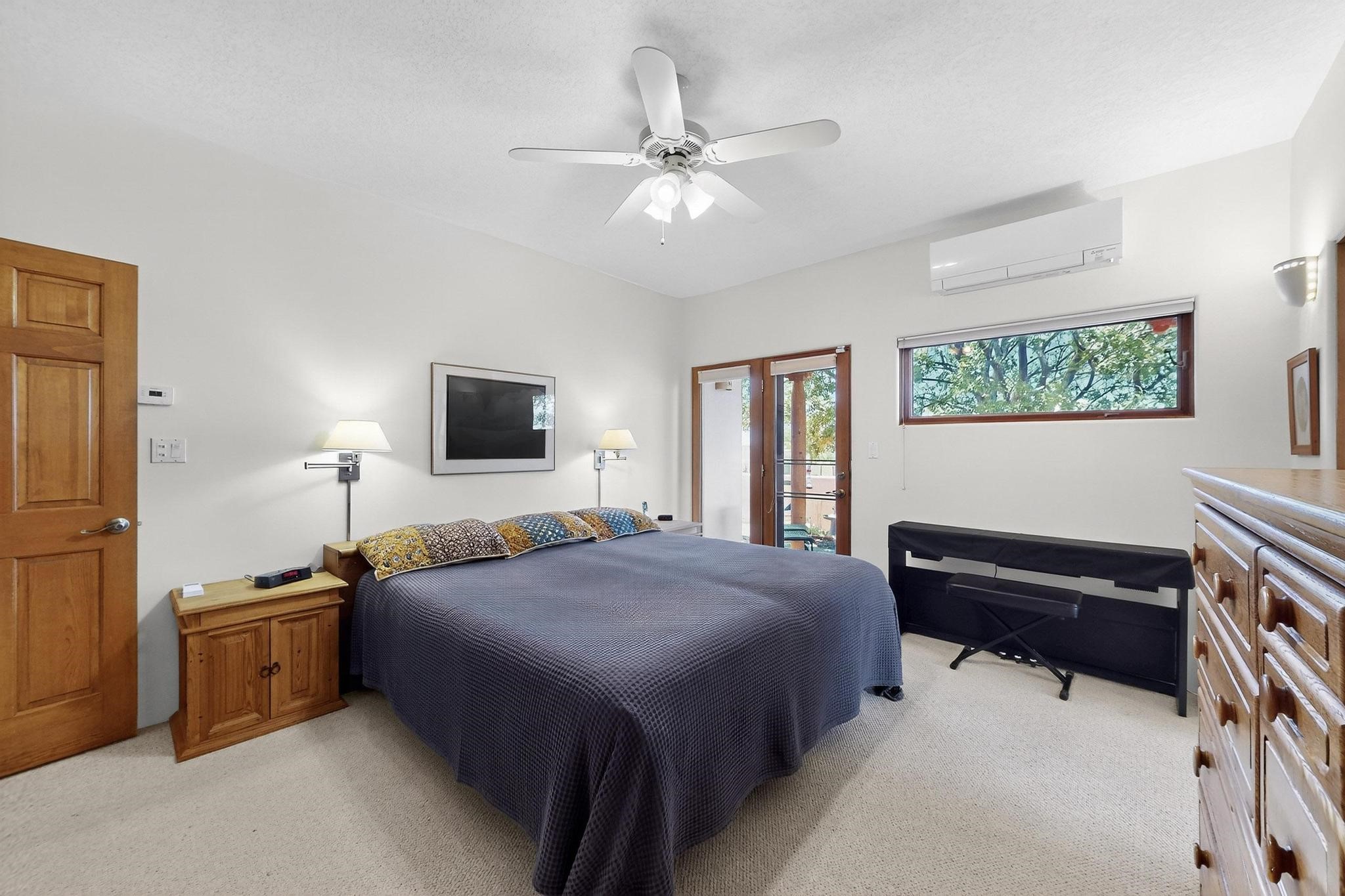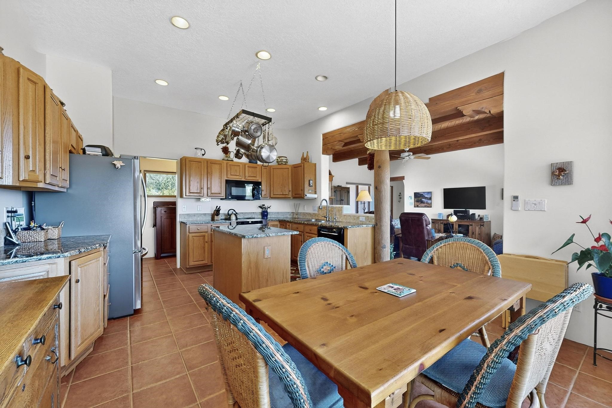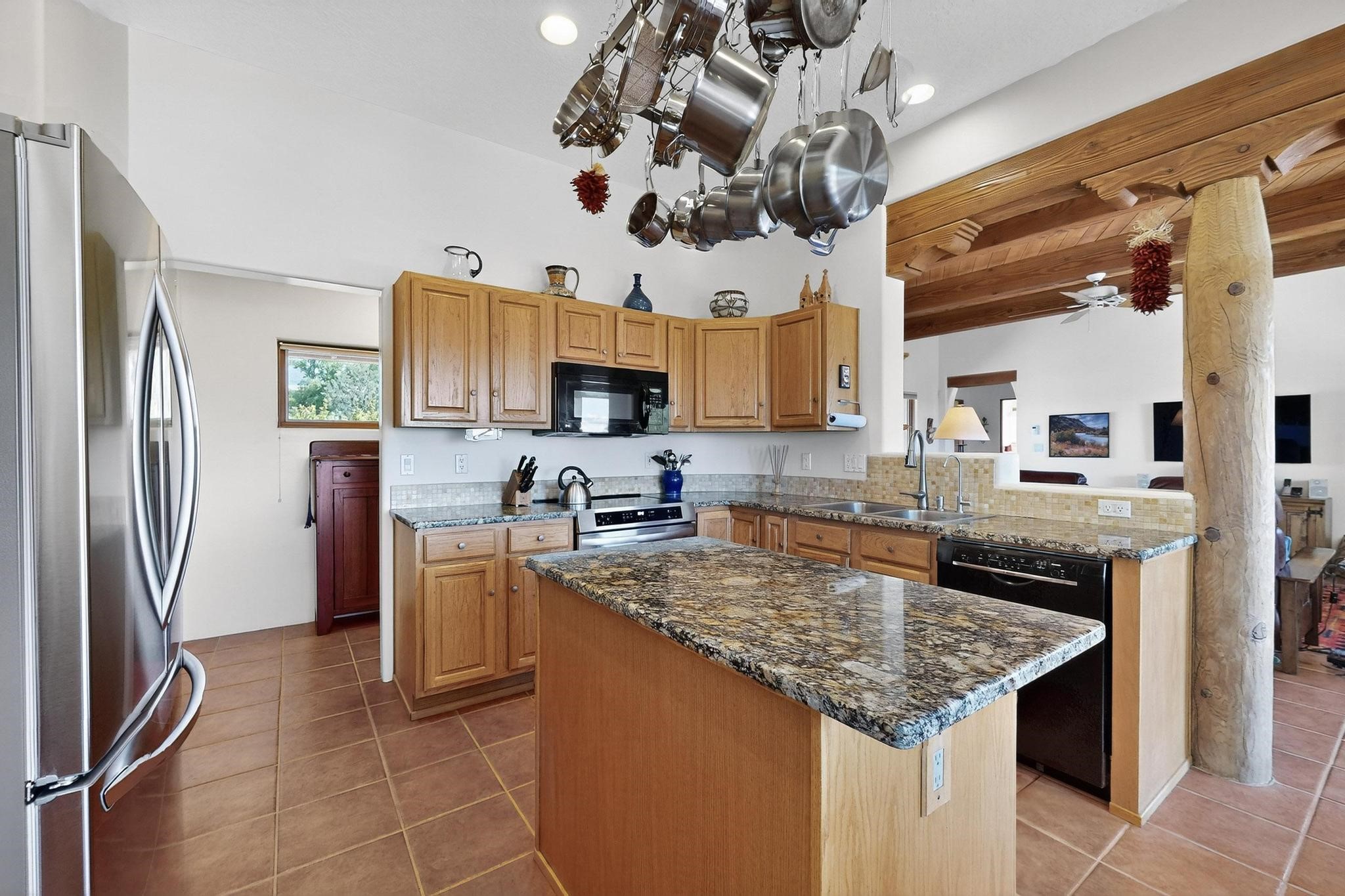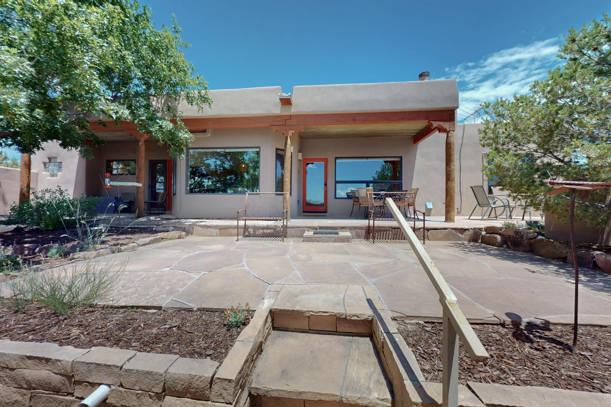 Superb sunset views from the dining area, living room and portal are one of the special treats offered at this lovely home built with a romantic flair by Homes by Marie. Curved corners, high viga ceilings, a central kiva fireplace, double glass in the baths and lots of Santa Fe trimmings create a light and ambient home. Excellent separation between the main and guest bedrooms, and an open plan design makes for easy living spaces. Natural gas radiant heat plus 4 mini splits creates summer and winter comfort plus a cheery Revillusion electric log fireplace insert adds heat and ambience. The refreshed kitchen includes an induction range and granite counter tops. There is a gas hook up behind the range if preferred. An extra heated area between the house and garage was finished as a workout room/office/storage. Added next to the 2 car garage is a spacious finished 12ftx20ft workshop/studio for all those extra hobbies. There is a terraced walled garden and large fenced in area for the fur family, the septic tank was replaced in 2024. Centrally located on a quiet cul de sac this home has easy access to Eldorado Amenities, local shopping, library and schools, only minutes into Santa Fe