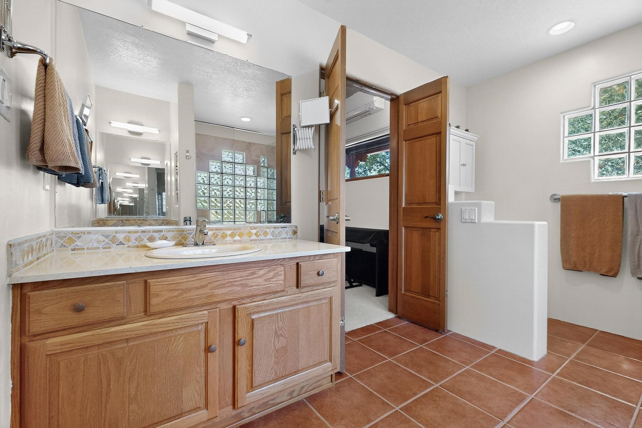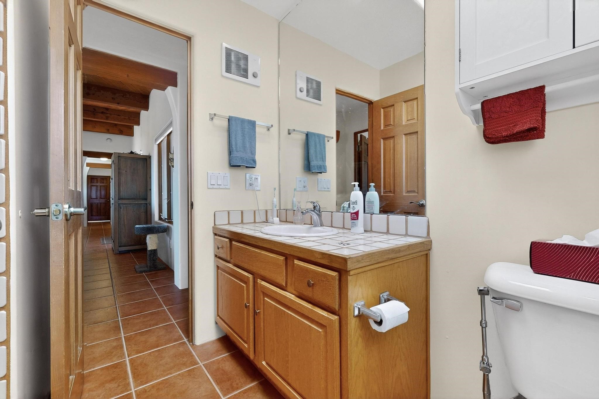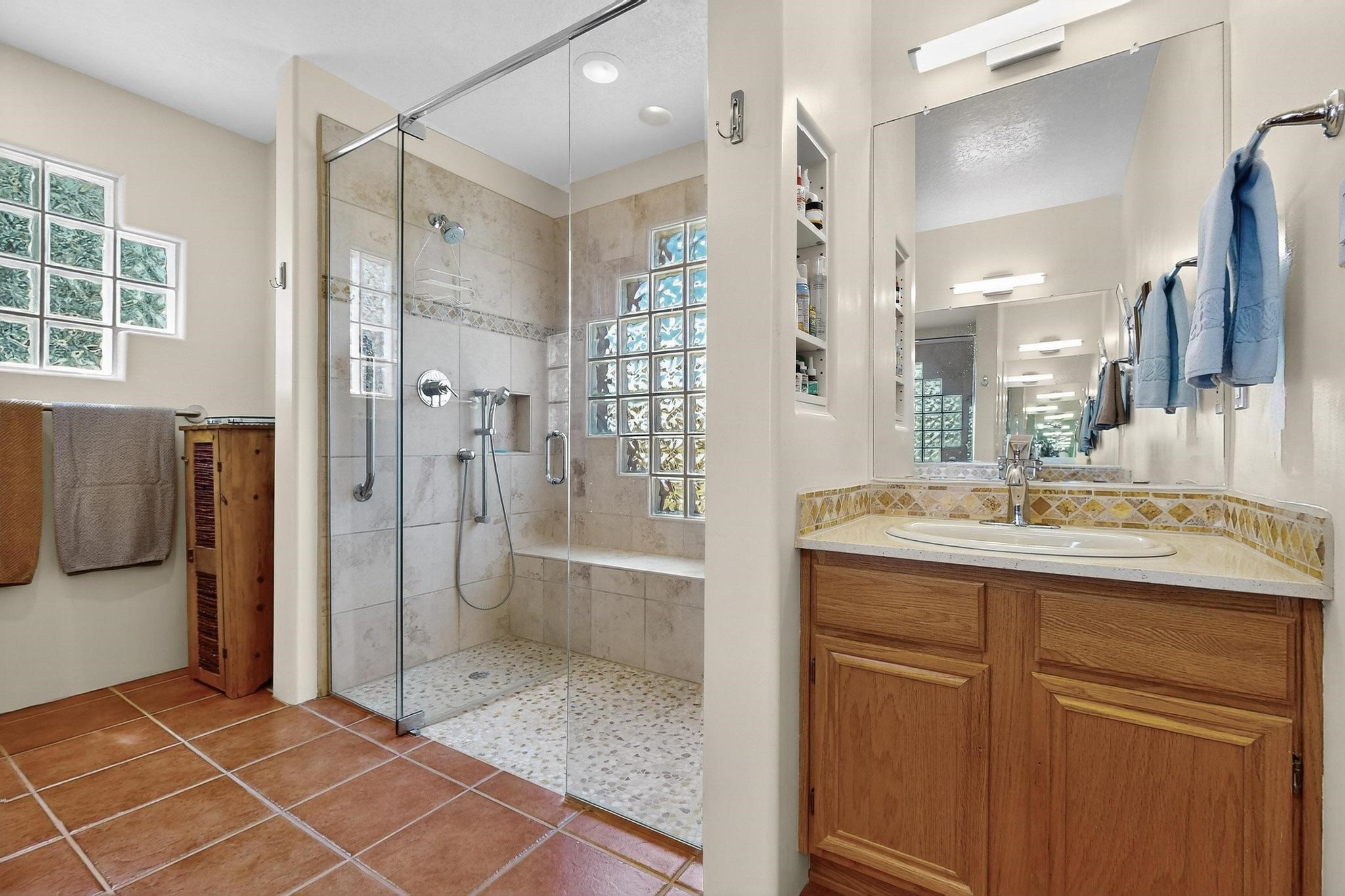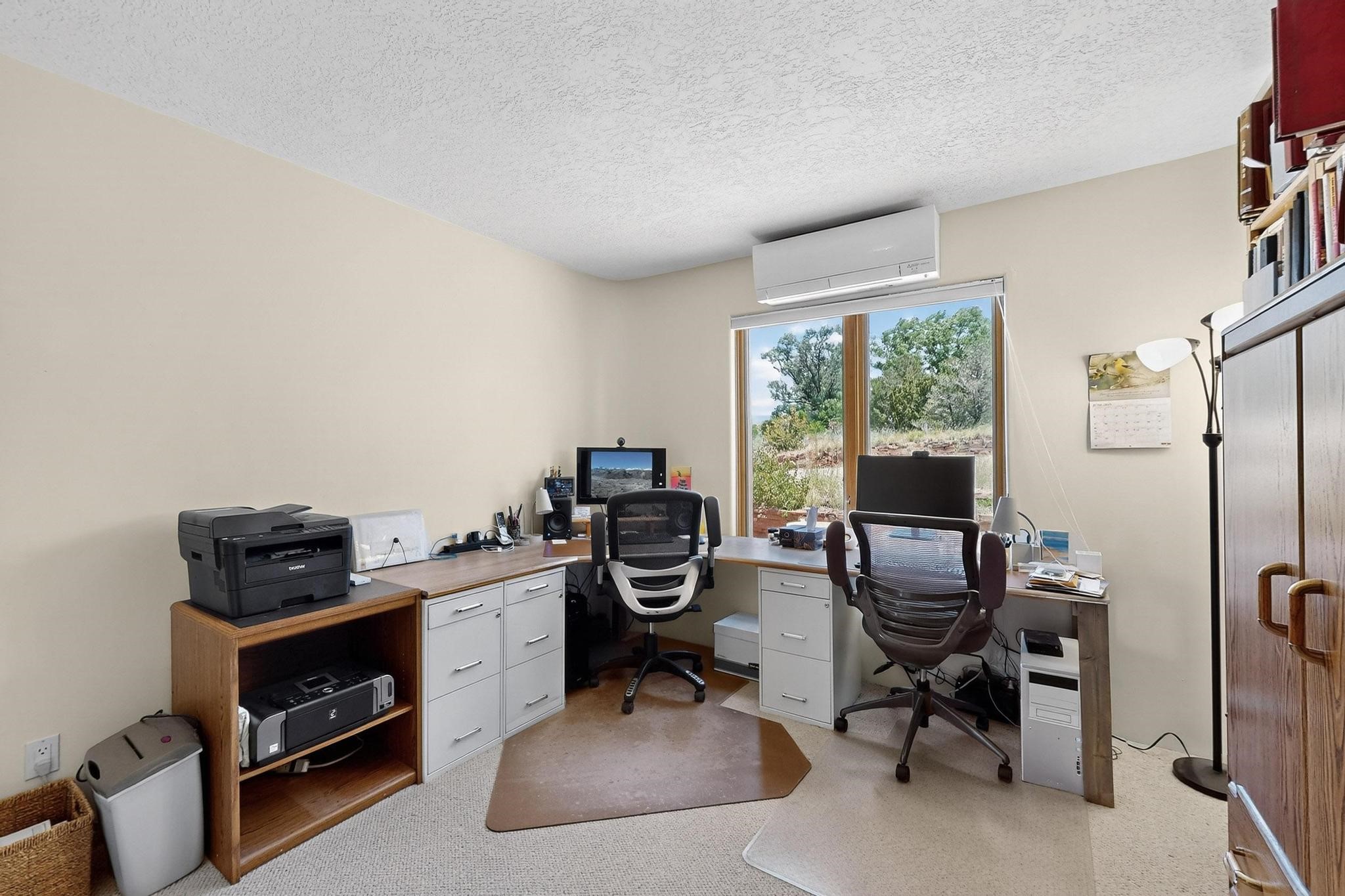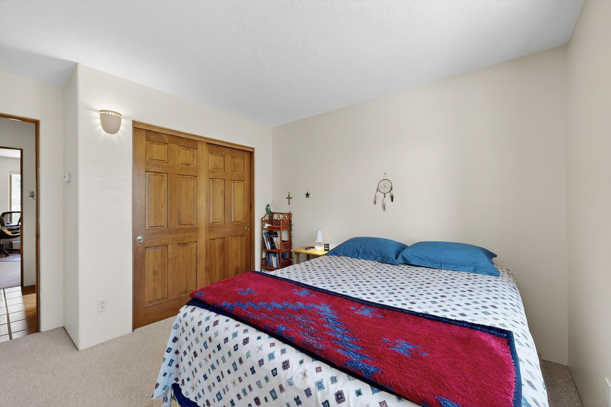 Superb sunset views from the dining area, living room and portal are one of the special treats offered at this lovely home built with a romantic flair by Homes by Marie. Curved corners, high viga ceilings, a central kiva fireplace, double glass in the baths and lots of Santa Fe trimmings create a light and ambient home. Excellent separation between the main and guest bedrooms, and an open plan design makes for easy living spaces. Natural gas radiant heat plus 4 mini splits creates summer and winter comfort plus a cheery Revillusion electric log fireplace insert adds heat and ambience. The refreshed kitchen includes an induction range and granite counter tops. There is a gas hook up behind the range if preferred. An extra heated area between the house and garage was finished as a workout room/office/storage. Added next to the 2 car garage is a spacious finished 12ftx20ft workshop/studio for all those extra hobbies. There is a terraced walled garden and large fenced in area for the fur family, the septic tank was replaced in 2024. Centrally located on a quiet cul de sac this home has easy access to Eldorado Amenities, local shopping, library and schools, only minutes into Santa Fe