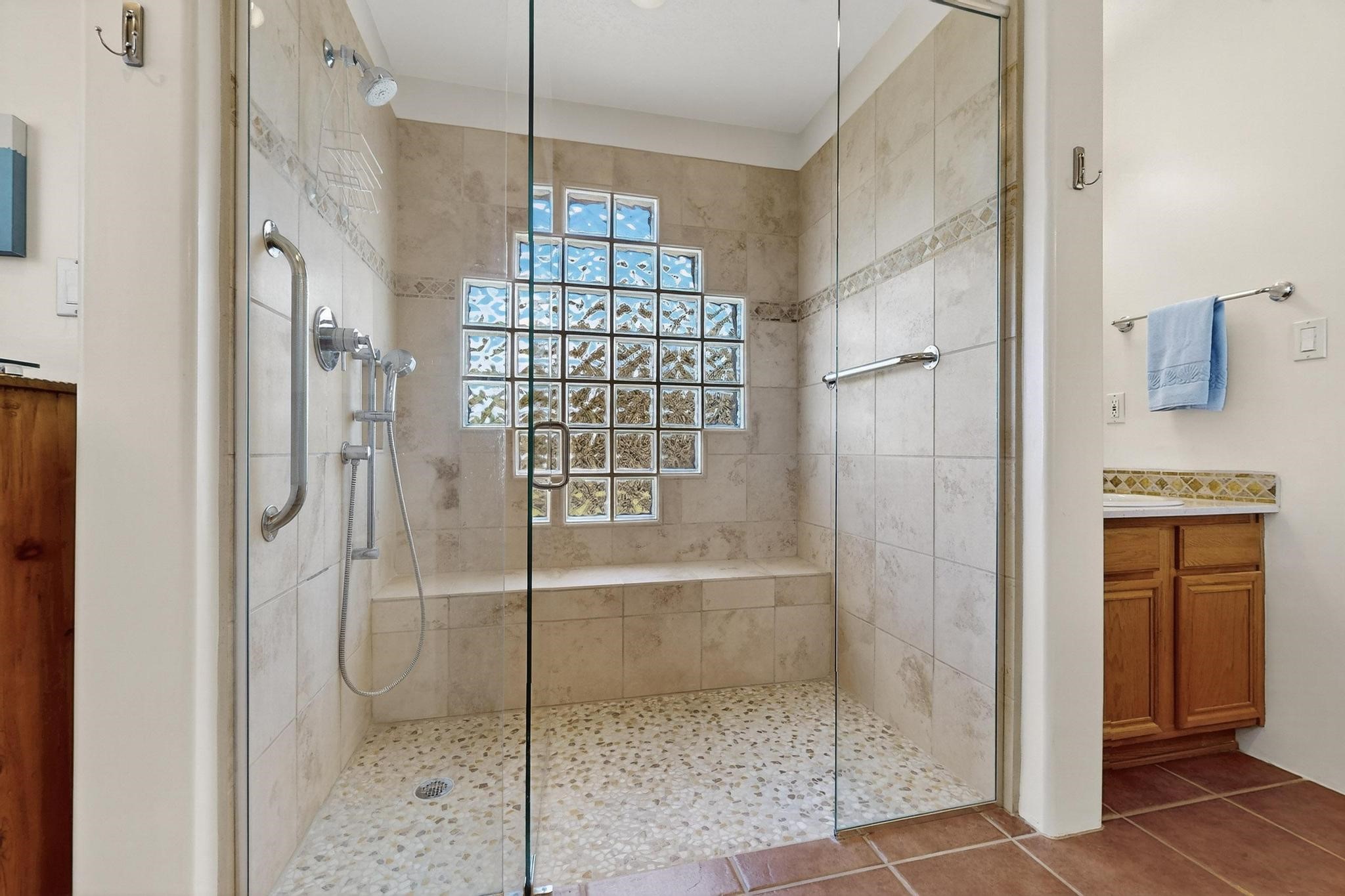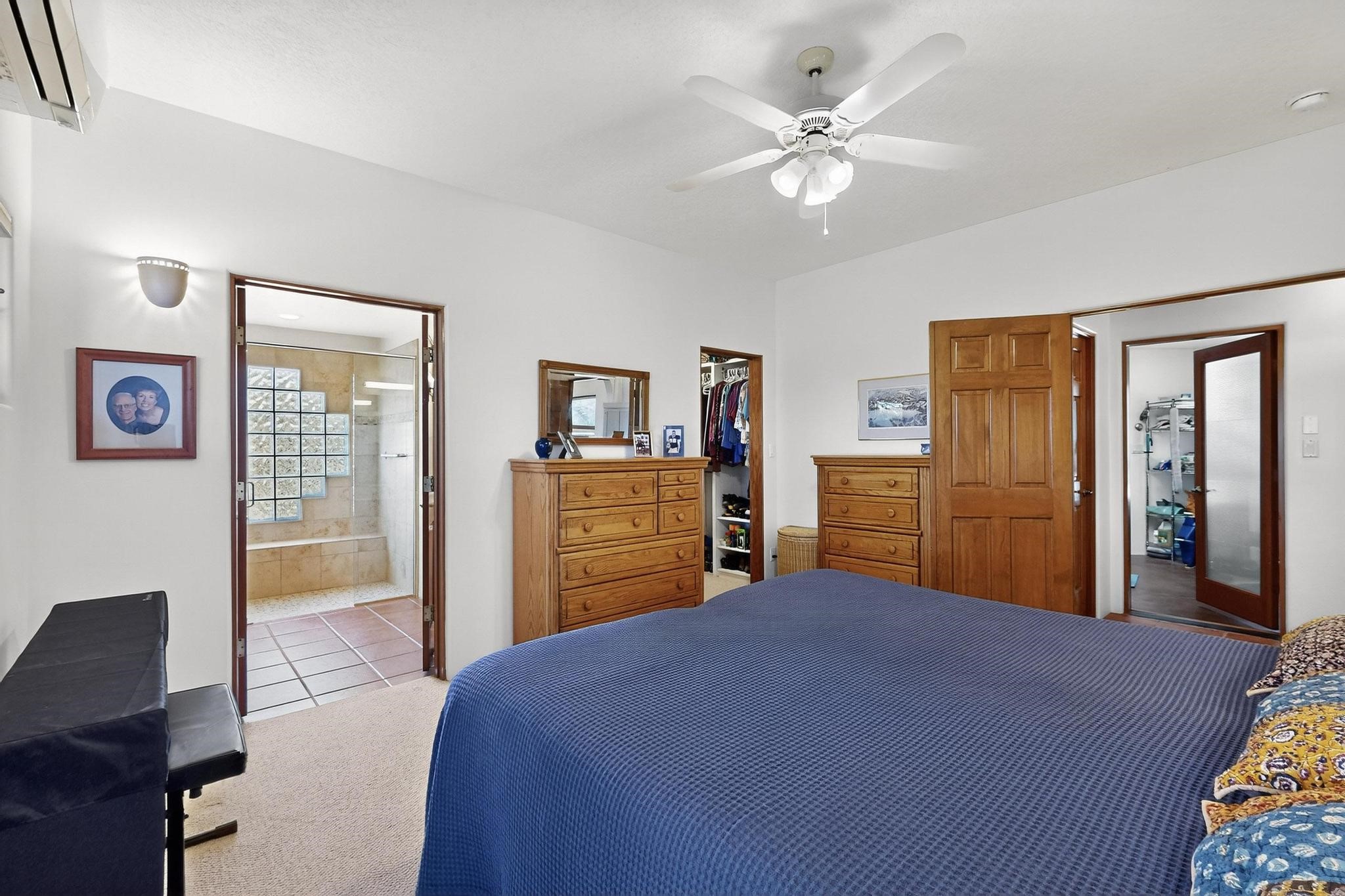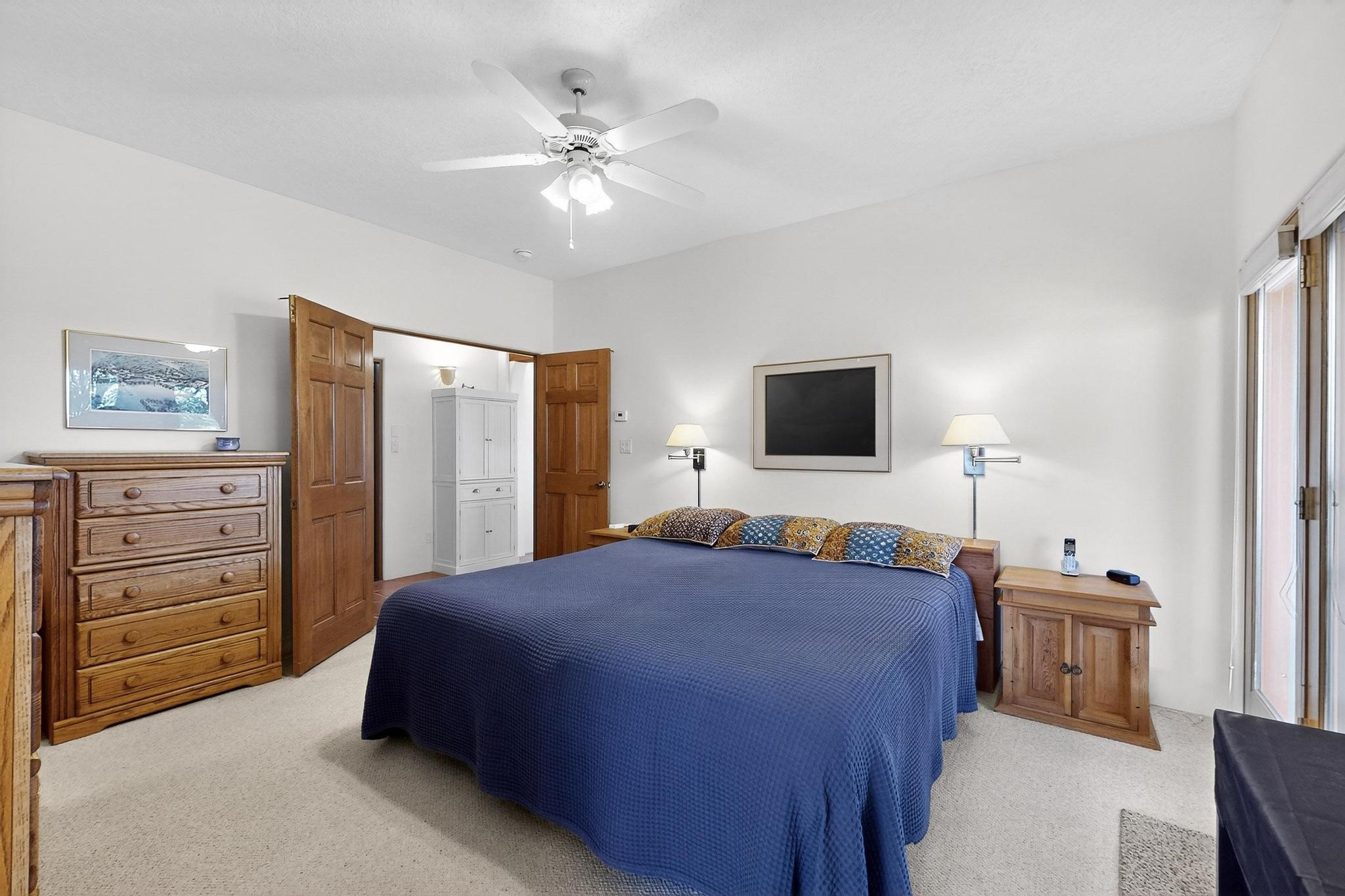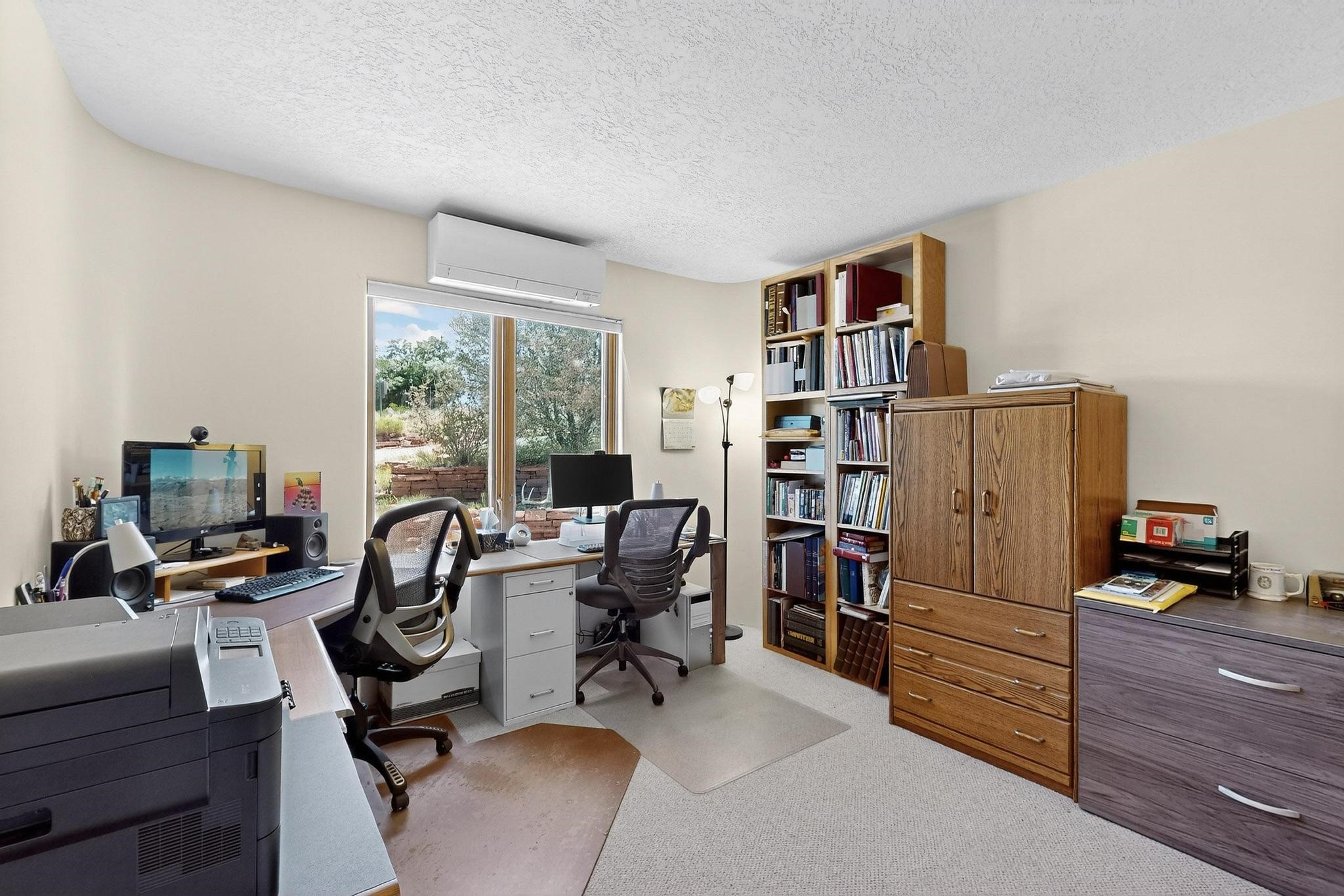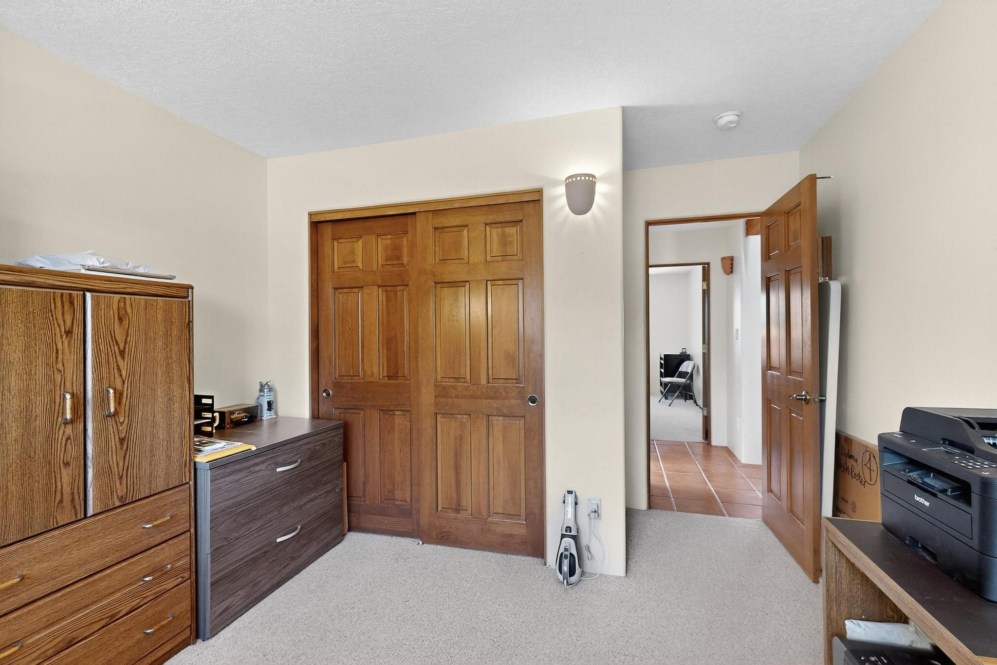 Superb sunset views from the dining area, living room and portal are one of the special treats offered at this lovely home built with a romantic flair by Homes by Marie. Curved corners, high viga ceilings, a central kiva fireplace, double glass in the baths and lots of Santa Fe trimmings create a light and ambient home. Excellent separation between the main and guest bedrooms, and an open plan design makes for easy living spaces. Natural gas radiant heat plus 4 mini splits creates summer and winter comfort plus a cheery Revillusion electric log fireplace insert adds heat and ambience. The refreshed kitchen includes an induction range and granite counter tops. There is a gas hook up behind the range if preferred. An extra heated area between the house and garage was finished as a workout room/office/storage. Added next to the 2 car garage is a spacious finished 12ftx20ft workshop/studio for all those extra hobbies. There is a terraced walled garden and large fenced in area for the fur family, the septic tank was replaced in 2024. Centrally located on a quiet cul de sac this home has easy access to Eldorado Amenities, local shopping, library and schools, only minutes into Santa Fe