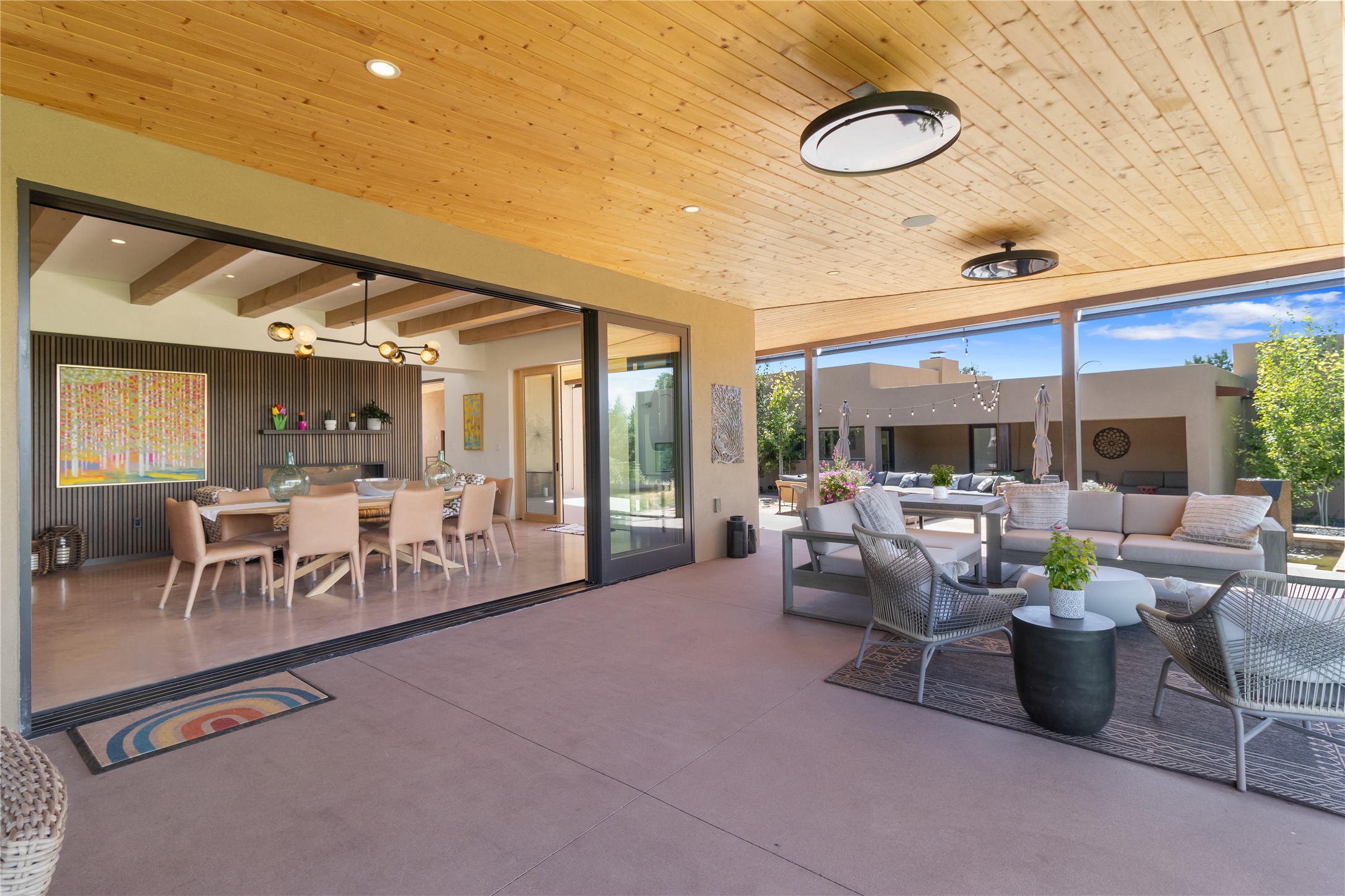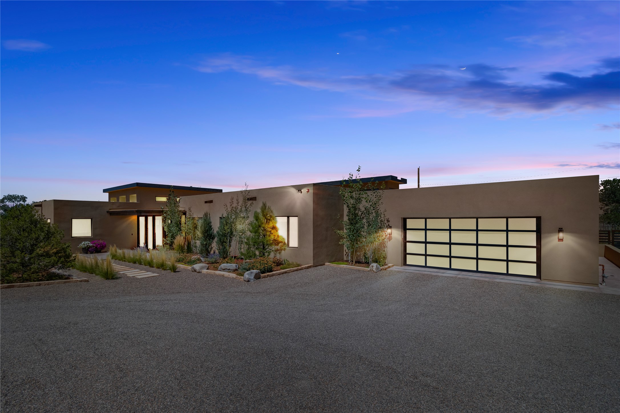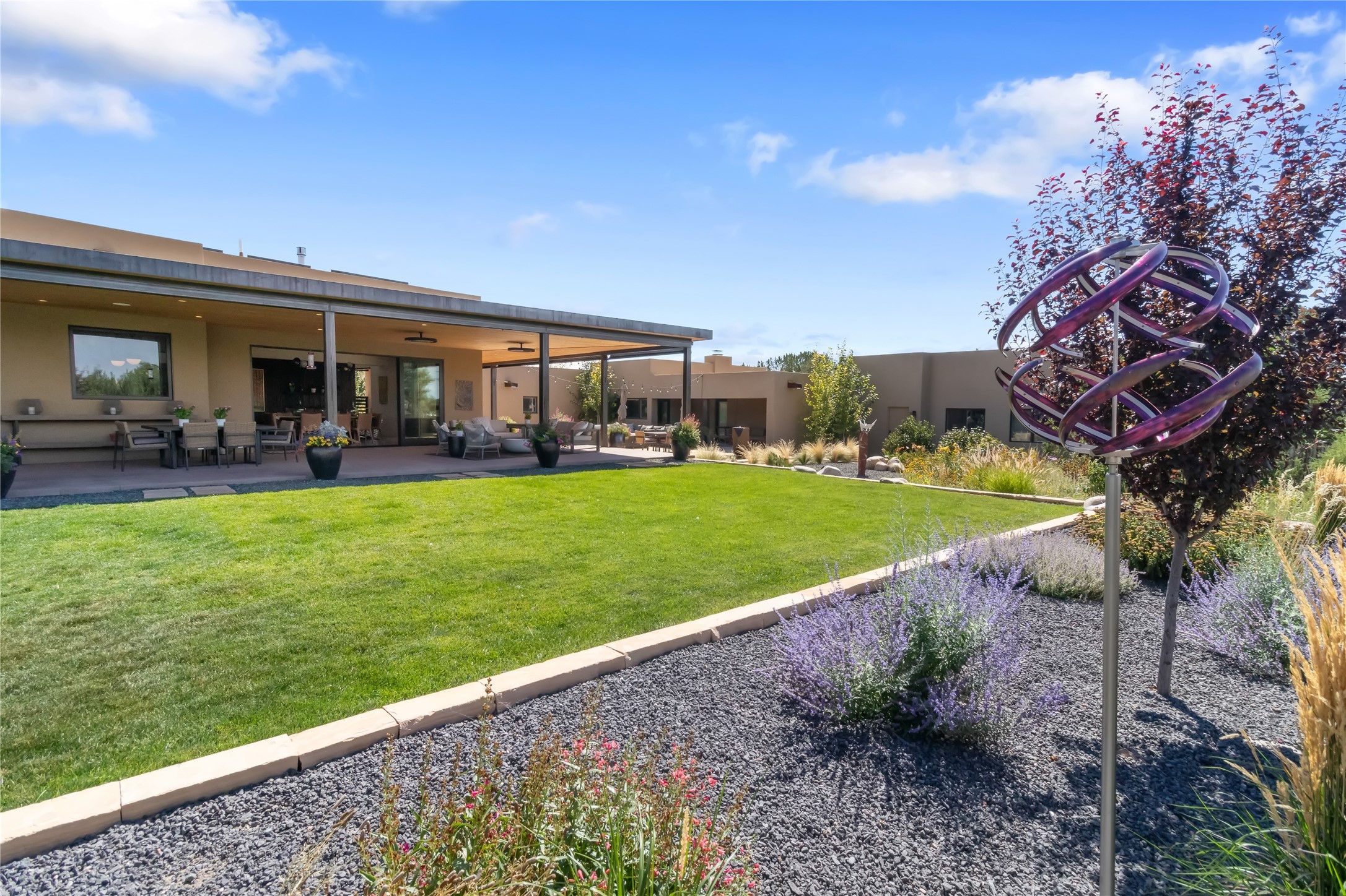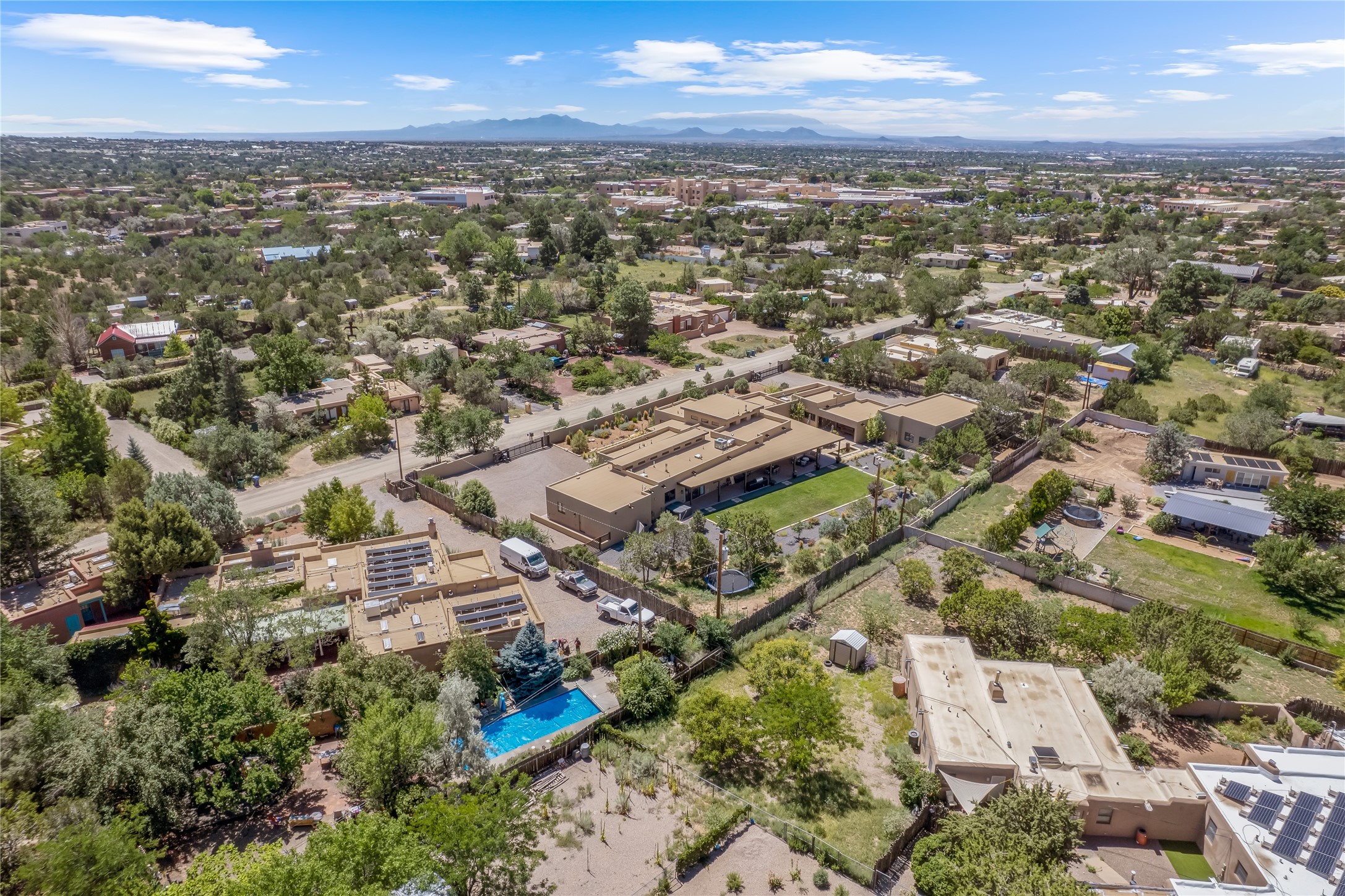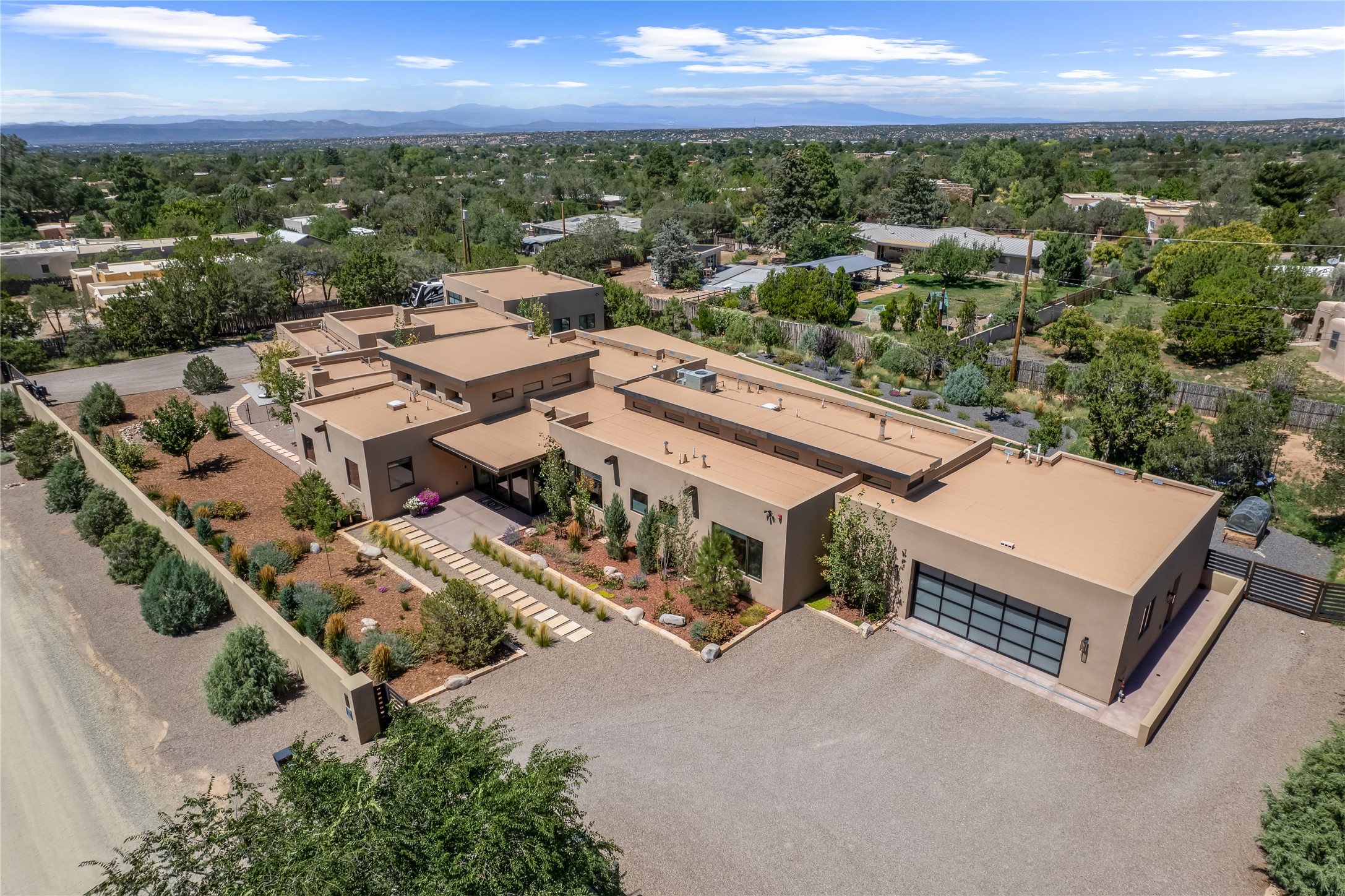 This exquisite 1-acre gated compound that's centrally located & just 2 miles from the historic Santa Fe Plaza features a masterfully designed main residence, spacious guest home, and 6 garage bays for collectors or creatives. The main home offers ~3,875 sq. ft. of refined living with Venetian plaster walls in public areas, custom cabinetry throughout, and 8-ft interior doors. The living and dining rooms feature an impressive dual aspect Ortal fireplace. Soaring ceilings and a wet bar with beverage drawers complete the living room, which opens to a ~1,700 sq. ft. covered patio. Multi-slide door systems open to this impressive patio, that includes built-in Bromic heaters and a 42 inch Wolf grill. The chef's kitchen is anchored by a Lacanche 7-burner stove, pot filler, Sub-Zero refrigerator and freezer, Wolf steam oven, Cove dishwasher and hot/cold tap. The butler's pantry has an abundance of storage, undermount lighting and Red/White EuroCave wine refrigerators. A serene primary suite includes a steam shower, soaking tub, room sized walk-in closet with island, and patio access. Smart touches include Sonos surround system, California Closets, electric patio shades, and a whole-house water filtration system. The guest house (~1,460 sq. ft.) offers generous privacy with a large living area, bedroom, and its own designer fireplace. An attached garage/storage wing (~1,853 sq. ft.) includes a standard 2-car bay plus an oversized 2+ bay garage with 10'x12' doors--ideal for small RVs, boats, or a home gym/studio. Both main and guest garages include EV hookup capabilities. Outdoors, enjoy lush landscaping by McCumber Fine Gardens, fruit trees, raised garden beds, a custom firepit and water feature, and ample space for entertaining--easily accommodating up to 100 guests. Additional highlights include steel electric gates, frosted glass garage doors, radiant heat in main home, and the most luxurious laundry/craft room you will find. This gated retreat is a one-of-a-kind compound.