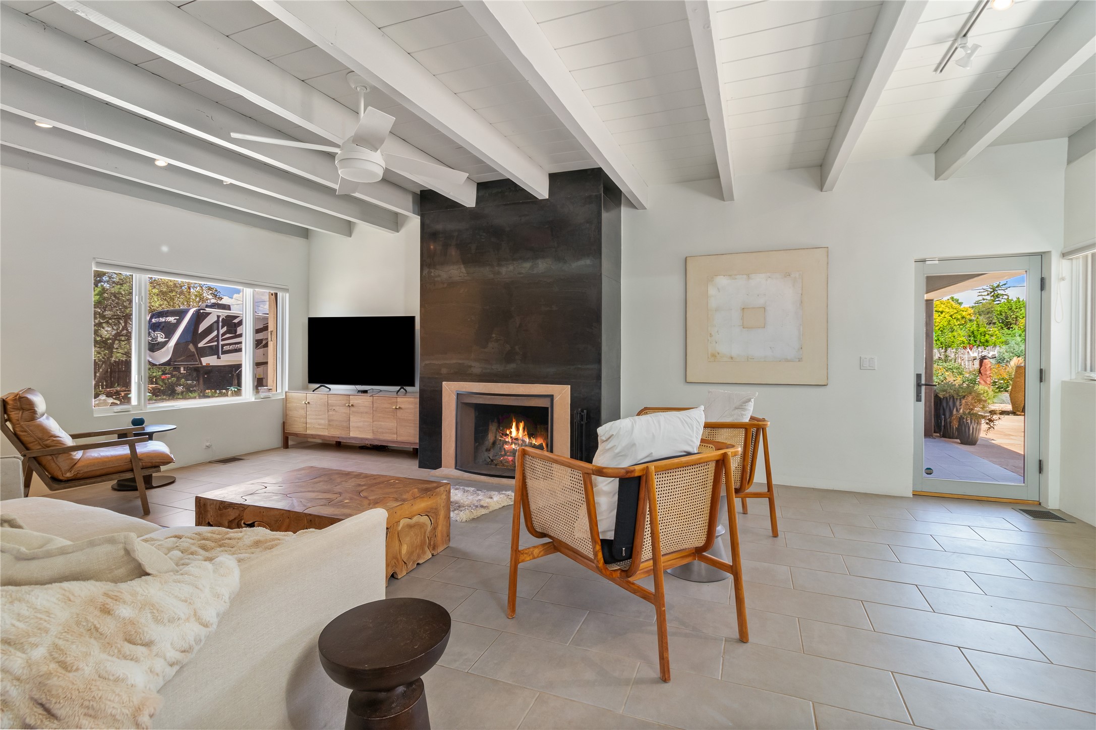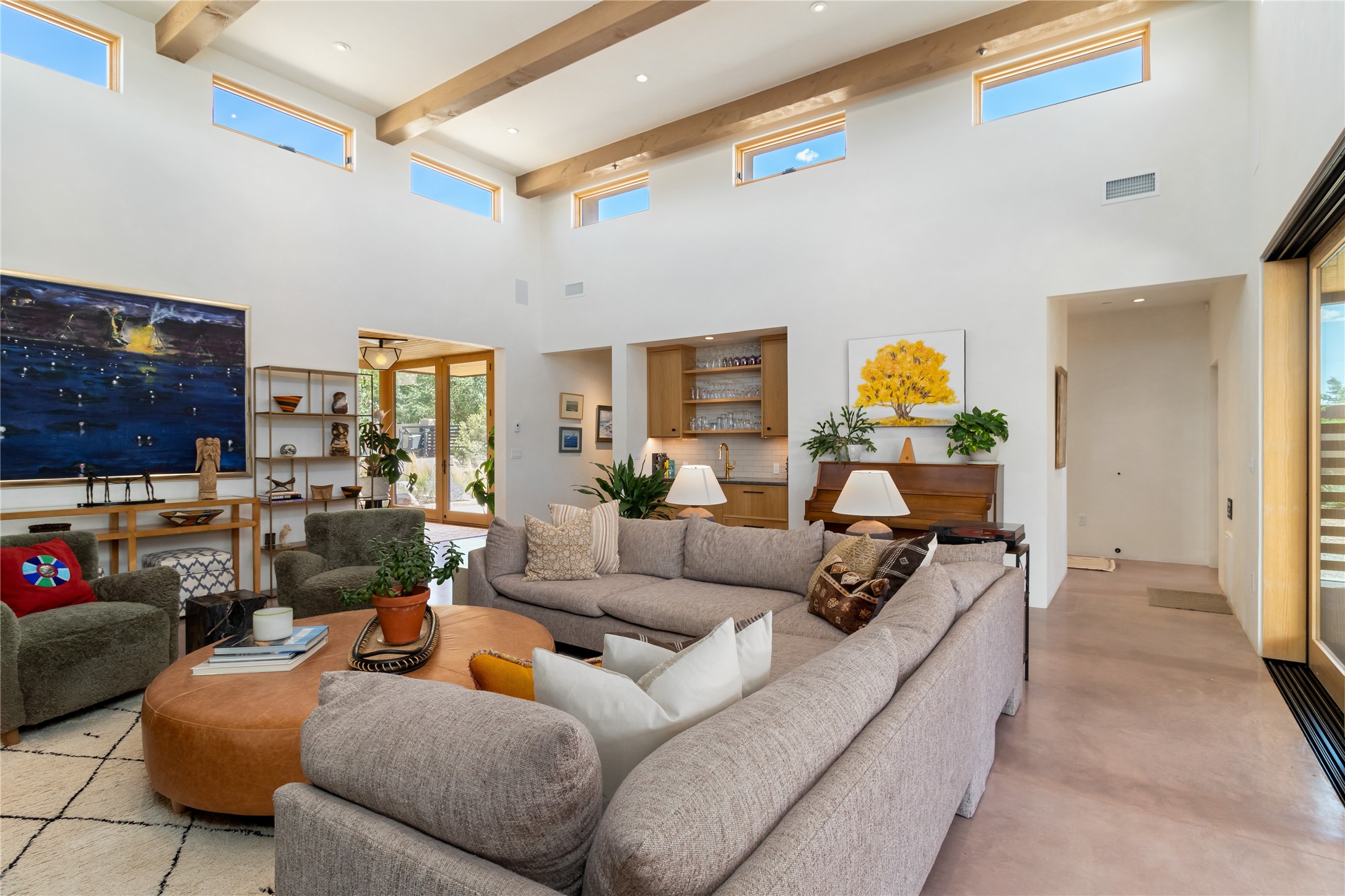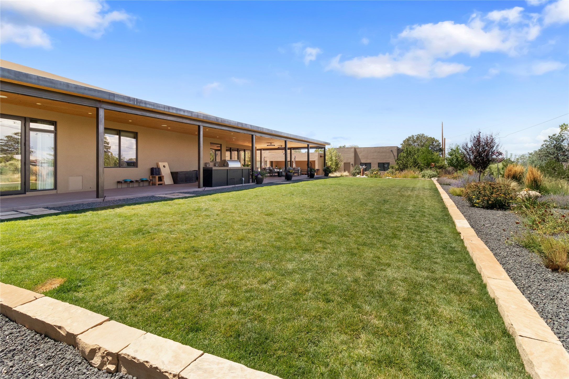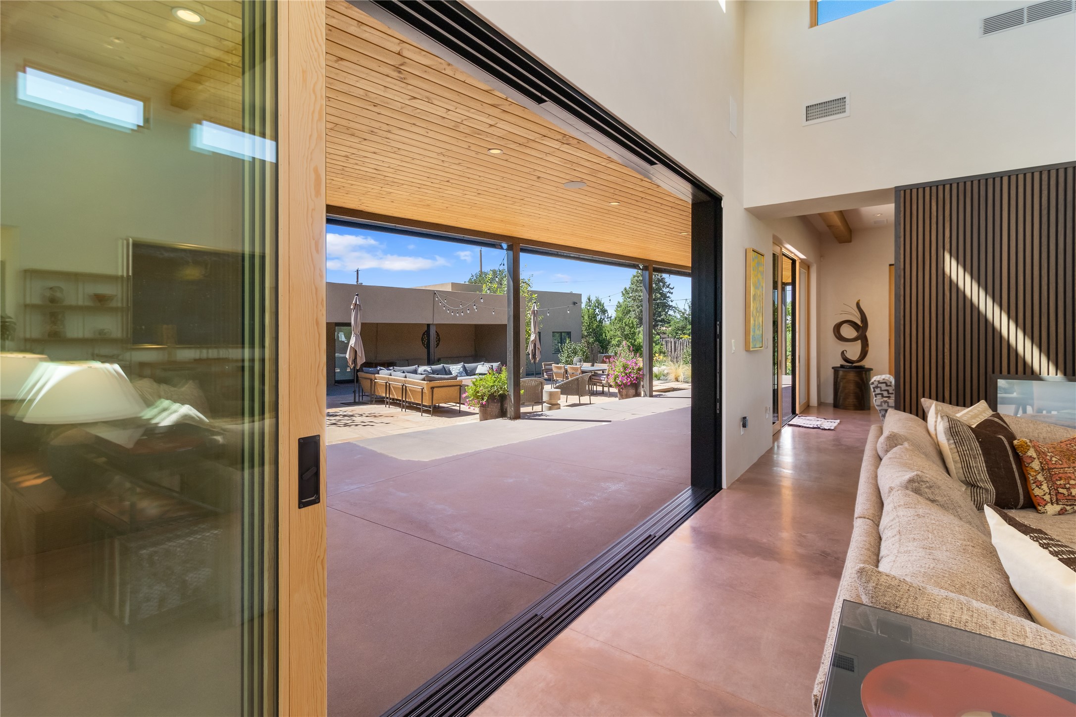 This exquisite 1-acre gated compound that's centrally located & just 2 miles from the historic Santa Fe Plaza features a masterfully designed main residence, spacious guest home, and 6 garage bays for collectors or creatives. The main home offers ~3,875 sq. ft. of refined living with Venetian plaster walls in public areas, custom cabinetry throughout, and 8-ft interior doors. The living and dining rooms feature an impressive dual aspect Ortal fireplace. Soaring ceilings and a wet bar with beverage drawers complete the living room, which opens to a ~1,700 sq. ft. covered patio. Multi-slide door systems open to this impressive patio, that includes built-in Bromic heaters and a 42 inch Wolf grill. The chef's kitchen is anchored by a Lacanche 7-burner stove, pot filler, Sub-Zero refrigerator and freezer, Wolf steam oven, Cove dishwasher and hot/cold tap. The butler's pantry has an abundance of storage, undermount lighting and Red/White EuroCave wine refrigerators. A serene primary suite includes a steam shower, soaking tub, room sized walk-in closet with island, and patio access. Smart touches include Sonos surround system, California Closets, electric patio shades, and a whole-house water filtration system. The guest house (~1,460 sq. ft.) offers generous privacy with a large living area, bedroom, and its own designer fireplace. An attached garage/storage wing (~1,853 sq. ft.) includes a standard 2-car bay plus an oversized 2+ bay garage with 10'x12' doors--ideal for small RVs, boats, or a home gym/studio. Both main and guest garages include EV hookup capabilities. Outdoors, enjoy lush landscaping by McCumber Fine Gardens, fruit trees, raised garden beds, a custom firepit and water feature, and ample space for entertaining--easily accommodating up to 100 guests. Additional highlights include steel electric gates, frosted glass garage doors, radiant heat in main home, and the most luxurious laundry/craft room you will find. This gated retreat is a one-of-a-kind compound.
