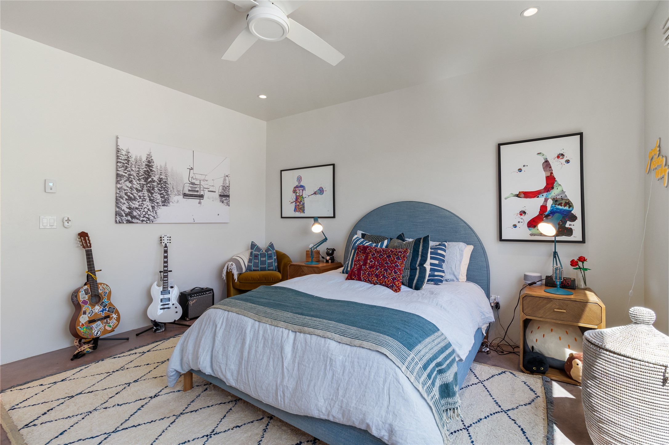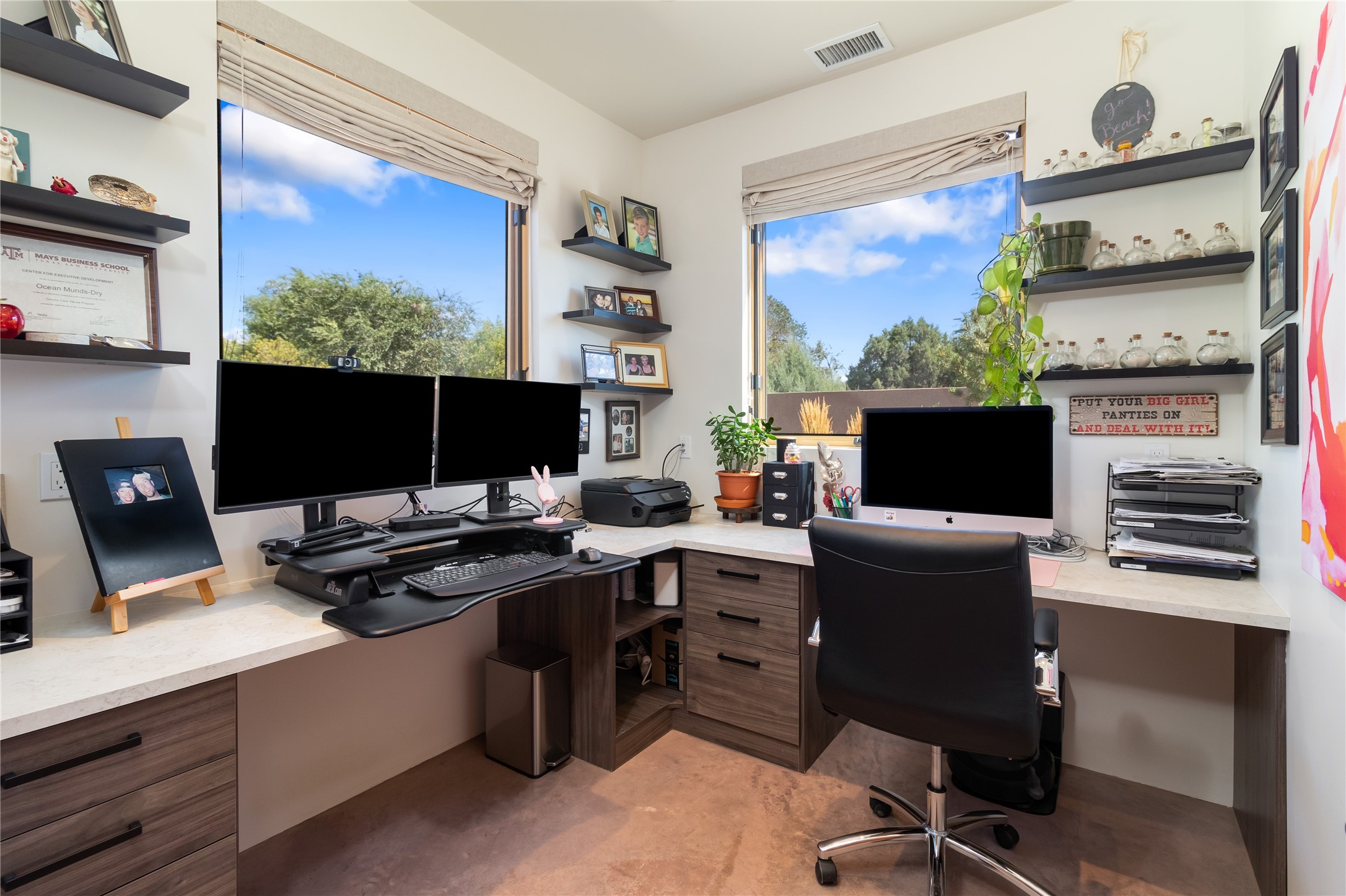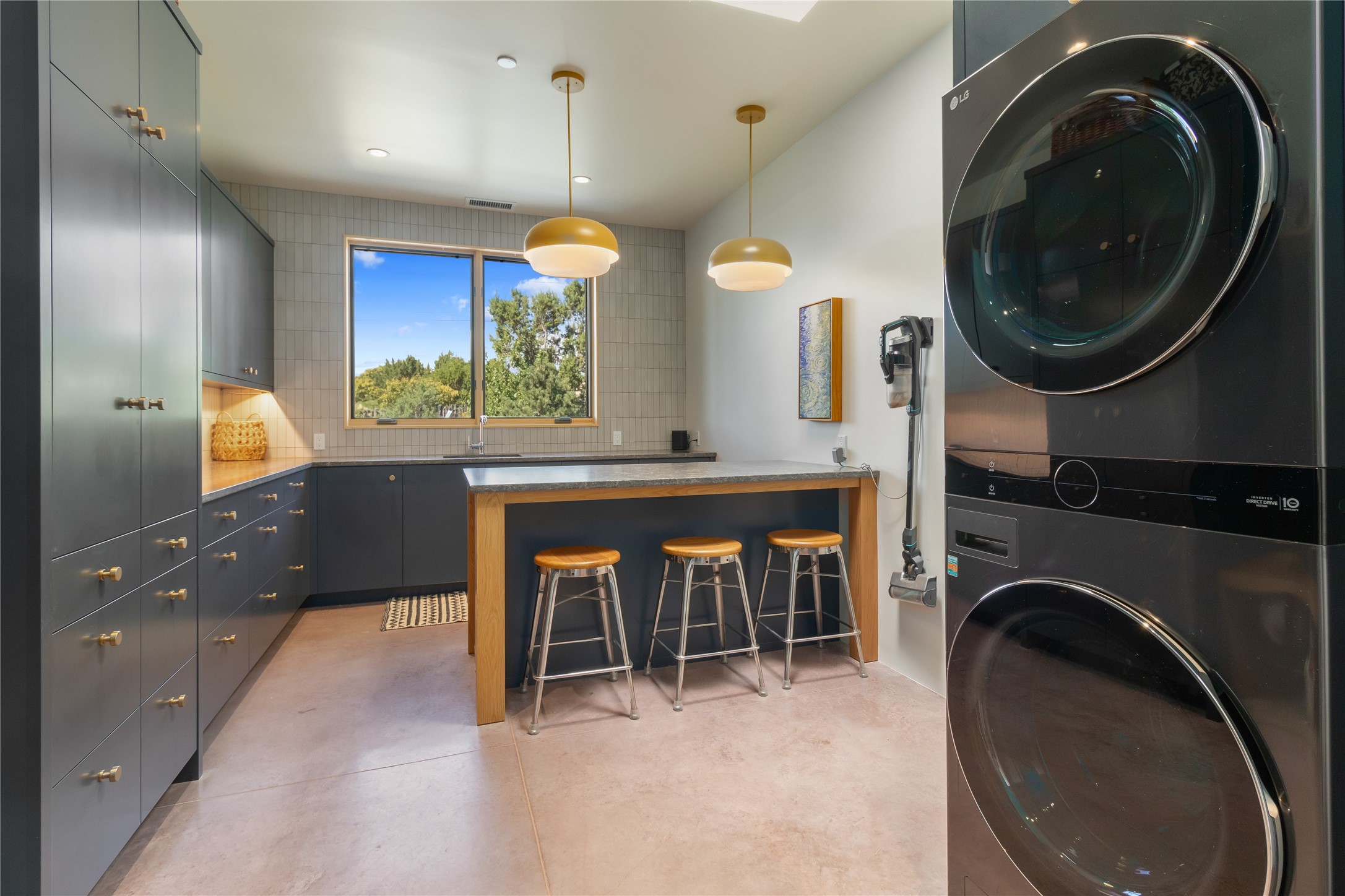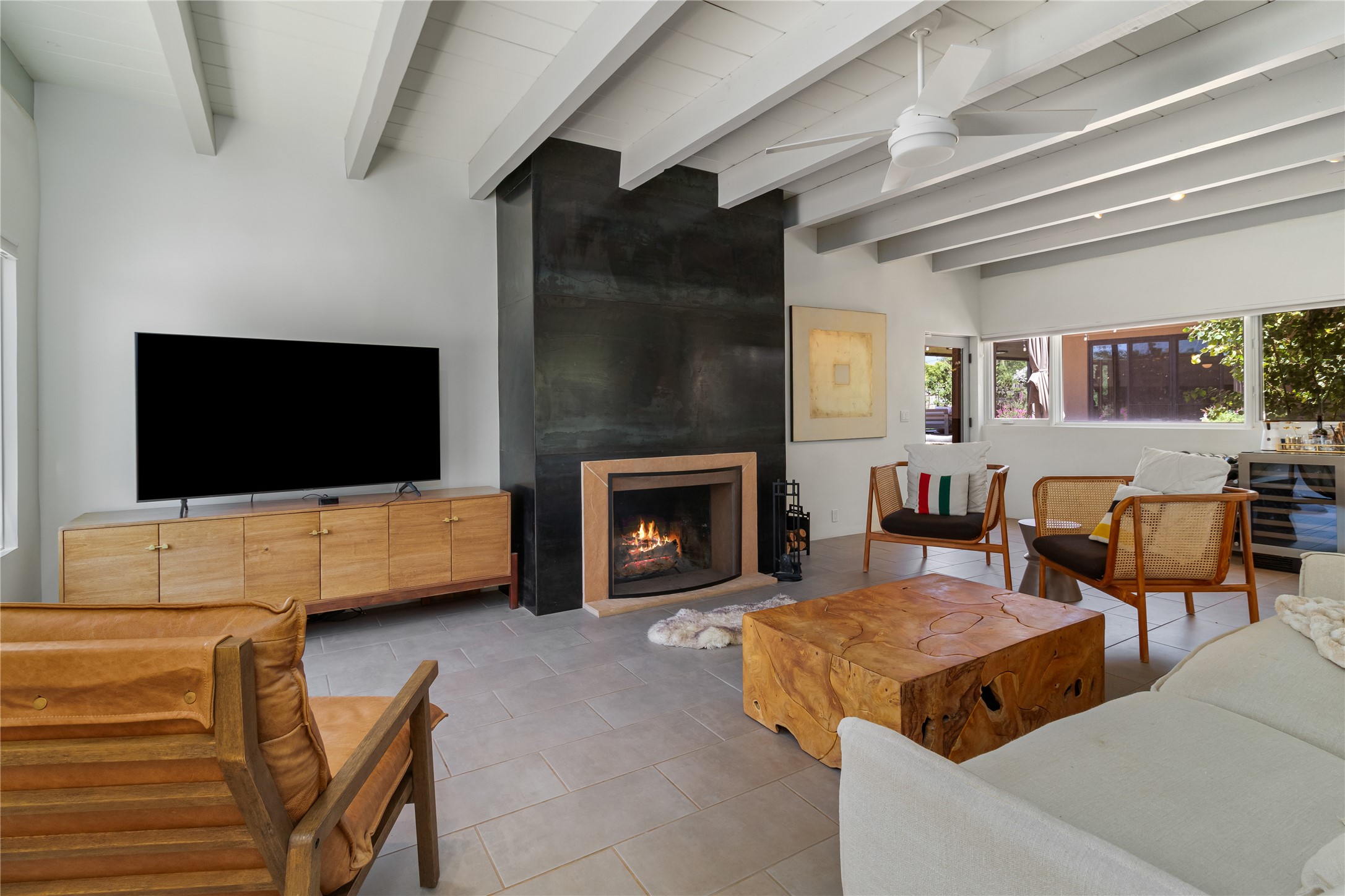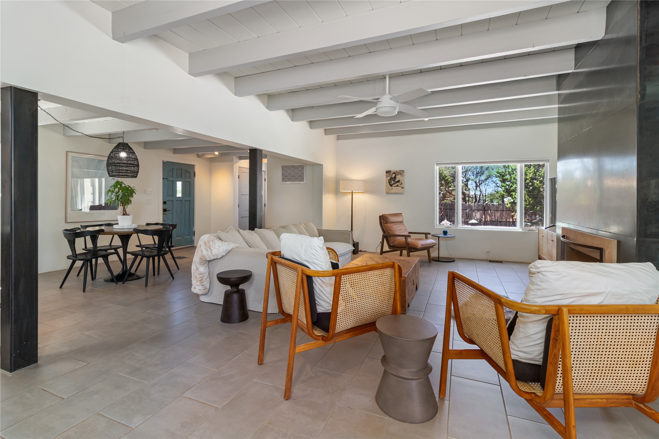 This exquisite 1-acre gated compound that's centrally located & just 2 miles from the historic Santa Fe Plaza features a masterfully designed main residence, spacious guest home, and 6 garage bays for collectors or creatives. The main home offers ~3,875 sq. ft. of refined living with Venetian plaster walls in public areas, custom cabinetry throughout, and 8-ft interior doors. The living and dining rooms feature an impressive dual aspect Ortal fireplace. Soaring ceilings and a wet bar with beverage drawers complete the living room, which opens to a ~1,700 sq. ft. covered patio. Multi-slide door systems open to this impressive patio, that includes built-in Bromic heaters and a 42 inch Wolf grill. The chef's kitchen is anchored by a Lacanche 7-burner stove, pot filler, Sub-Zero refrigerator and freezer, Wolf steam oven, Cove dishwasher and hot/cold tap. The butler's pantry has an abundance of storage, undermount lighting and Red/White EuroCave wine refrigerators. A serene primary suite includes a steam shower, soaking tub, room sized walk-in closet with island, and patio access. Smart touches include Sonos surround system, California Closets, electric patio shades, and a whole-house water filtration system. The guest house (~1,460 sq. ft.) offers generous privacy with a large living area, bedroom, and its own designer fireplace. An attached garage/storage wing (~1,853 sq. ft.) includes a standard 2-car bay plus an oversized 2+ bay garage with 10'x12' doors--ideal for small RVs, boats, or a home gym/studio. Both main and guest garages include EV hookup capabilities. Outdoors, enjoy lush landscaping by McCumber Fine Gardens, fruit trees, raised garden beds, a custom firepit and water feature, and ample space for entertaining--easily accommodating up to 100 guests. Additional highlights include steel electric gates, frosted glass garage doors, radiant heat in main home, and the most luxurious laundry/craft room you will find. This gated retreat is a one-of-a-kind compound.