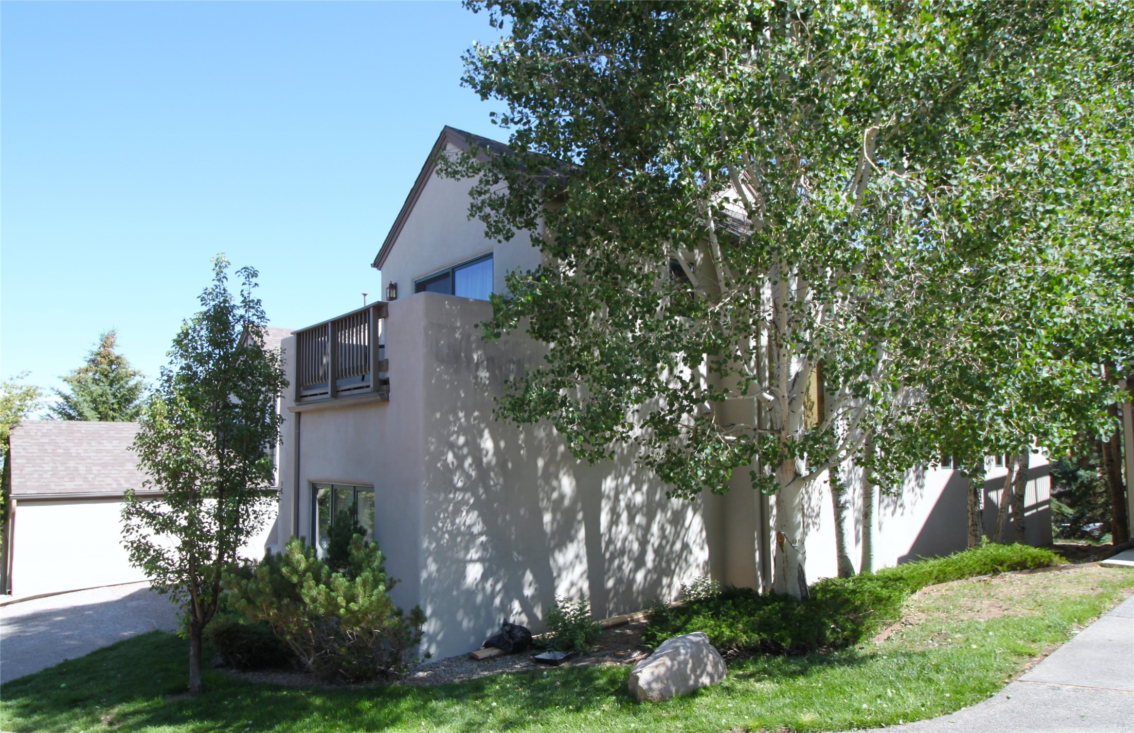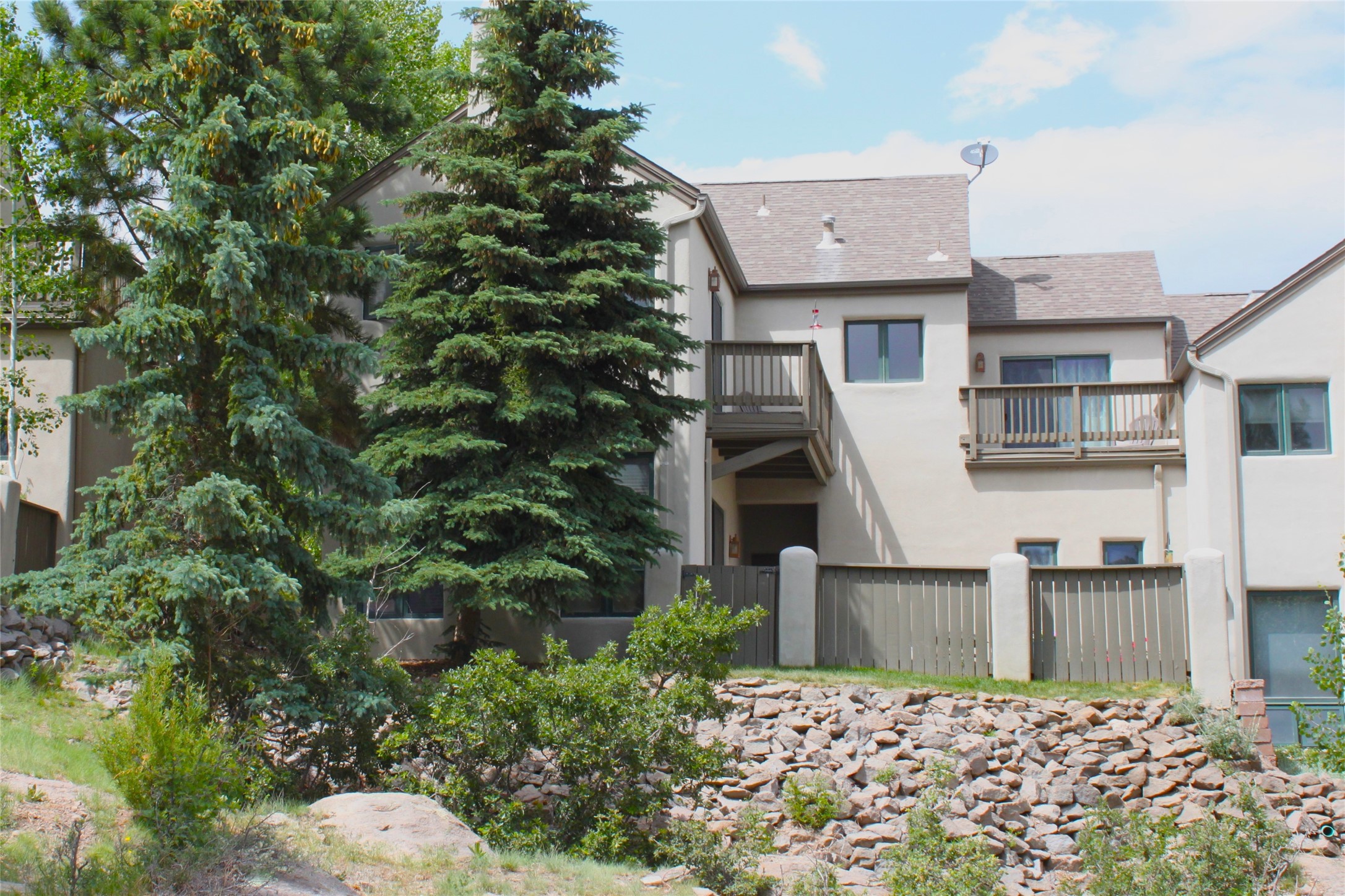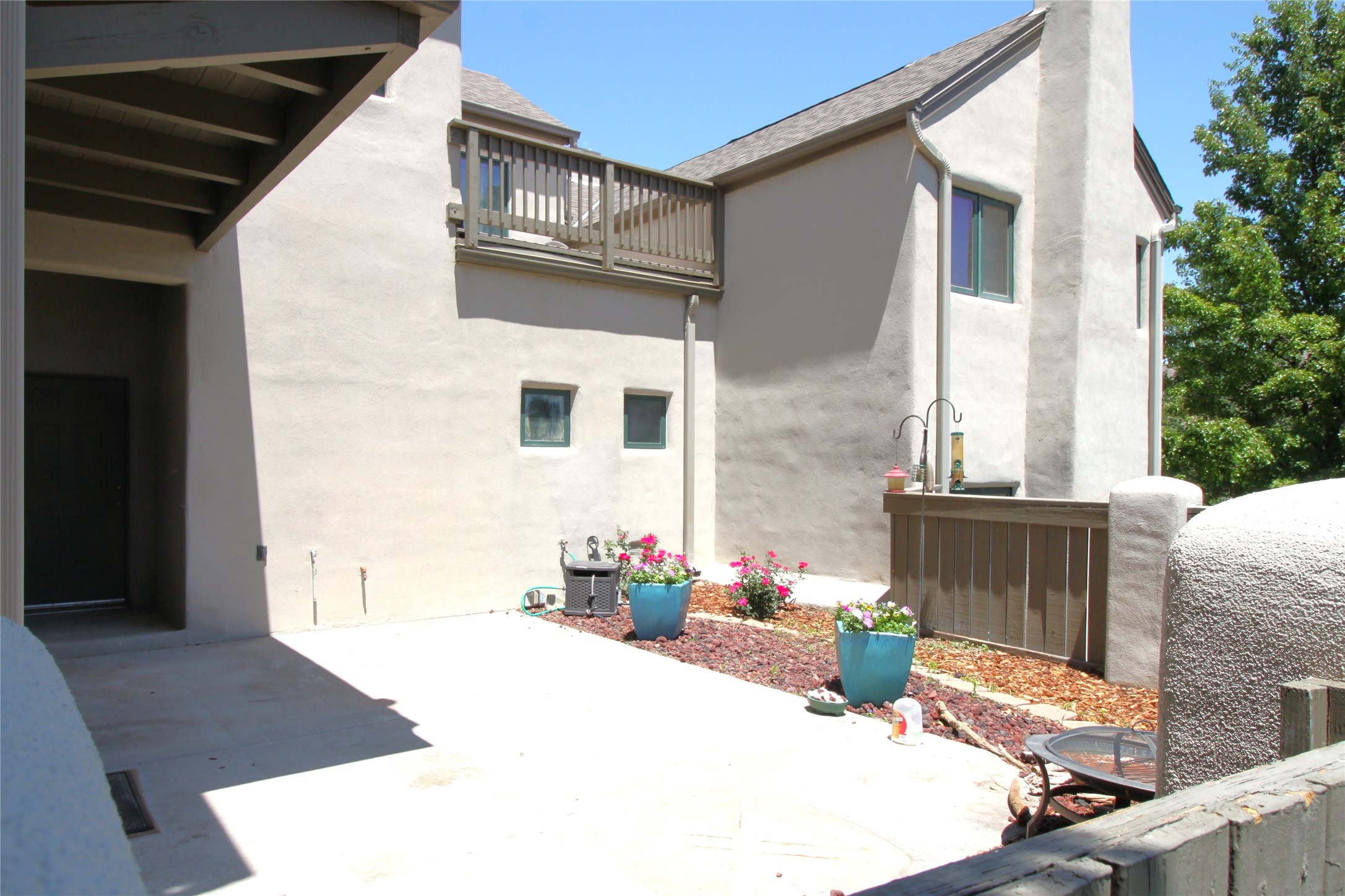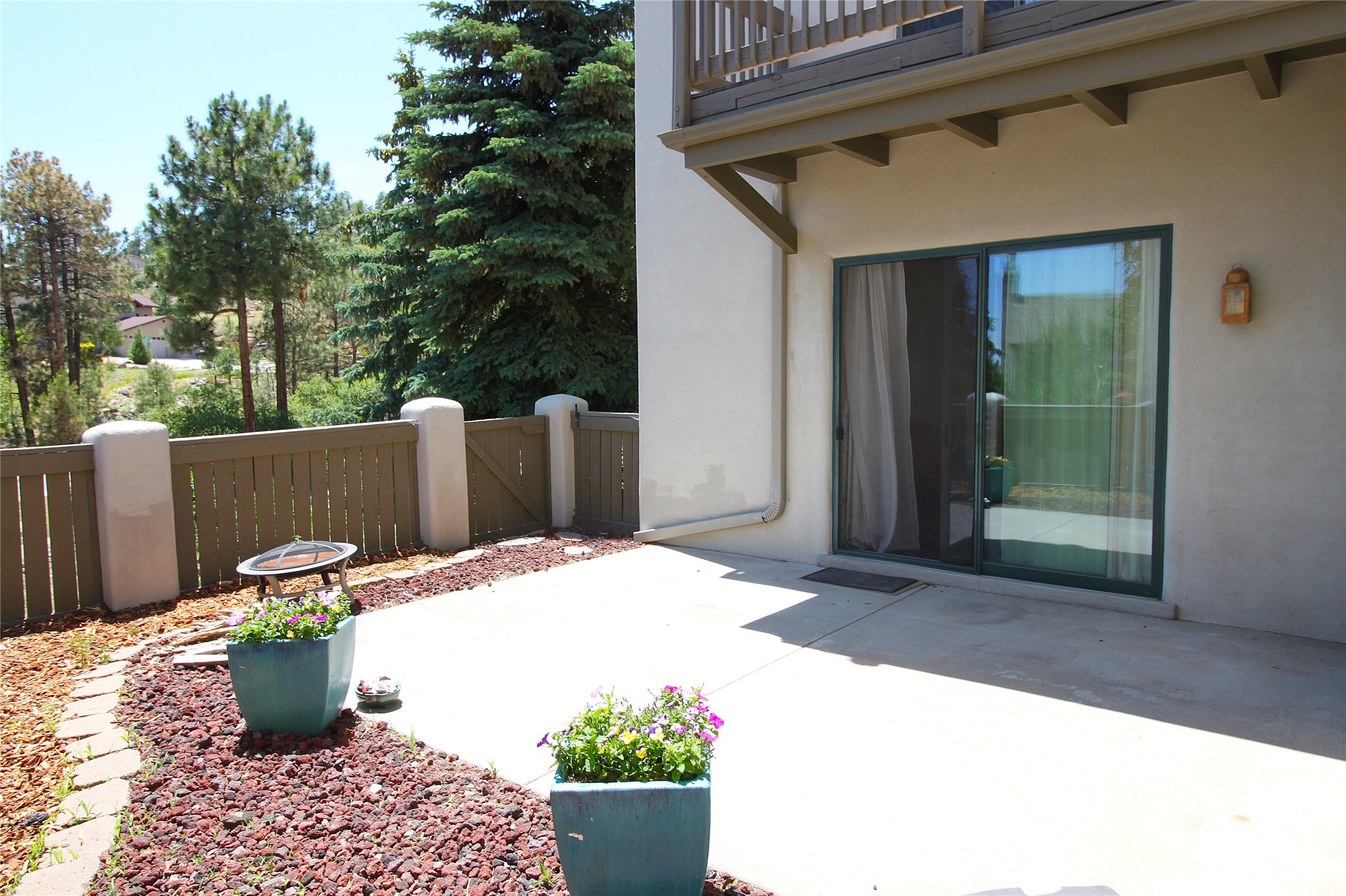 Beautiful and spacious end-unit townhome in the highly desirable Quemazon community. This light-filled 4-bedroom, 2.5 bath home offers sweeping views from every balcony. The open-concept living and dining area features 10-foot ceilings, slate tile floors, and a raised flagstone wood/gas fireplace that adds warmth and character. Large sliding glass doors open to a private, fenced courtyard that seamlessly extends the living space to the outdoors, perfect for relaxing, BBQ's and entertaining. Out the back porch gate is a #4 free city bus stop for easy access to the lab or town. The kitchen is both functional and stylish, complete with a gas stovetop, double ovens, a second sink at the wet bar, ample cabinetry, and a generous breakfast bar for casual dining. At the front of the home, a cozy sitting room, with pocket-doors for privacy, provides a versatile space, ideal as a home office/den, media or wine room, or library. A half bath and a coat closet with a large hidden finished storage area add convenience to the main level. Upstairs, you'll find beautiful hardwood floors. The serene owner's suite features a private balcony, a walk-in closet, with adjustable organizers and a luxurious five-piece bath with double vanities, a jetted tub, walk-in shower, and a separate water closet. Three additional bedrooms, each with their own deck share a full guest bath with natural sky-lighting. Additional highlights include a bright stairwell with natural hardwood finishes and built-in window seating (with hidden storage), ceiling fans in the living room and all bedrooms, upstairs laundry, and a two-car garage. As an end unit, the home benefits from enhanced natural light, Aspen tree shading and added privacy. Roof replaced in 2017 and stucco repaired in 2025. Located near hiking/biking trails and open space, this exceptional townhome offers comfort, quality, and convenience, all in one of Los Alamos's most sought-after neighborhoods.