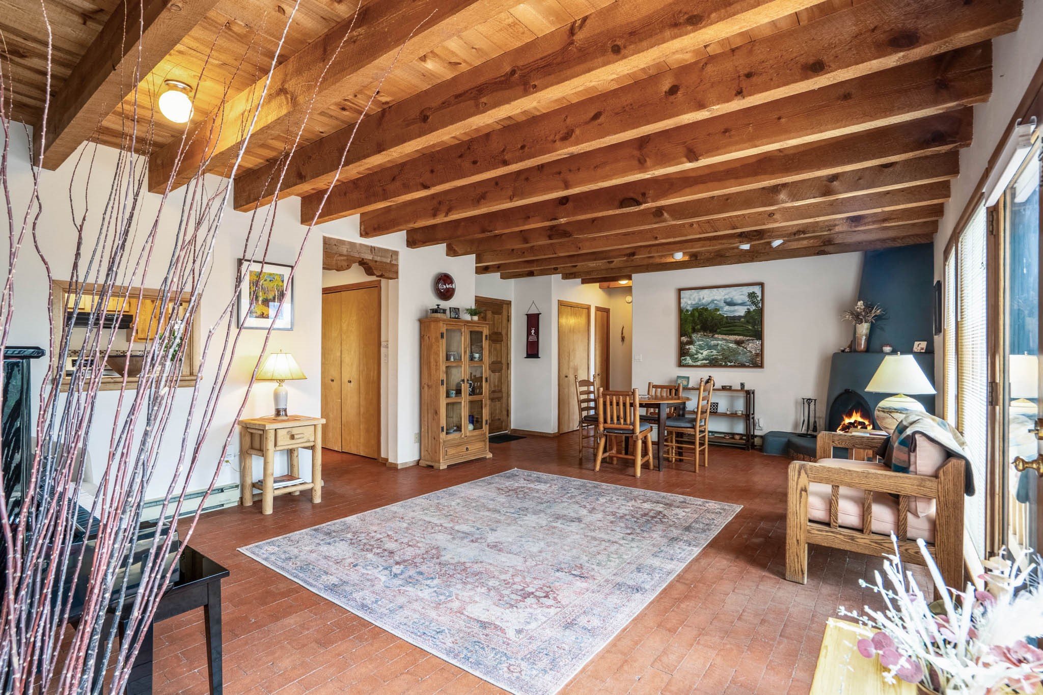 Eldorado Living : A Serene RetreatBuilt with care by respected builder Russ McMillan, this residence seamlessly blends modern comfort with classic appeal. Experience the warmth and inherent charm of distinctive brick floors throughout, viga ceilings, and a cozy Kiva fireplace. Designed with sustainability in mind and perched on a tree covered corner lot, it offers both a sense of secluded privacy and a charming presence that invites you in. Abundant pinon and juniper trees offer sanctuary for the many native birds that call NM home. Featuring 2 Bedrooms and 2 baths. it's more than just a house; it's a character-filled haven waiting for you.