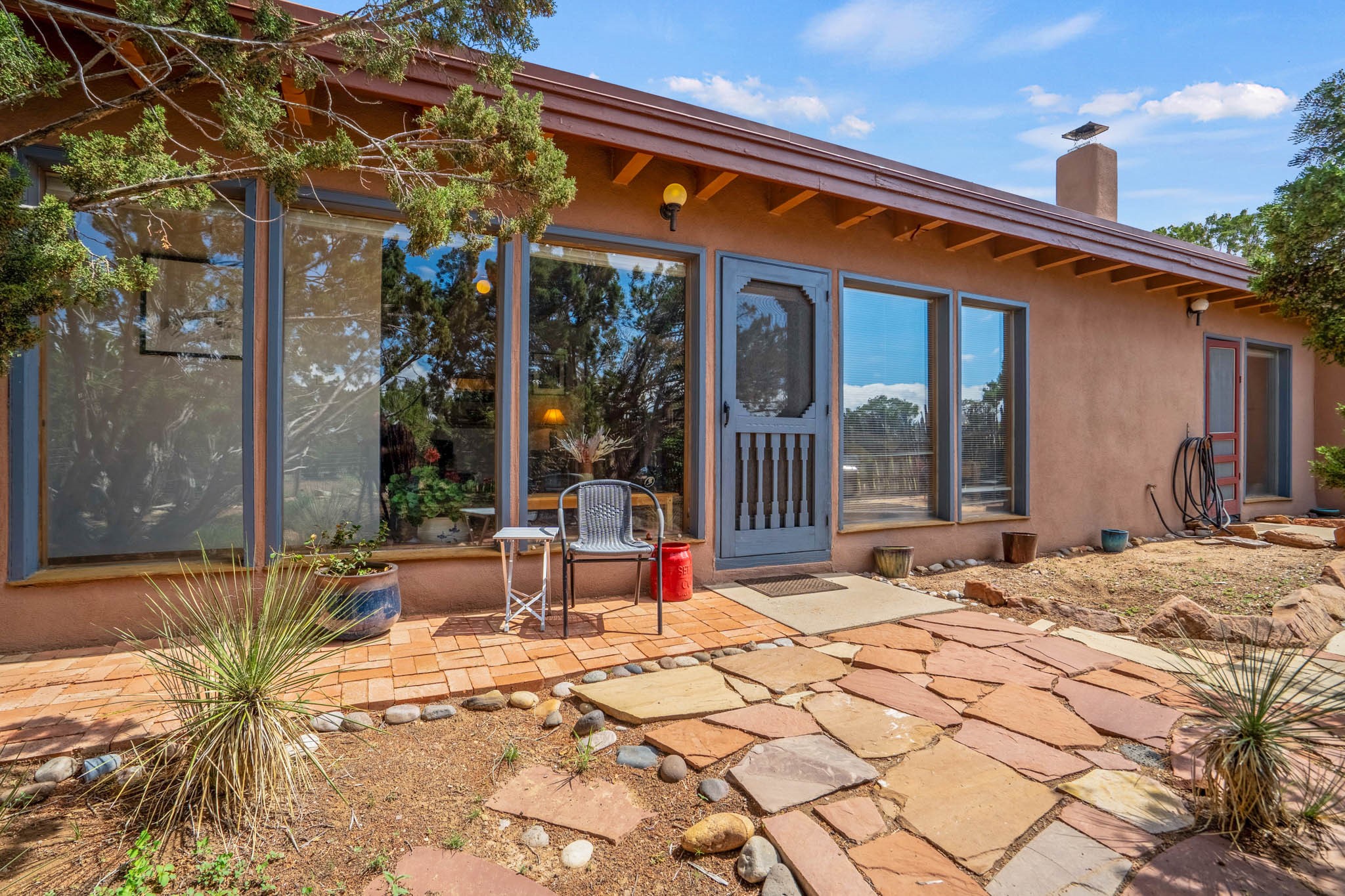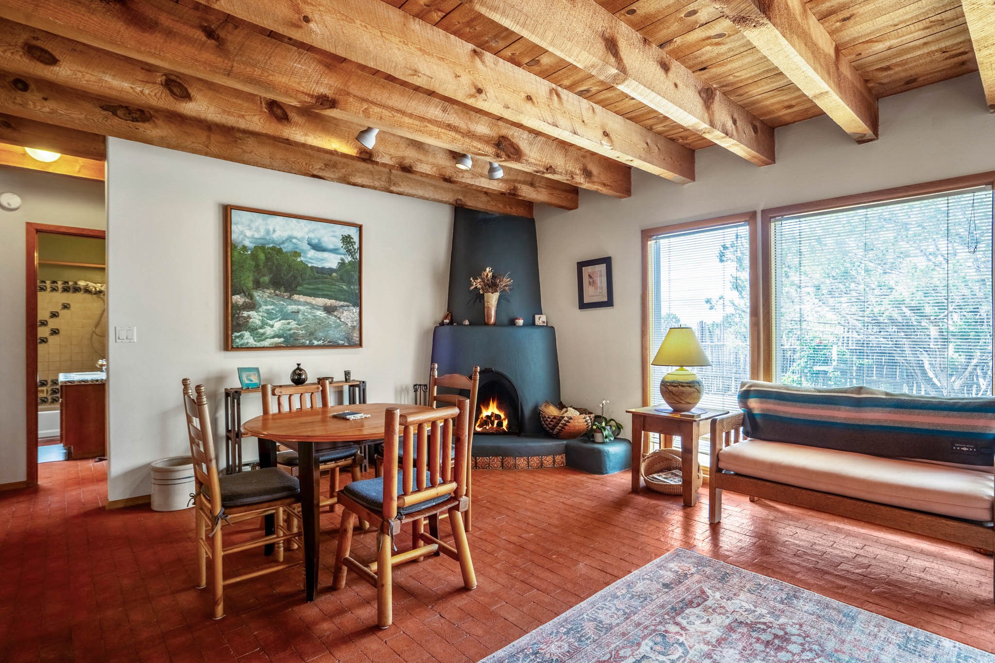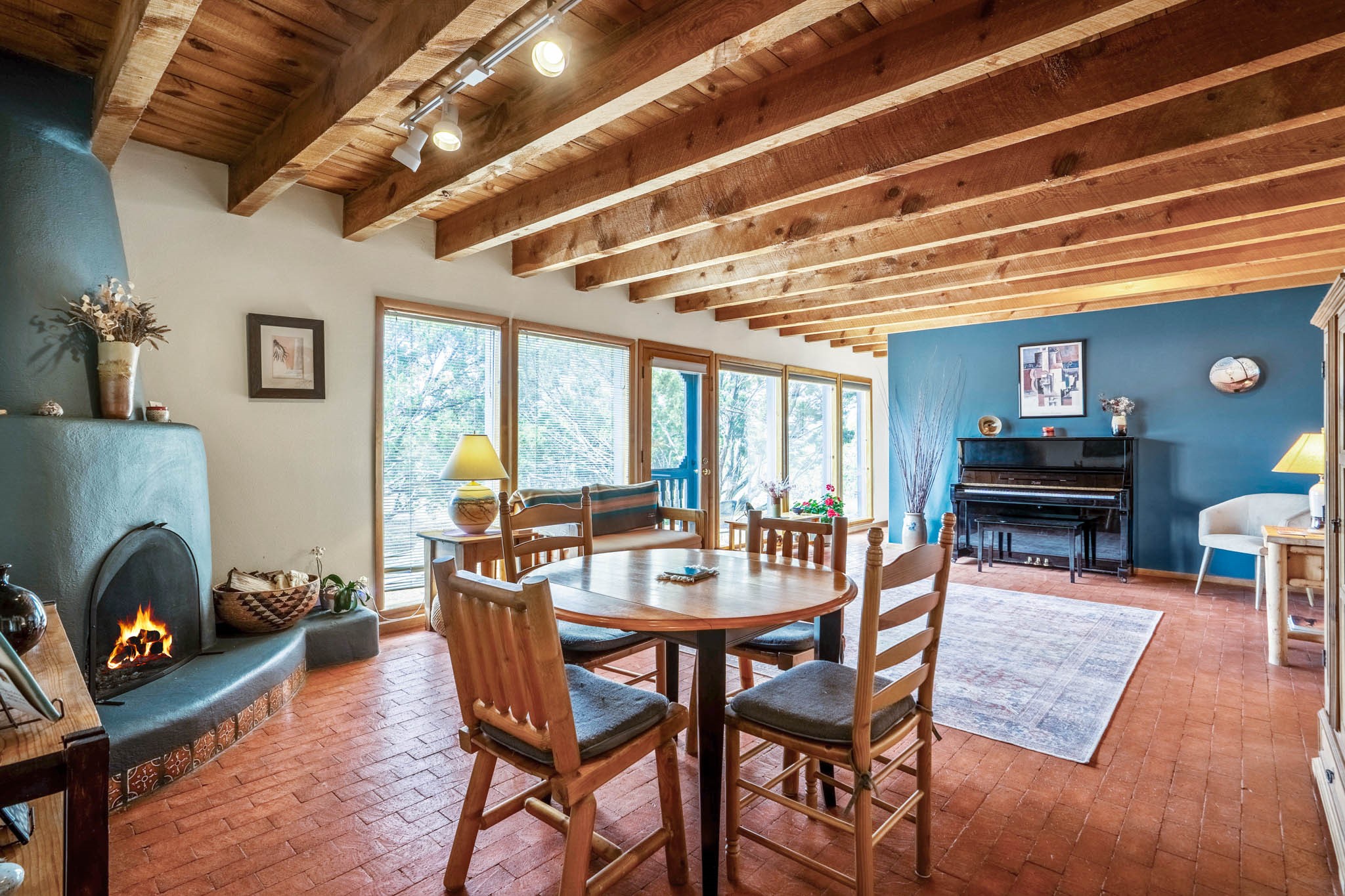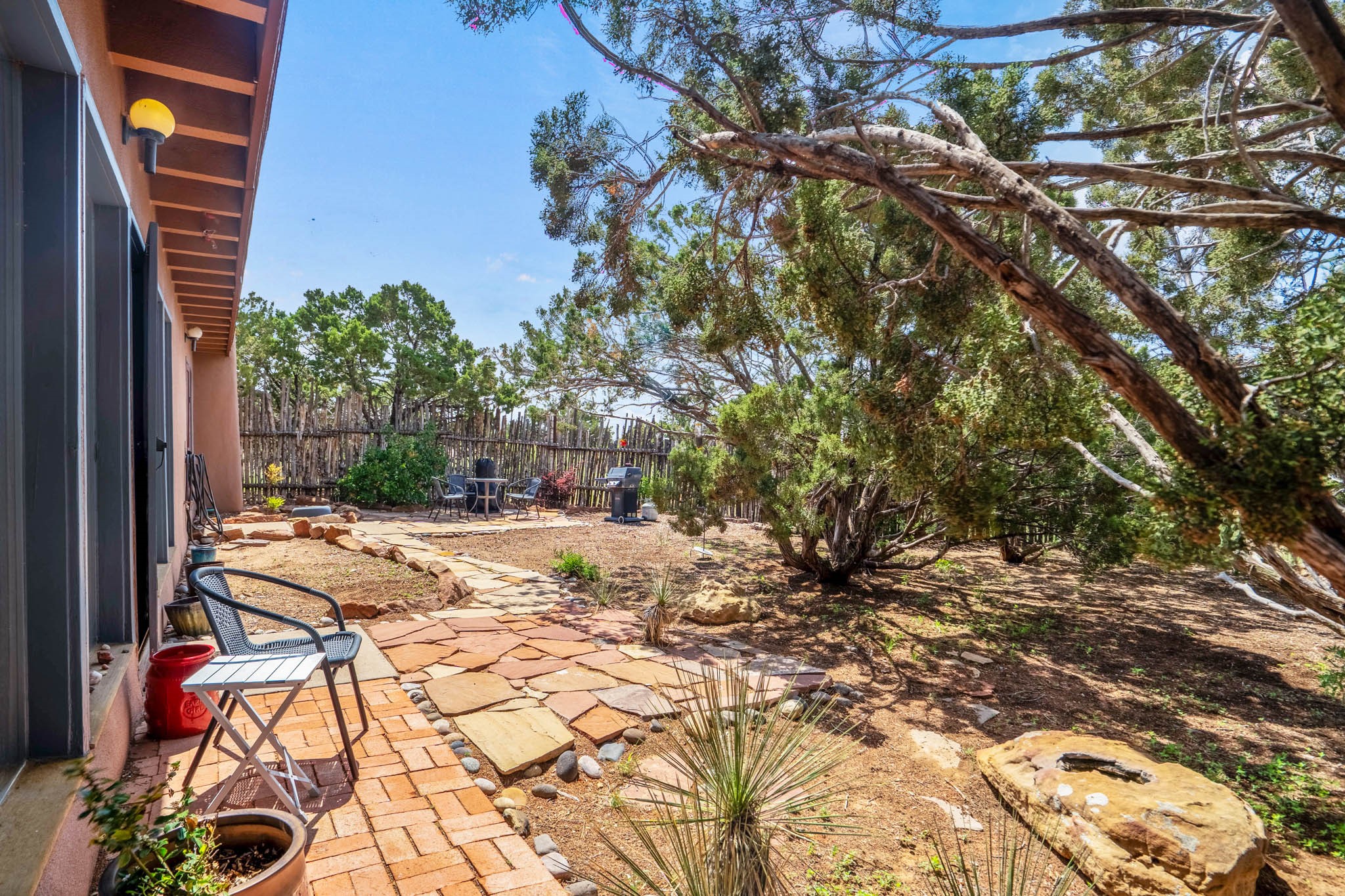Eldorado Living : A Serene RetreatBuilt with care by respected builder Russ McMillan, this residence seamlessly blends modern comfort with classic appeal. Experience the warmth and inherent charm of distinctive brick floors throughout, viga ceilings, and a cozy Kiva fireplace. Designed with sustainability in mind and perched on a tree covered corner lot, it offers both a sense of secluded privacy and a charming presence that invites you in. Abundant pinon and juniper trees offer sanctuary for the many native birds that call NM home. Featuring 2 Bedrooms and 2 baths. it's more than just a house; it's a character-filled haven waiting for you.