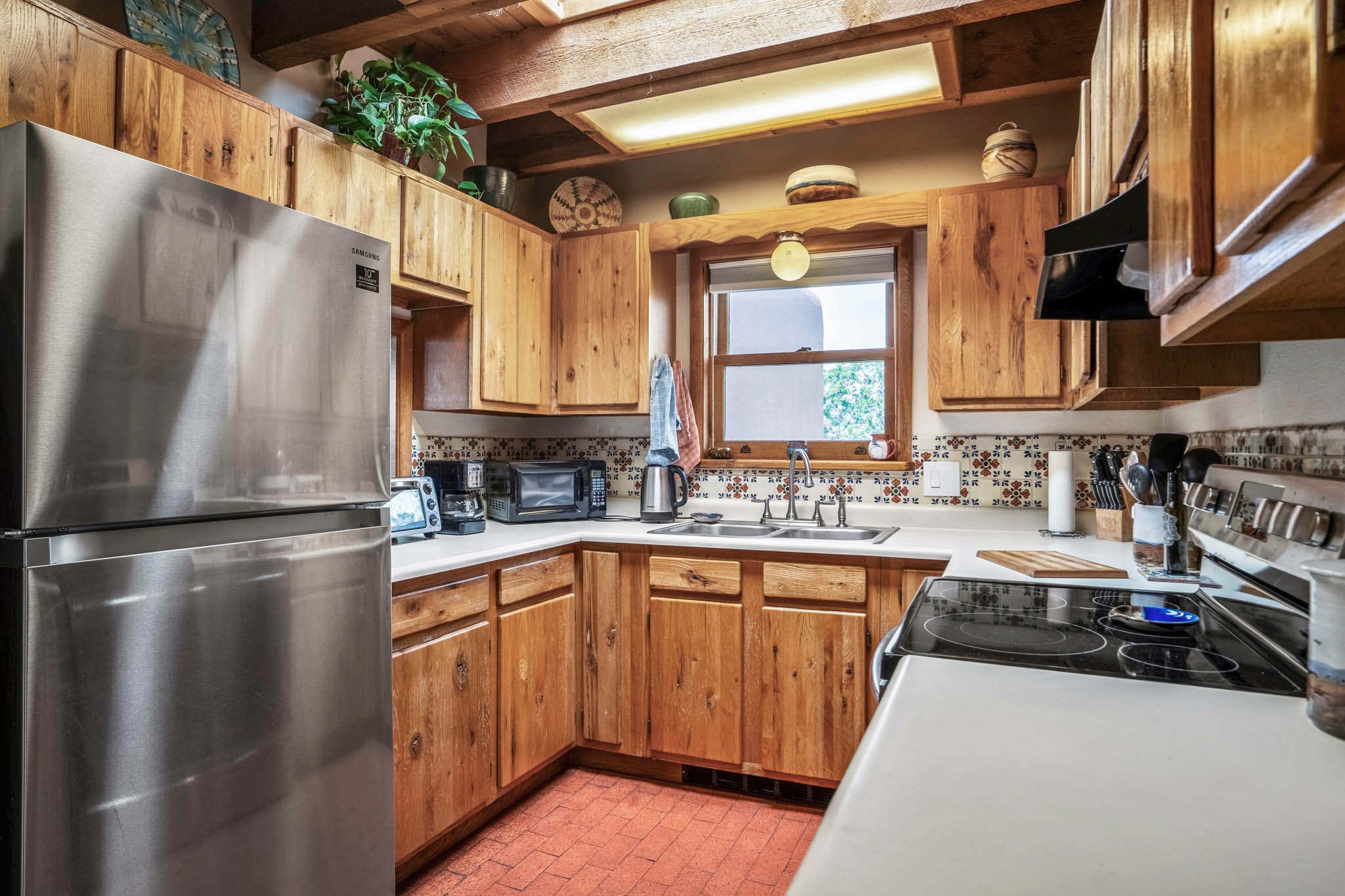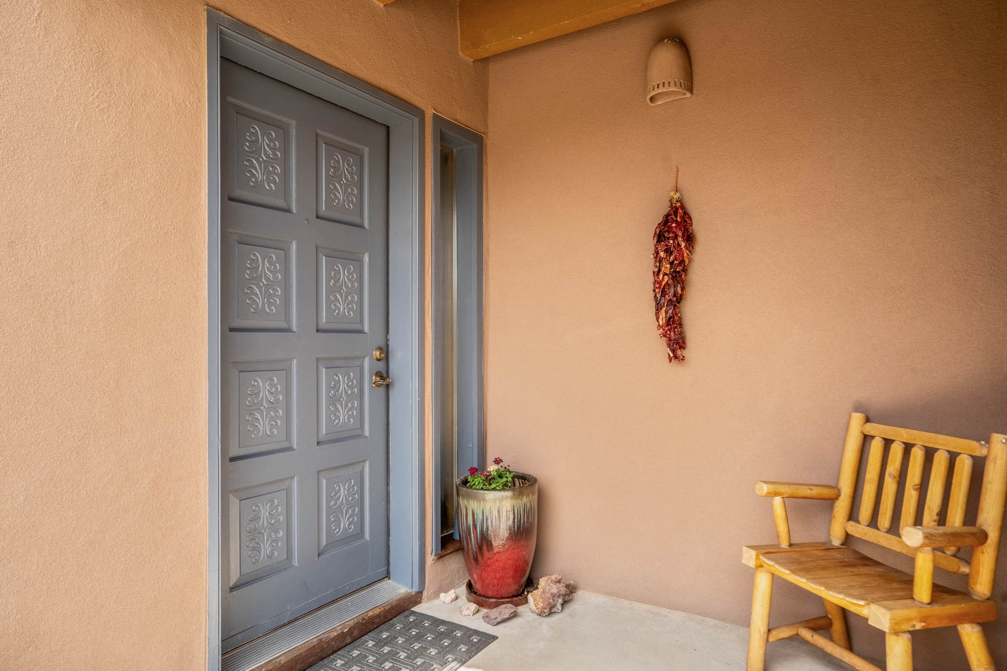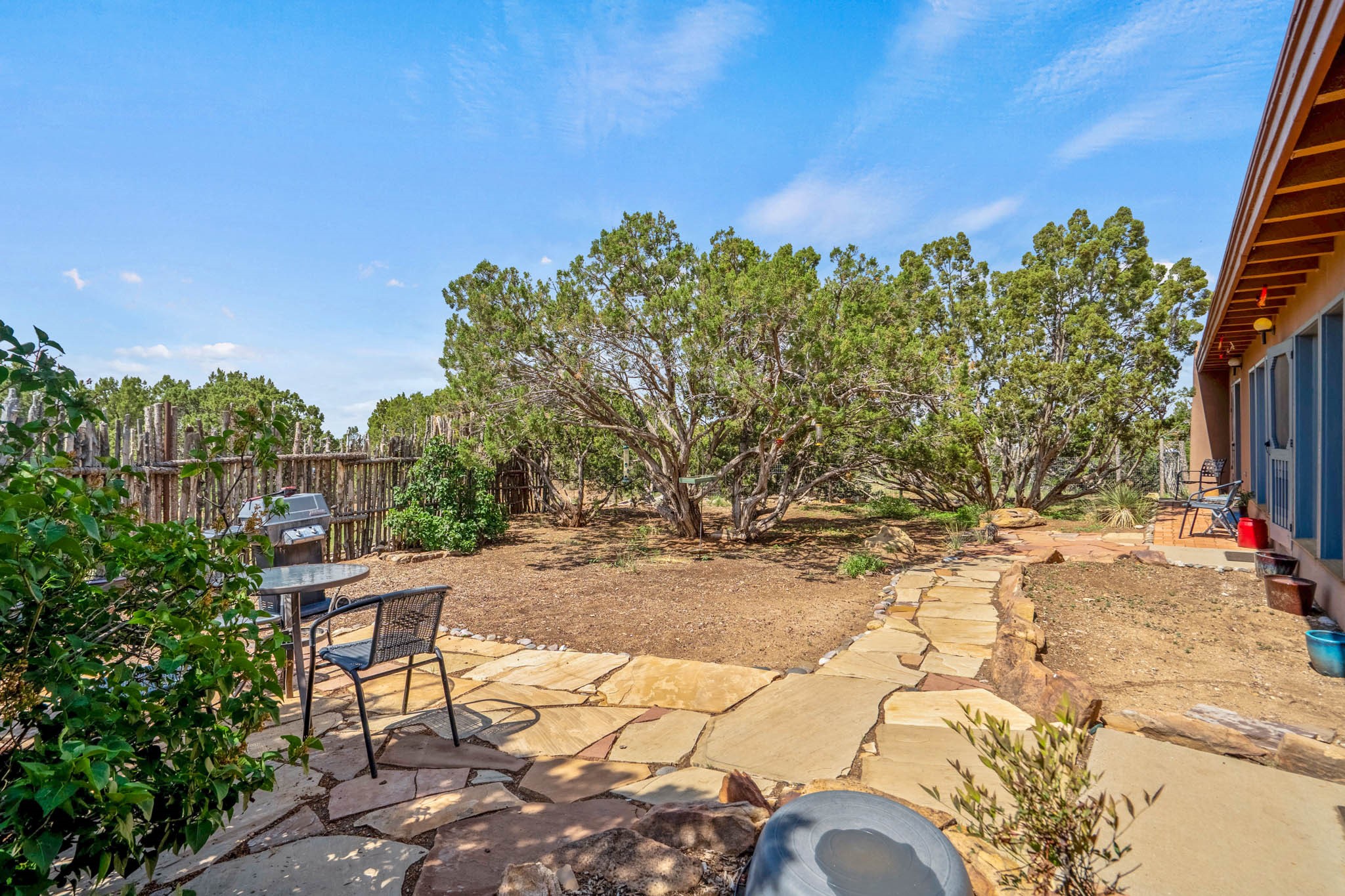 Eldorado Living : A Serene RetreatBuilt with care by respected builder Russ McMillan, this residence seamlessly blends modern comfort with classic appeal. Experience the warmth and inherent charm of distinctive brick floors throughout, viga ceilings, and a cozy Kiva fireplace. Designed with sustainability in mind and perched on a tree covered corner lot, it offers both a sense of secluded privacy and a charming presence that invites you in. Abundant pinon and juniper trees offer sanctuary for the many native birds that call NM home. Featuring 2 Bedrooms and 2 baths. it's more than just a house; it's a character-filled haven waiting for you.