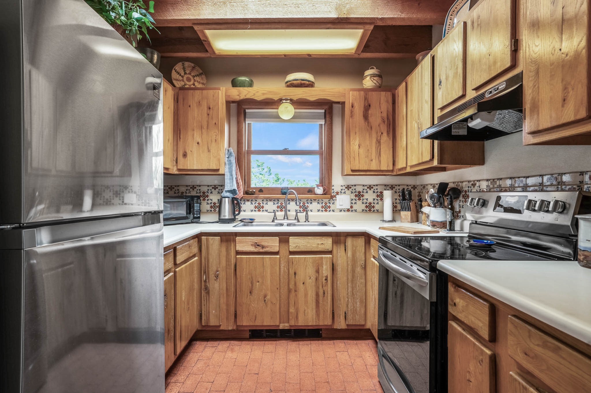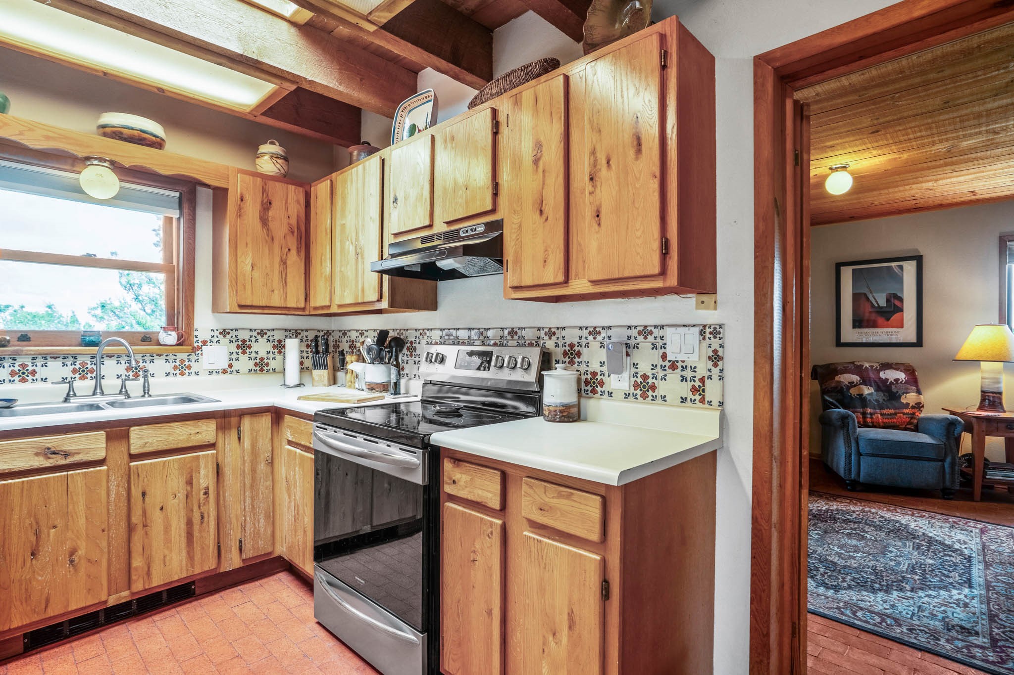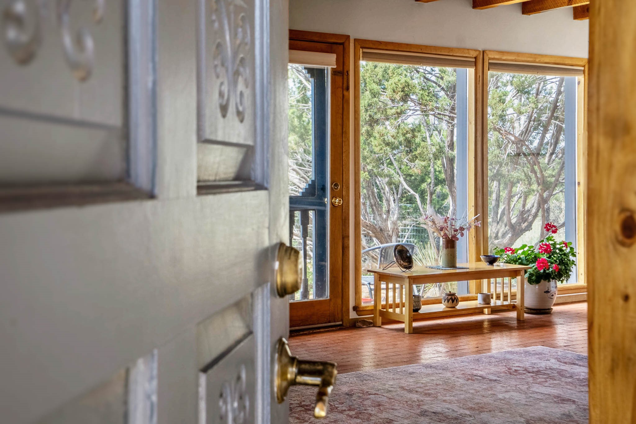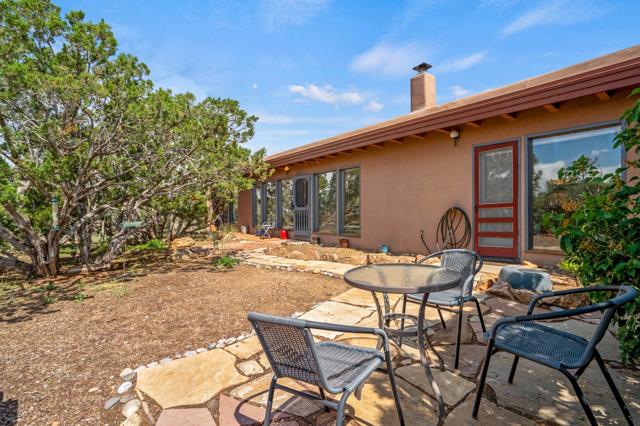 Eldorado Living : A Serene RetreatBuilt with care by respected builder Russ McMillan, this residence seamlessly blends modern comfort with classic appeal. Experience the warmth and inherent charm of distinctive brick floors throughout, viga ceilings, and a cozy Kiva fireplace. Designed with sustainability in mind and perched on a tree covered corner lot, it offers both a sense of secluded privacy and a charming presence that invites you in. Abundant pinon and juniper trees offer sanctuary for the many native birds that call NM home. Featuring 2 Bedrooms and 2 baths. it's more than just a house; it's a character-filled haven waiting for you.