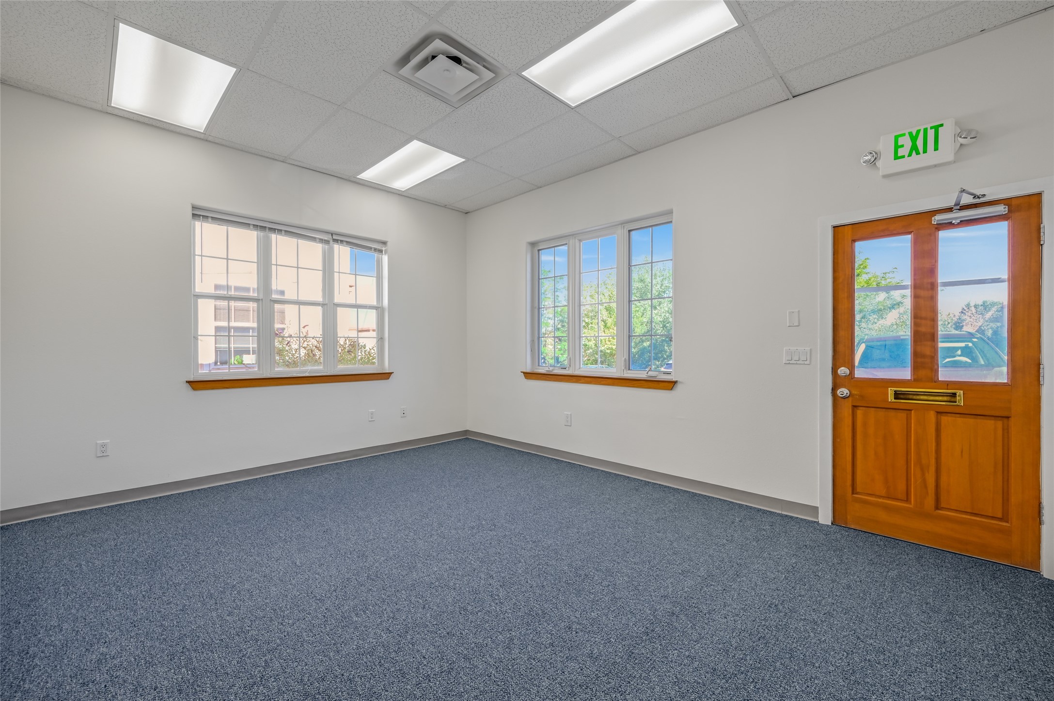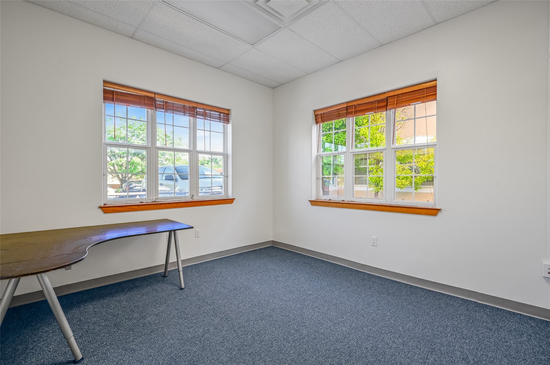 Office for Sale in Well-Established Galisteo Business Park. This inviting space is filled with natural light and features an open reception/waiting area. The office includes five spacious offices, each with large windows, along with two interior offices with high ceilings and skylights throughout. A centrally located kitchenette with storage space and two private restrooms. Recently repainted and newly carpeted, the space is professionally managed for added convenience. Condo dues are approx. $395 per month. Ideally situated in the St. Michael's and South St. Francis corridor, this property presents an excellent opportunity for a wide range of professional or medical uses.