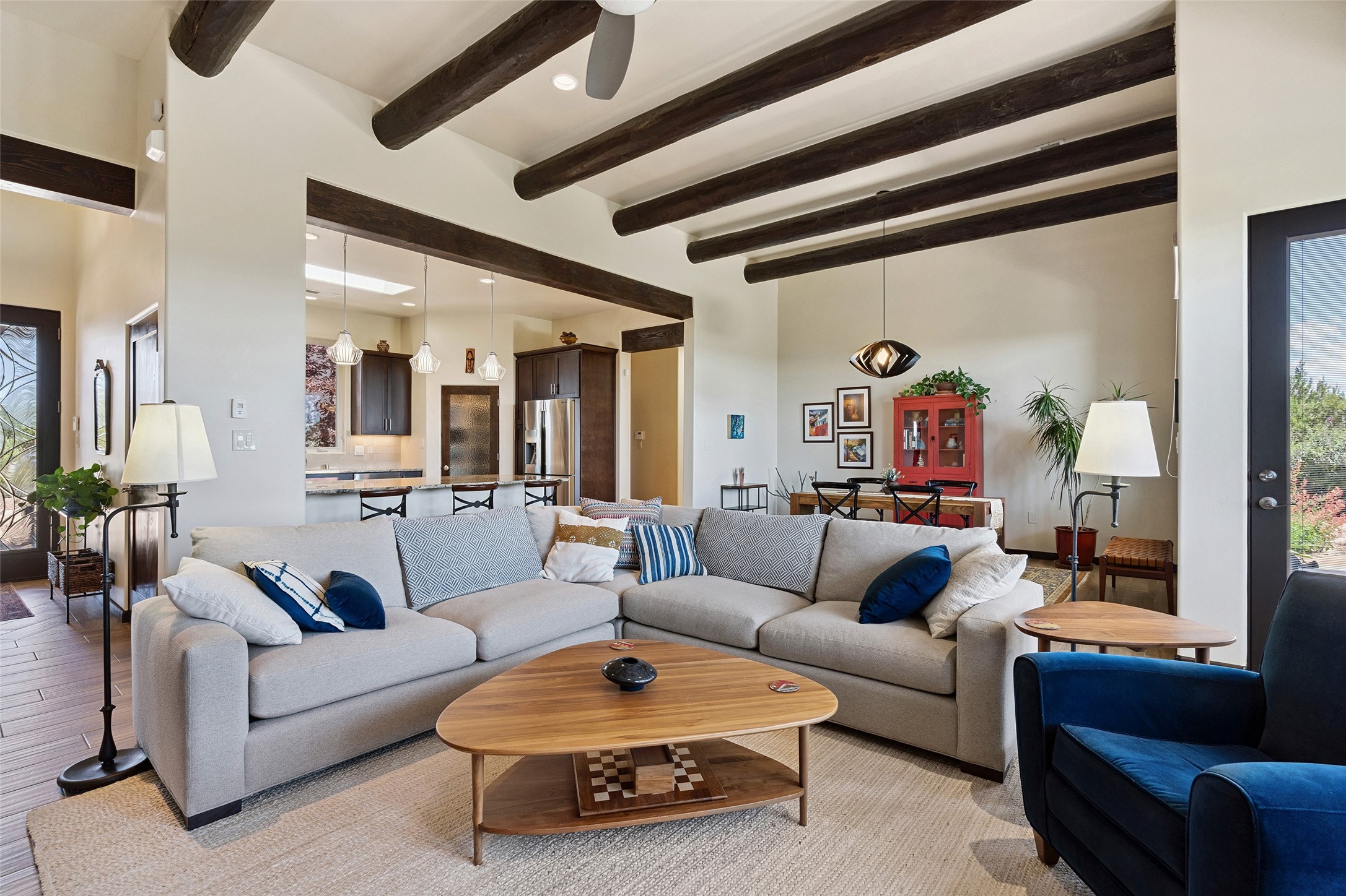 Perched high in The Ridges, a prestigious subdivisionbordering Eldorado greenspace and nearby conveniences,this stunning 3-bedroom, 2-bath home blends modern Southwestern design with serene high-desert living. Thoughtfully situated on 4.08 acres, the home features an open-concept layout that seamlessly connects the kitchen, dining, and living areas, ideal for entertaining or quiet enjoyment. The corner gas fireplace and overhead vigas add coziness andwarmthand expansive picture windows frame breathtaking panoramic views flooding the interior with natural light. Step outside to a spacious covered portal surrounded by an enclosed courtyard, perfect for morning coffee or evening gatherings under the stars. Themature, xeriscape landscaping is enhanced by a drip irrigation system, and a meandering pathwayleads to peaceful secluded areasto take in the fiery sunsetsof the Galisteo Basin and the morning sun rising over theSangre de Cristo Mountains.A dedicated artist's studio, complete with water and storage space, offers a private haven for creativity or a flexible bonus space.The oversized owner'ssuite features a separate tub and shower with walk-in closet, and you will love the finished over size garage with workshop! This is more than a home; it'sa private retreat that captures the essence of Santa Fe living!