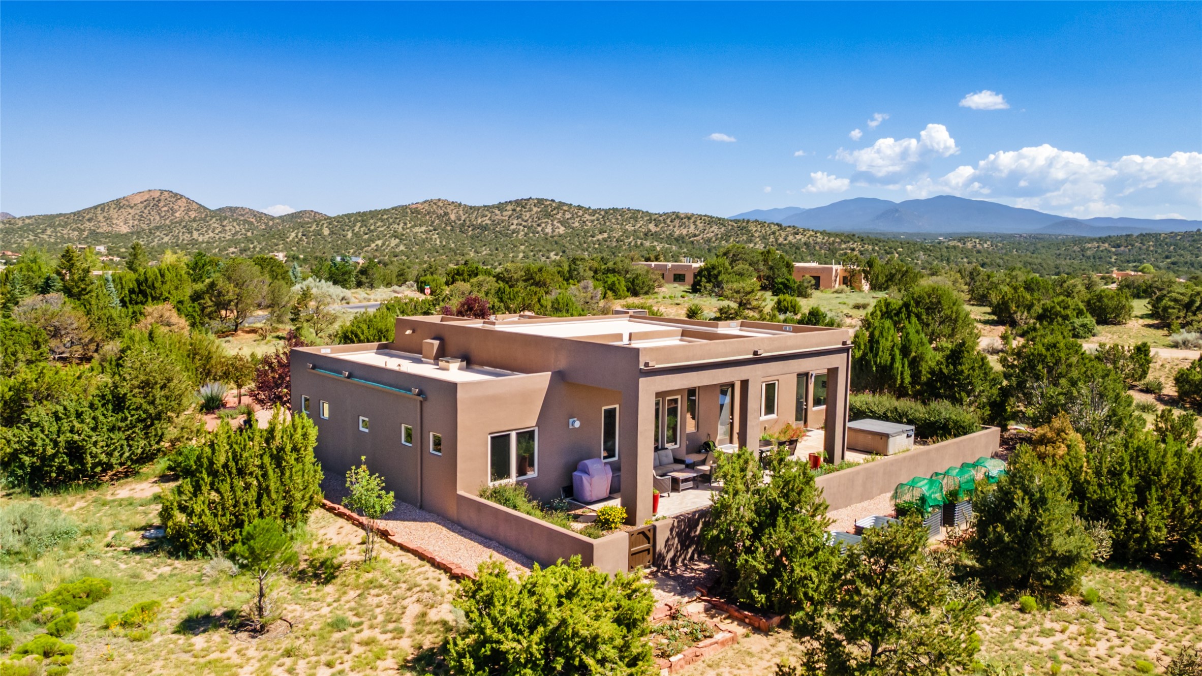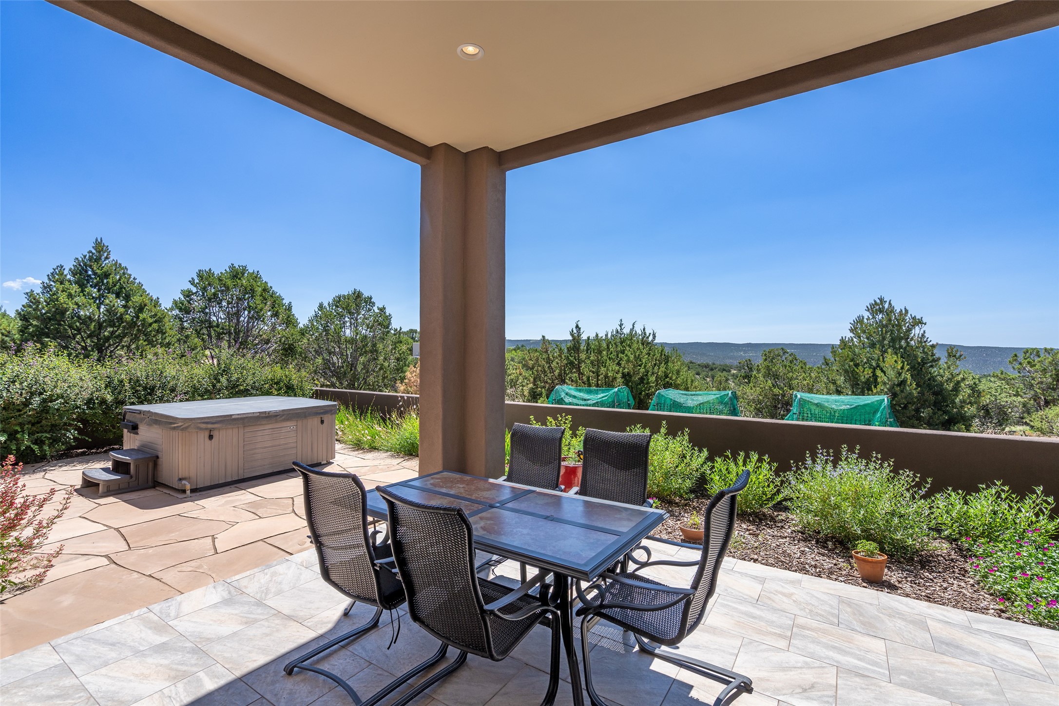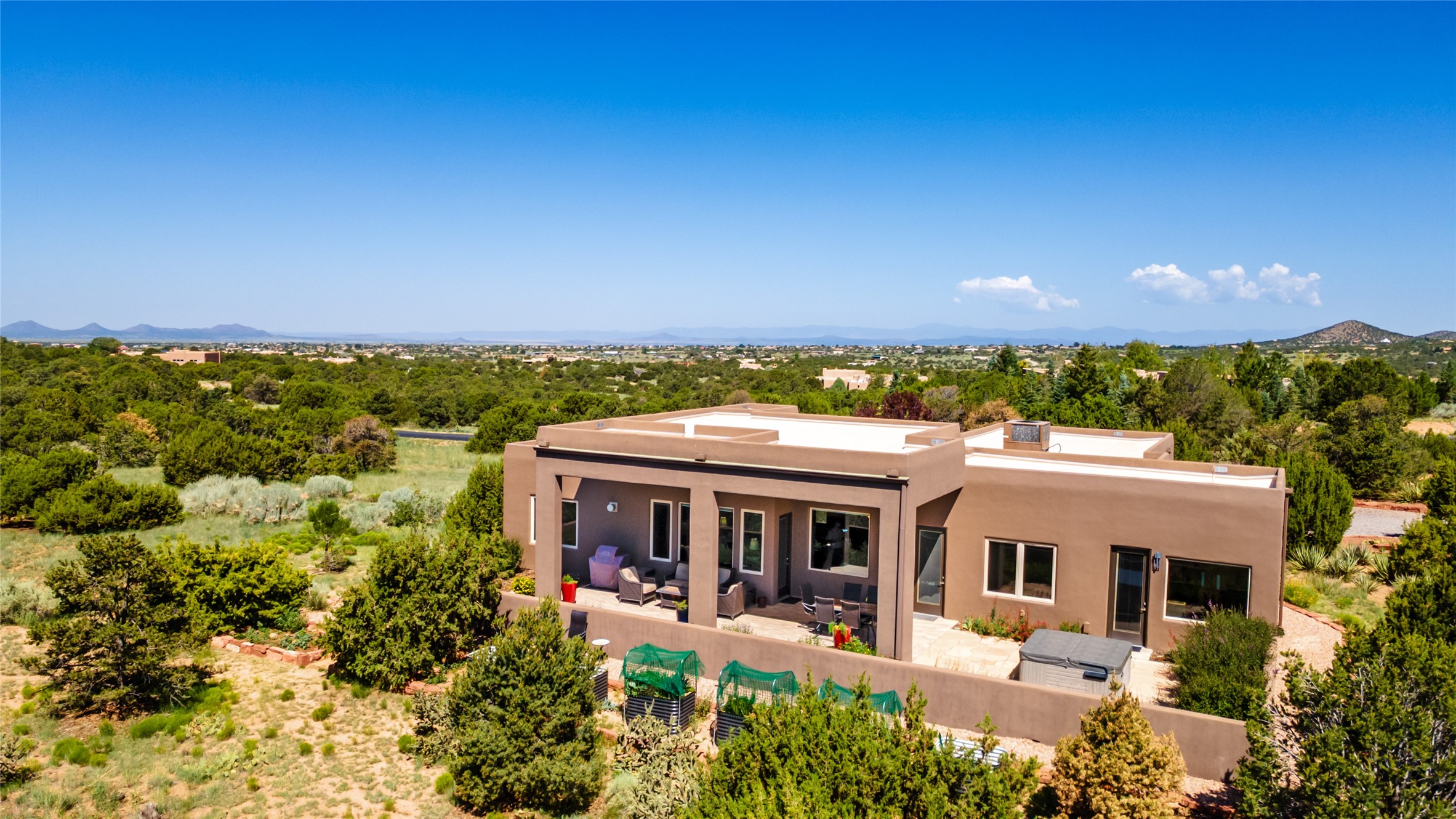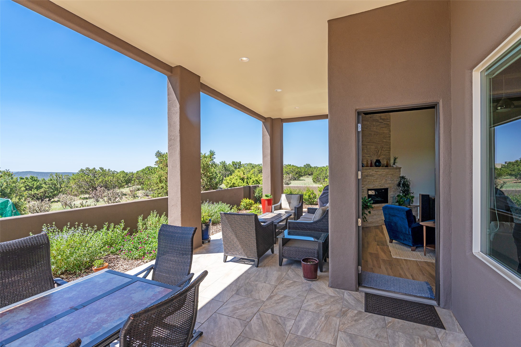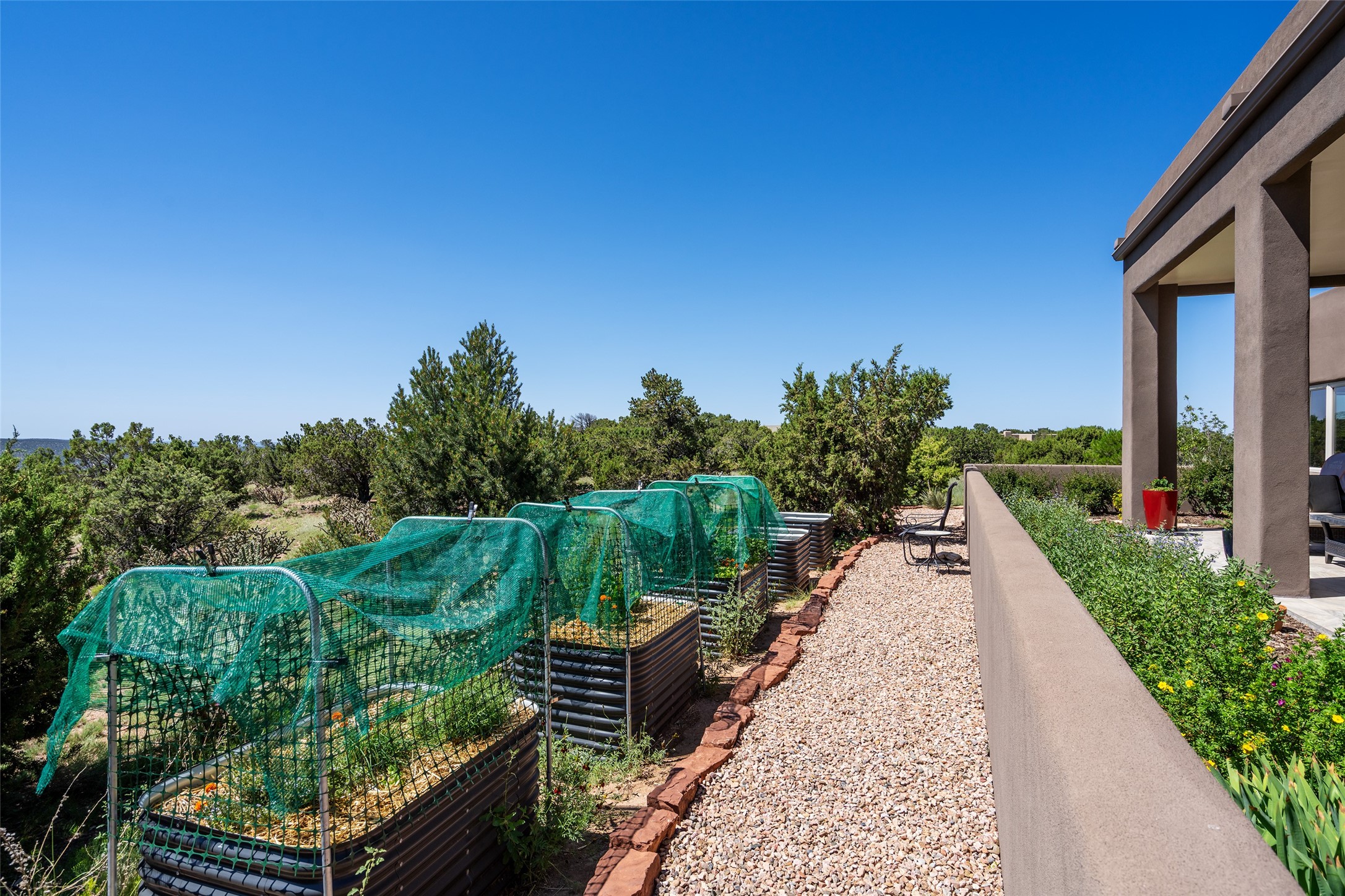 Perched high in The Ridges, a prestigious subdivisionbordering Eldorado greenspace and nearby conveniences,this stunning 3-bedroom, 2-bath home blends modern Southwestern design with serene high-desert living. Thoughtfully situated on 4.08 acres, the home features an open-concept layout that seamlessly connects the kitchen, dining, and living areas, ideal for entertaining or quiet enjoyment. The corner gas fireplace and overhead vigas add coziness andwarmthand expansive picture windows frame breathtaking panoramic views flooding the interior with natural light. Step outside to a spacious covered portal surrounded by an enclosed courtyard, perfect for morning coffee or evening gatherings under the stars. Themature, xeriscape landscaping is enhanced by a drip irrigation system, and a meandering pathwayleads to peaceful secluded areasto take in the fiery sunsetsof the Galisteo Basin and the morning sun rising over theSangre de Cristo Mountains.A dedicated artist's studio, complete with water and storage space, offers a private haven for creativity or a flexible bonus space.The oversized owner'ssuite features a separate tub and shower with walk-in closet, and you will love the finished over size garage with workshop! This is more than a home; it'sa private retreat that captures the essence of Santa Fe living!