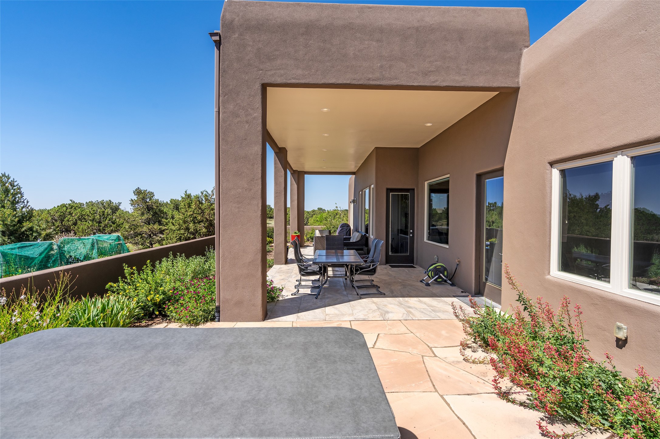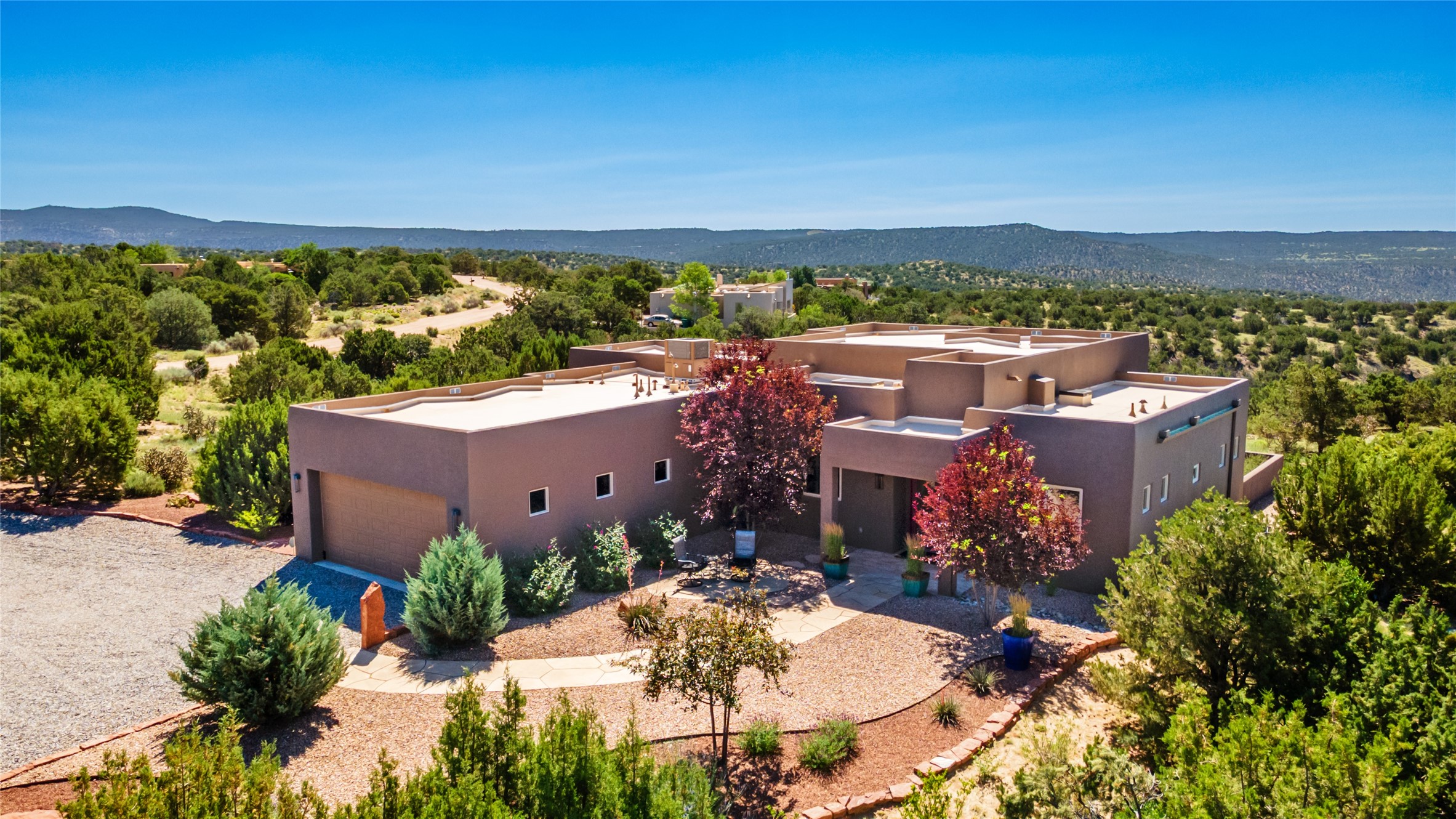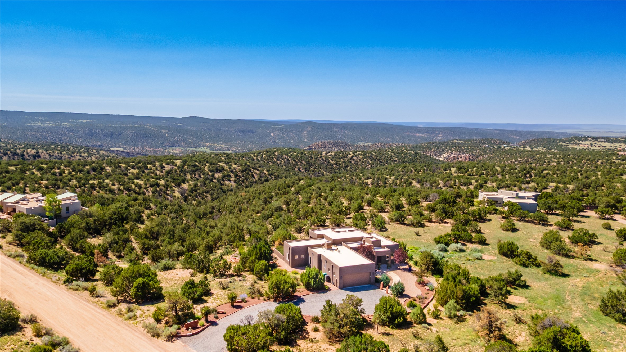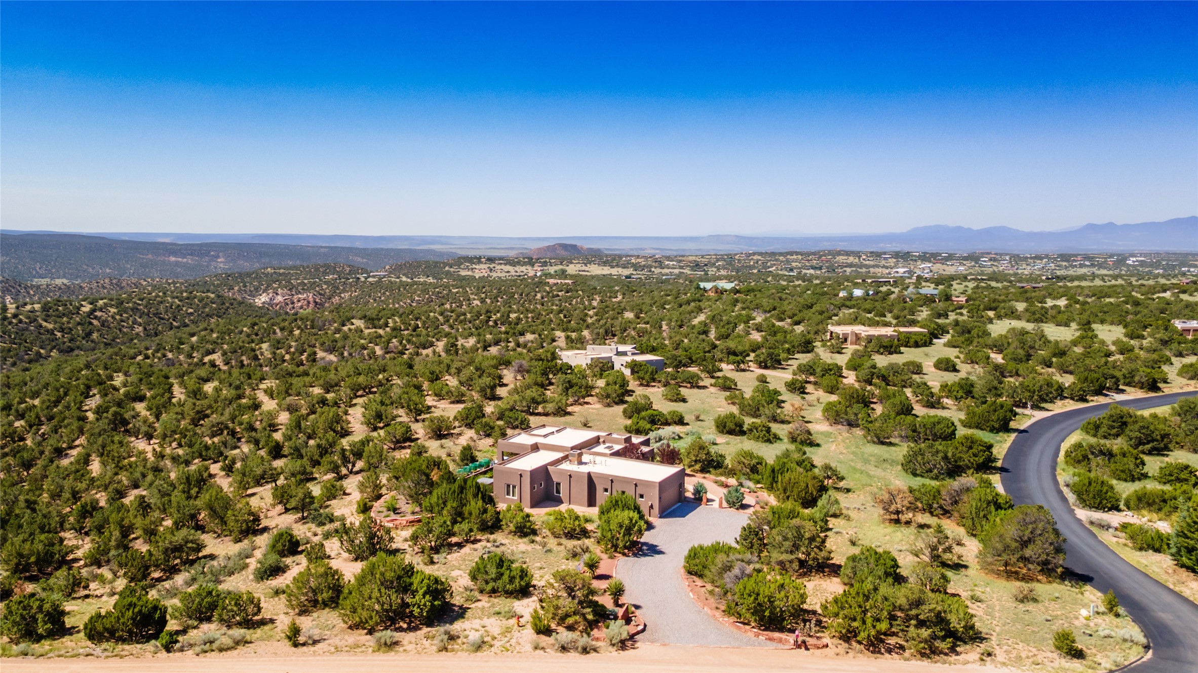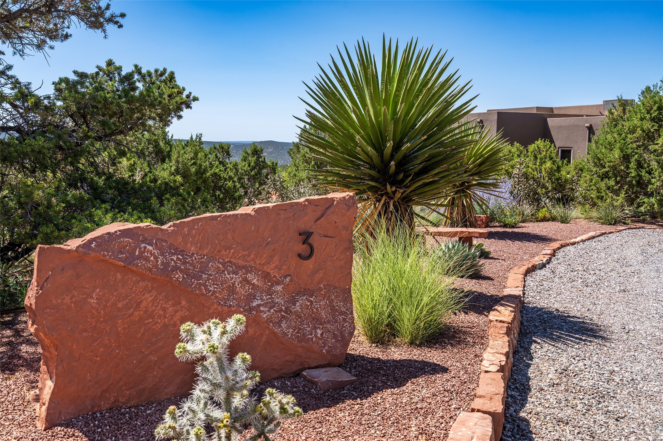 Perched high in The Ridges, a prestigious subdivisionbordering Eldorado greenspace and nearby conveniences,this stunning 3-bedroom, 2-bath home blends modern Southwestern design with serene high-desert living. Thoughtfully situated on 4.08 acres, the home features an open-concept layout that seamlessly connects the kitchen, dining, and living areas, ideal for entertaining or quiet enjoyment. The corner gas fireplace and overhead vigas add coziness andwarmthand expansive picture windows frame breathtaking panoramic views flooding the interior with natural light. Step outside to a spacious covered portal surrounded by an enclosed courtyard, perfect for morning coffee or evening gatherings under the stars. Themature, xeriscape landscaping is enhanced by a drip irrigation system, and a meandering pathwayleads to peaceful secluded areasto take in the fiery sunsetsof the Galisteo Basin and the morning sun rising over theSangre de Cristo Mountains.A dedicated artist's studio, complete with water and storage space, offers a private haven for creativity or a flexible bonus space.The oversized owner'ssuite features a separate tub and shower with walk-in closet, and you will love the finished over size garage with workshop! This is more than a home; it'sa private retreat that captures the essence of Santa Fe living!