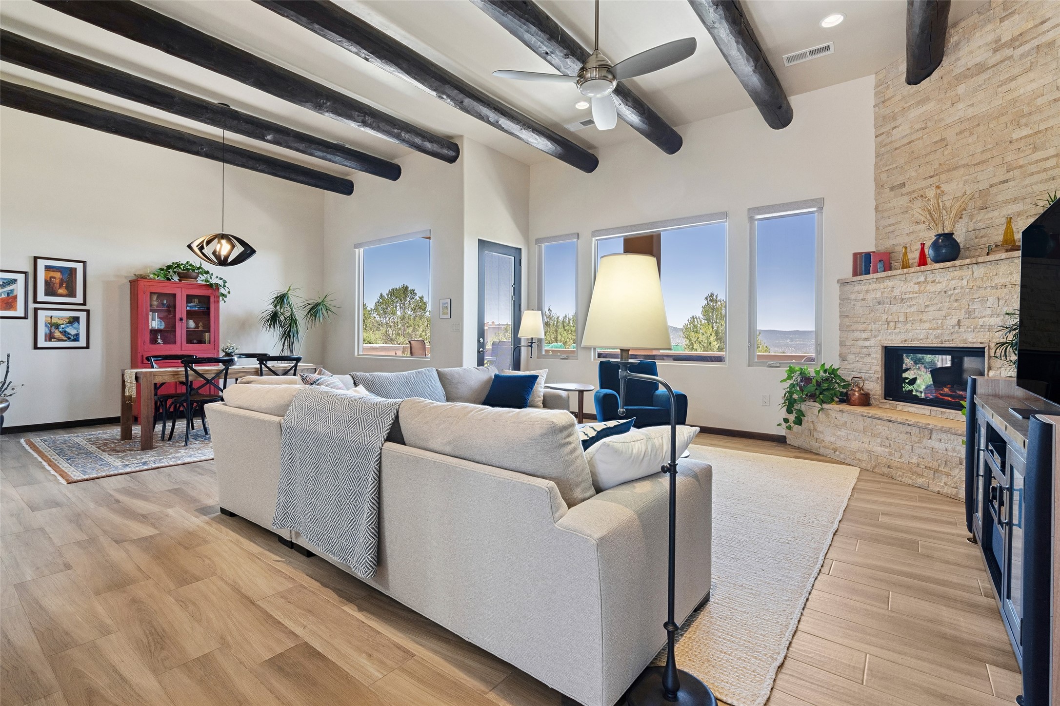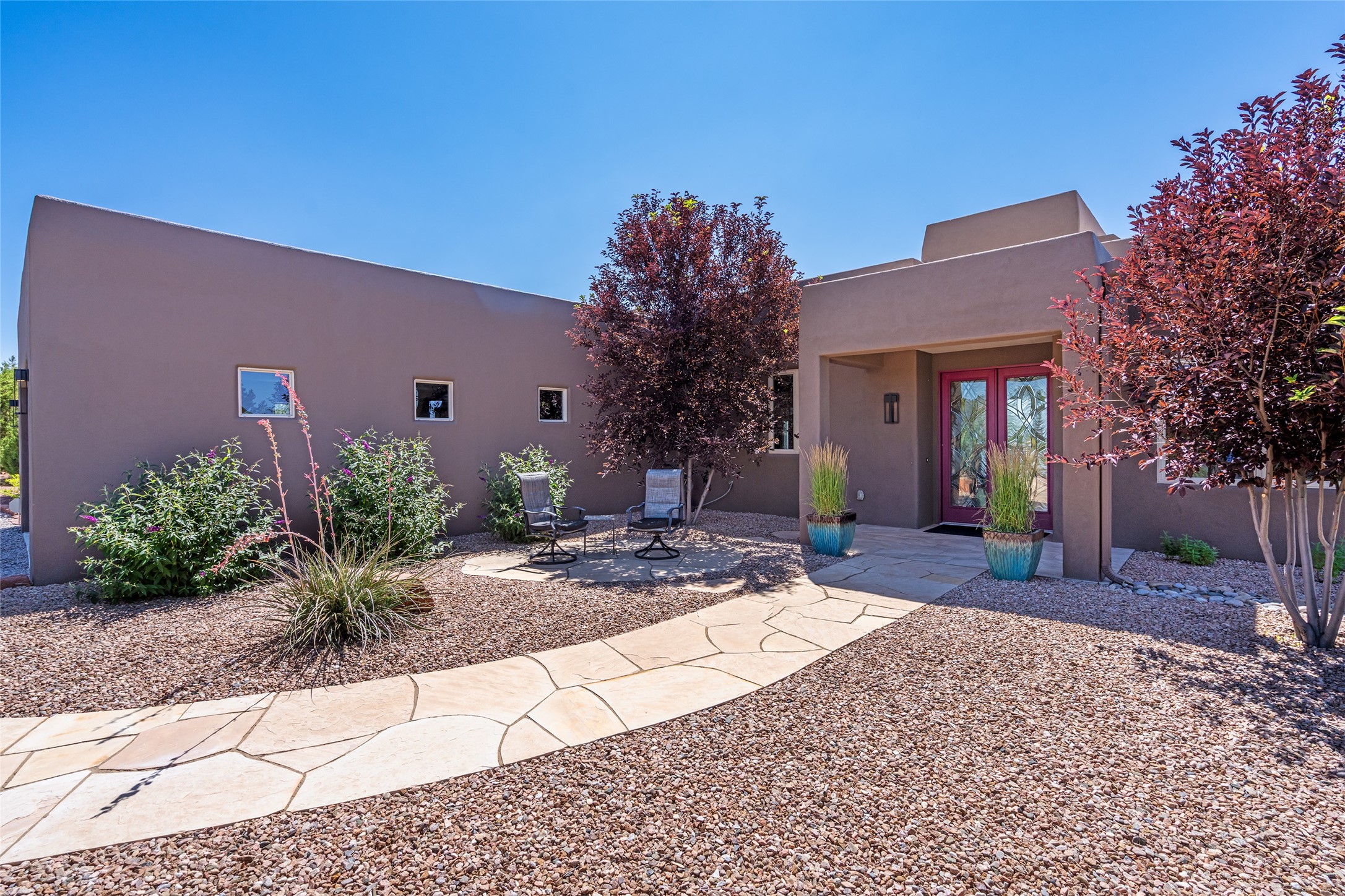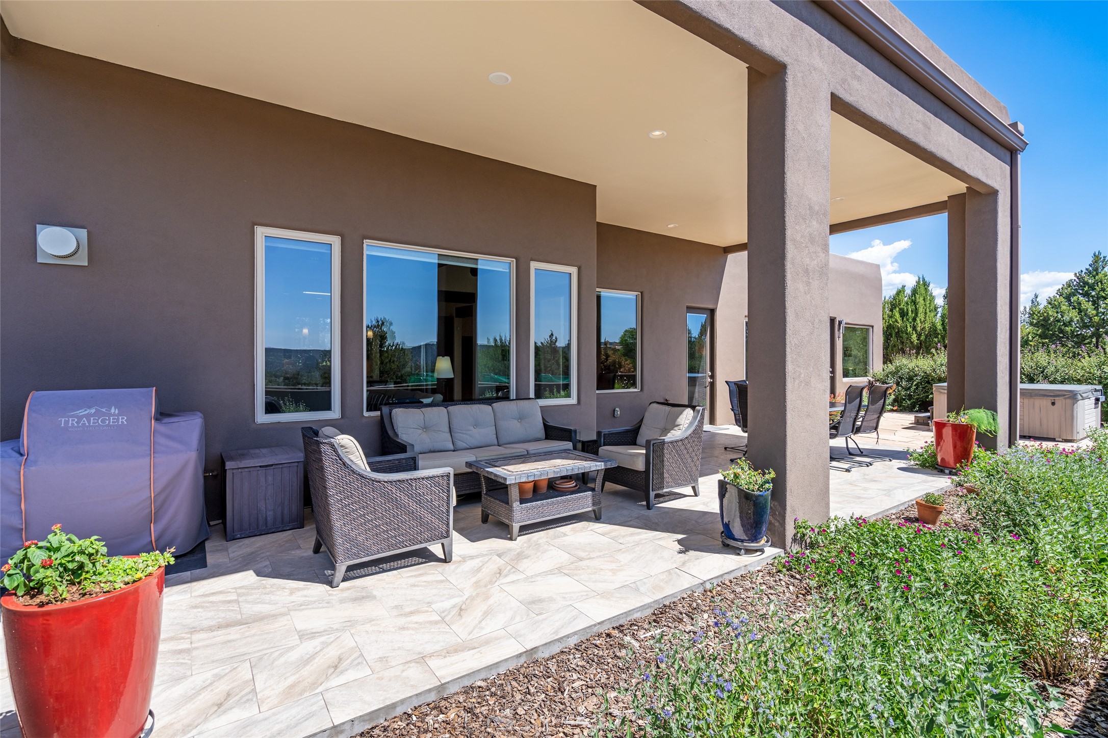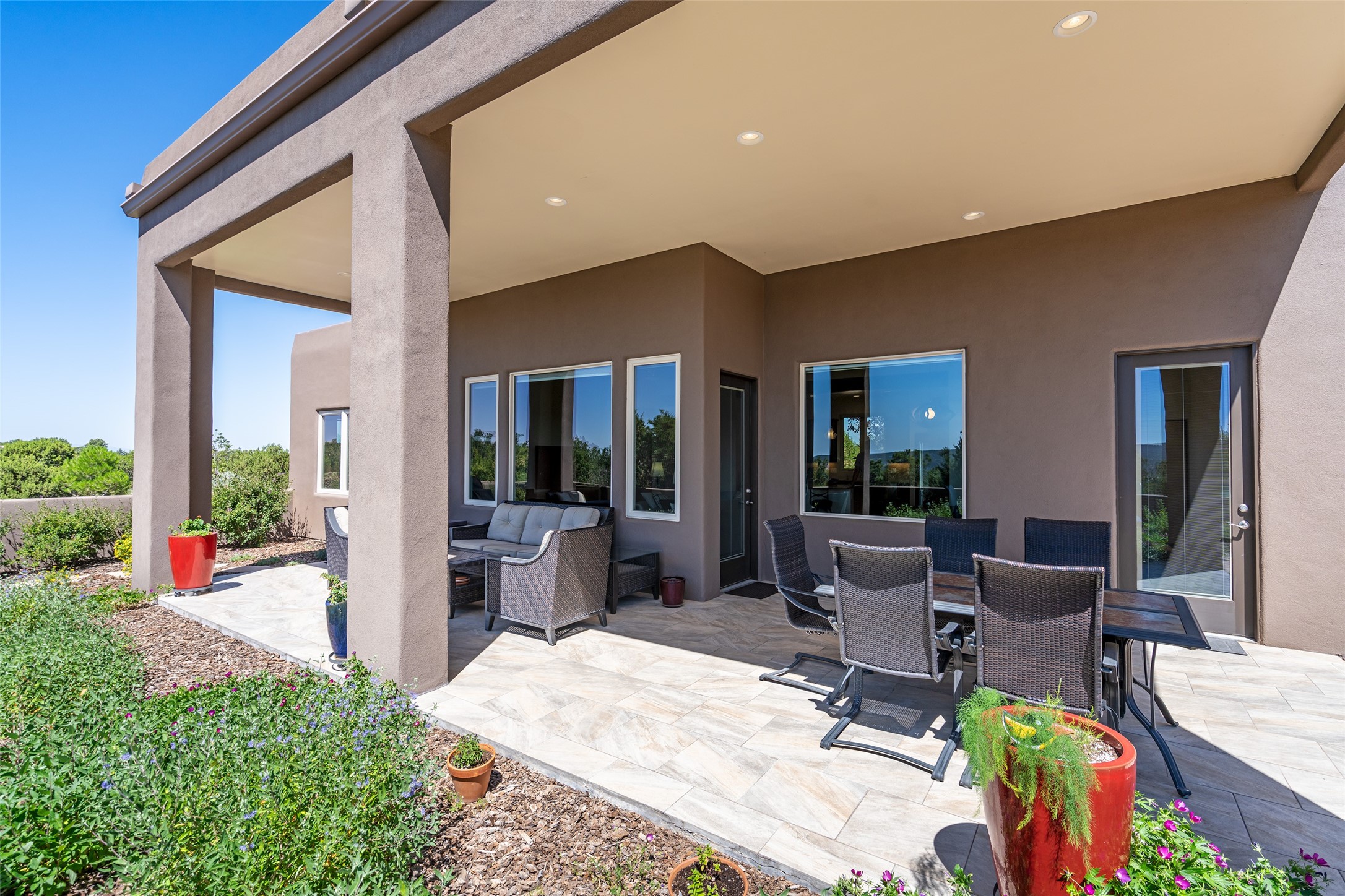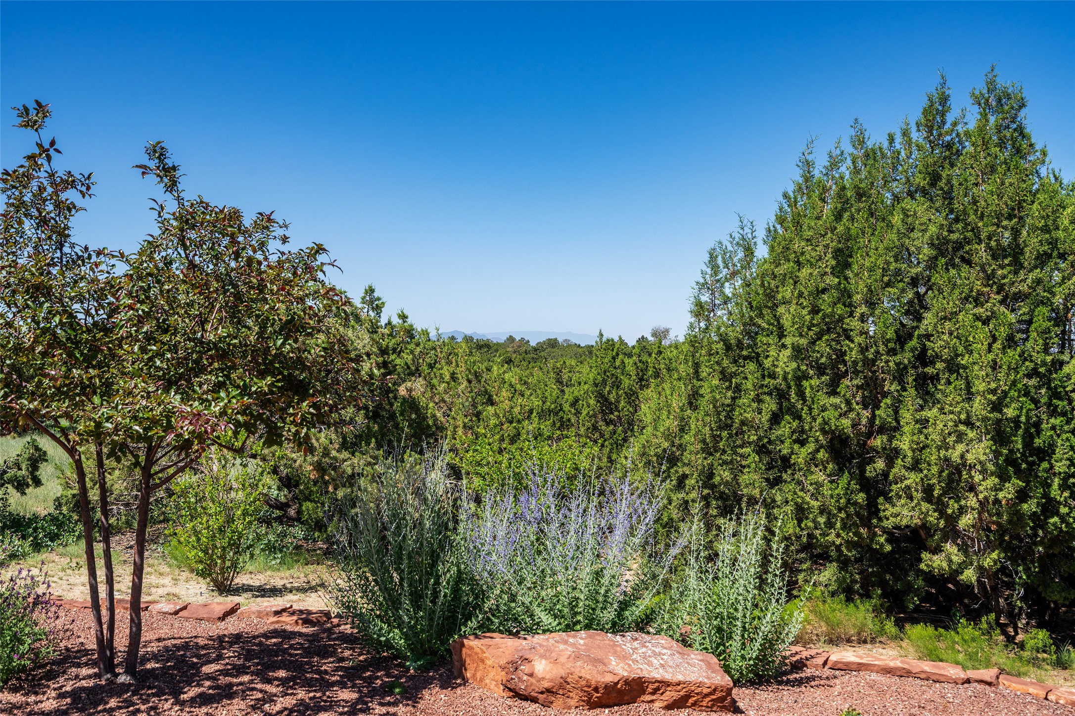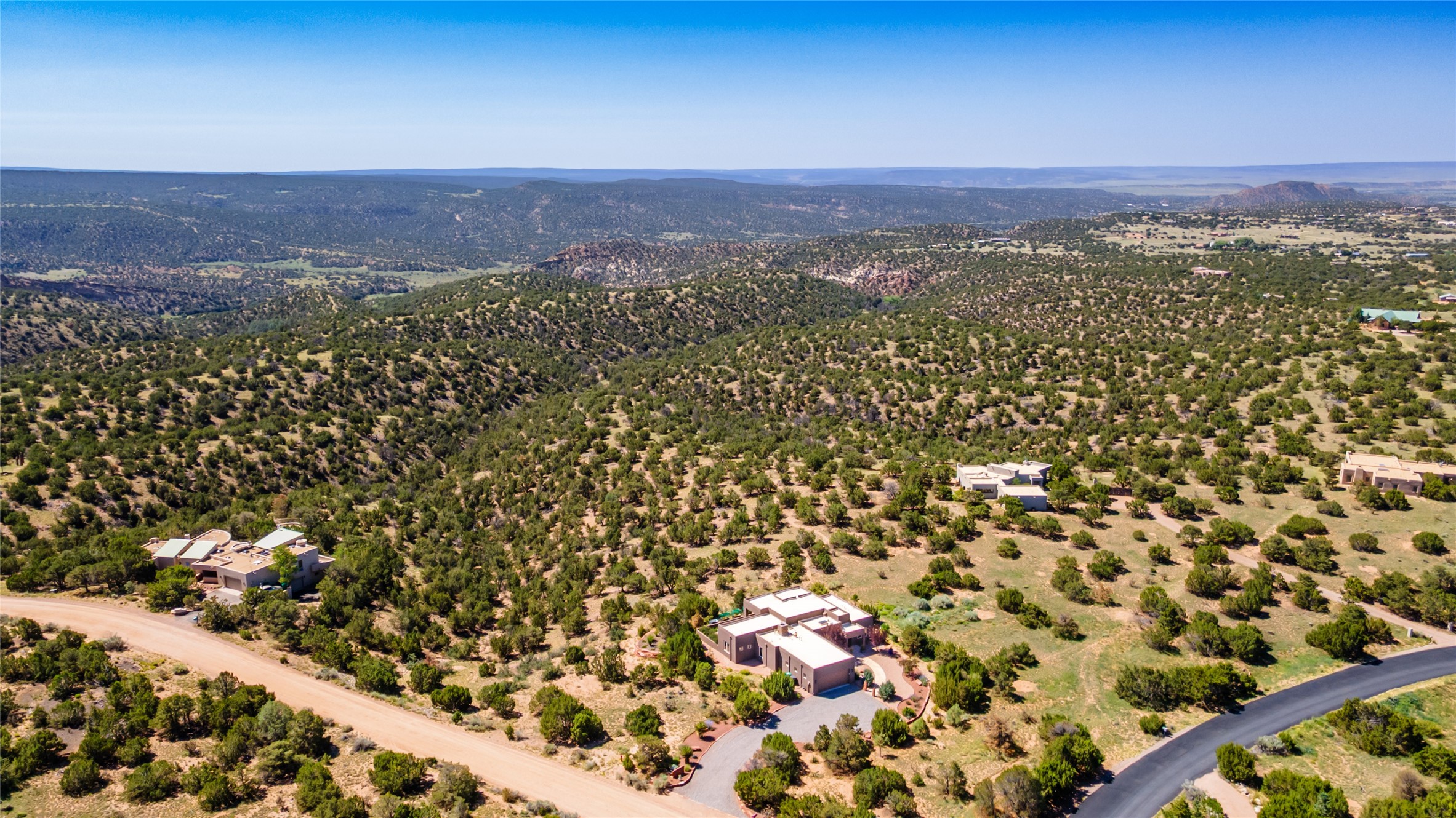Perched high in The Ridges, a prestigious subdivisionbordering Eldorado greenspace and nearby conveniences,this stunning 3-bedroom, 2-bath home blends modern Southwestern design with serene high-desert living. Thoughtfully situated on 4.08 acres, the home features an open-concept layout that seamlessly connects the kitchen, dining, and living areas, ideal for entertaining or quiet enjoyment. The corner gas fireplace and overhead vigas add coziness andwarmthand expansive picture windows frame breathtaking panoramic views flooding the interior with natural light. Step outside to a spacious covered portal surrounded by an enclosed courtyard, perfect for morning coffee or evening gatherings under the stars. Themature, xeriscape landscaping is enhanced by a drip irrigation system, and a meandering pathwayleads to peaceful secluded areasto take in the fiery sunsetsof the Galisteo Basin and the morning sun rising over theSangre de Cristo Mountains.A dedicated artist's studio, complete with water and storage space, offers a private haven for creativity or a flexible bonus space.The oversized owner'ssuite features a separate tub and shower with walk-in closet, and you will love the finished over size garage with workshop! This is more than a home; it'sa private retreat that captures the essence of Santa Fe living!