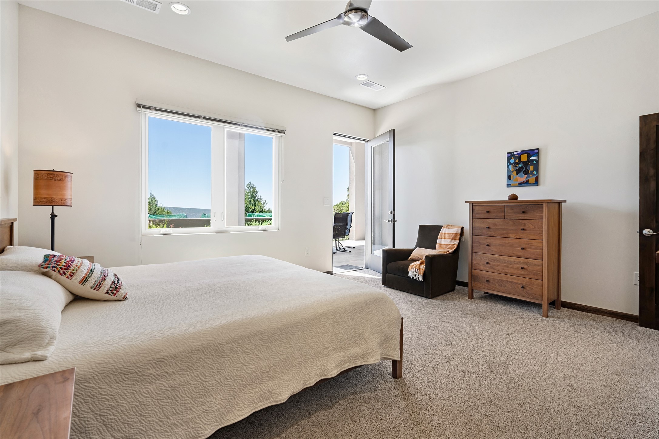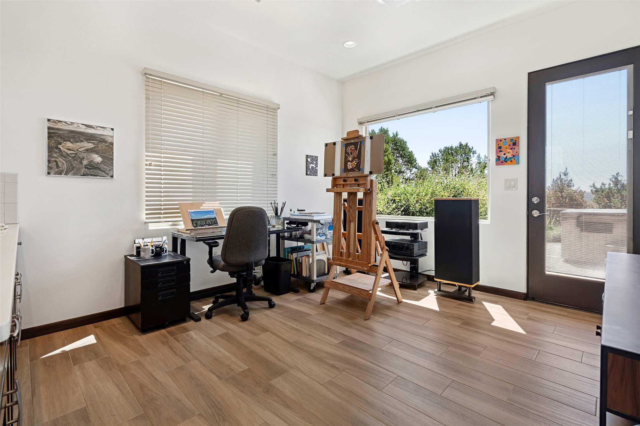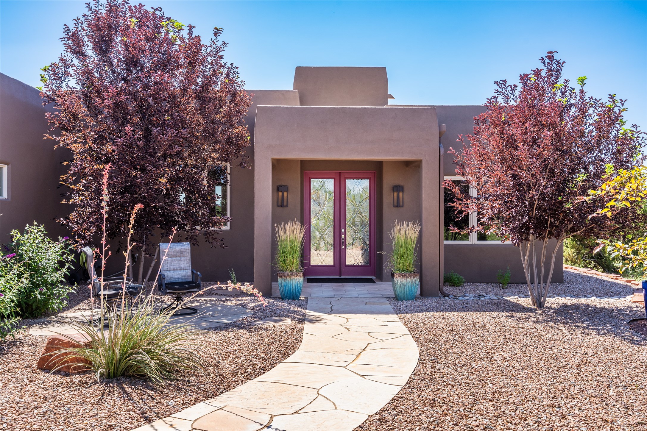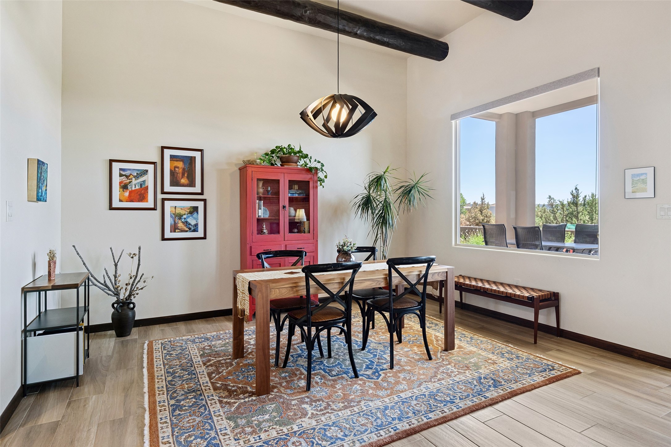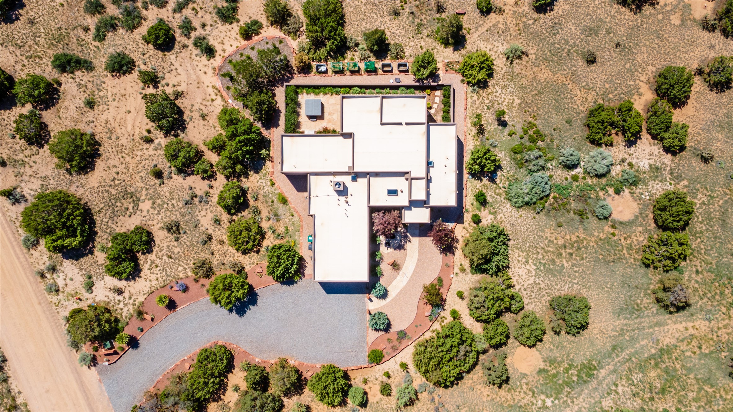 Perched high in The Ridges, a prestigious subdivisionbordering Eldorado greenspace and nearby conveniences,this stunning 3-bedroom, 2-bath home blends modern Southwestern design with serene high-desert living. Thoughtfully situated on 4.08 acres, the home features an open-concept layout that seamlessly connects the kitchen, dining, and living areas, ideal for entertaining or quiet enjoyment. The corner gas fireplace and overhead vigas add coziness andwarmthand expansive picture windows frame breathtaking panoramic views flooding the interior with natural light. Step outside to a spacious covered portal surrounded by an enclosed courtyard, perfect for morning coffee or evening gatherings under the stars. Themature, xeriscape landscaping is enhanced by a drip irrigation system, and a meandering pathwayleads to peaceful secluded areasto take in the fiery sunsetsof the Galisteo Basin and the morning sun rising over theSangre de Cristo Mountains.A dedicated artist's studio, complete with water and storage space, offers a private haven for creativity or a flexible bonus space.The oversized owner'ssuite features a separate tub and shower with walk-in closet, and you will love the finished over size garage with workshop! This is more than a home; it'sa private retreat that captures the essence of Santa Fe living!