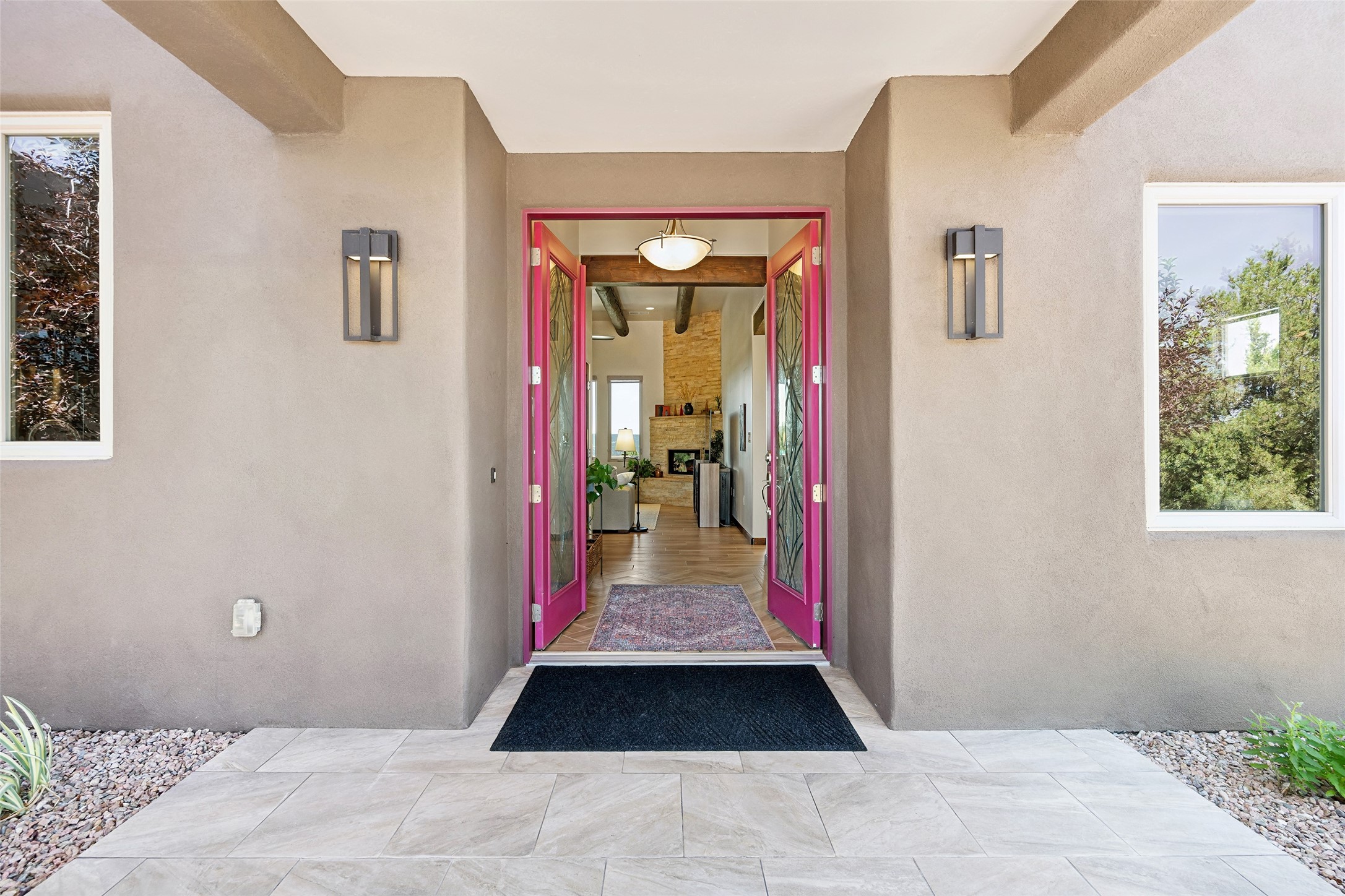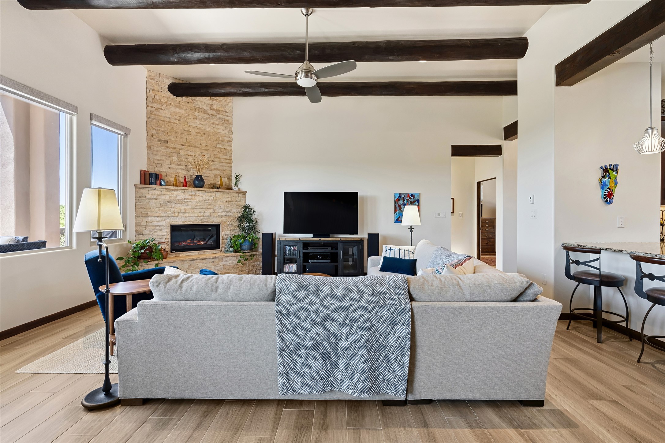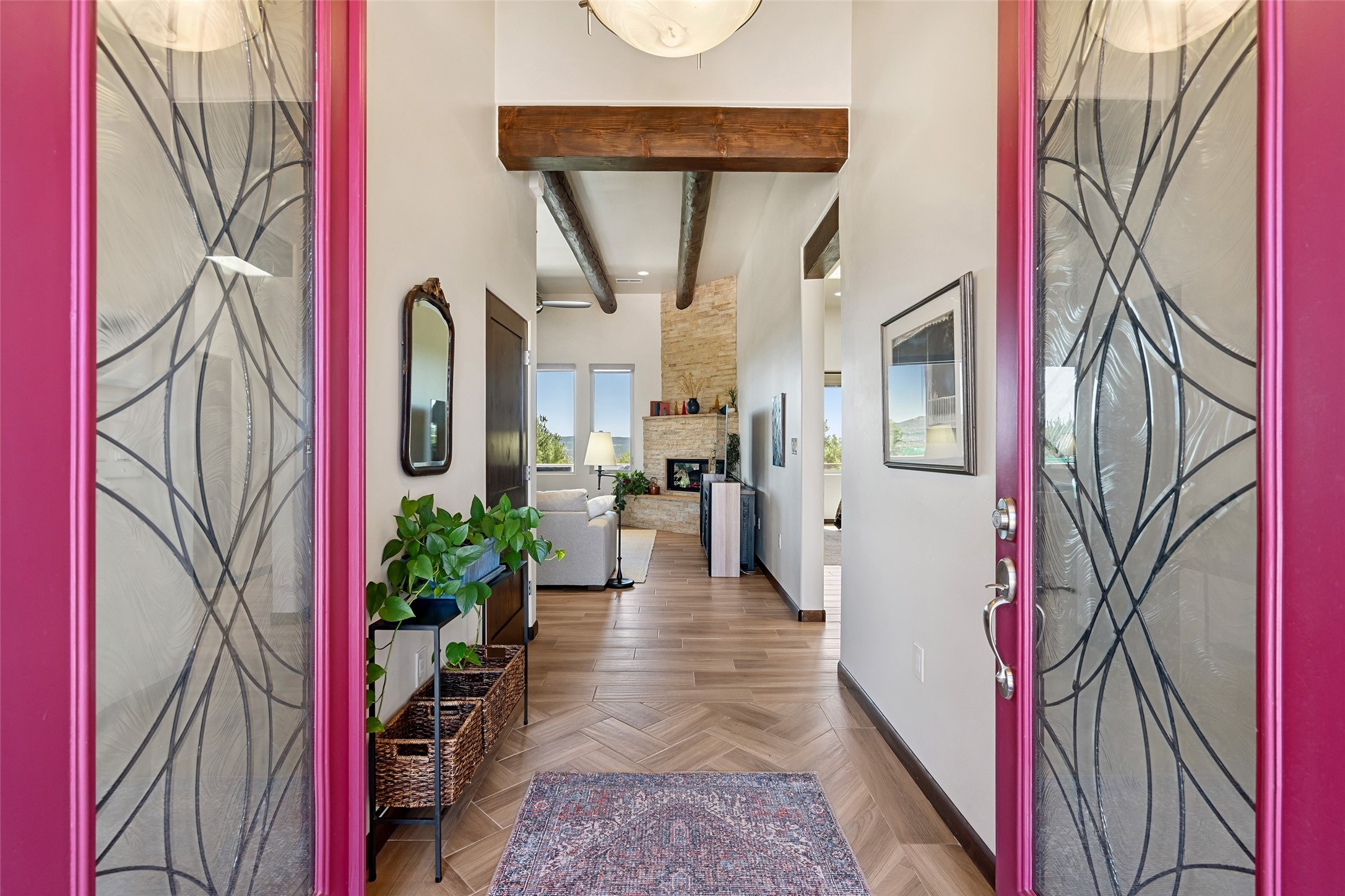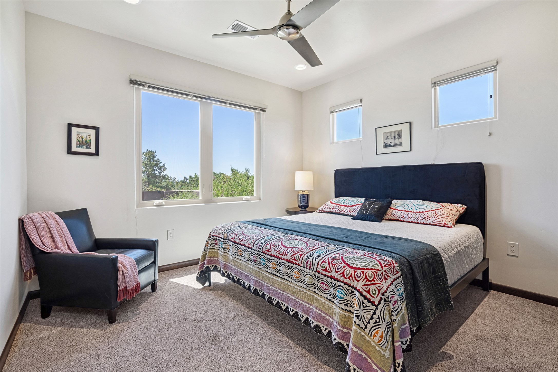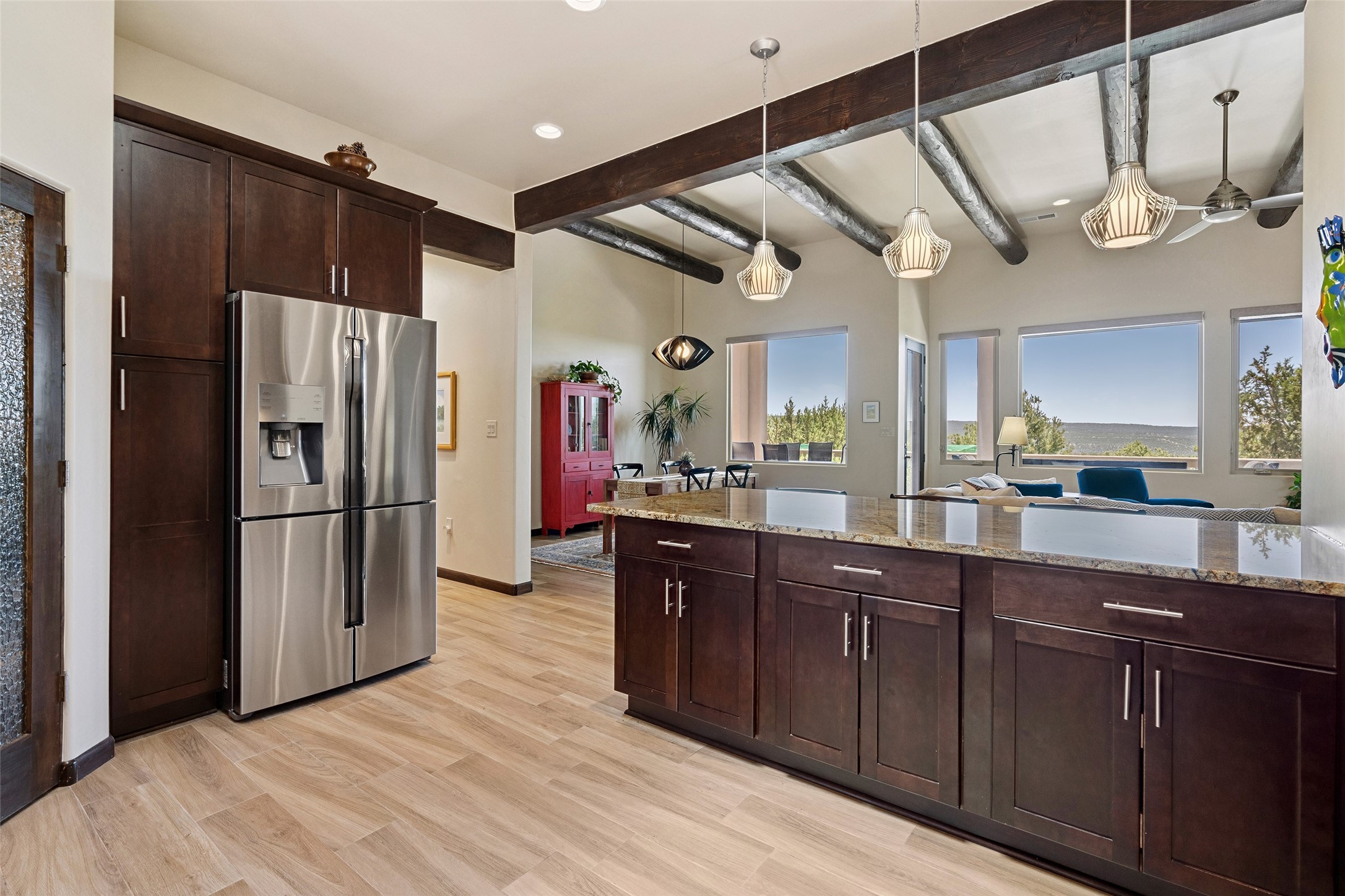 Perched high in The Ridges, a prestigious subdivisionbordering Eldorado greenspace and nearby conveniences,this stunning 3-bedroom, 2-bath home blends modern Southwestern design with serene high-desert living. Thoughtfully situated on 4.08 acres, the home features an open-concept layout that seamlessly connects the kitchen, dining, and living areas, ideal for entertaining or quiet enjoyment. The corner gas fireplace and overhead vigas add coziness andwarmthand expansive picture windows frame breathtaking panoramic views flooding the interior with natural light. Step outside to a spacious covered portal surrounded by an enclosed courtyard, perfect for morning coffee or evening gatherings under the stars. Themature, xeriscape landscaping is enhanced by a drip irrigation system, and a meandering pathwayleads to peaceful secluded areasto take in the fiery sunsetsof the Galisteo Basin and the morning sun rising over theSangre de Cristo Mountains.A dedicated artist's studio, complete with water and storage space, offers a private haven for creativity or a flexible bonus space.The oversized owner'ssuite features a separate tub and shower with walk-in closet, and you will love the finished over size garage with workshop! This is more than a home; it'sa private retreat that captures the essence of Santa Fe living!