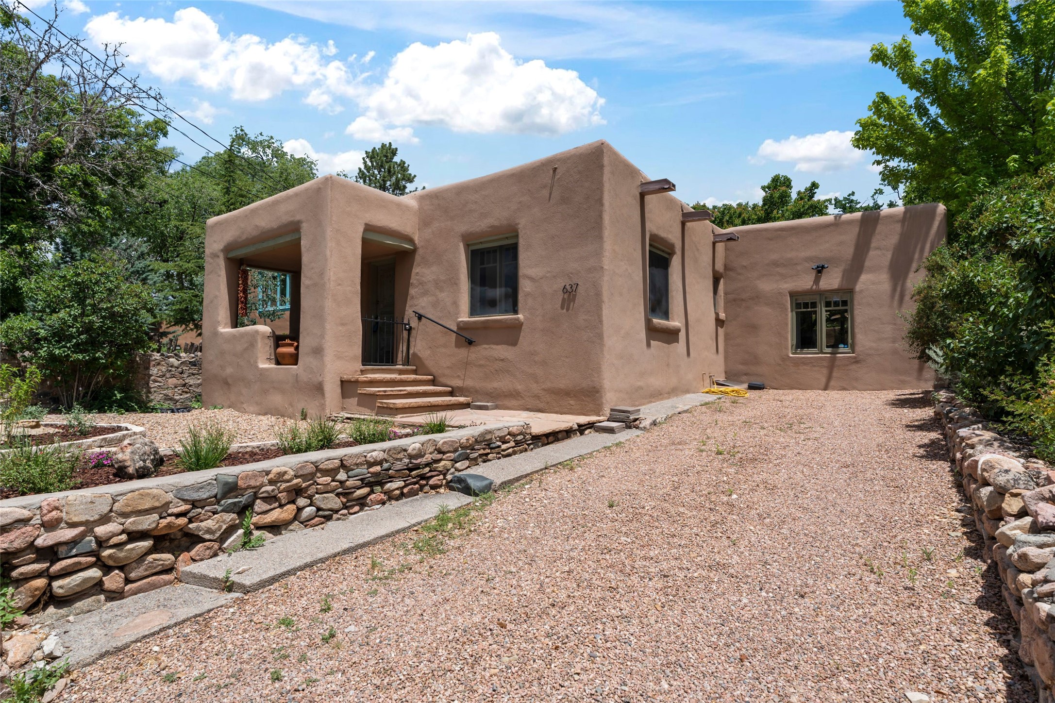 This special 1945 2 bedroom, 2 bath adobe home sits across from the tree lined River Walk on the historic Eastside, an easy stroll to both Canyon Road and the Plaza, and has been beautifully remodeled for easy downtown living. A shady front portal sits up from E Alameda, and opens to the living room with its classic corner Kiva fireplace, a formal dining room, and at the back of the house, a large light and bright kitchen which opens to the private walled back yard for al fresco dining and grilling. Each bedroom has its own beautifully updated bath. Both bedrooms and baths are nice sized, and the primary bedroom opens also to the back yard. There are two off street parking spots as well as central air conditioning, new sewer and water line in 2021 and a 400 square foot basement for storage or workshop area. Perfect pied-a-terre, or full-time home from which to enjoy the artistic, cultural and fine dining of Santa Fe's city center!
