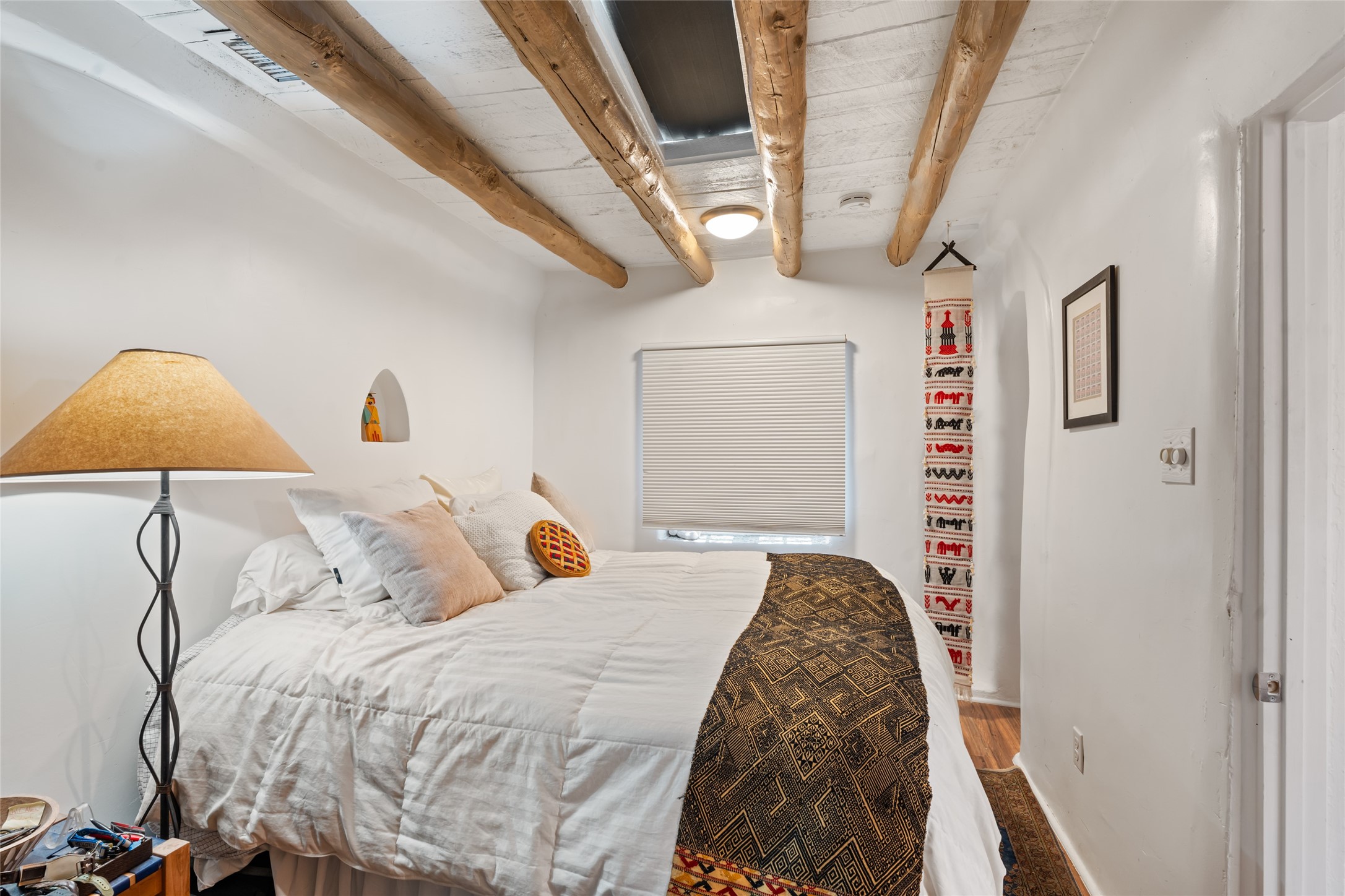 Behind old turquoise gates sits a unique 1800's historically contributing adobe located across from the Santa Fe River Trail on the historic Eastside, steps from Canyon Road and blocks from the Plaza; consisting of a large 2-bedroom casa and an attached 1-bedroom casita. There are many traditional architectural details including vigas, hand carved doors, corbels, thick adobe plastered walls, Shepherd's and Kiva fireplaces and charming old river rock walls. The larger home, Unit A, has 2 bedrooms and 2 baths with a nice size living room with a corner kiva fireplace leading into the kitchen and dining area with French doors going out to a quiet, private, shady back bricked patio. The second bathroom is a half bath and also houses the stackable washer/dryer, while the main bath is a charming Mexican tiled bathroom - both whimsical and functional. The front bedroom is small and would make a great home office or second bedroom, and the main bedroom is quite large and enjoys a kiva fireplace, wonderful old river rock walls and also opens to the back patio. The attached casita, Unit B, is wonderfully updated with a great room with corner Shepherd's fireplaces on both ends of the main living space, which also includes the kitchen with quartz counters and a nice little eating spot. This room opens to its own little bricked back patio - equally shady and private. The bedroom has an en suite bath with a stackable washer dryer. The house faces to the South and the river, so has wonderful winter light streaming in and when windows are open the gentle sound of water in the river can be heard. There are plenty of skylights, so both homes have lots of natural light. The house was remodeled about 6 years ago including a new roof, AC and appliances - a special treasure with lots of options should one need a home office, separate space for guests or family or just a wonderful home by the river!