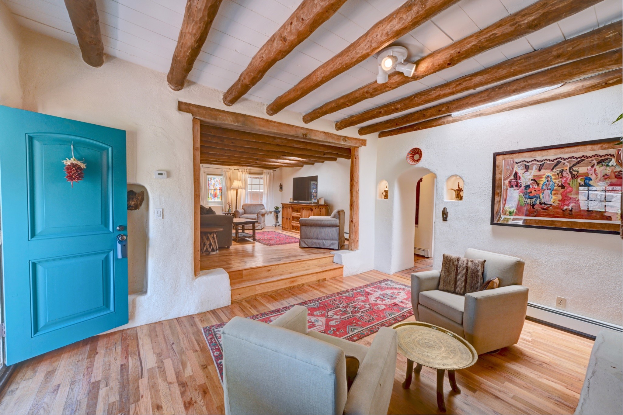 A hundred years of Santa Fe history is represented in this unique home. From the original small structure, built in the 1930's with its thick adobe walls, subsequent owners have added numerous updates and additional living spaces while maintaining the history and character of the residence. These adobe walls and double-paned windows throughout the house, provide peace and quiet from the home's location on the road leading to the renowned Santa Fe Ski Basin and to miles of hiking trails. The two-tiered living room features a fireplace and a designated area for activities such as reading, listening to music, and watching TV.The heart of the house is the central kitchen/dining area, where family and friends gather for meals and conversation. Cabinets, counters, backsplashes, and appliances have been updated to accommodate modern living, while the original floors, nichos, and ceilings have been carefully preserved. The traditional Kiva fireplace, once part of the original portal, serves as a focal point for the area. Well maintained and updated, it adds warmth and charm during Santa Fe's brisk winters. The situation of two of the three bedrooms off the central area provides privacy for guests and residents alike. One has an ensuite bathroom while the other provides garden views.Down a sunny hall, also with garden views, is the primary bedroom and bath. With a Kiva fireplace and outdoor access, this suite is a serene retreat. Its location from the central living area guarantees spacious privacy for the main occupants while hosting family and friends.The two outside areas have been designed to address the specific requirements of Santa Fe's climate. Water wise trees, shrubs and perennials support native pollinators while bringing edibles and color to the landscape. A water catchment system collects hundreds of gallons of water during the region's infrequent rains for use during the dry season.To top it off, this gem boasts a new TPO roof, new exterior stucco, two tankless hot water heaters (2020); solar panels (2021); and five minisplits (beginning 2018) making it move-in ready. This is a home not to be missed!Do not miss the 3-D Matterport walkthrough and drone footage in the listing!