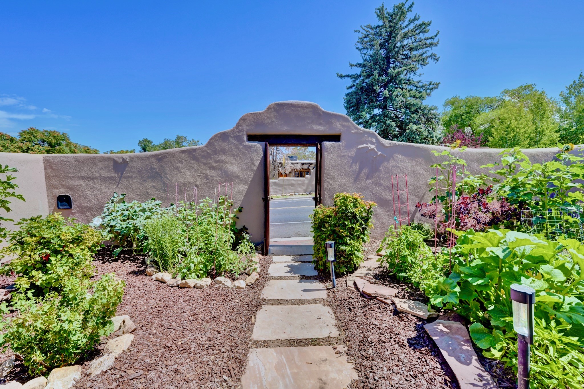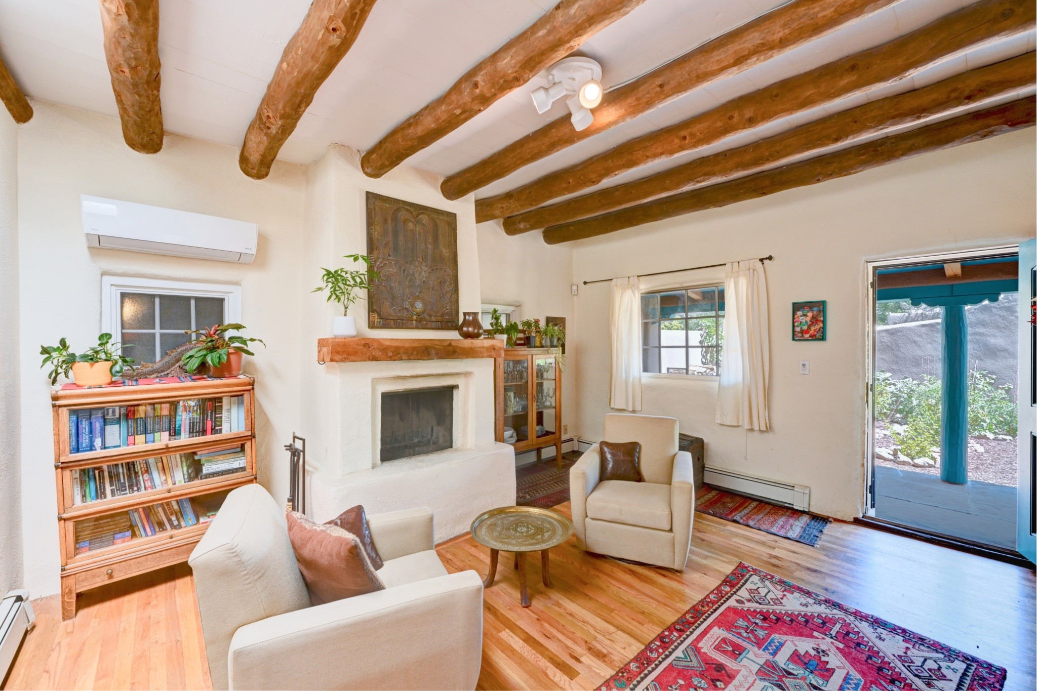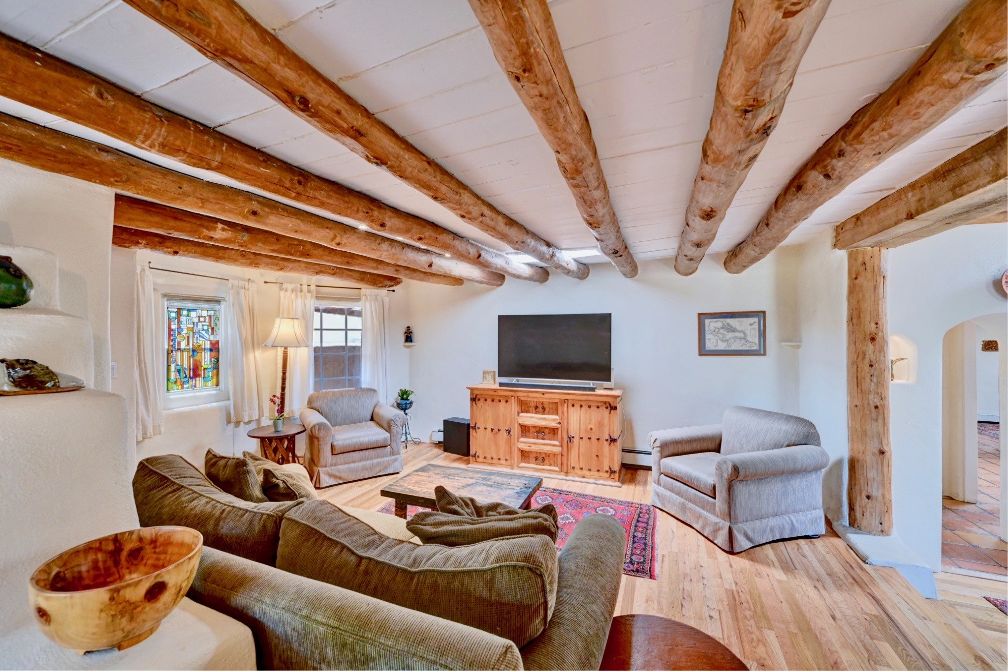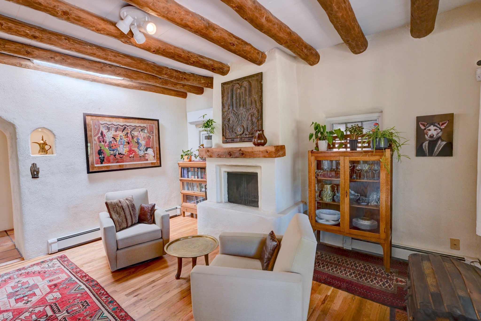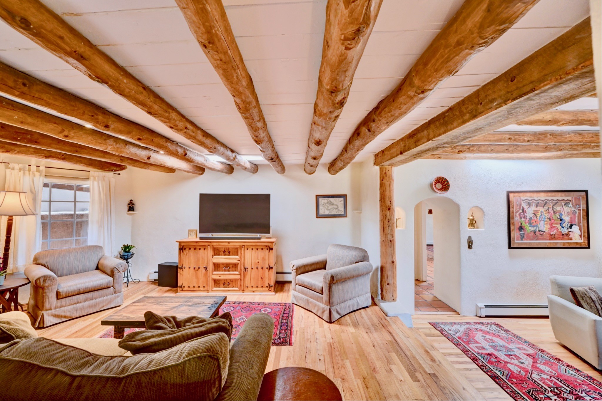 A hundred years of Santa Fe history is represented in this unique home. From the original small structure, built in the 1930's with its thick adobe walls, subsequent owners have added numerous updates and additional living spaces while maintaining the history and character of the residence. These adobe walls and double-paned windows throughout the house, provide peace and quiet from the home's location on the road leading to the renowned Santa Fe Ski Basin and to miles of hiking trails. The two-tiered living room features a fireplace and a designated area for activities such as reading, listening to music, and watching TV.The heart of the house is the central kitchen/dining area, where family and friends gather for meals and conversation. Cabinets, counters, backsplashes, and appliances have been updated to accommodate modern living, while the original floors, nichos, and ceilings have been carefully preserved. The traditional Kiva fireplace, once part of the original portal, serves as a focal point for the area. Well maintained and updated, it adds warmth and charm during Santa Fe's brisk winters. The situation of two of the three bedrooms off the central area provides privacy for guests and residents alike. One has an ensuite bathroom while the other provides garden views.Down a sunny hall, also with garden views, is the primary bedroom and bath. With a Kiva fireplace and outdoor access, this suite is a serene retreat. Its location from the central living area guarantees spacious privacy for the main occupants while hosting family and friends.The two outside areas have been designed to address the specific requirements of Santa Fe's climate. Water wise trees, shrubs and perennials support native pollinators while bringing edibles and color to the landscape. A water catchment system collects hundreds of gallons of water during the region's infrequent rains for use during the dry season.To top it off, this gem boasts a new TPO roof, new exterior stucco, two tankless hot water heaters (2020); solar panels (2021); and five minisplits (beginning 2018) making it move-in ready. This is a home not to be missed!Do not miss the 3-D Matterport walkthrough and drone footage in the listing!