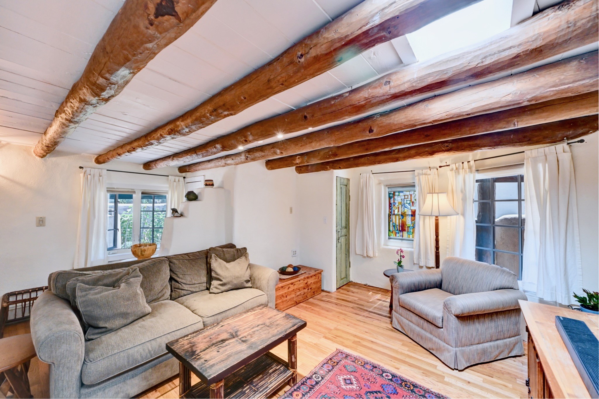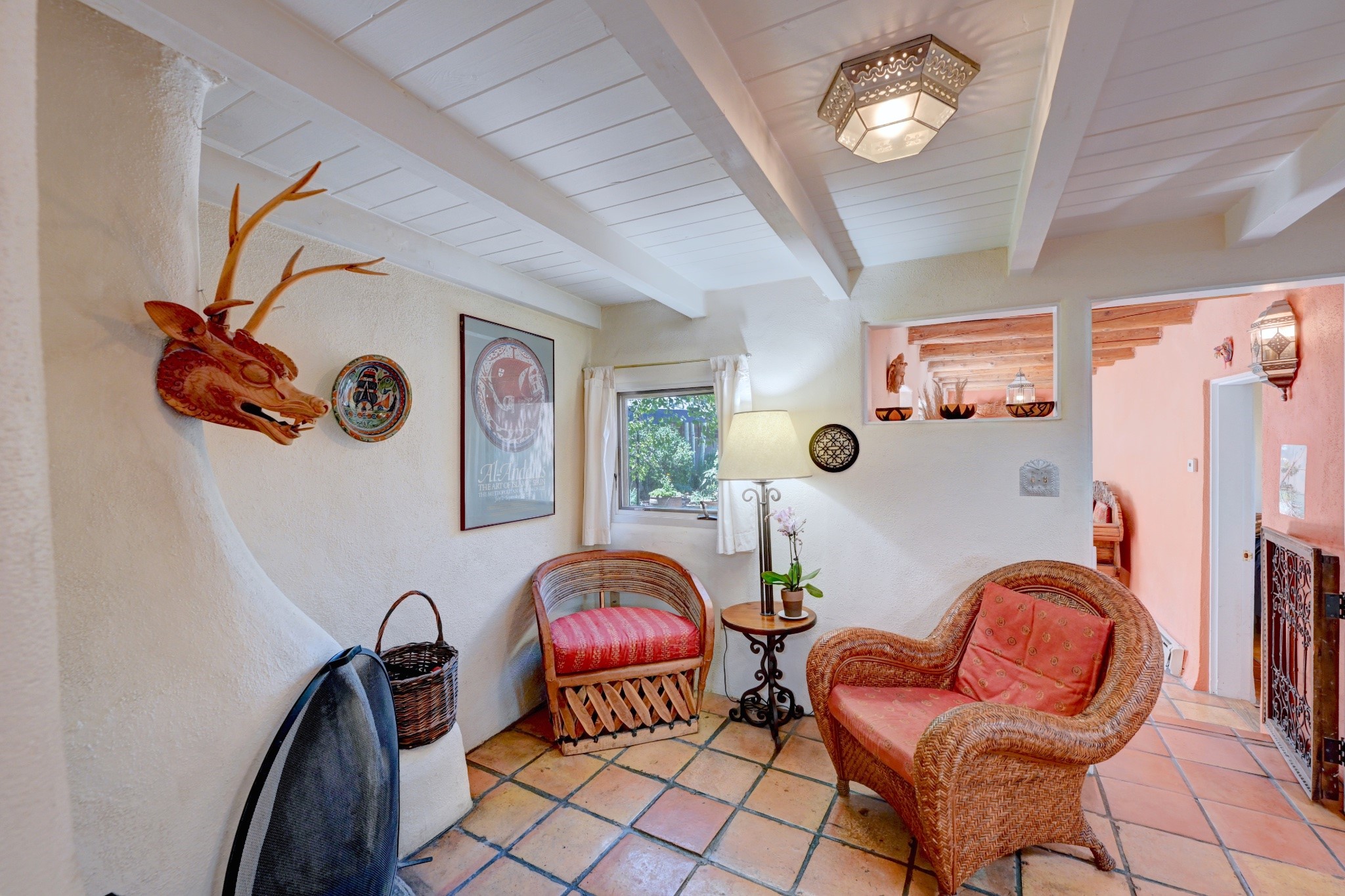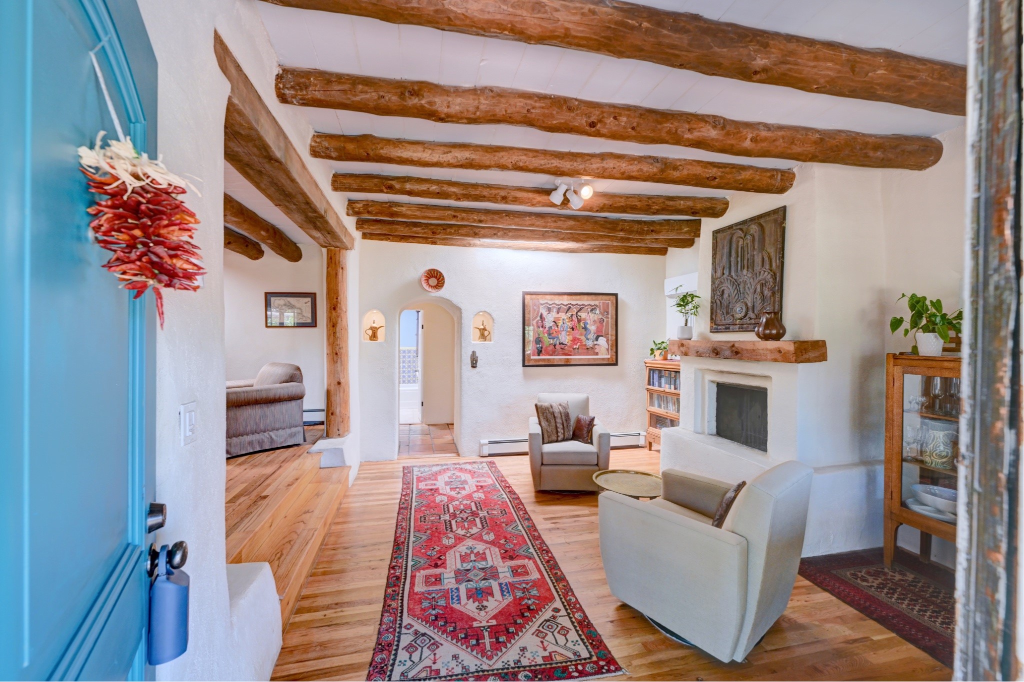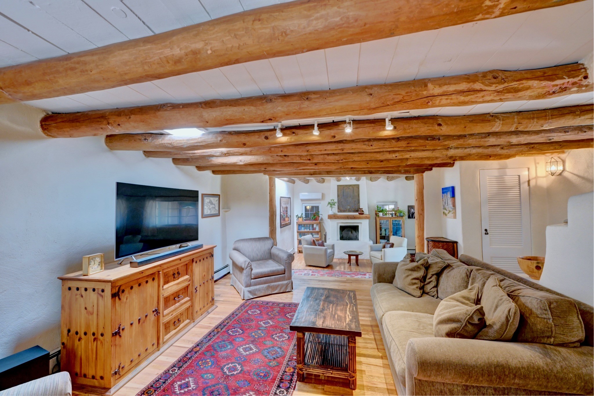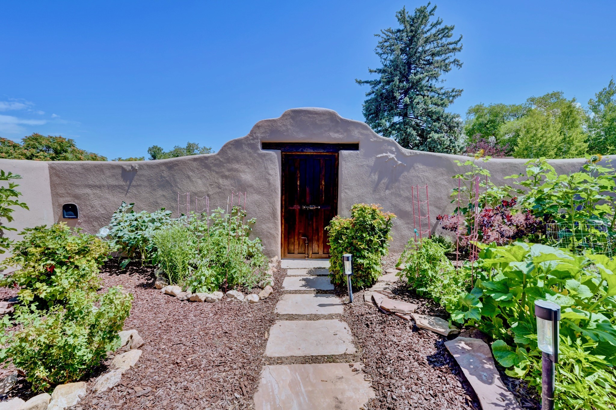 A hundred years of Santa Fe history is represented in this unique home. From the original small structure, built in the 1930's with its thick adobe walls, subsequent owners have added numerous updates and additional living spaces while maintaining the history and character of the residence. These adobe walls and double-paned windows throughout the house, provide peace and quiet from the home's location on the road leading to the renowned Santa Fe Ski Basin and to miles of hiking trails. The two-tiered living room features a fireplace and a designated area for activities such as reading, listening to music, and watching TV.The heart of the house is the central kitchen/dining area, where family and friends gather for meals and conversation. Cabinets, counters, backsplashes, and appliances have been updated to accommodate modern living, while the original floors, nichos, and ceilings have been carefully preserved. The traditional Kiva fireplace, once part of the original portal, serves as a focal point for the area. Well maintained and updated, it adds warmth and charm during Santa Fe's brisk winters. The situation of two of the three bedrooms off the central area provides privacy for guests and residents alike. One has an ensuite bathroom while the other provides garden views.Down a sunny hall, also with garden views, is the primary bedroom and bath. With a Kiva fireplace and outdoor access, this suite is a serene retreat. Its location from the central living area guarantees spacious privacy for the main occupants while hosting family and friends.The two outside areas have been designed to address the specific requirements of Santa Fe's climate. Water wise trees, shrubs and perennials support native pollinators while bringing edibles and color to the landscape. A water catchment system collects hundreds of gallons of water during the region's infrequent rains for use during the dry season.To top it off, this gem boasts a new TPO roof, new exterior stucco, two tankless hot water heaters (2020); solar panels (2021); and five minisplits (beginning 2018) making it move-in ready. This is a home not to be missed!Do not miss the 3-D Matterport walkthrough and drone footage in the listing!
